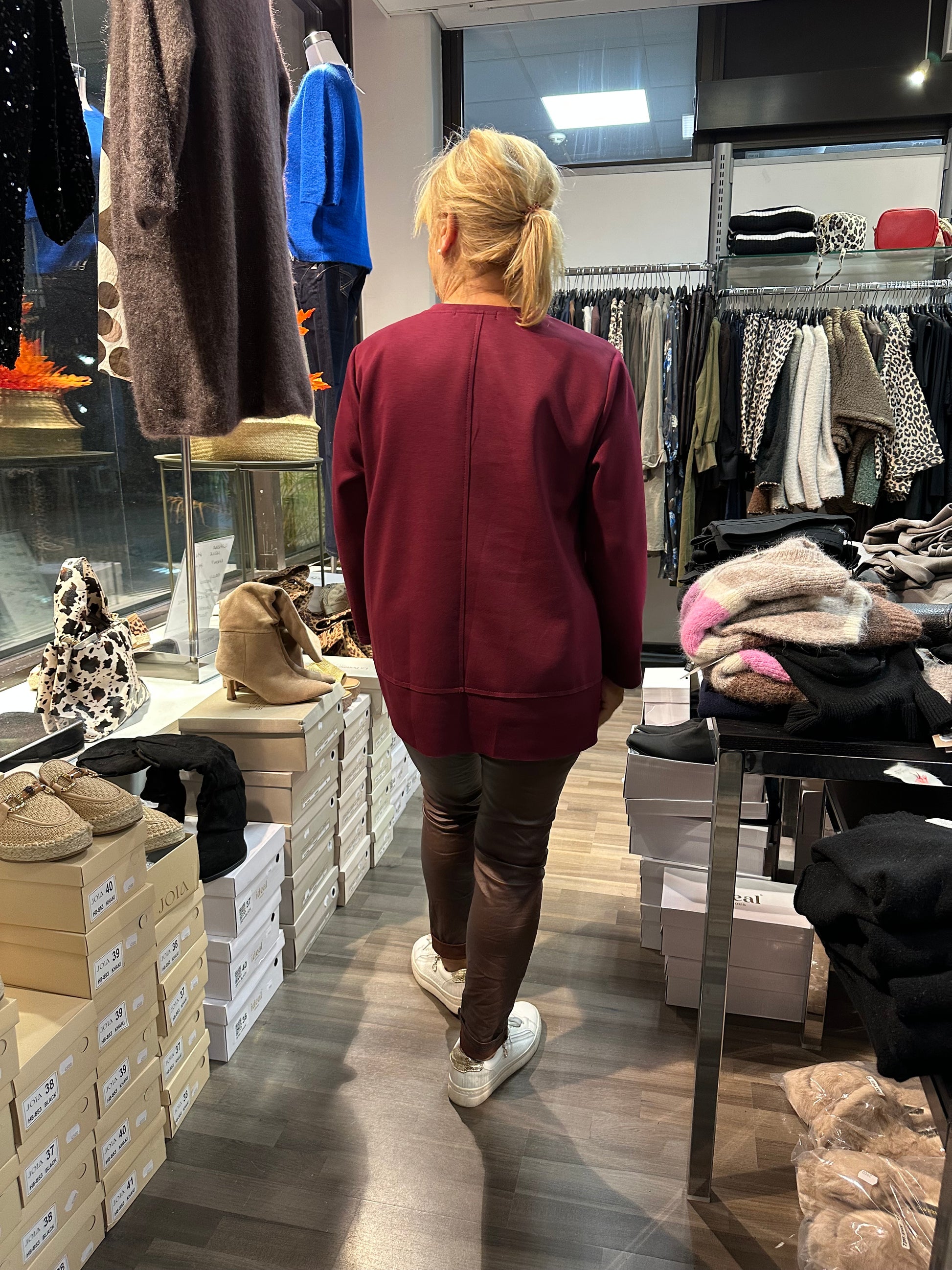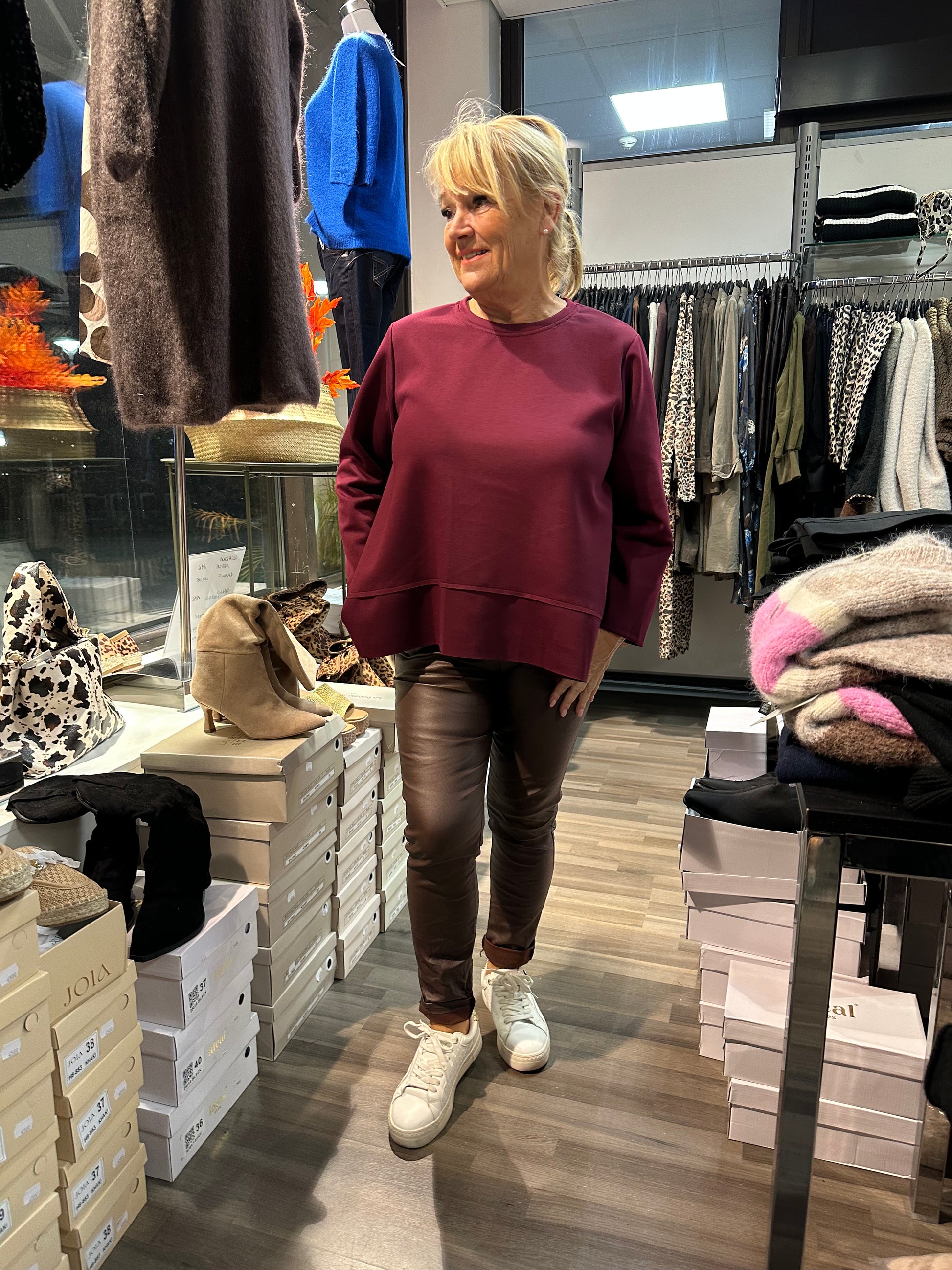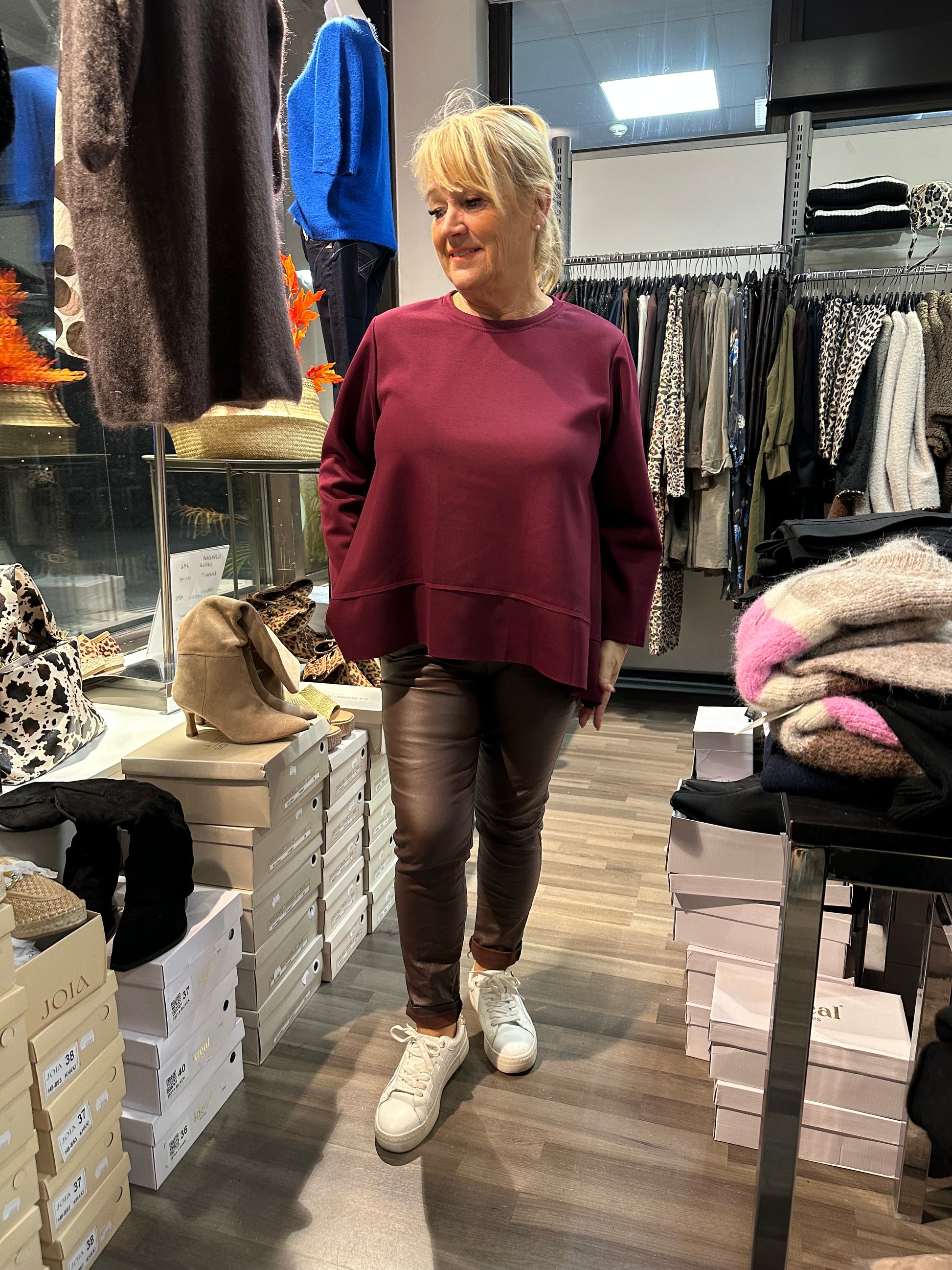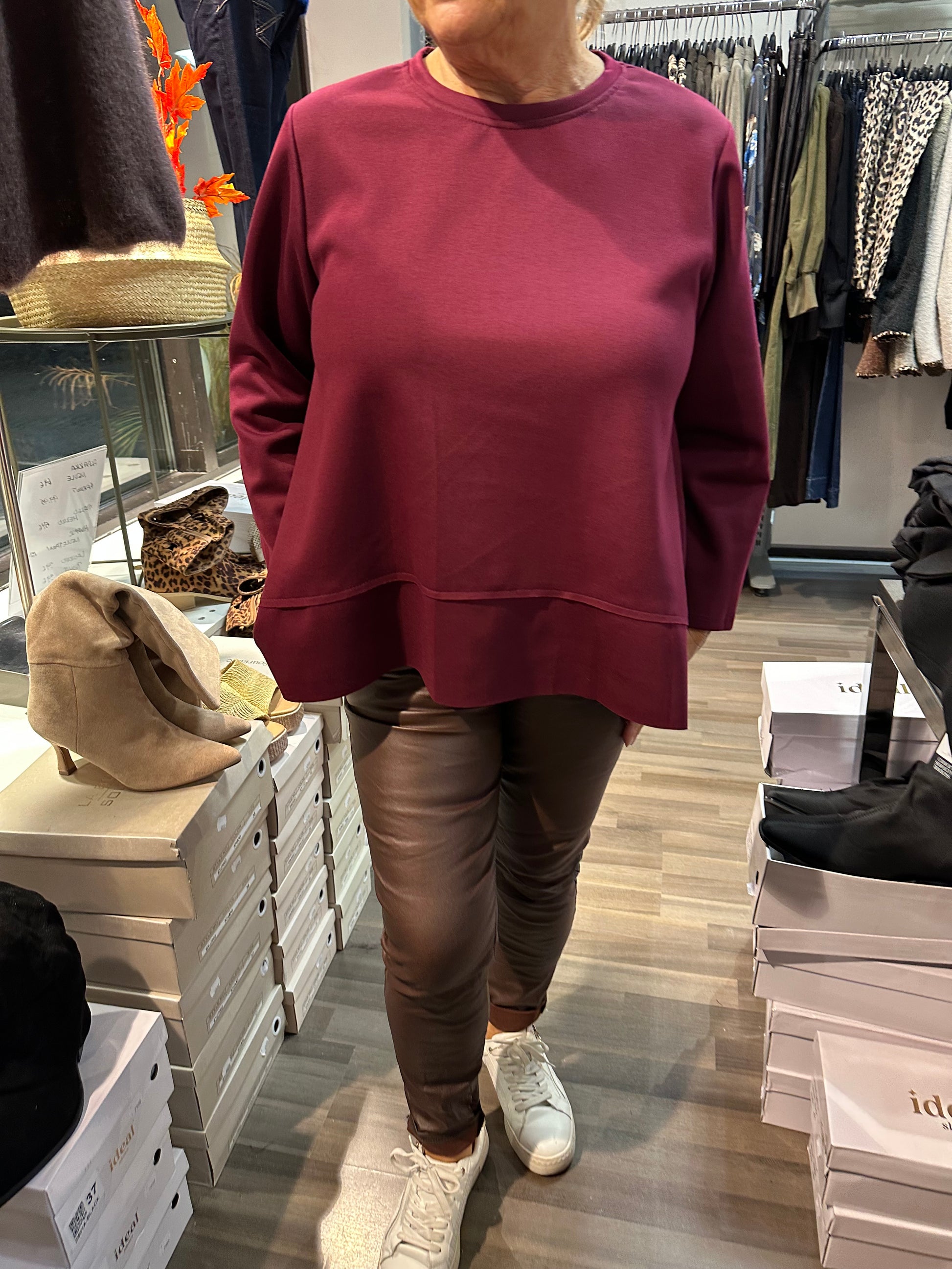 Mukavan tuntuinen a-linjainen trikoopusero. Leveentyvä helma, joka on edestä hieman lyhyempi. Vajaamittaiset hihat.
