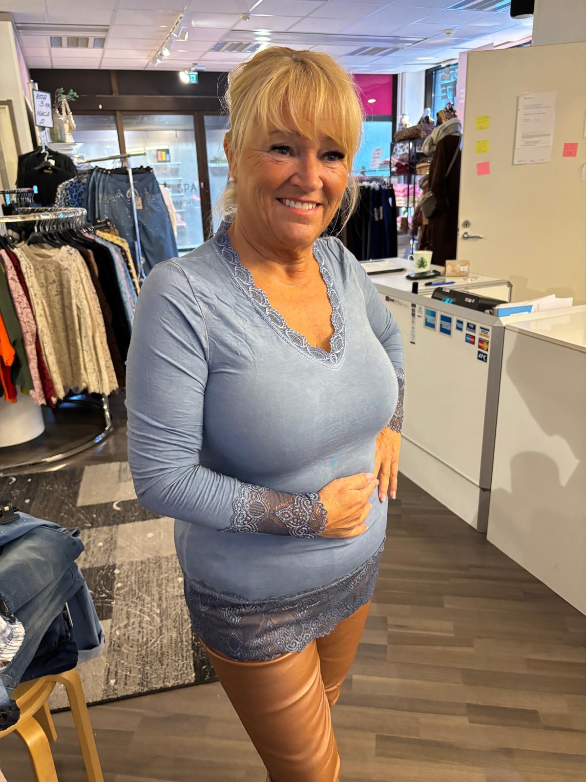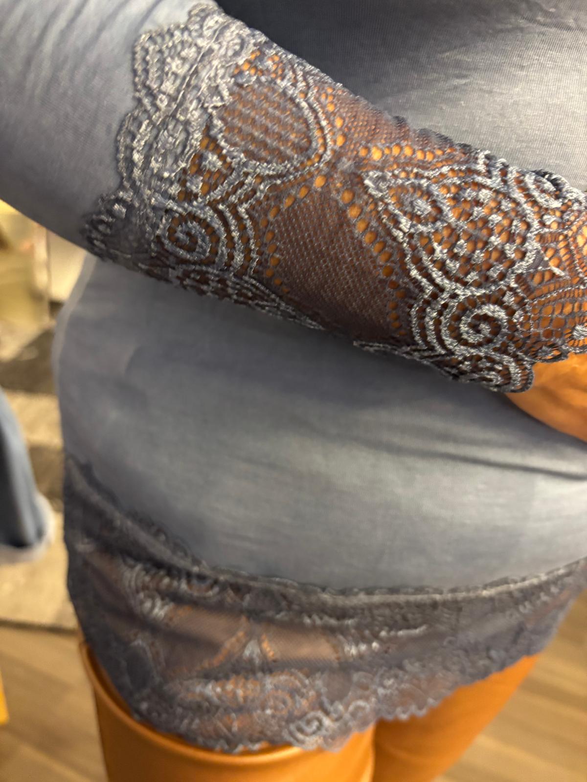 Rullapusero, viskoosi elastaania. V-pääntie jossa pitsit ja hihansuissa sekä helmassa pitsit. Pitkät hihat.