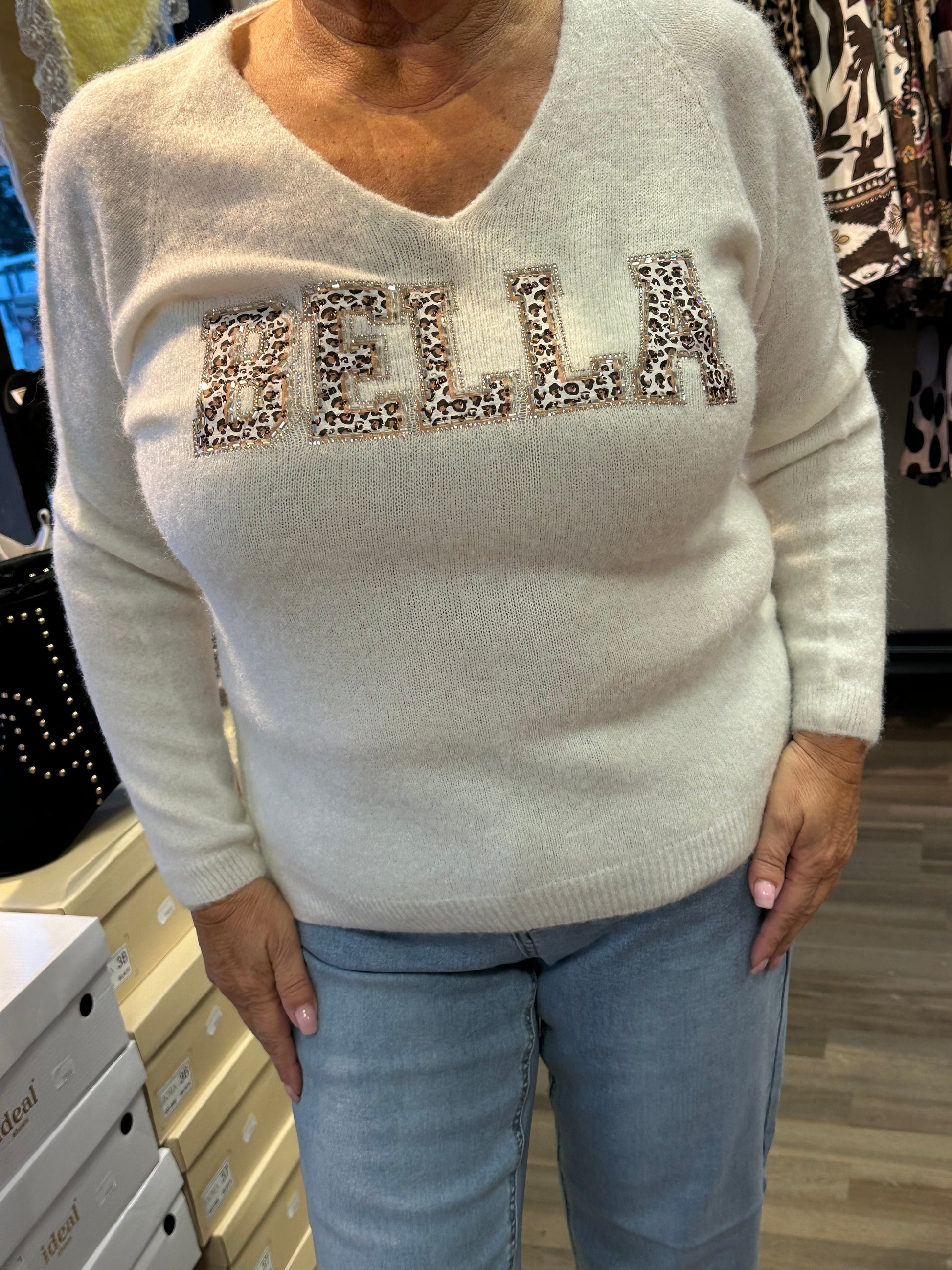 Pehmeä neule, Bella printillä ja leo kuosilla. Vähän pörröinen laatu.