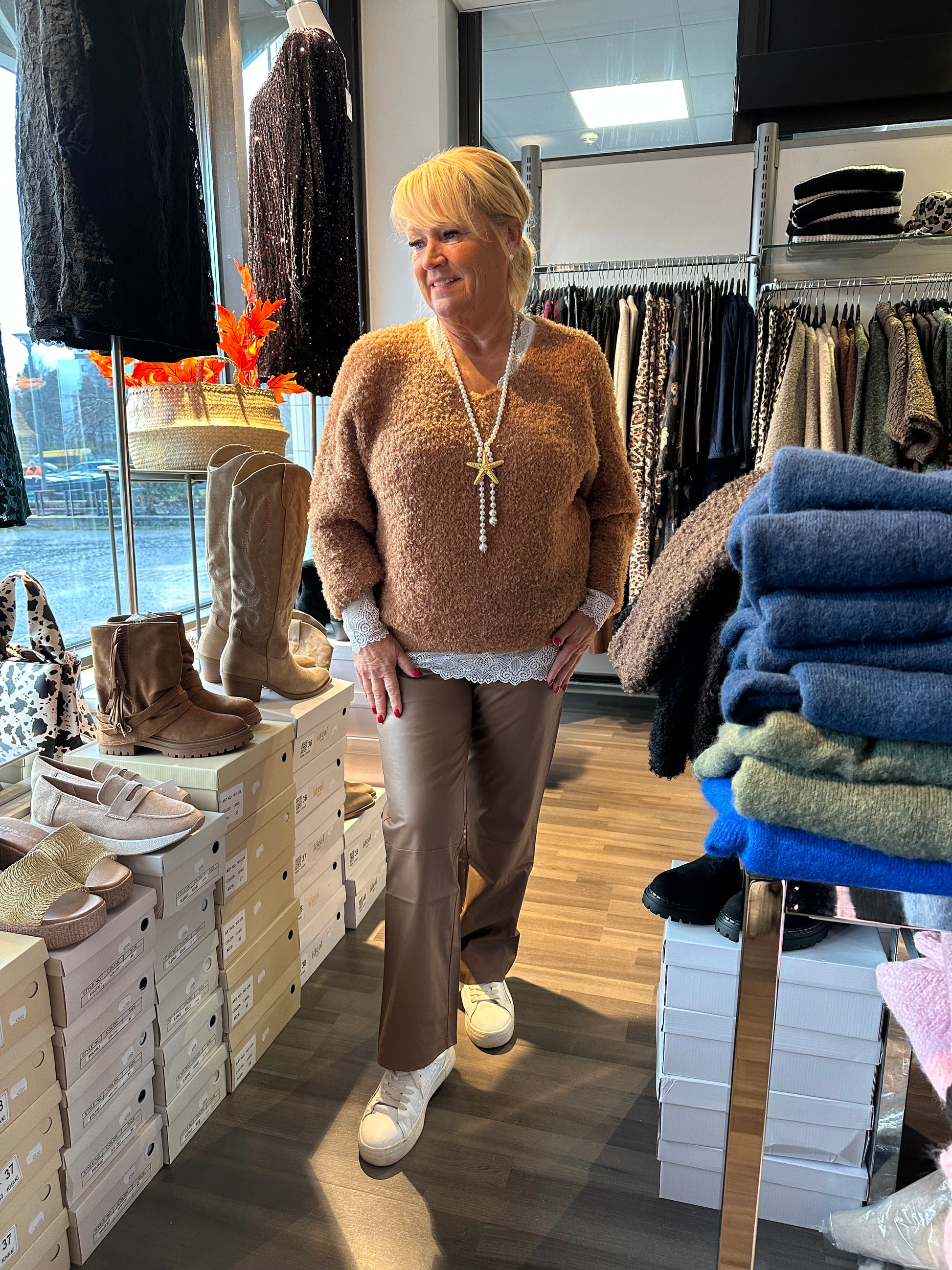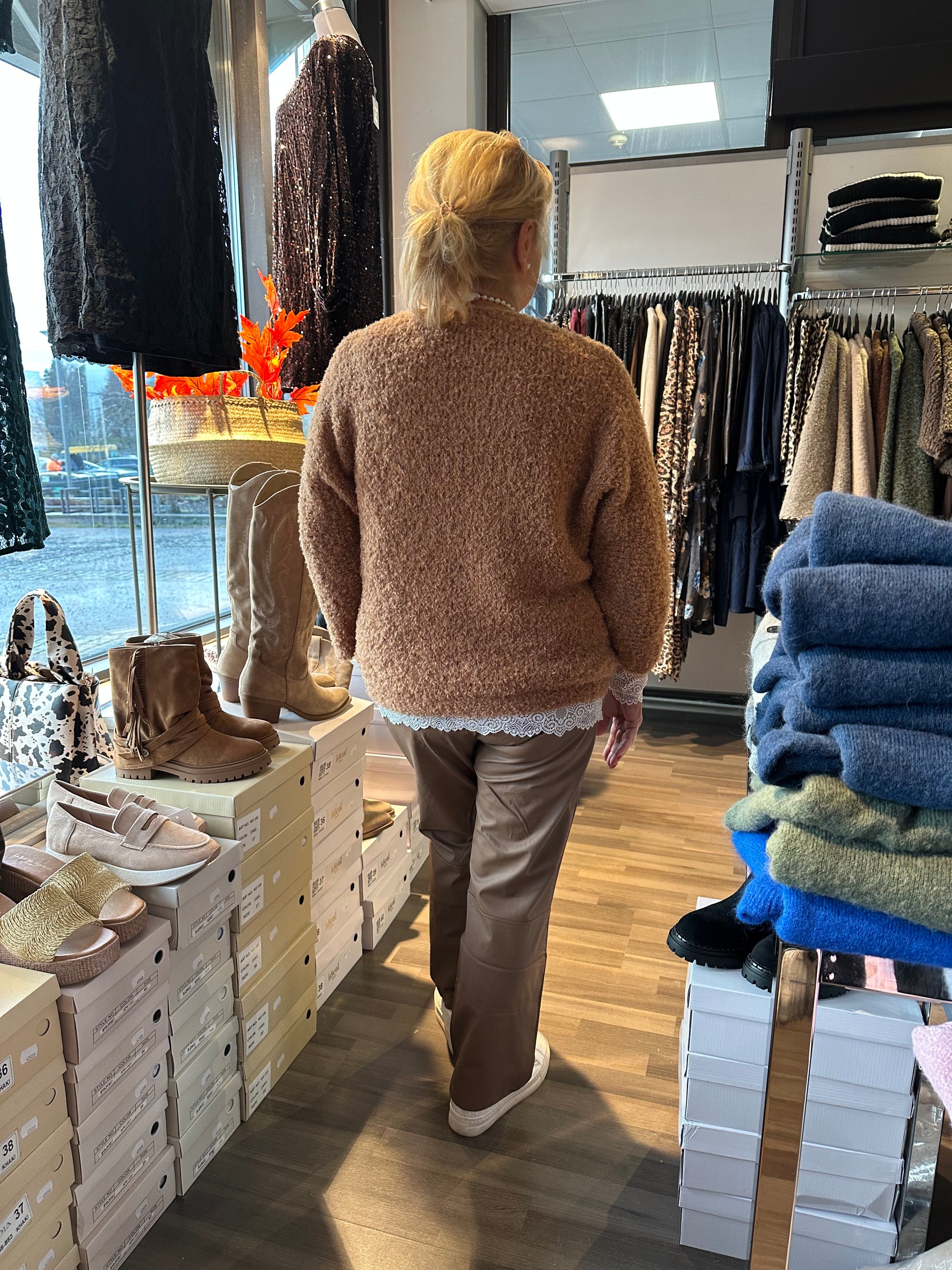 Pehmeä bouclee-neule v-pääntiellä ja hieman vajaamittaisilla hihoilla.