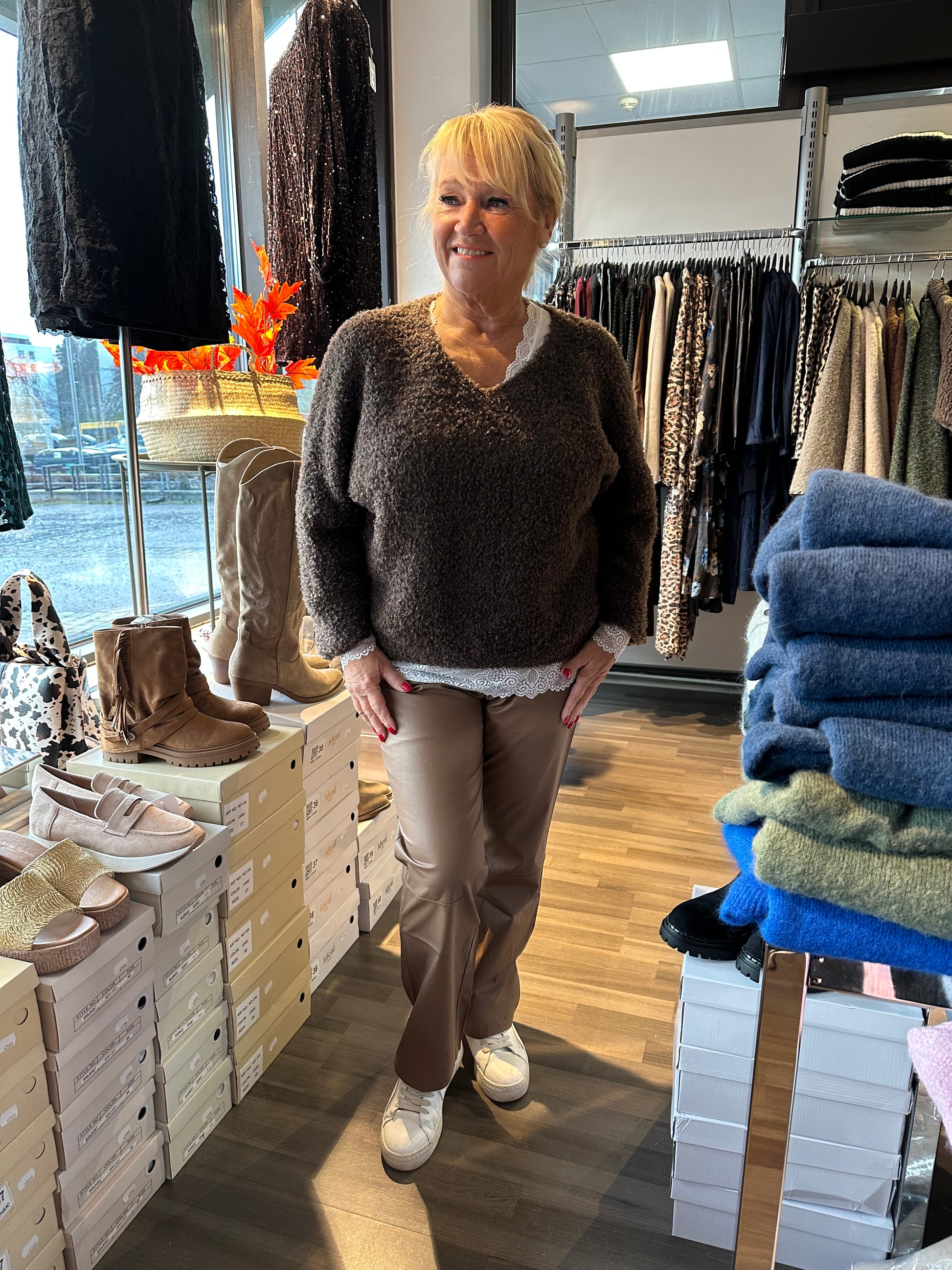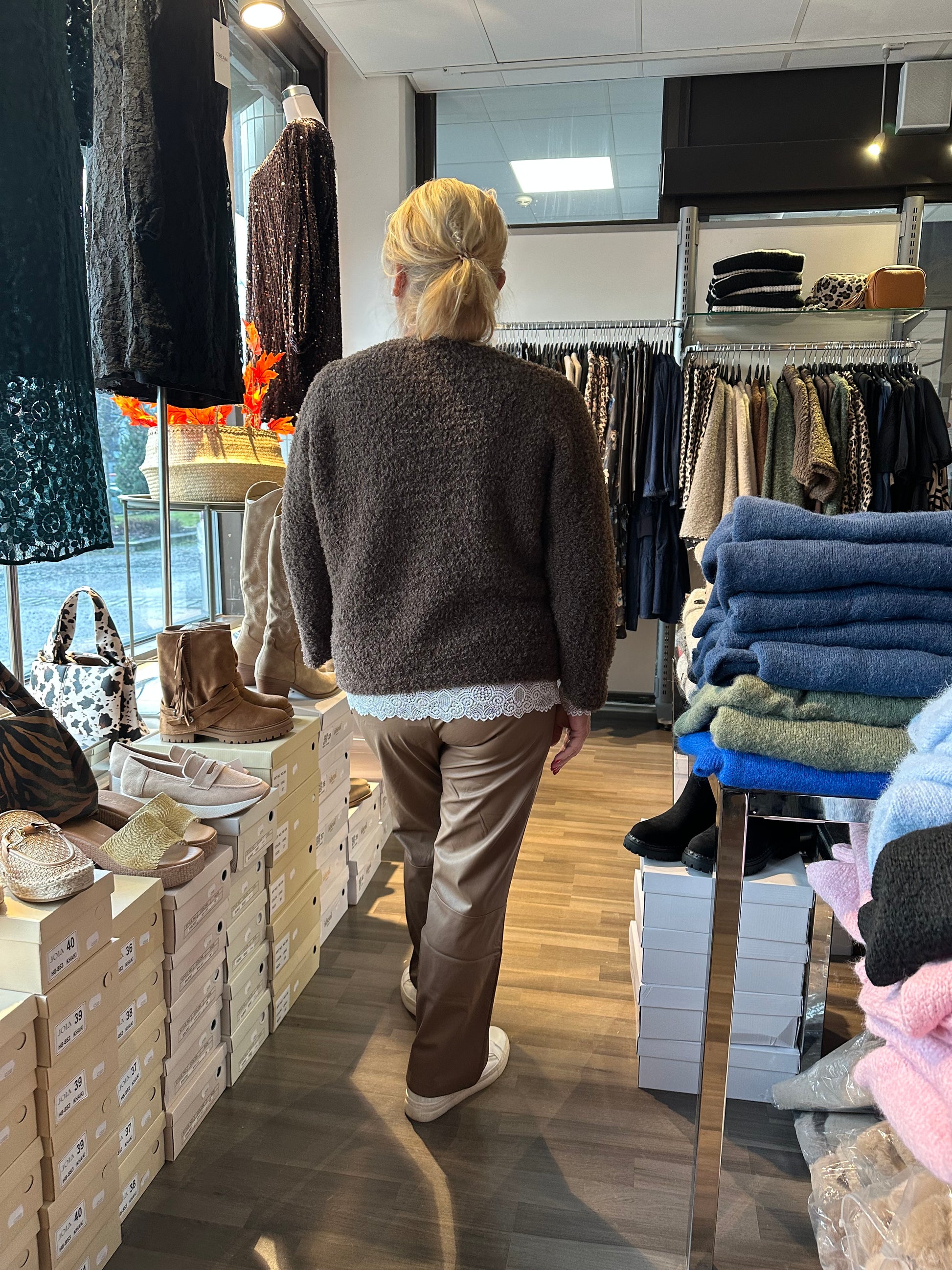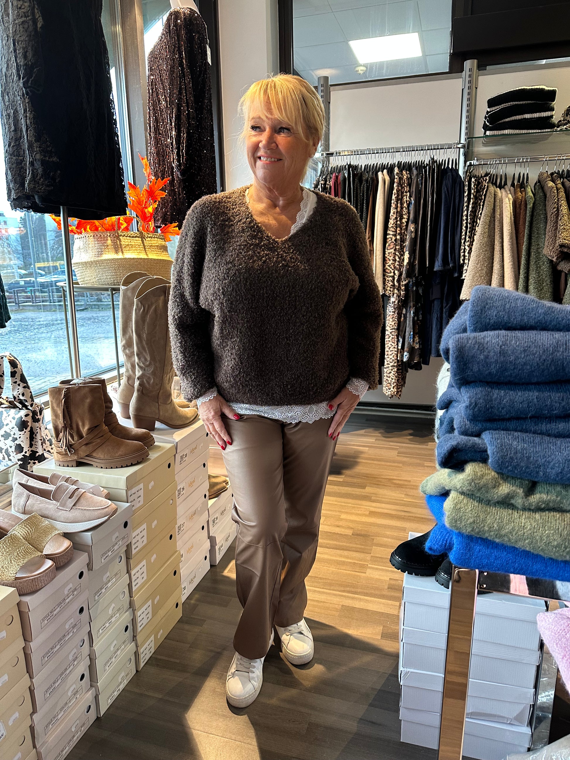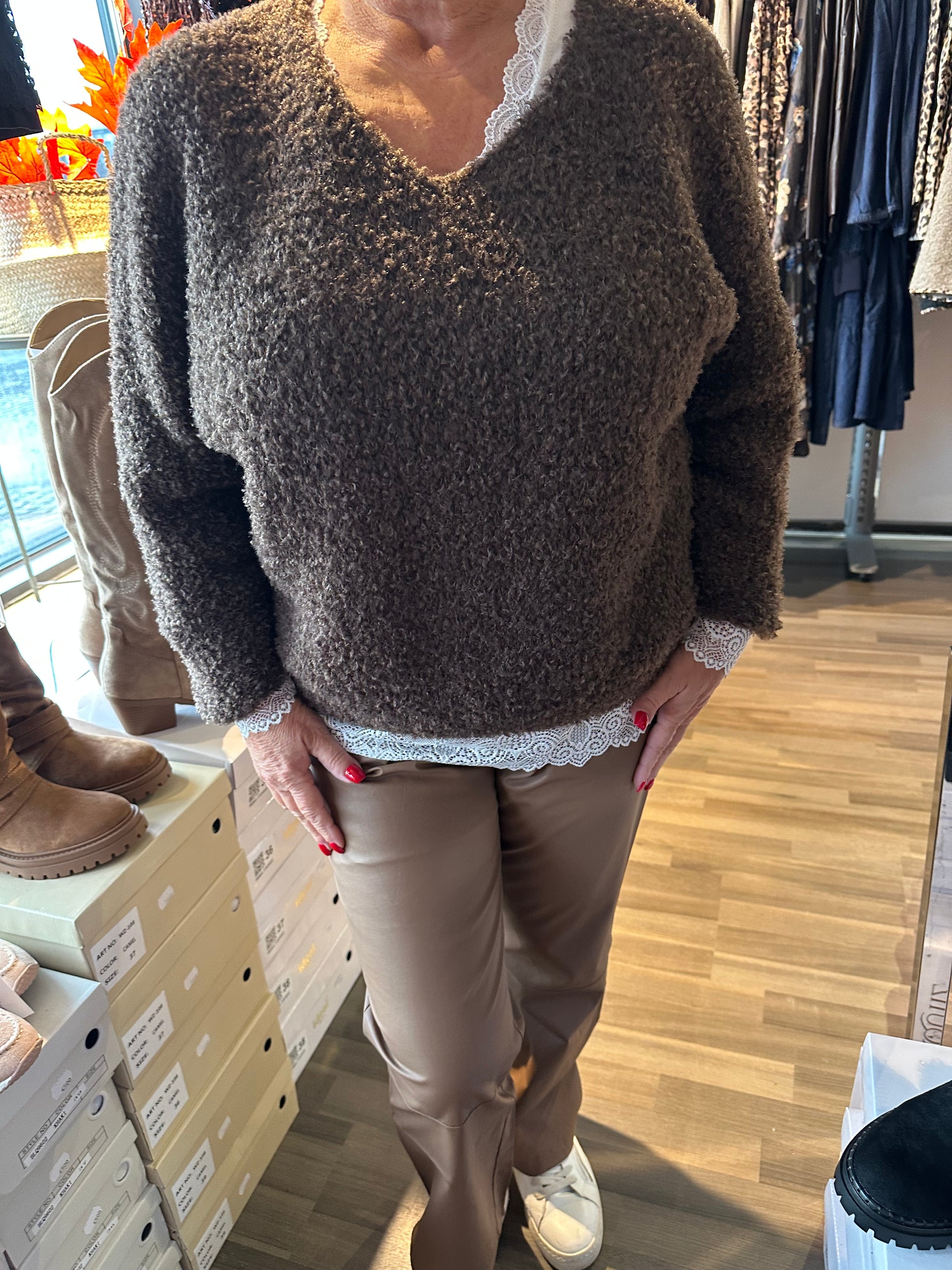 Pehmeä bouclee-neule v-pääntiellä ja hieman vajaamittaisilla hihoilla.
