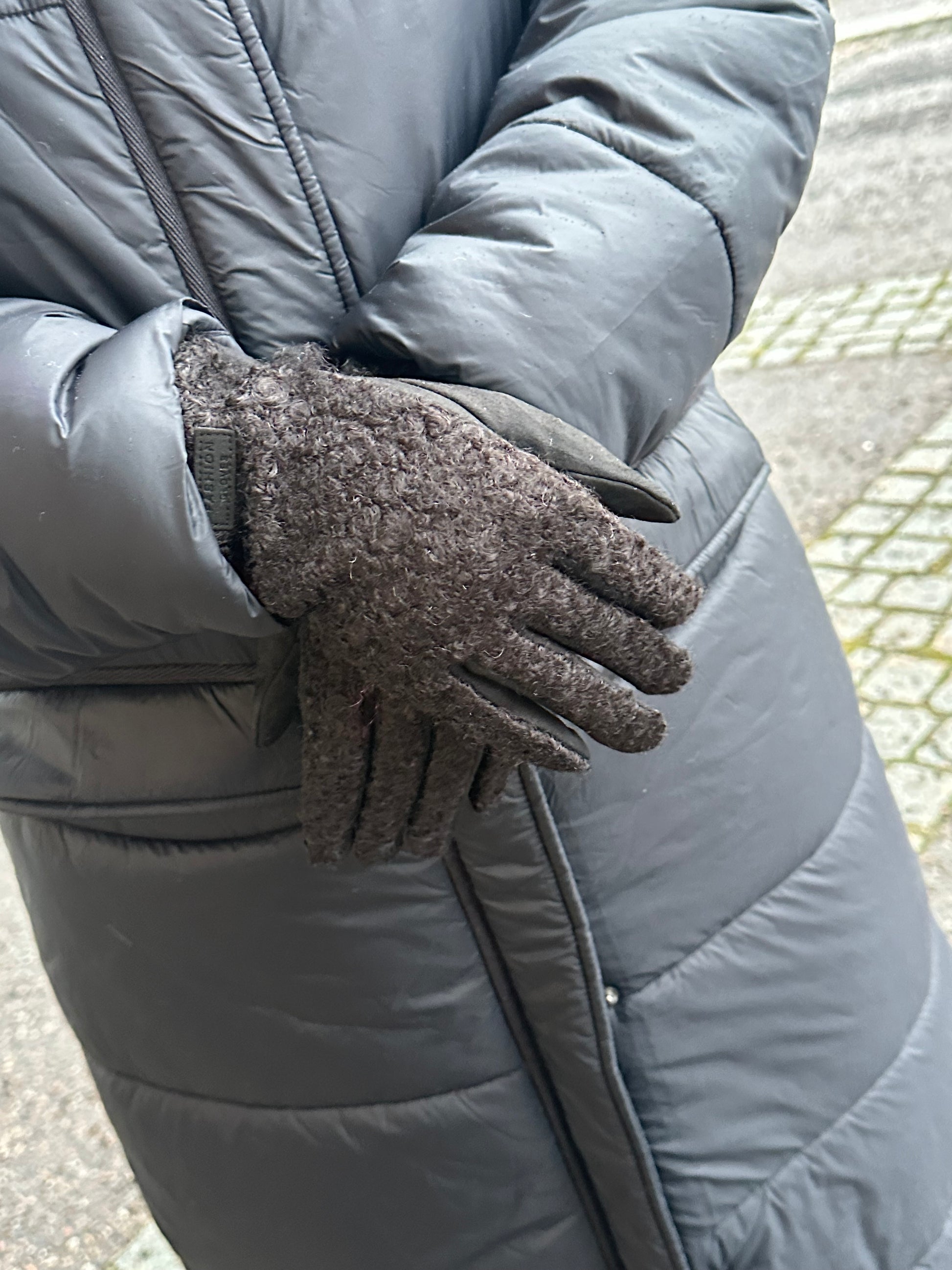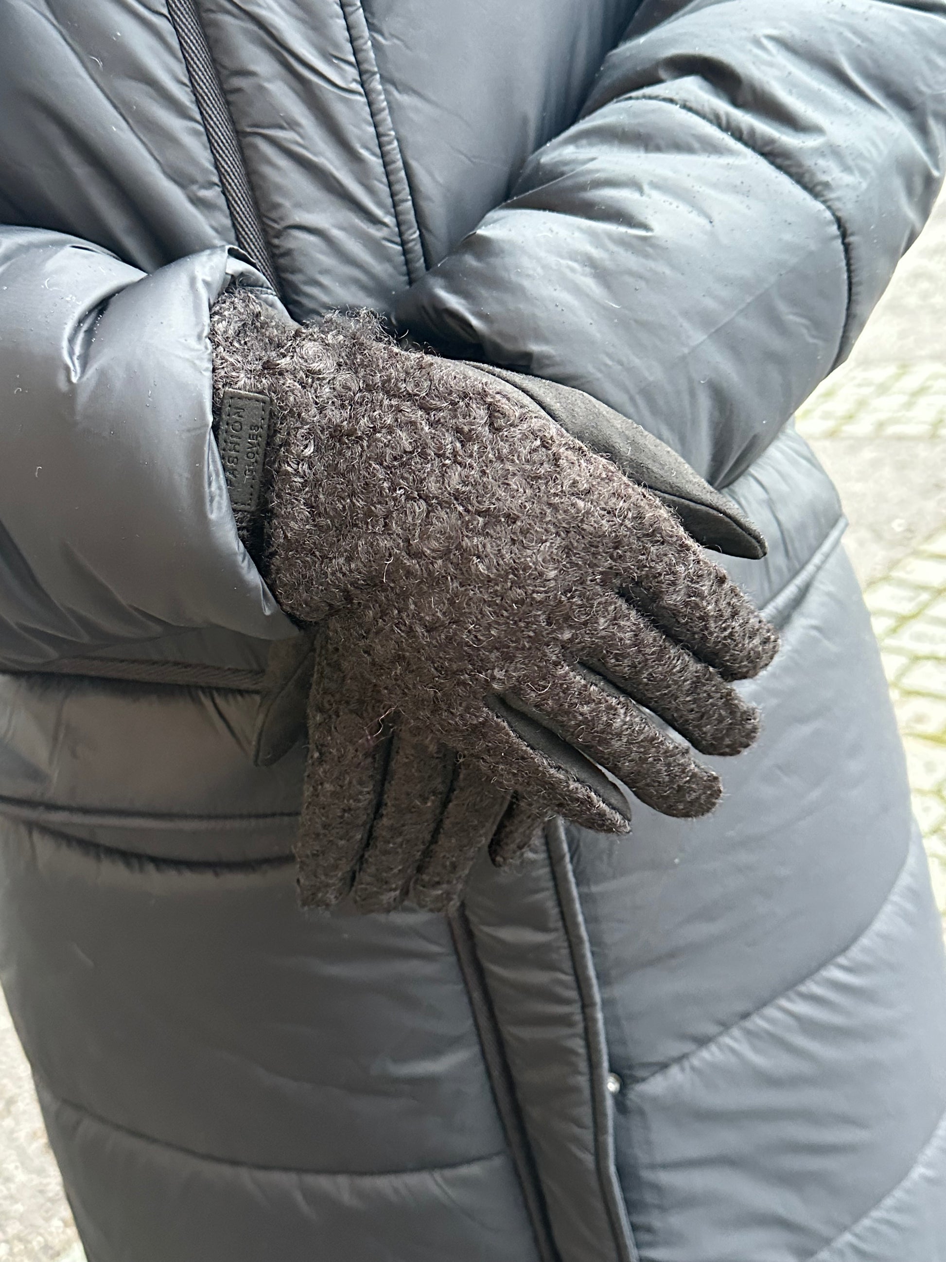 Pehmeät bouclee sormikkaat. Etusormissa tikkaukset, jolloin puhelin toimii myös hanskat kädessä.