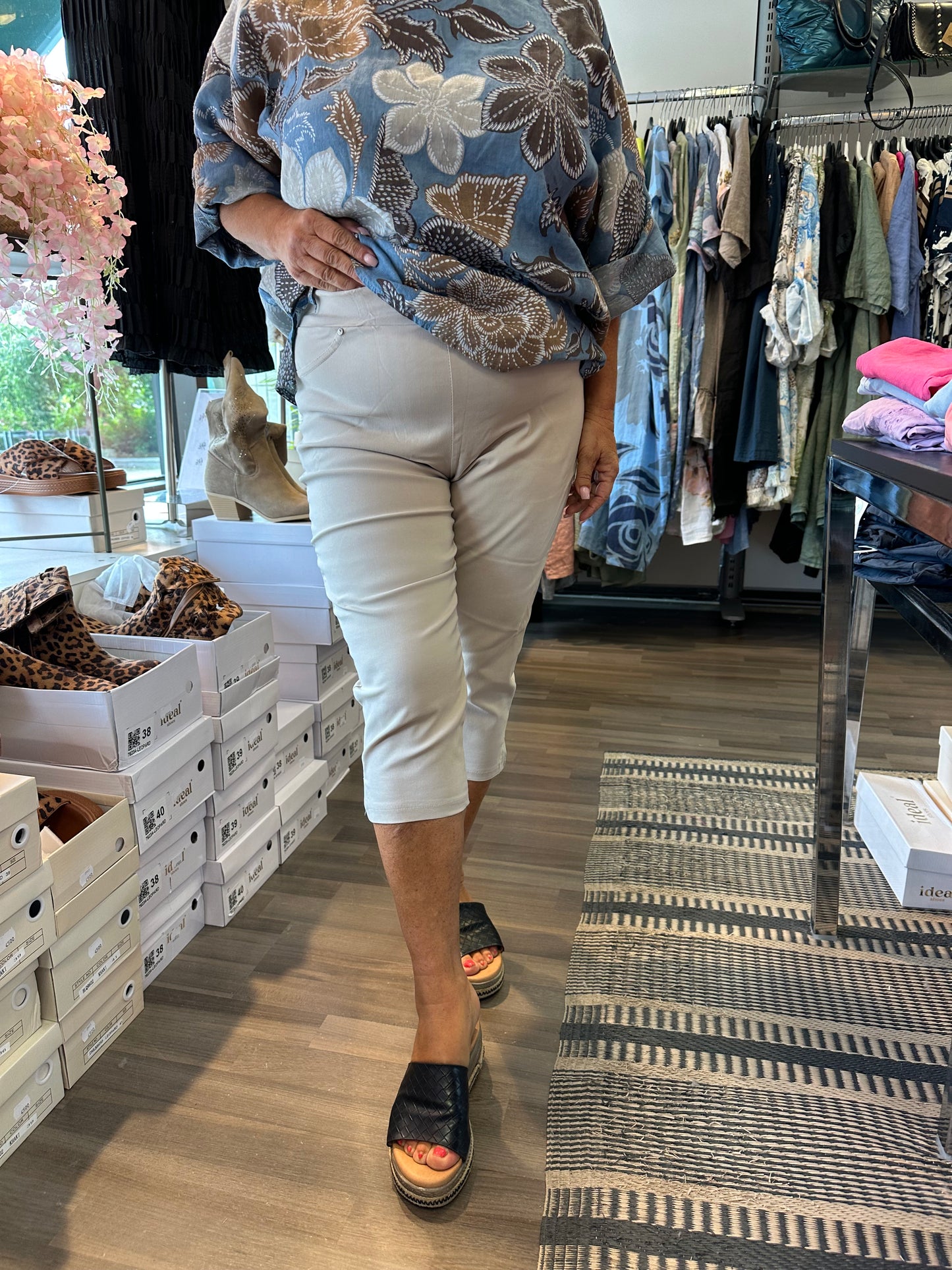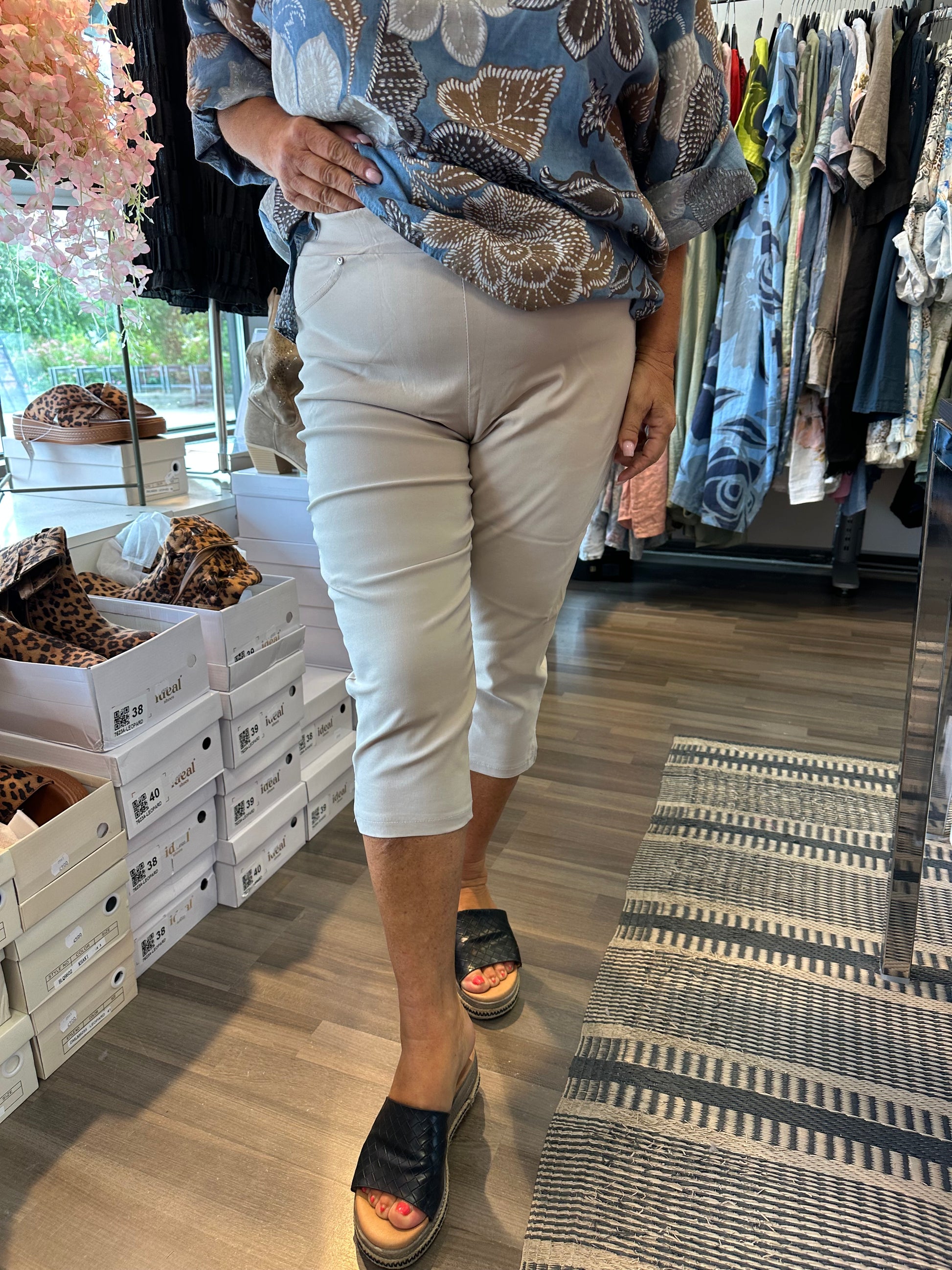 Kevyet liukaspintaiset caprit kuminauhavyötäröllä. Korkea vyötärö. Edessä valetaskut. Lahkeissa pienet halkiot.