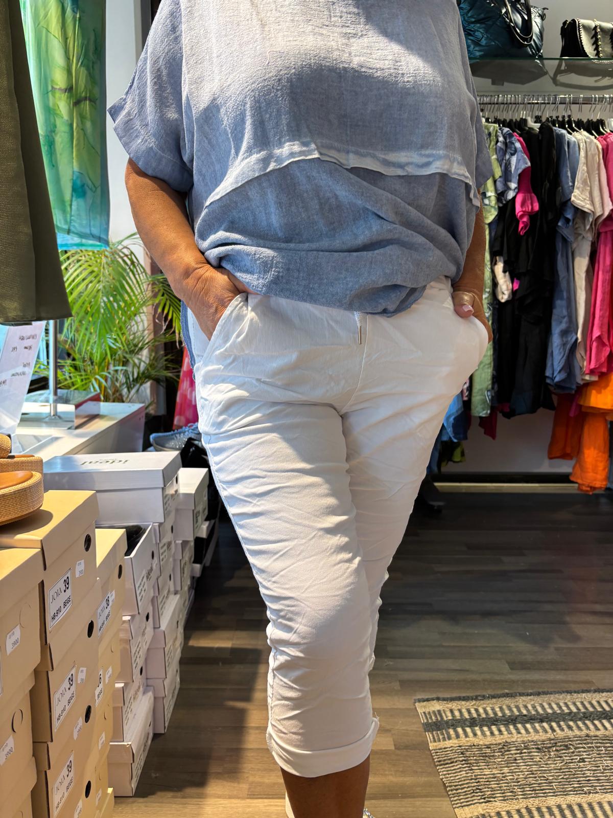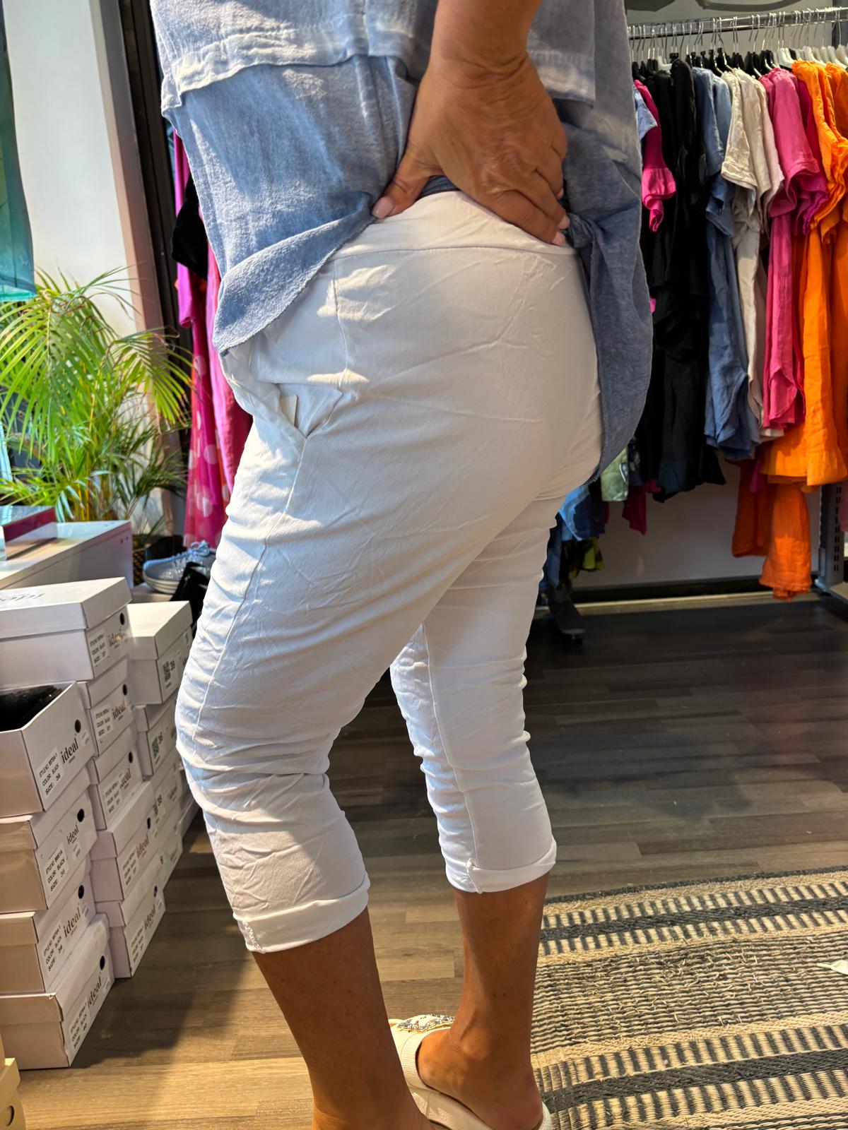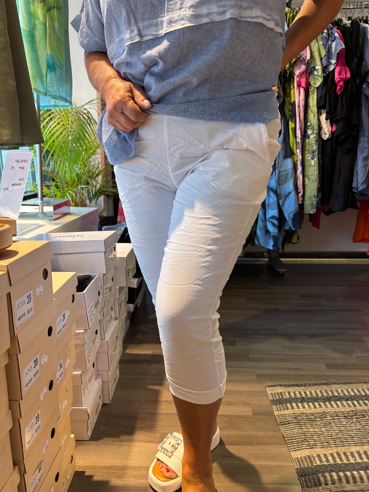 Joustavat, kevyet caprit. Joustava vyötärö, jossa nyöri. Edessä taskut. " ryppyhousu" joka oikenee käytössä.