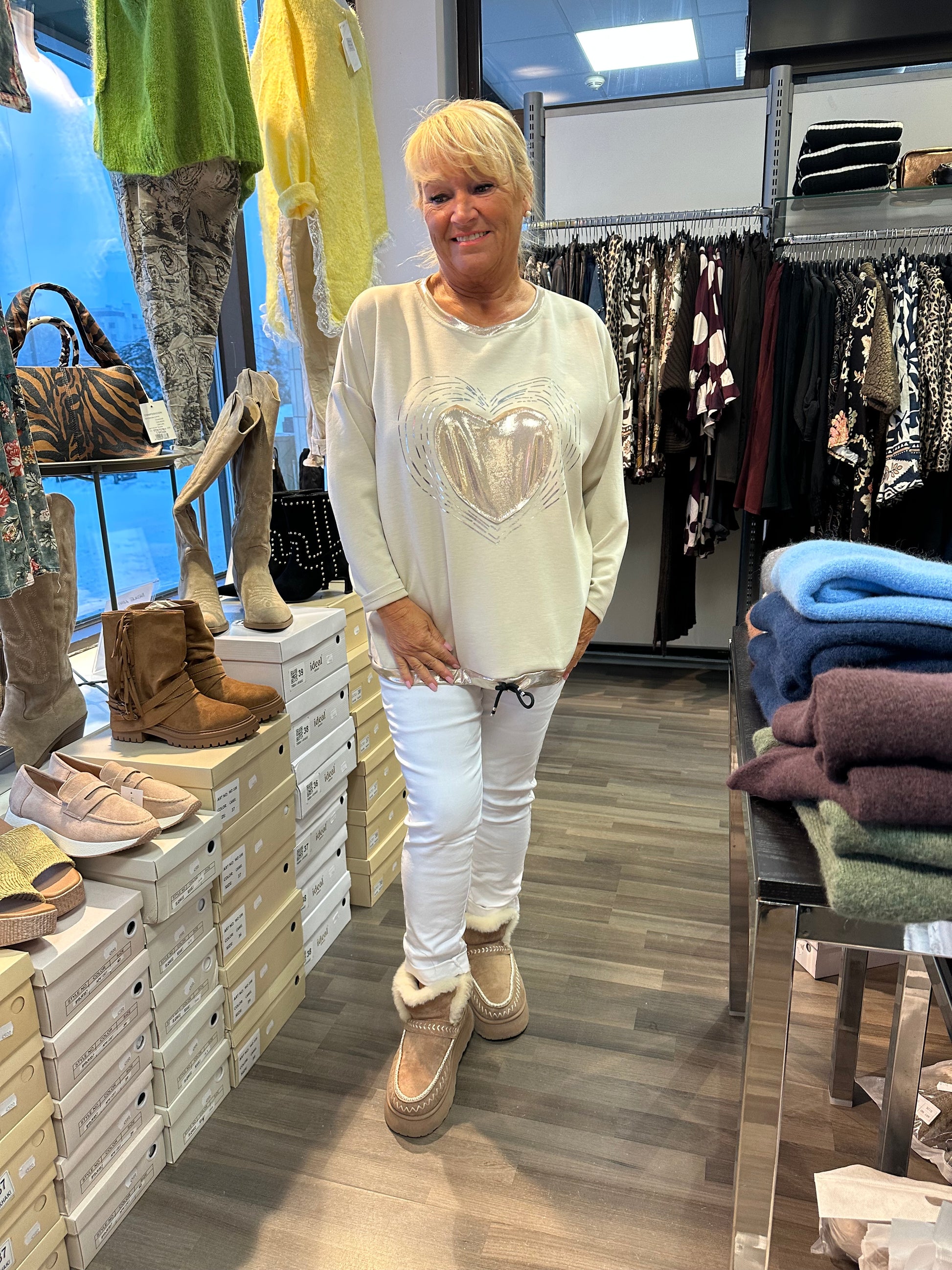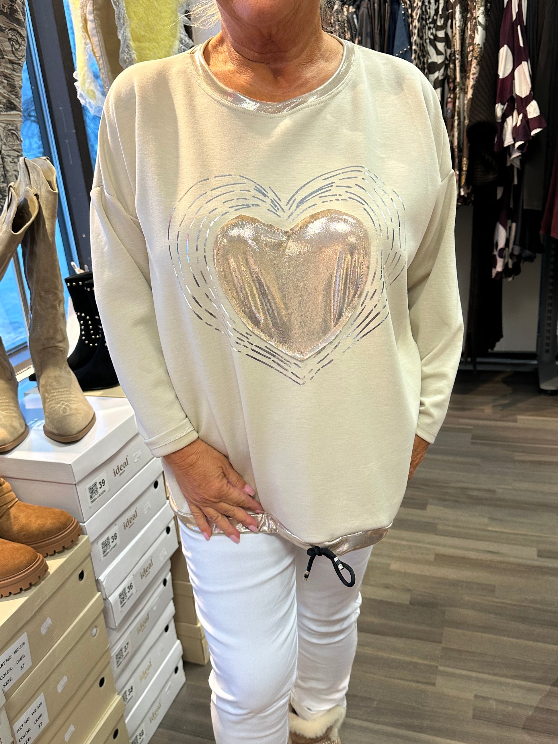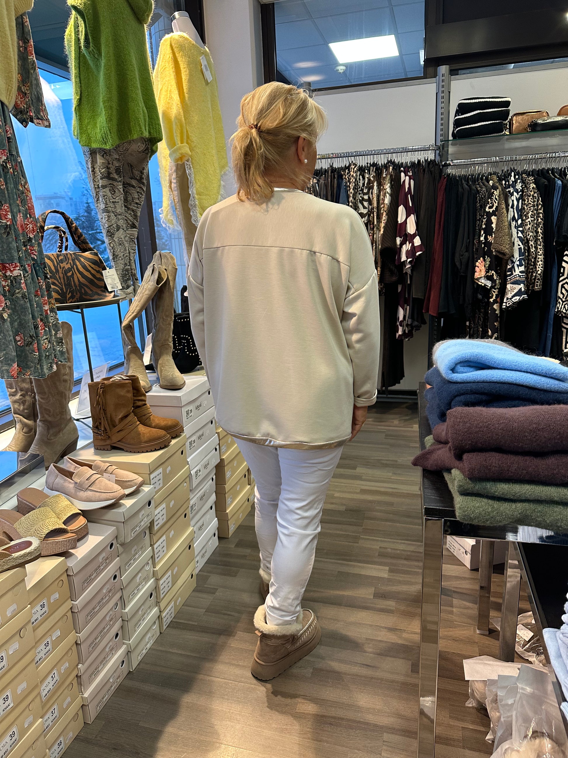 Suloinen college-pusero metallinhohtoisilla yksityiskohdilla. Pyöreä pääntie, hieman alennettu olkapää, helmassa kiristettävä nyöri. Miellyttävän tuntuista pehmeää kangasta.