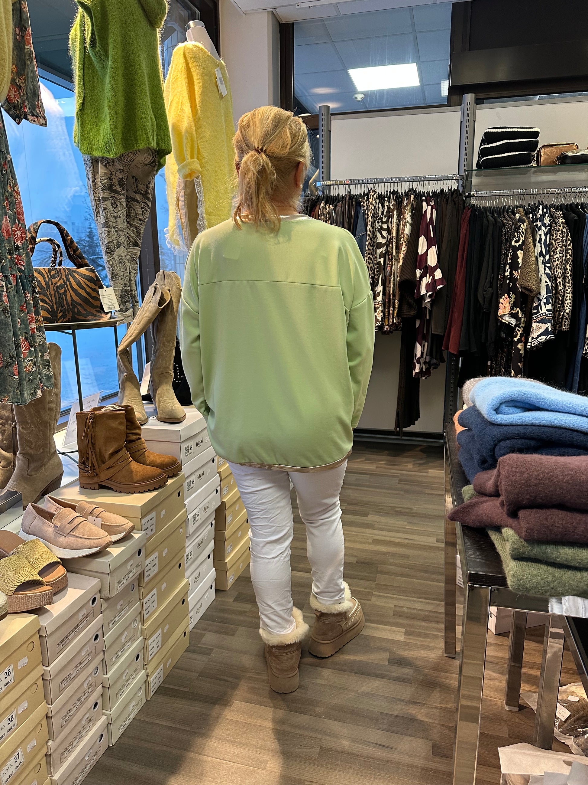 Suloinen college-pusero metallinhohtoisilla yksityiskohdilla. Pyöreä pääntie, hieman alennettu olkapää, helmassa kiristettävä nyöri. Miellyttävän tuntuista pehmeää kangasta.