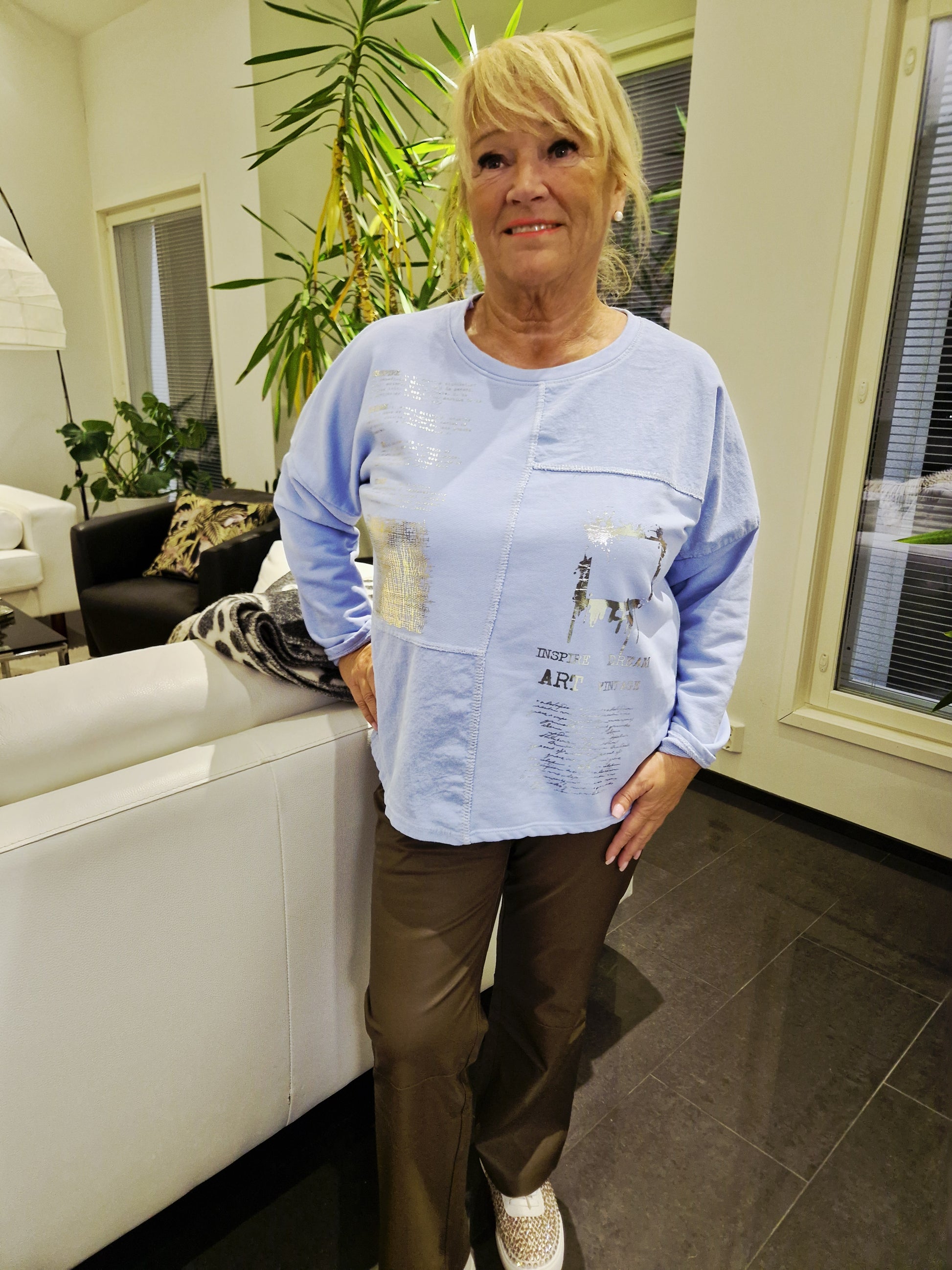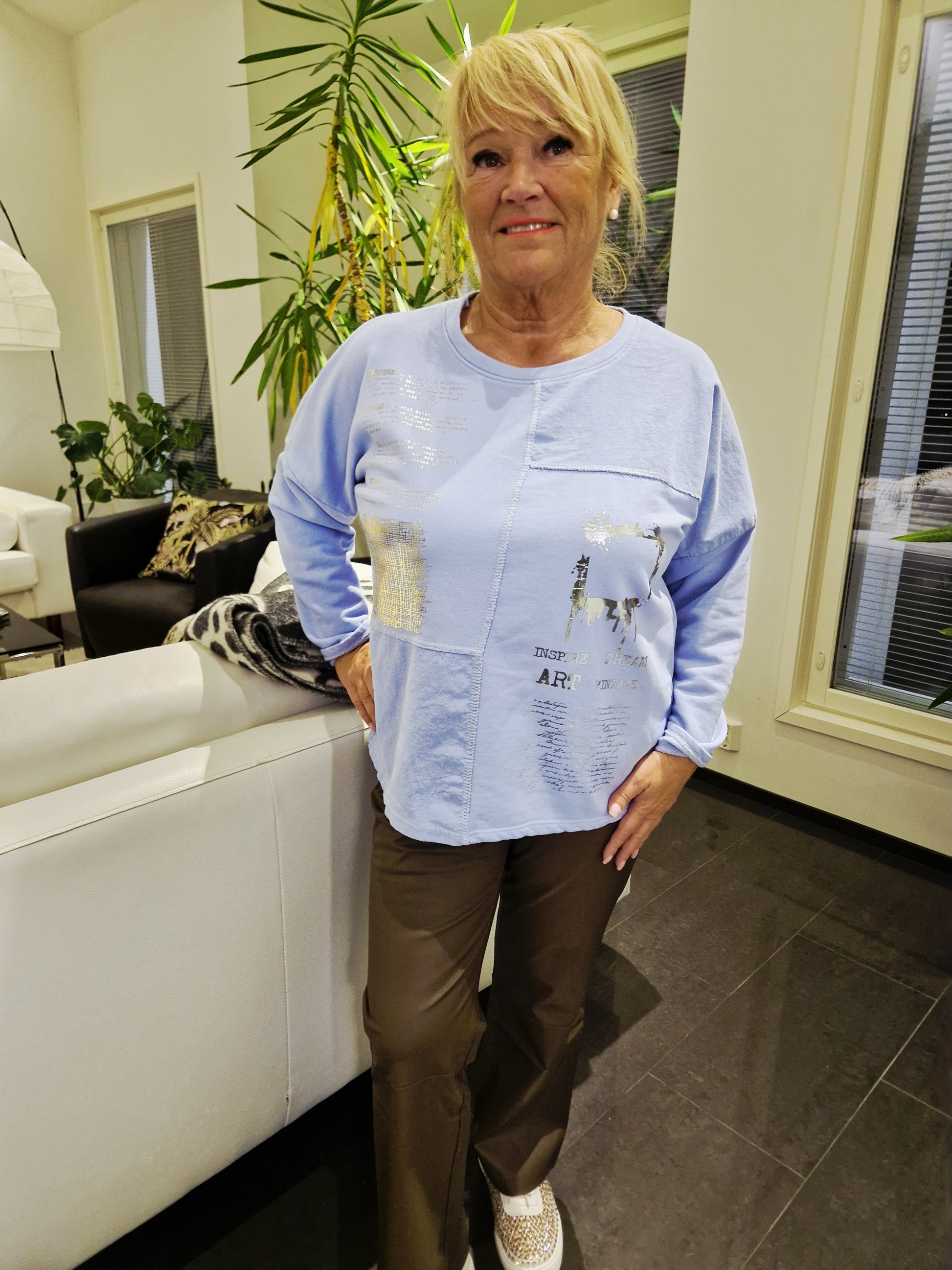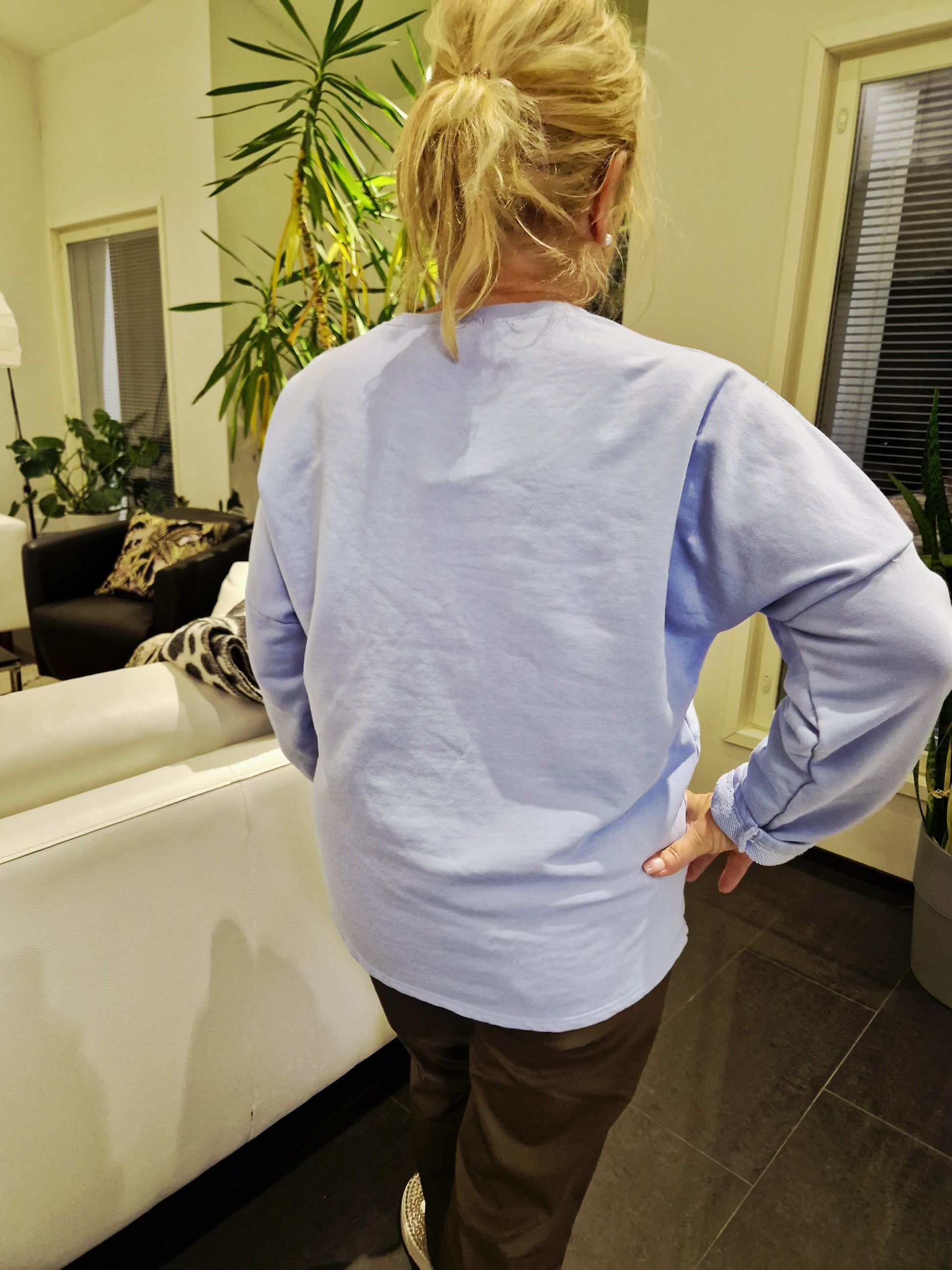 Rento college pusero! Pientä tekstiä jossa blingiä, antaa vähän ilmettä. Pikkuisen paksumpaa puuvillaa, mutta hyvän tuntuinen päällä. O-aukkoinen pääntie, pitkät hihat.
