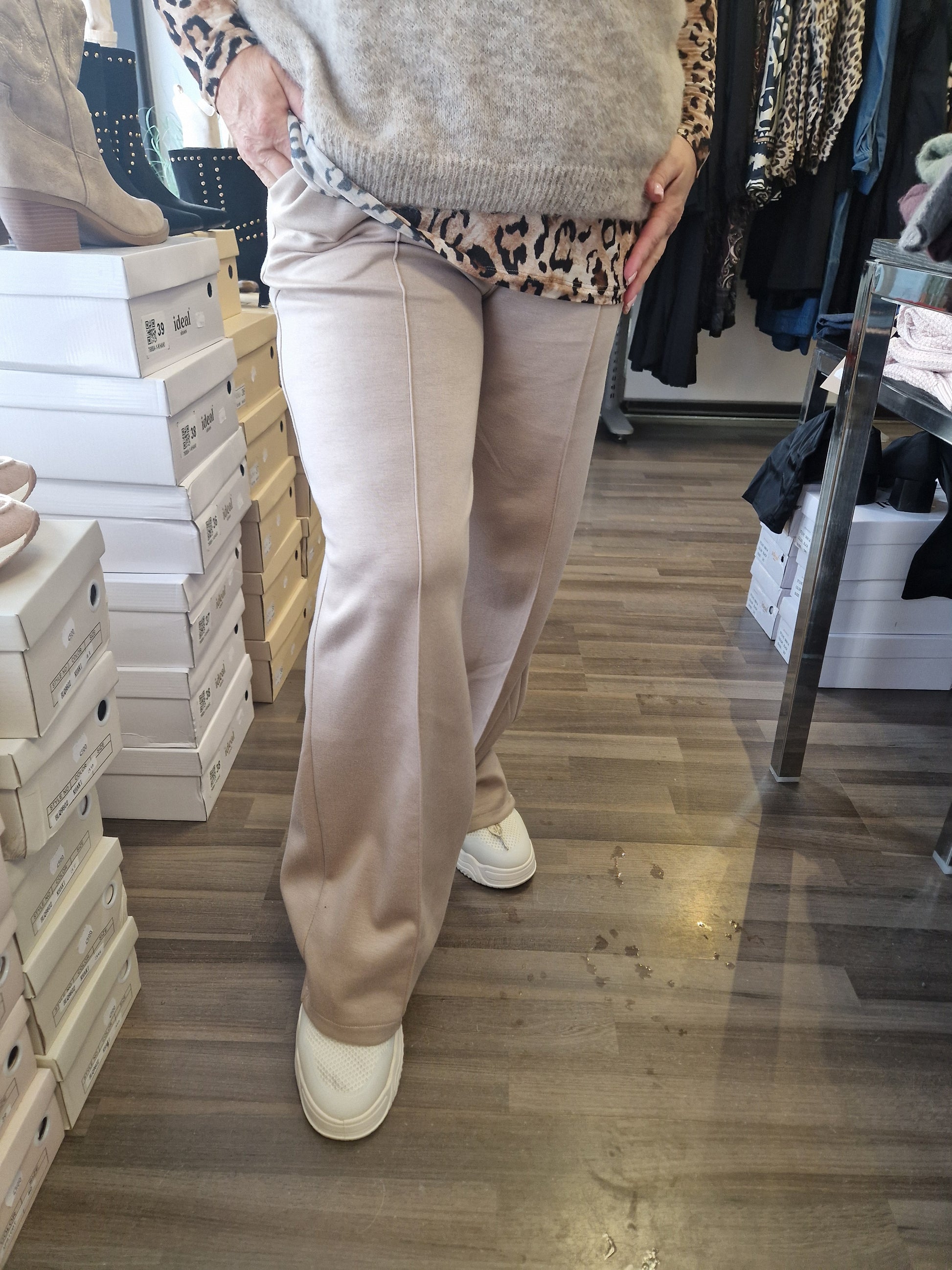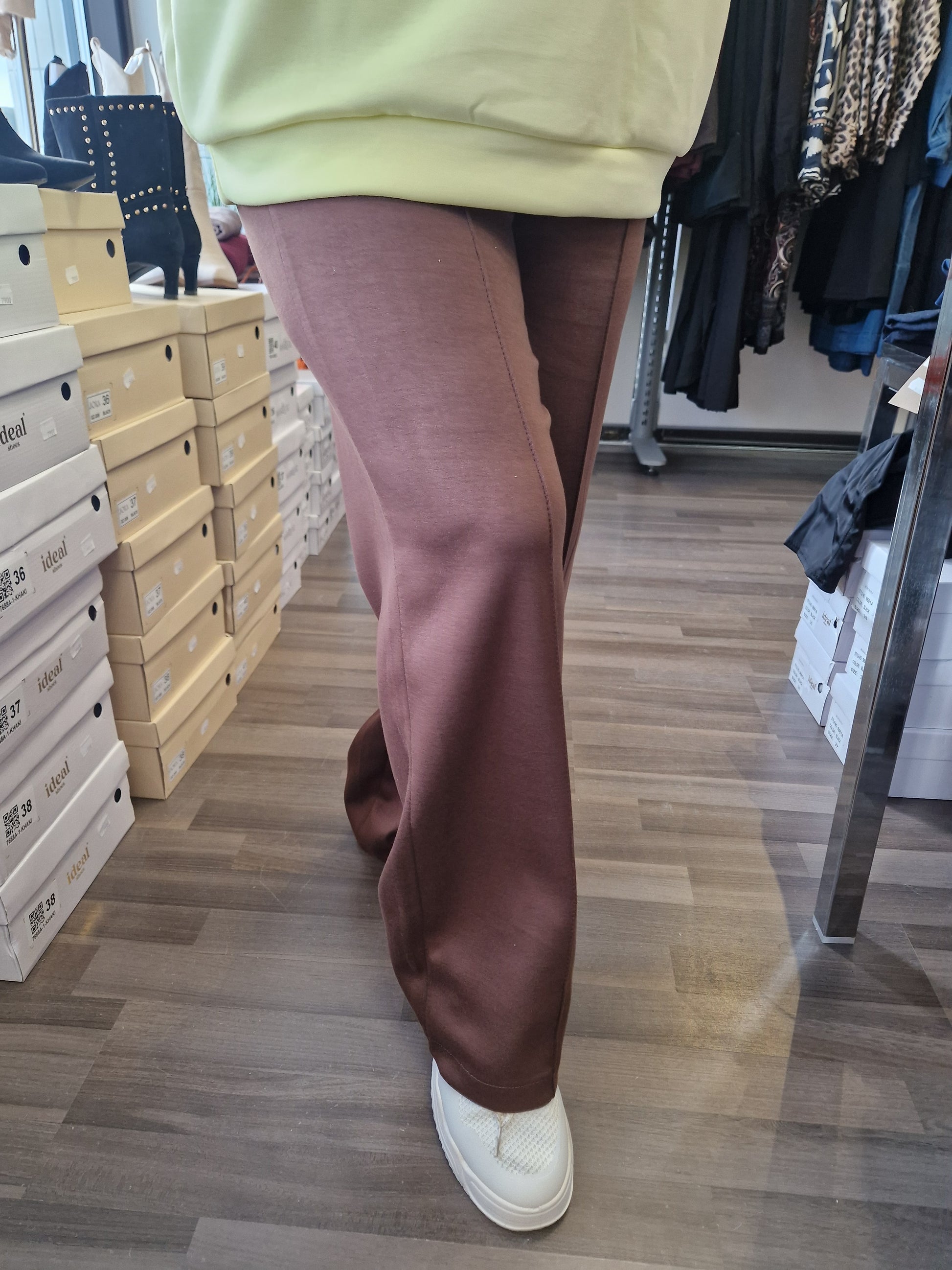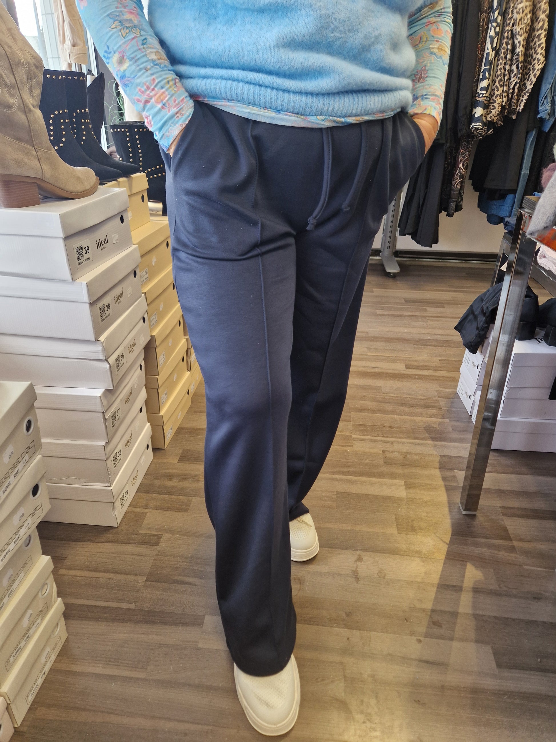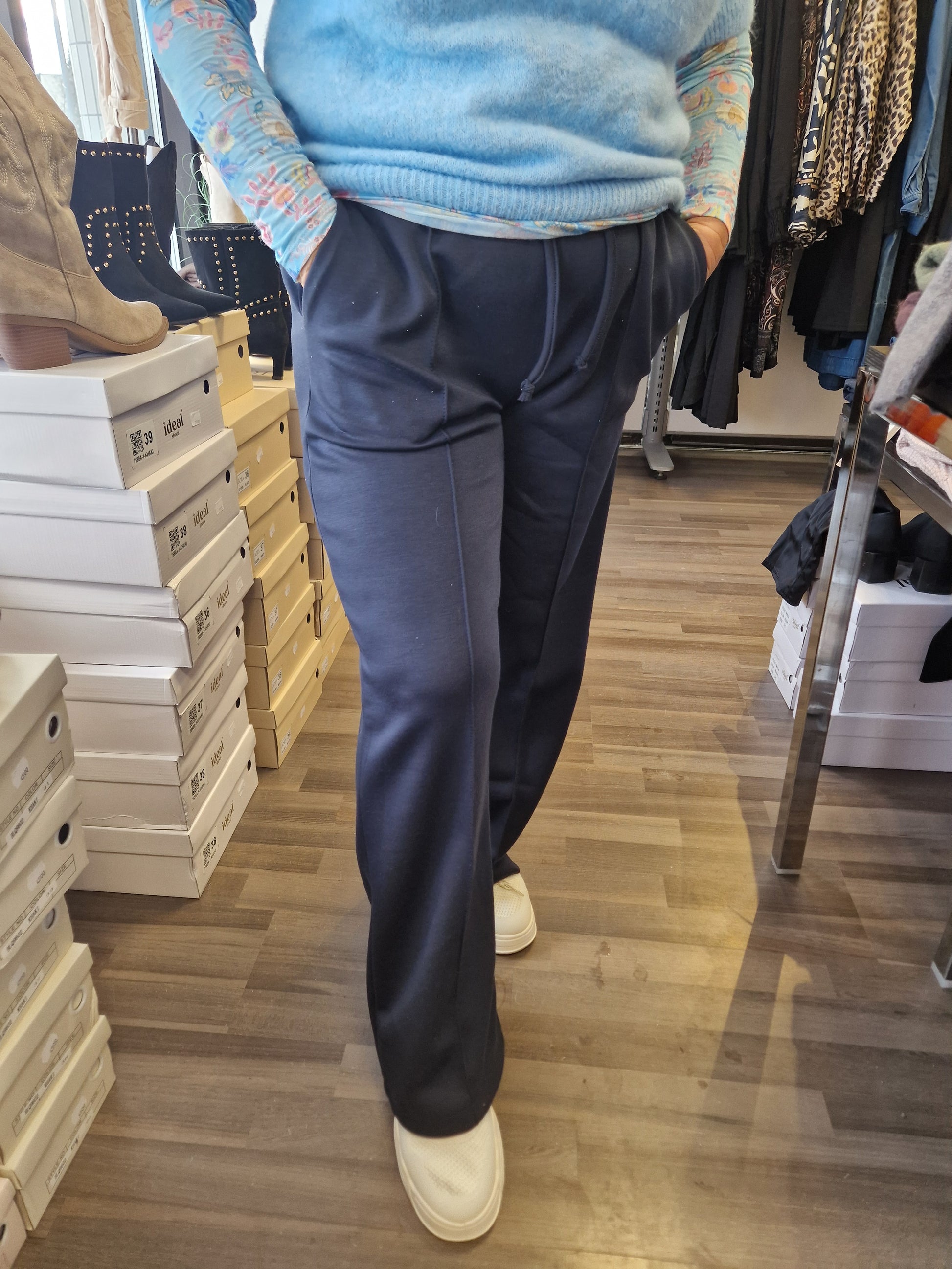 Joustavalla vyötärönauhalla nauhakiinnitys. Suora lahkeinen, etutaskut sekä edessä tikattu 'prässi'. Kevyt ja liukas materiaali päällä. Ihana päällä!