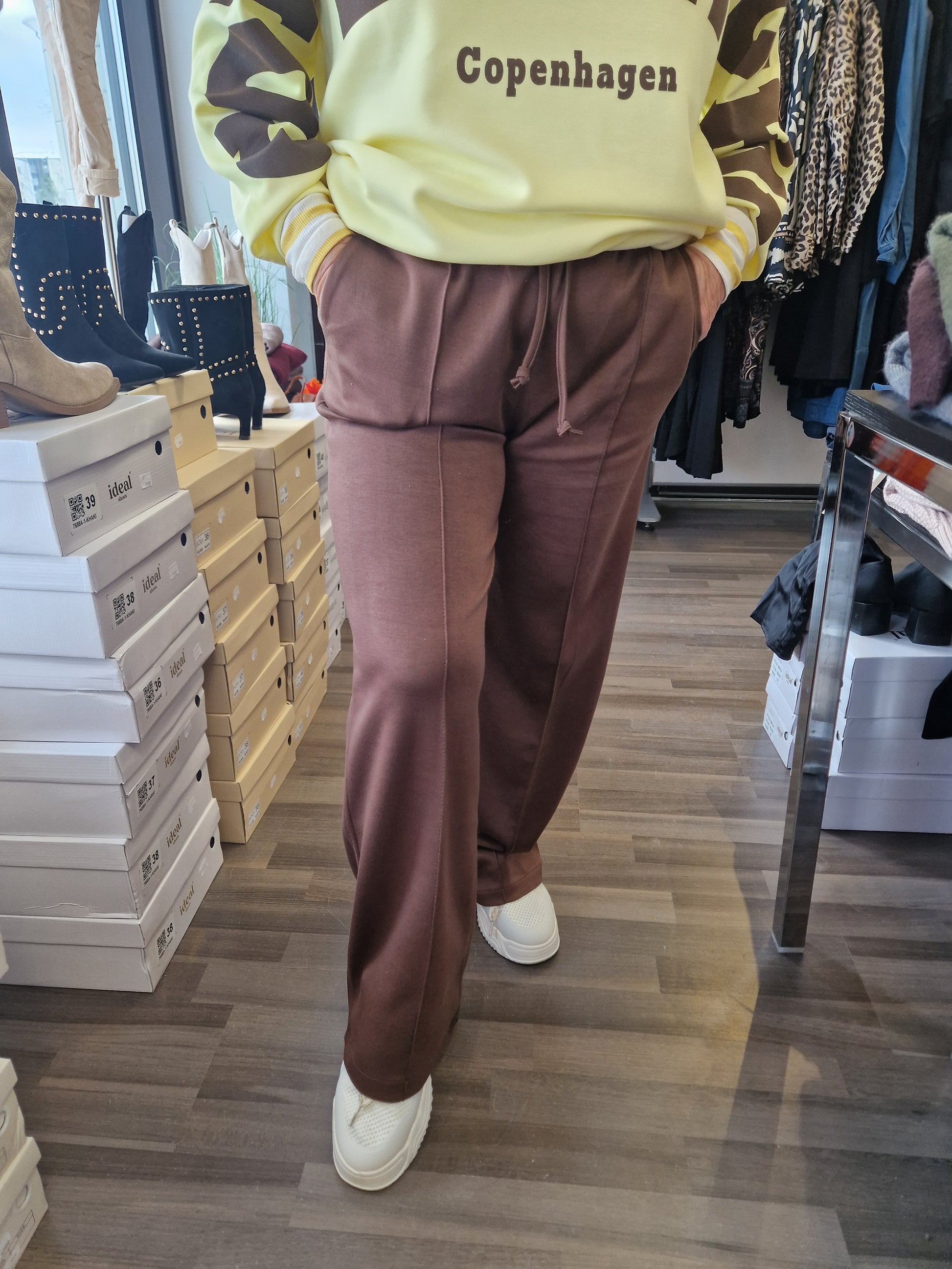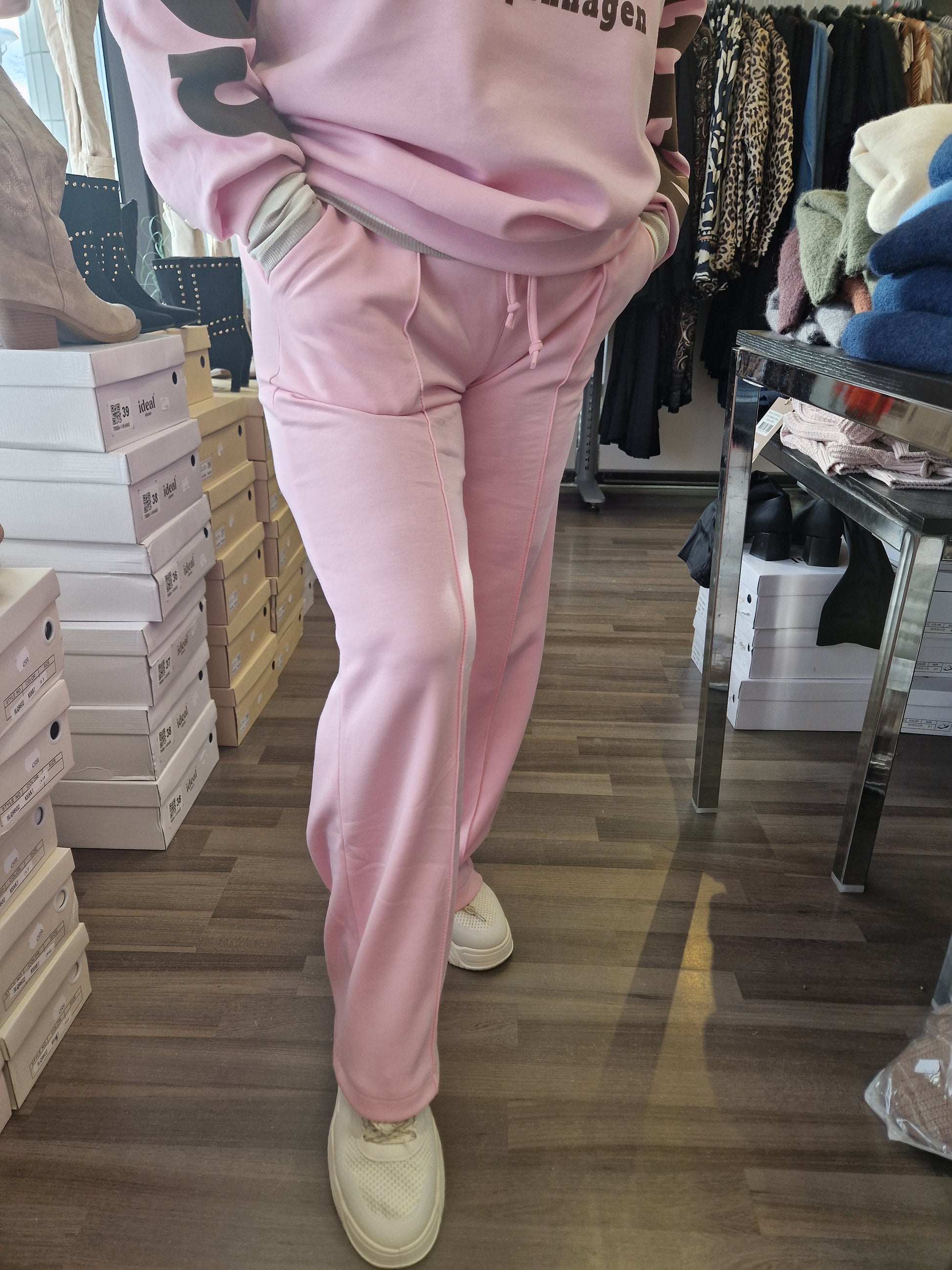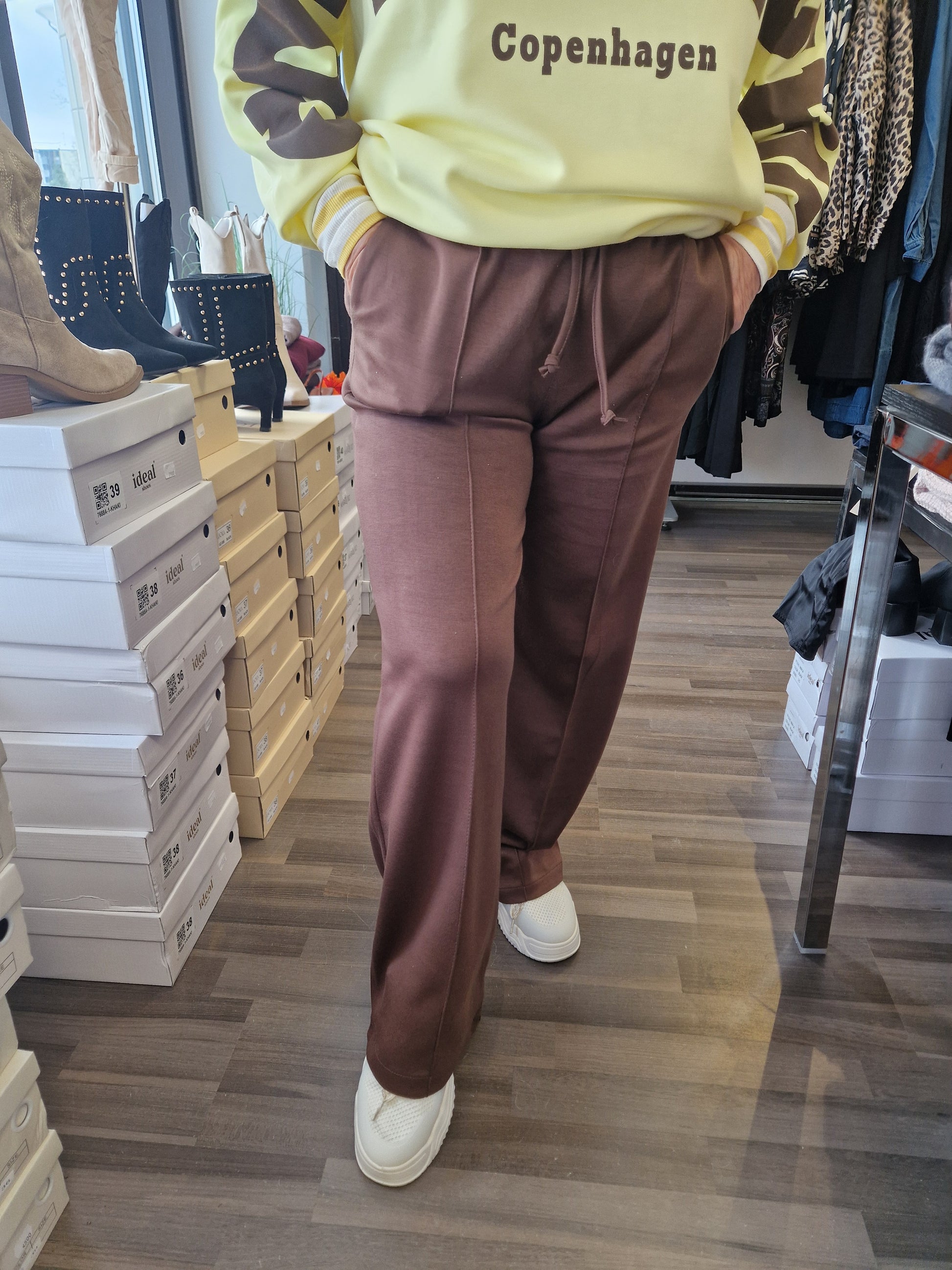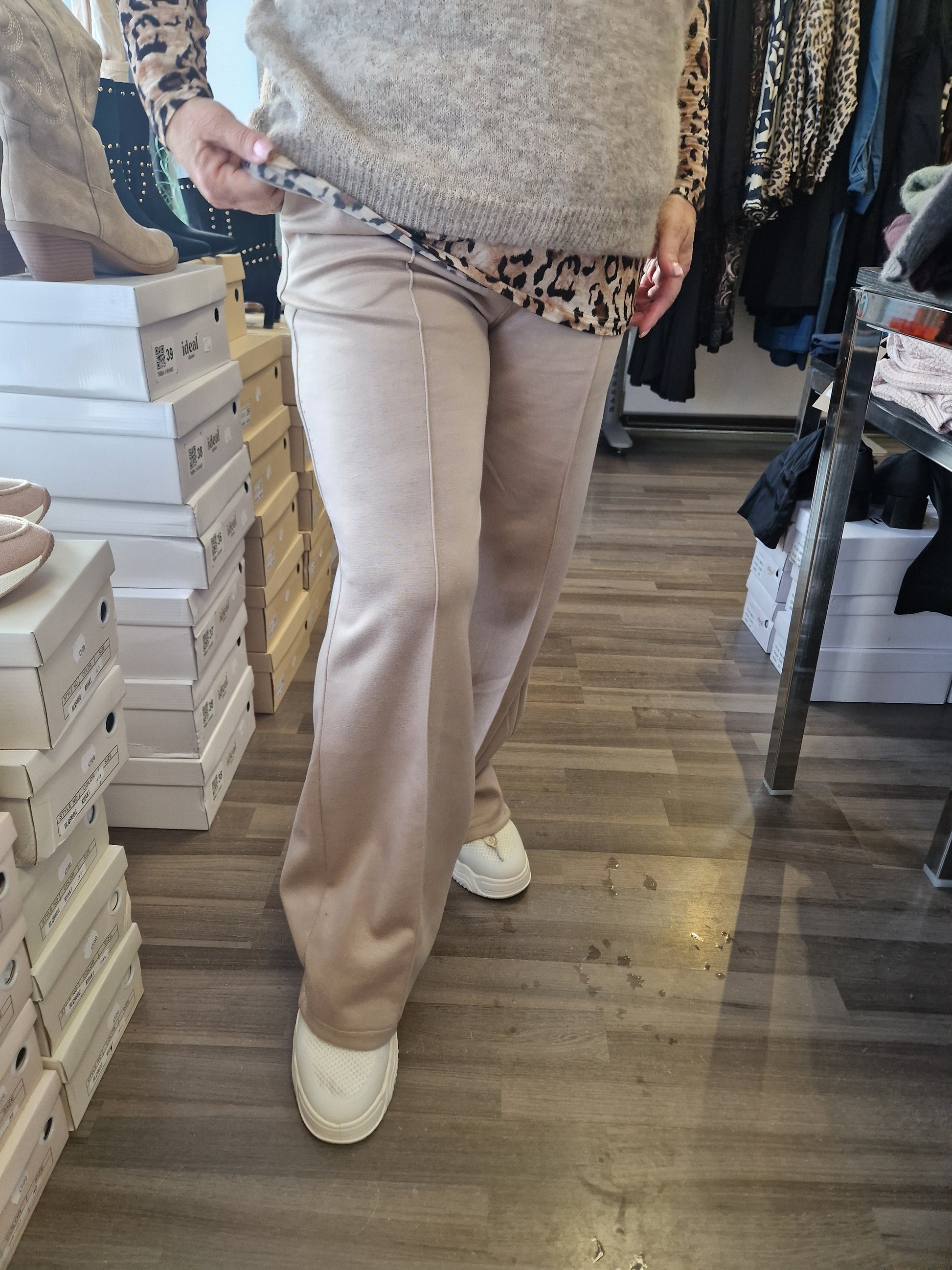 Joustavalla vyötärönauhalla nauhakiinnitys. Suora lahkeinen, etutaskut sekä edessä tikattu 'prässi'. Kevyt ja liukas materiaali päällä. Ihana päällä!