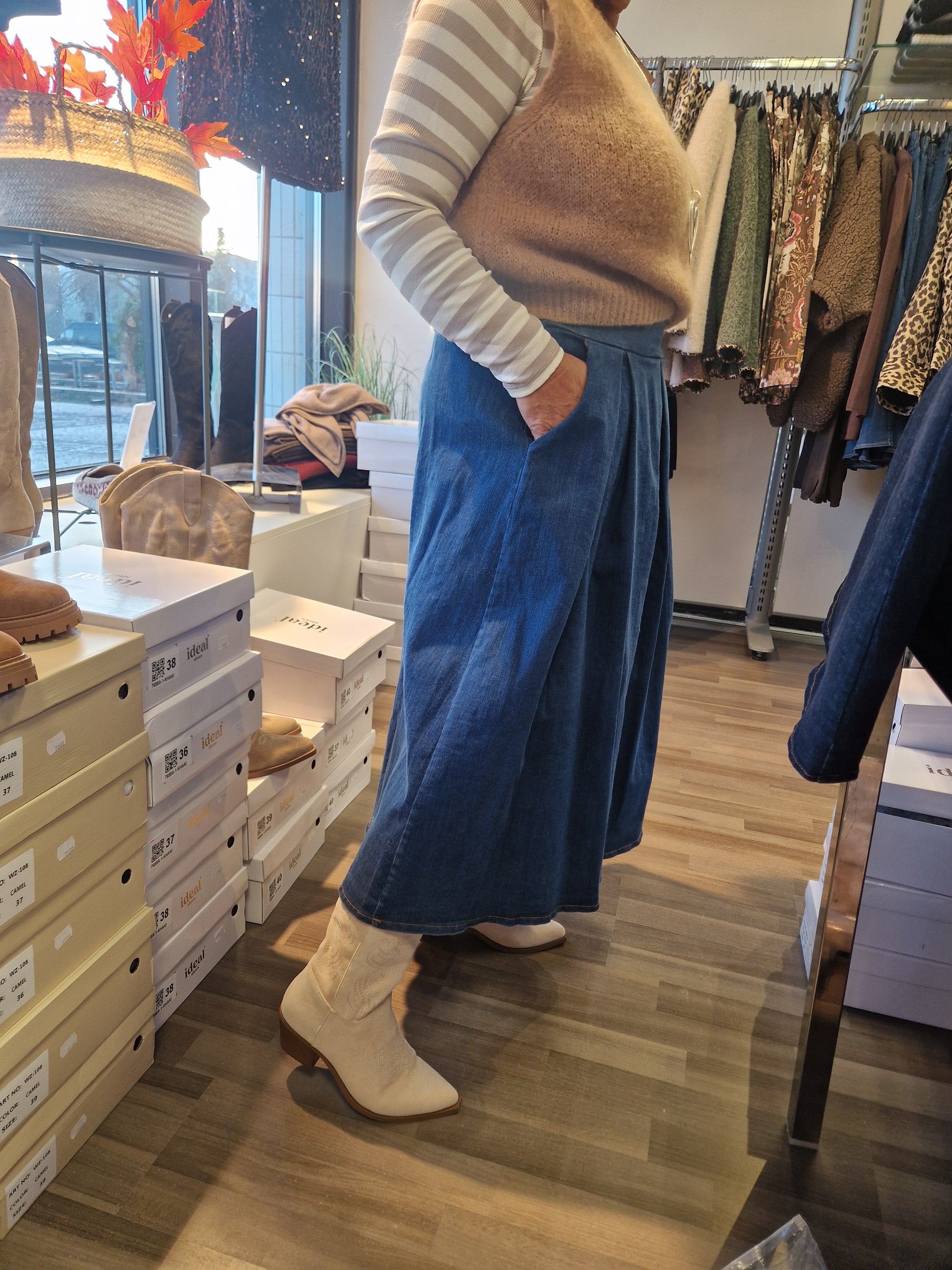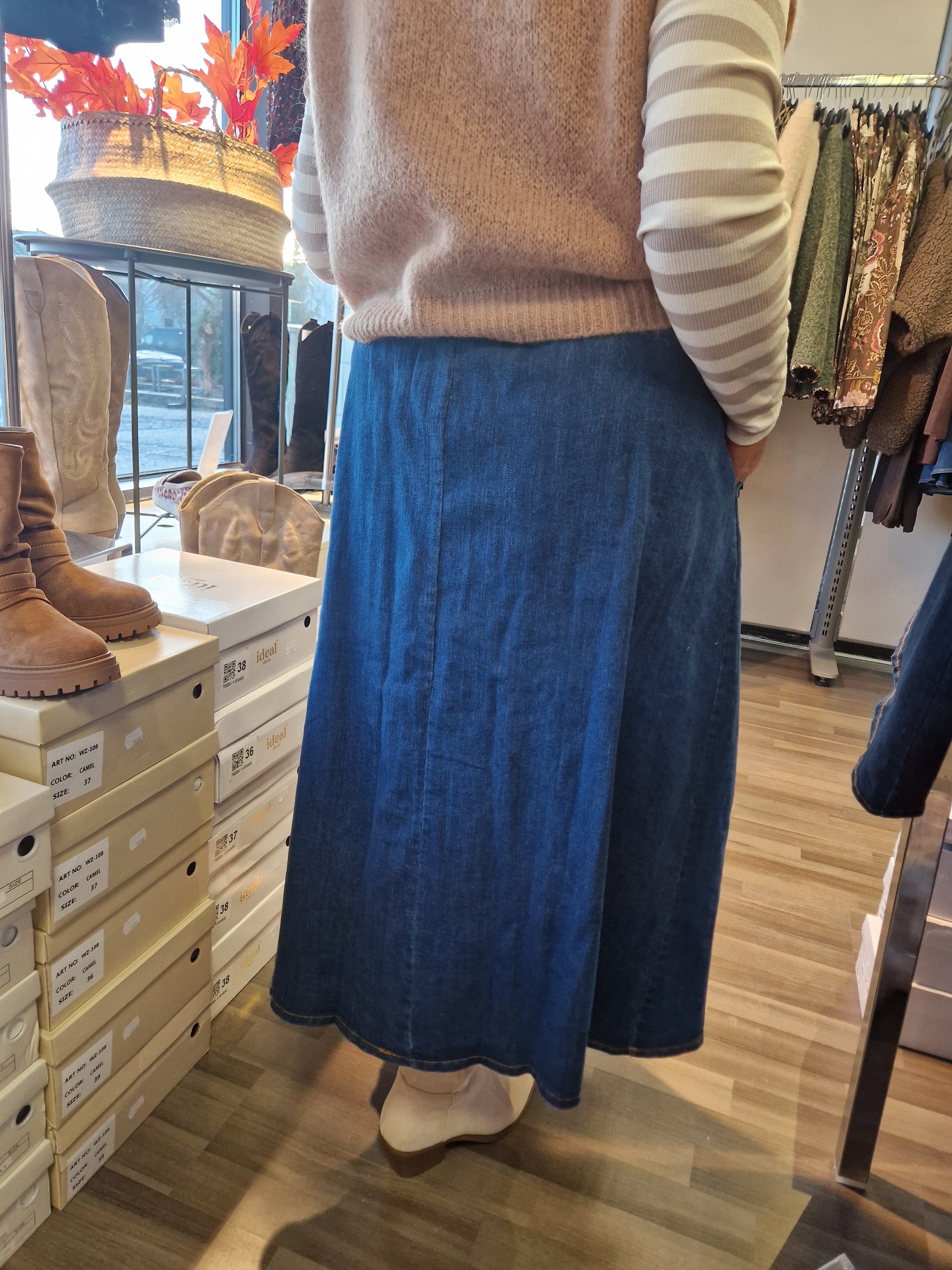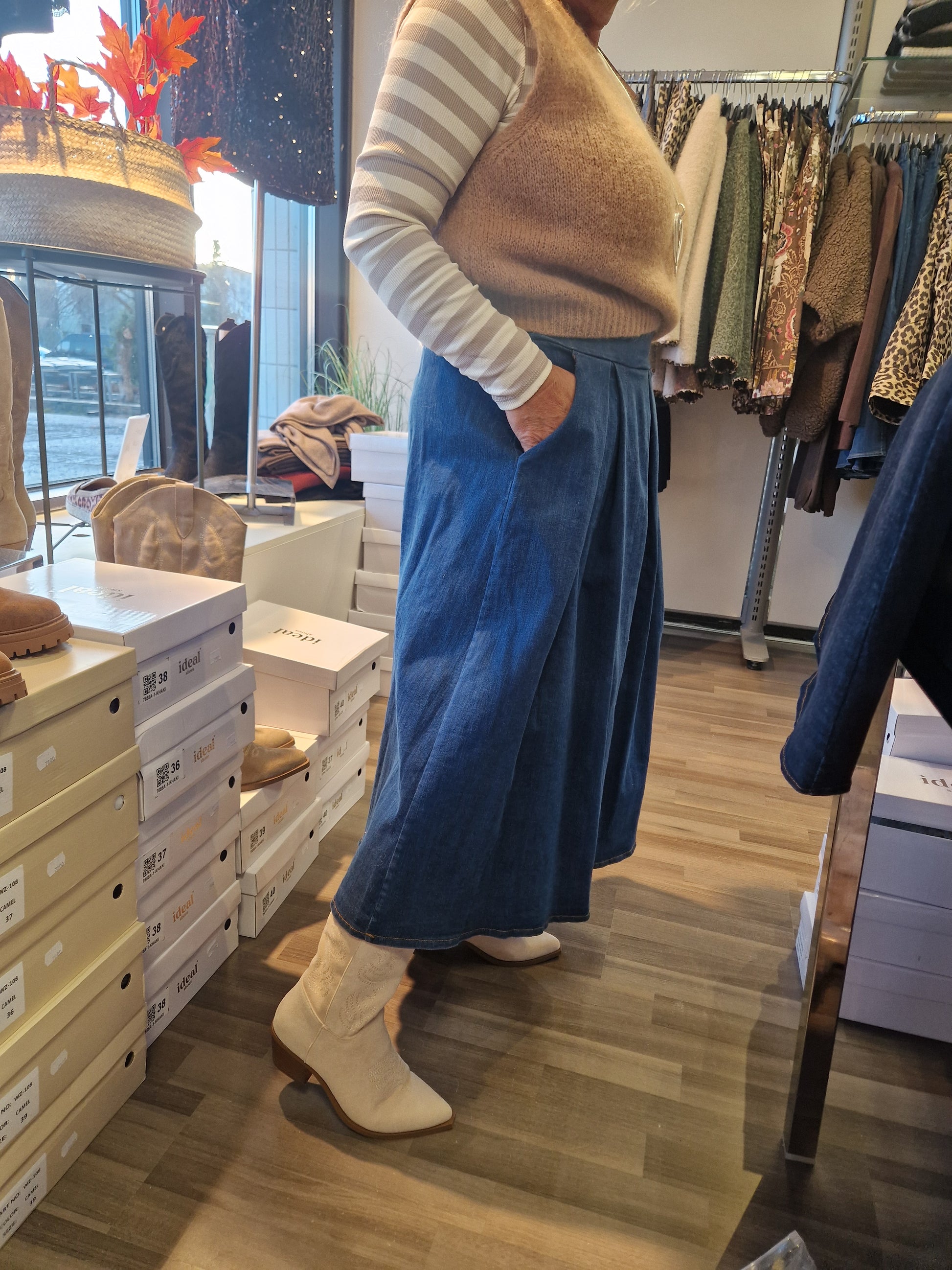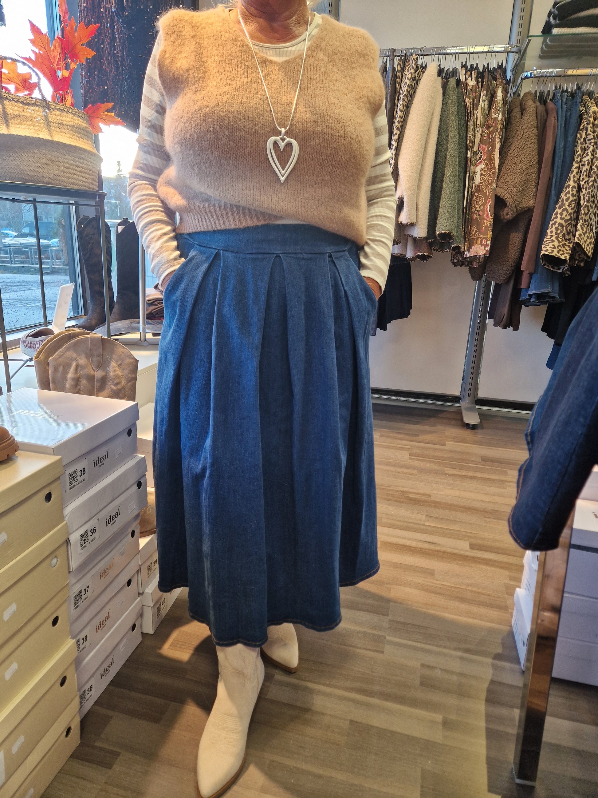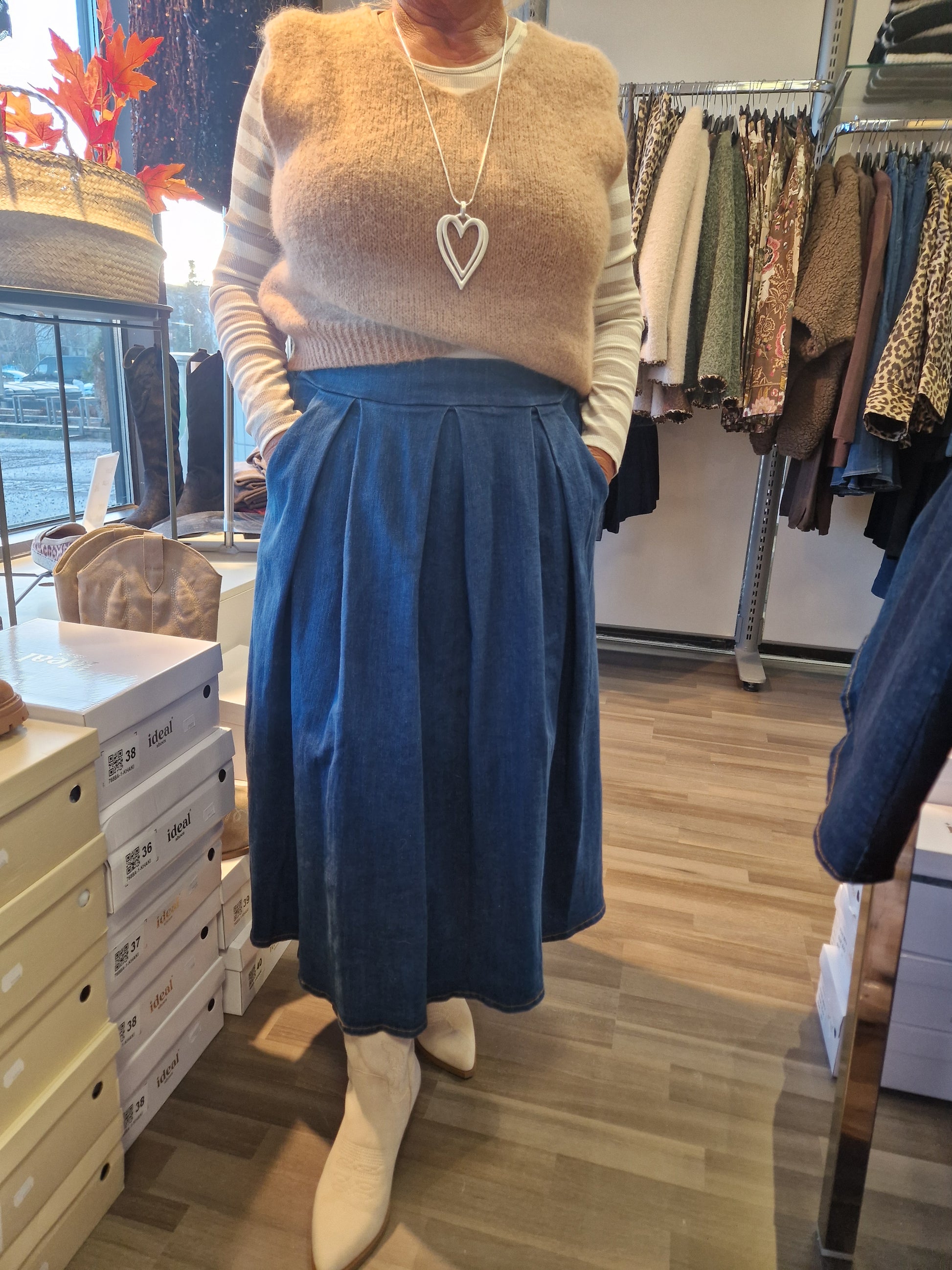 Farkkuhame, jossa takana joustava rypytetty kuminauha vyötärö. Edessä taskut ja laskokset. Keskivahvaa farkkukangasta.