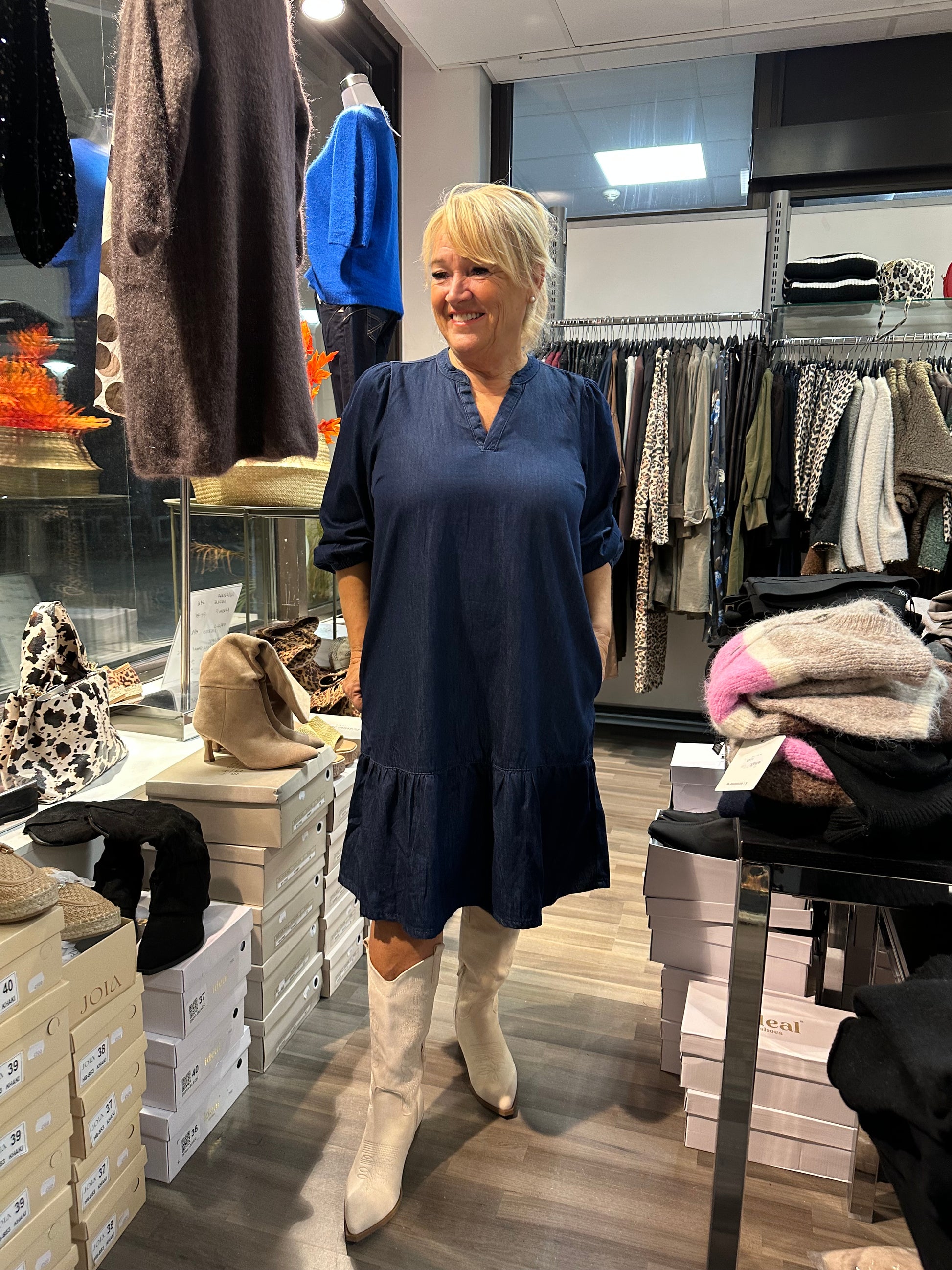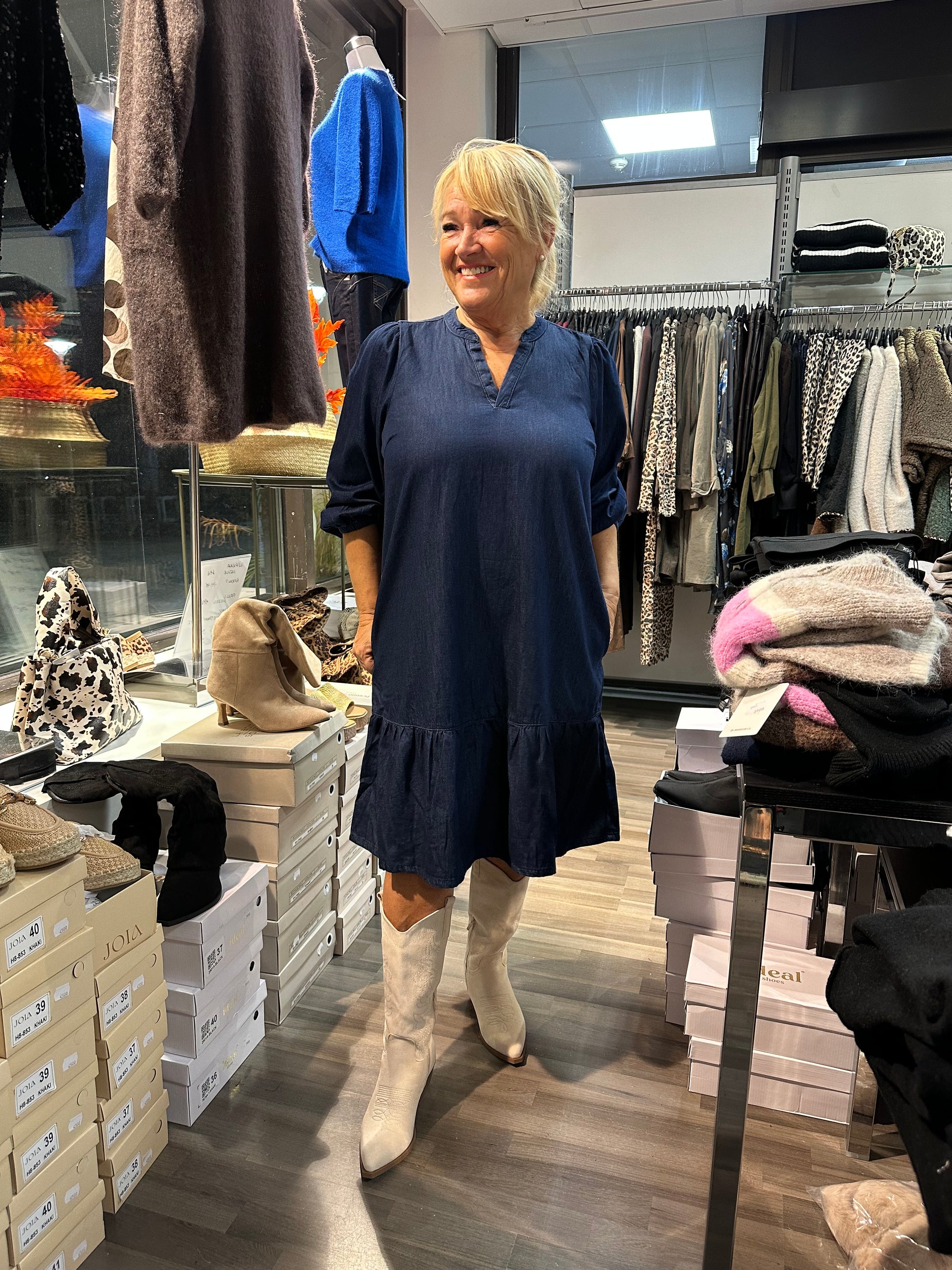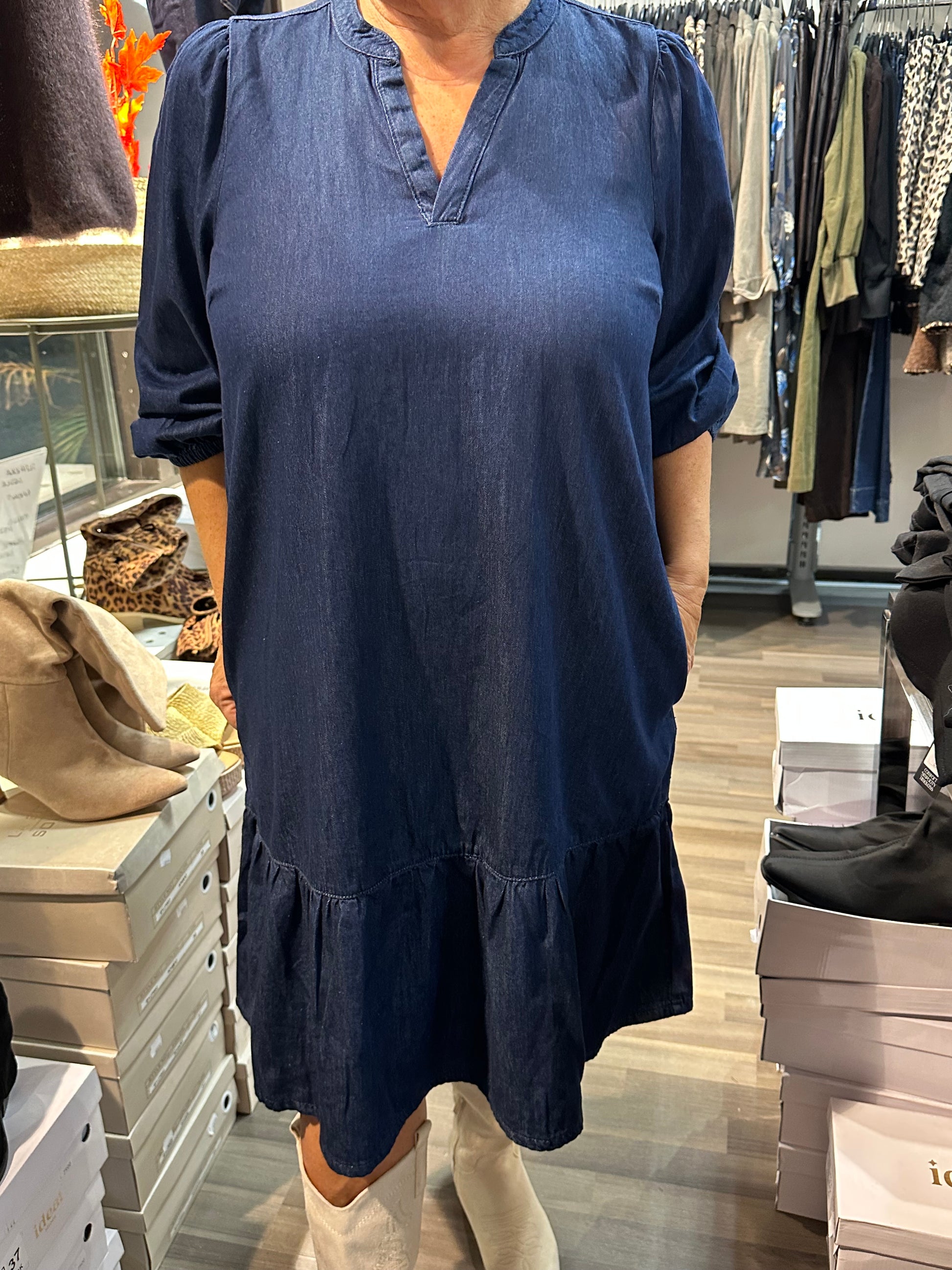 Makee farkkumekko pehmeästä puuvillasta! A-linjainen malli ja helmassa kiva frilla. Puolipitkät puhvihihat ja hihansuissa joustava kuminauha. V-pääntie.