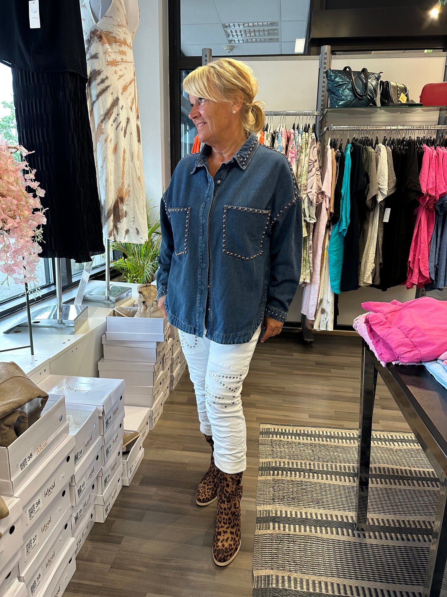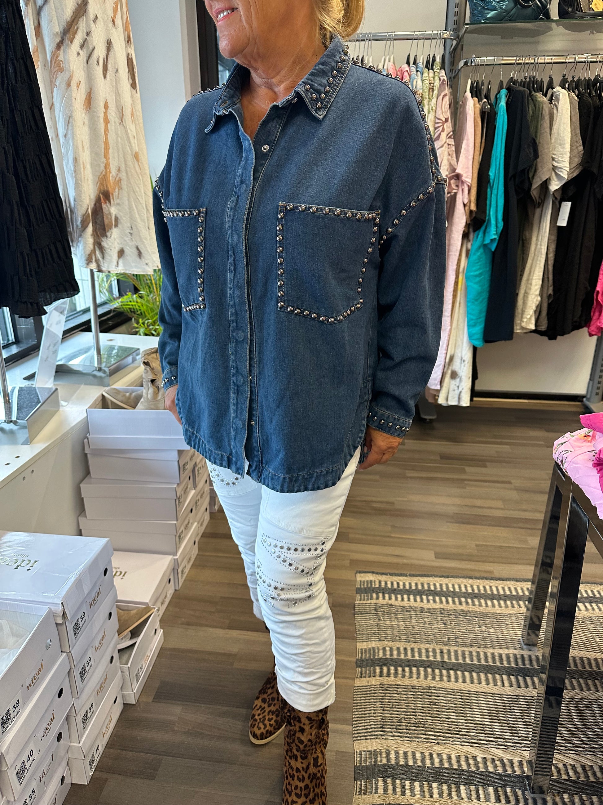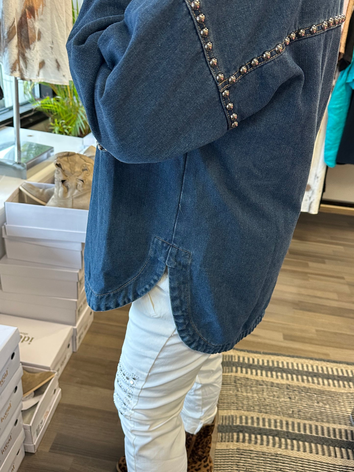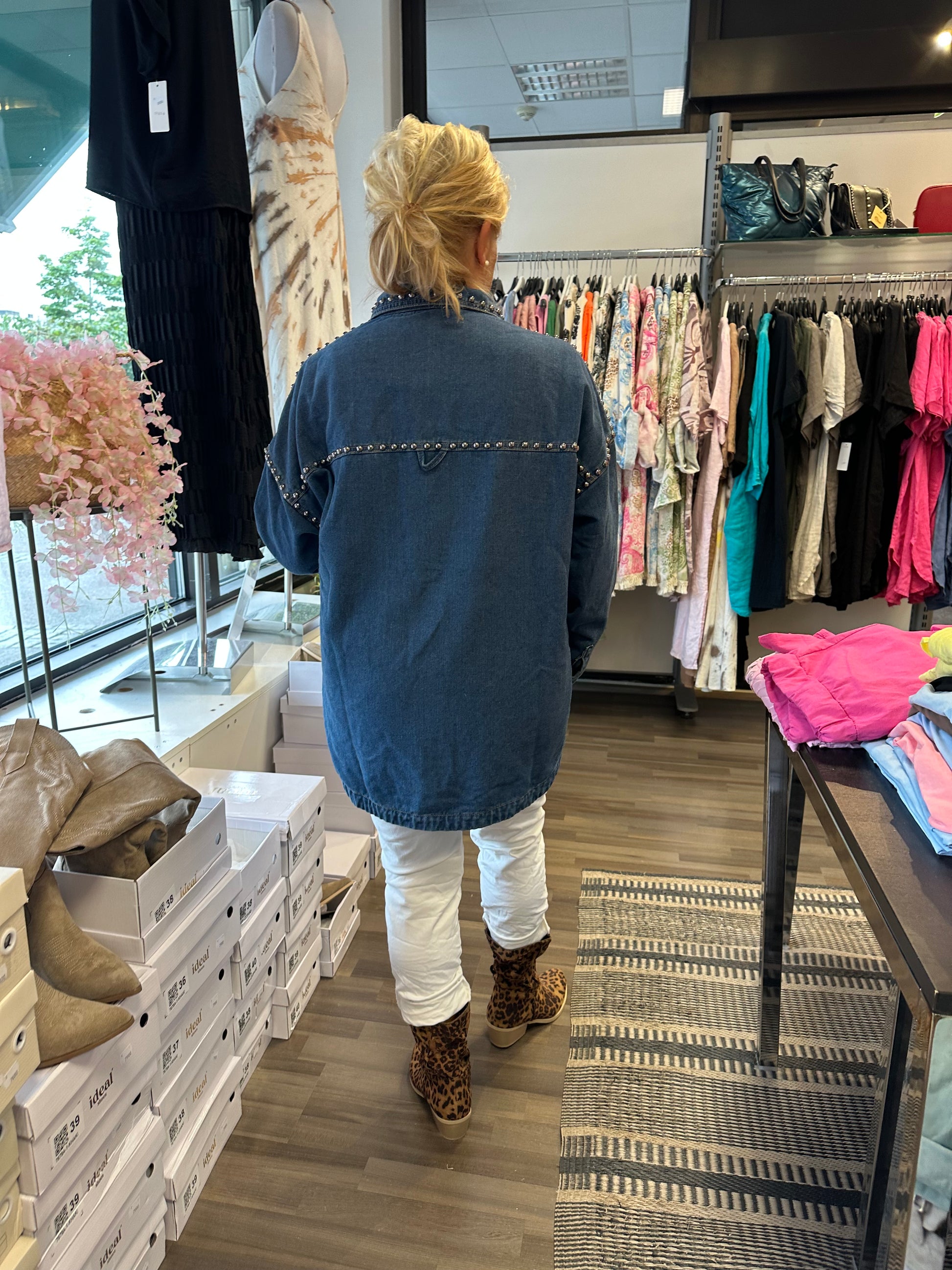Makee paitis-mallinen farkkutakki niittikoristeilla. Vahvaa denimiä. Nepparikiinnitys. Sivuilla halkiot.