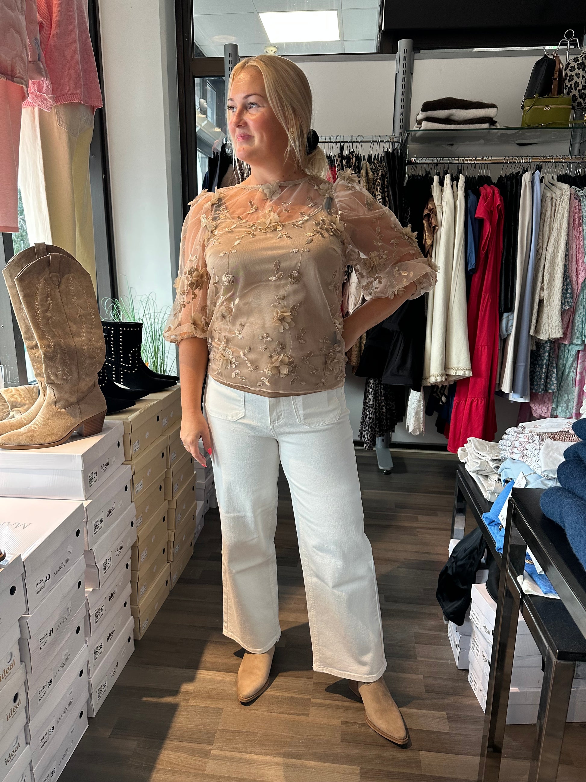 Romanttinen brodeerattu mesh-pusero, jossa 3D-kukkia! Puhvihihat ja hihansuissa joustava kuminauha. Satiinikantti pääntiellä. Alla irrallinen toppi.