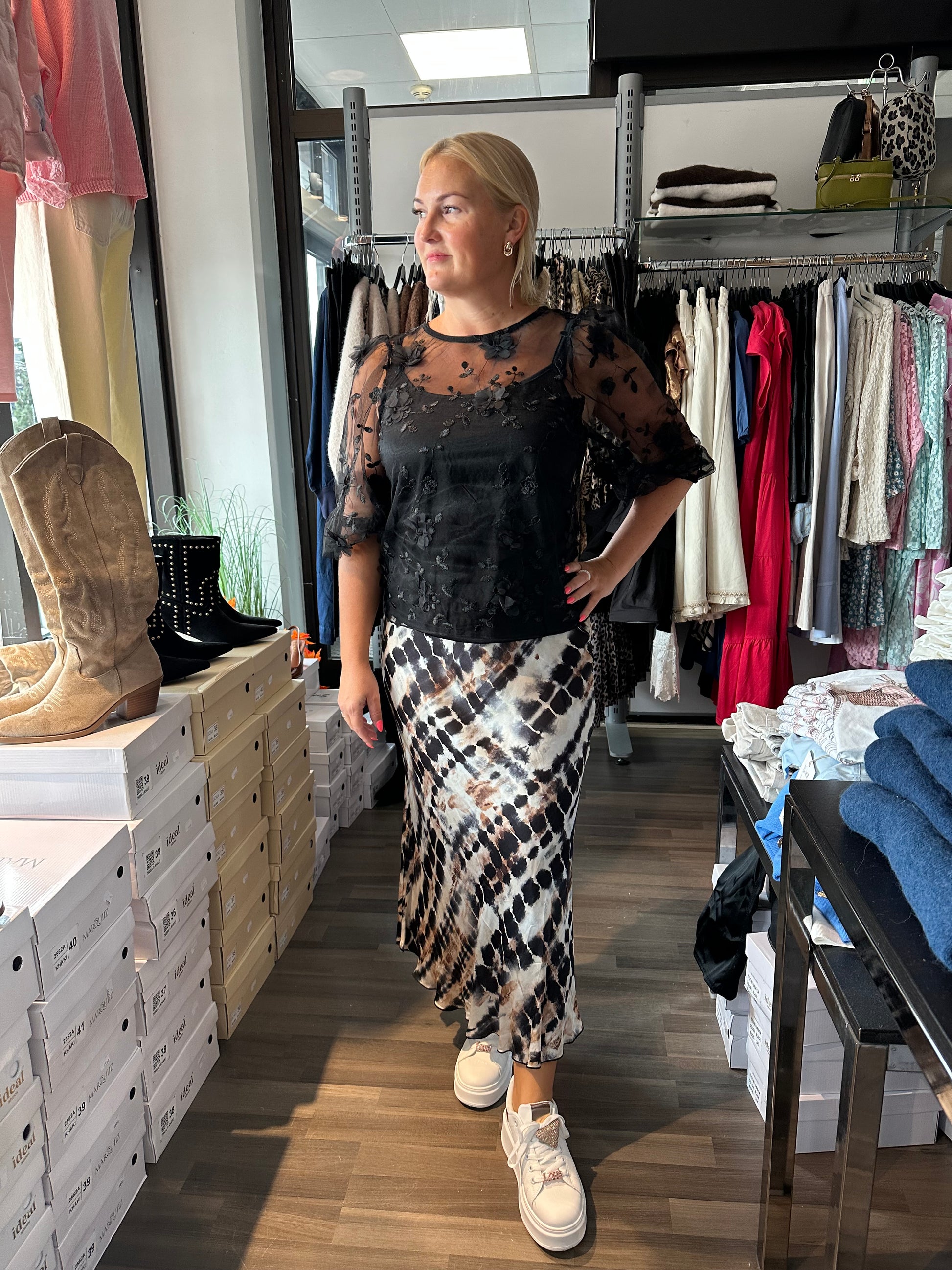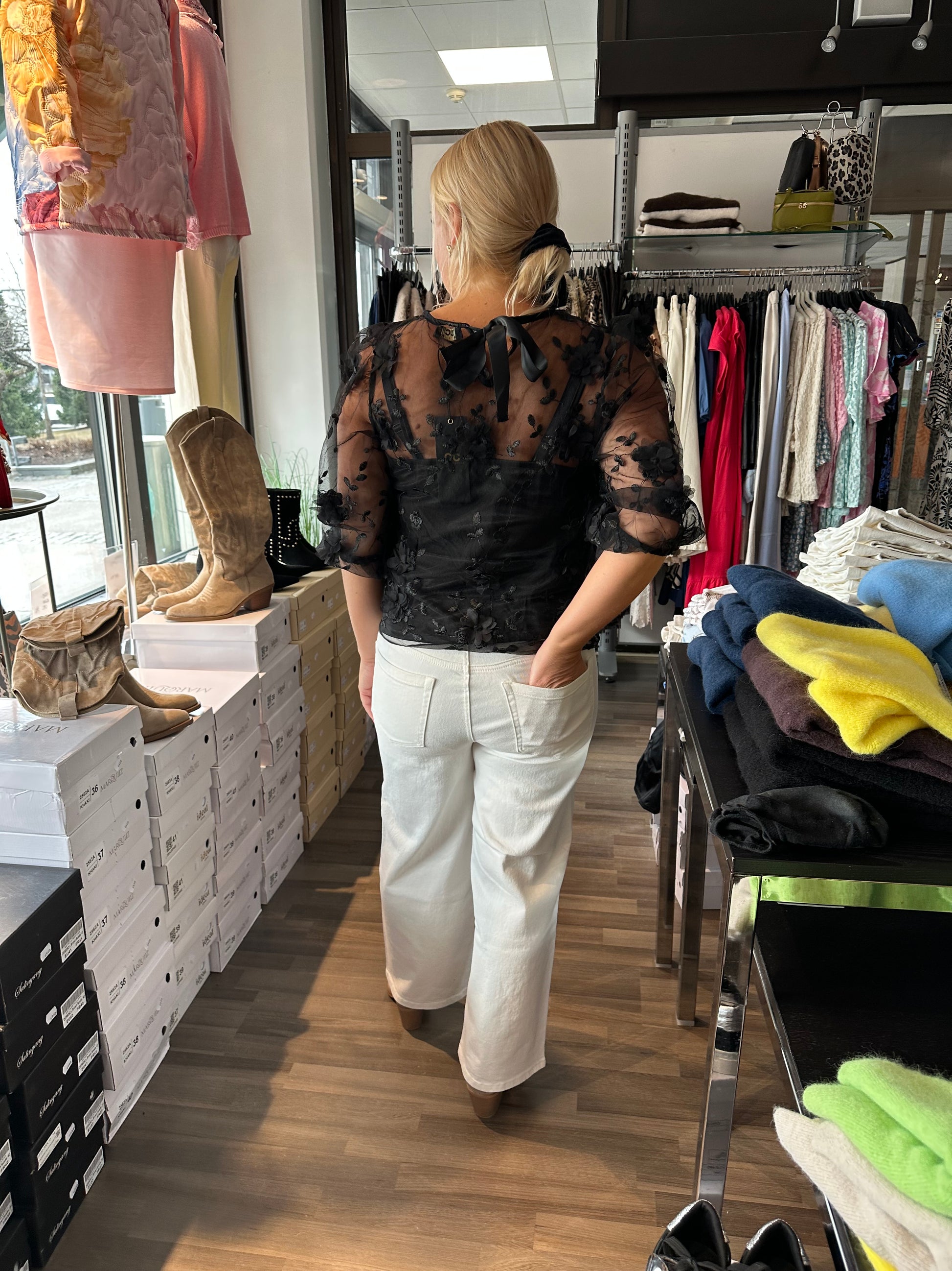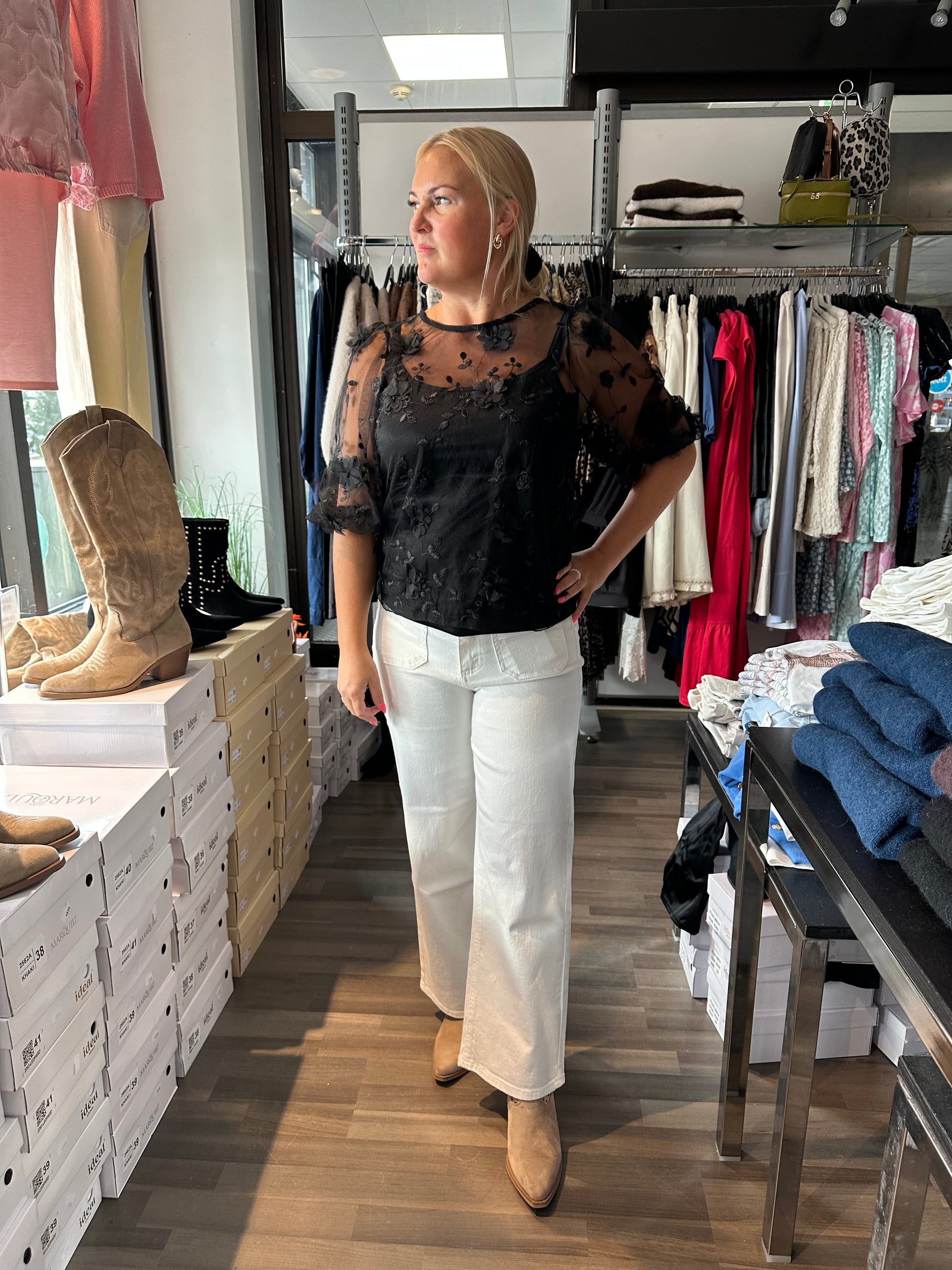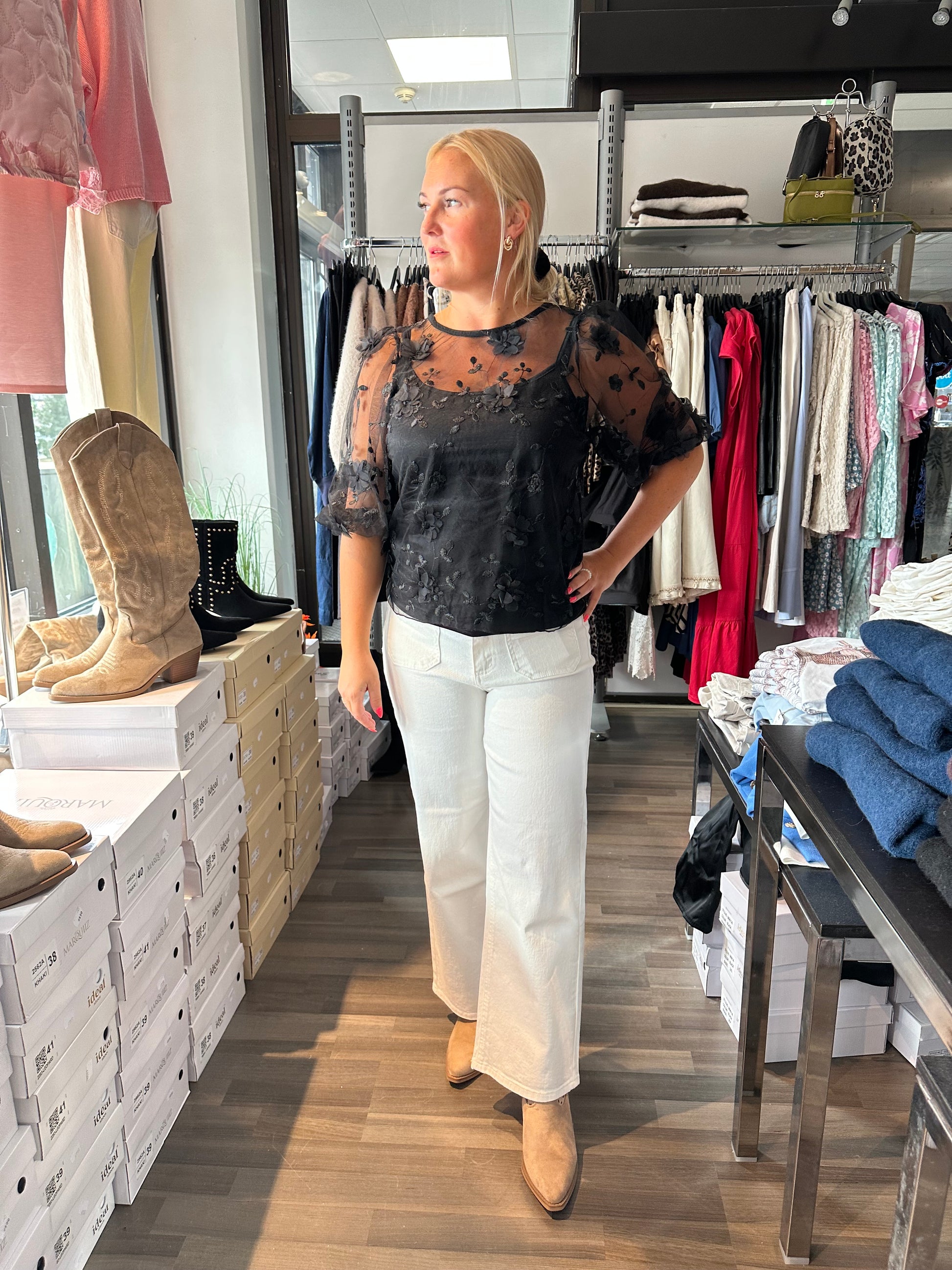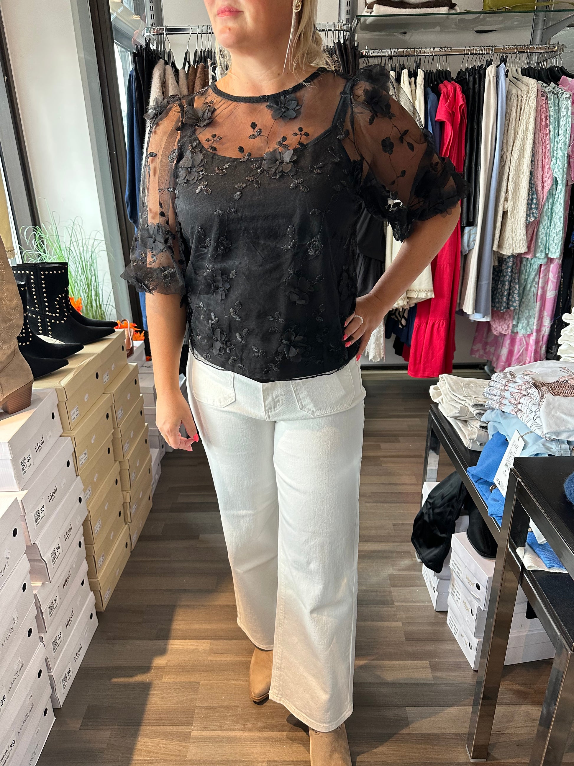 Romanttinen brodeerattu mesh-pusero, jossa 3D-kukkia! Puhvihihat ja hihansuissa joustava kuminauha. Satiinikantti pääntiellä. Alla irrallinen toppi.