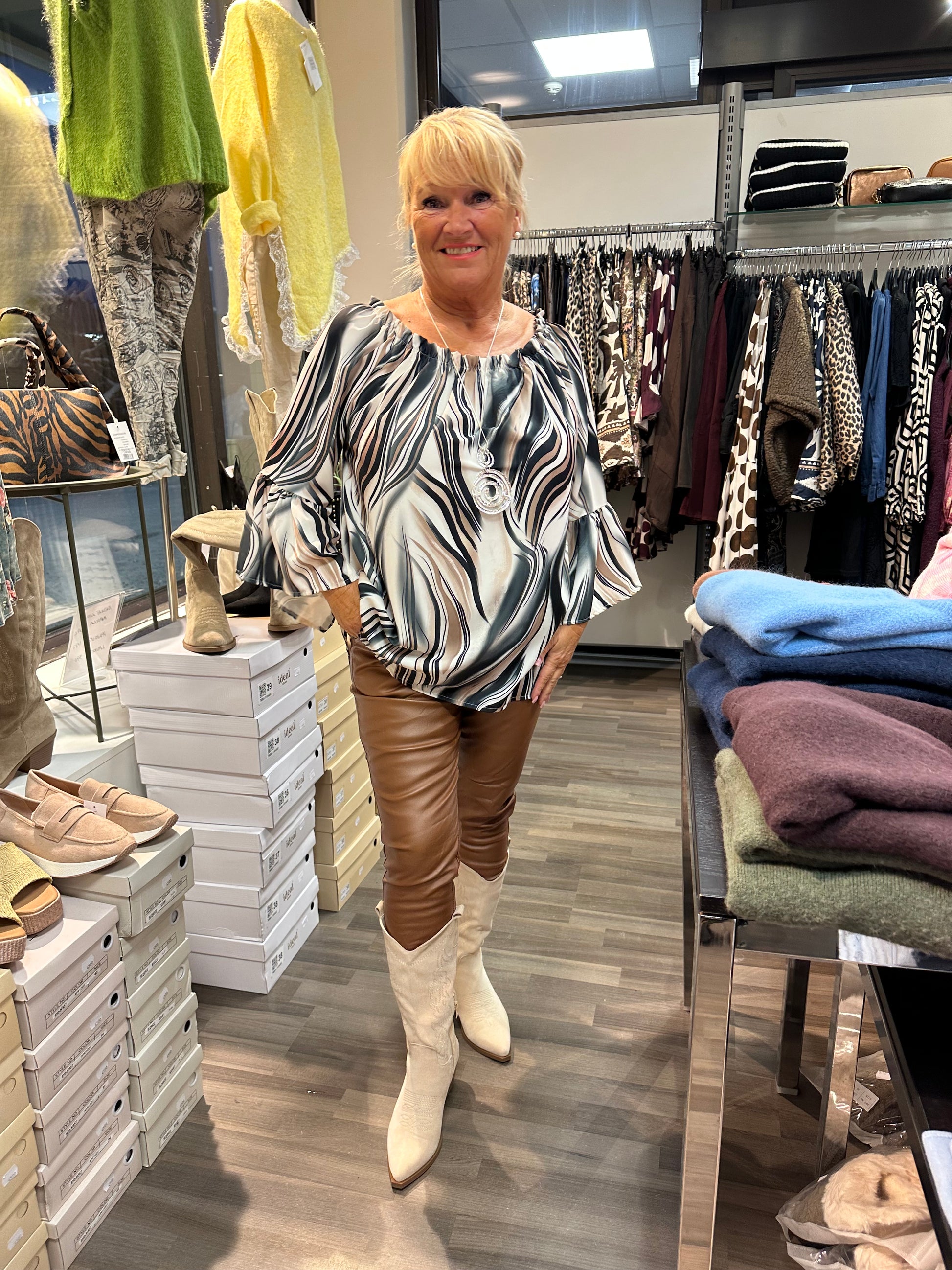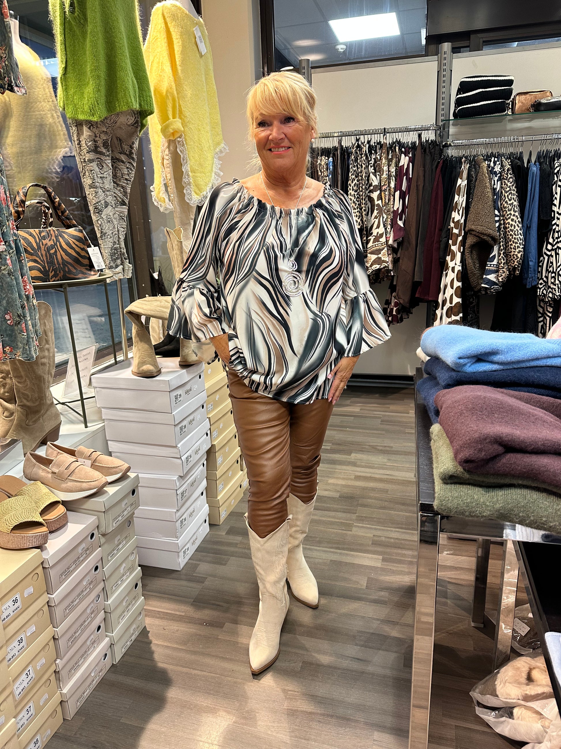 Kaunis frillahihainen pusero hieman reilumpaa kokoa. Pääntiellä joustava kuminauha. Hieman pidempi puseromalli pyöristetyllä helmalla.