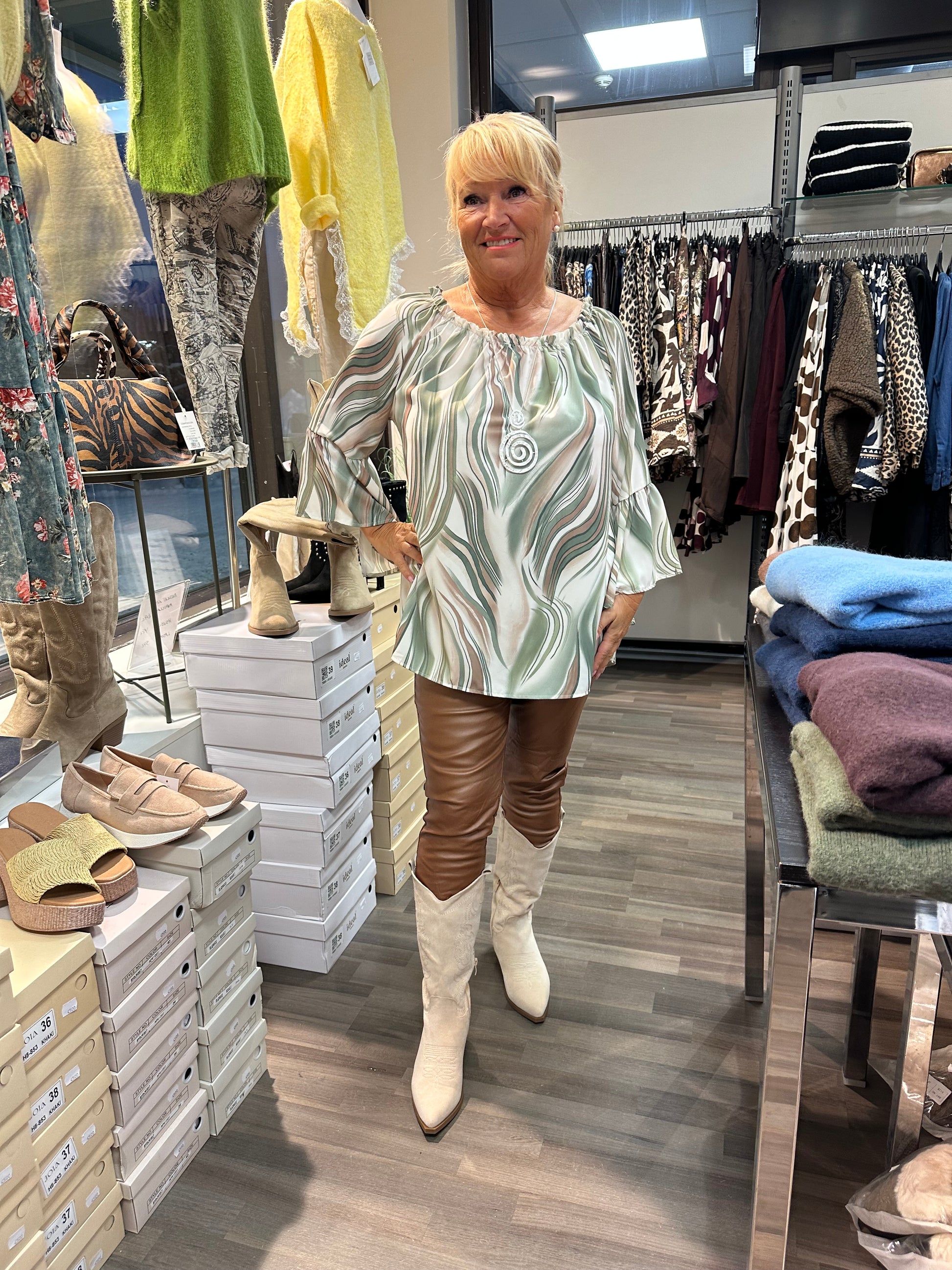 Kaunis frillahihainen pusero hieman reilumpaa kokoa. Pääntiellä joustava kuminauha. Hieman pidempi puseromalli pyöristetyllä helmalla.