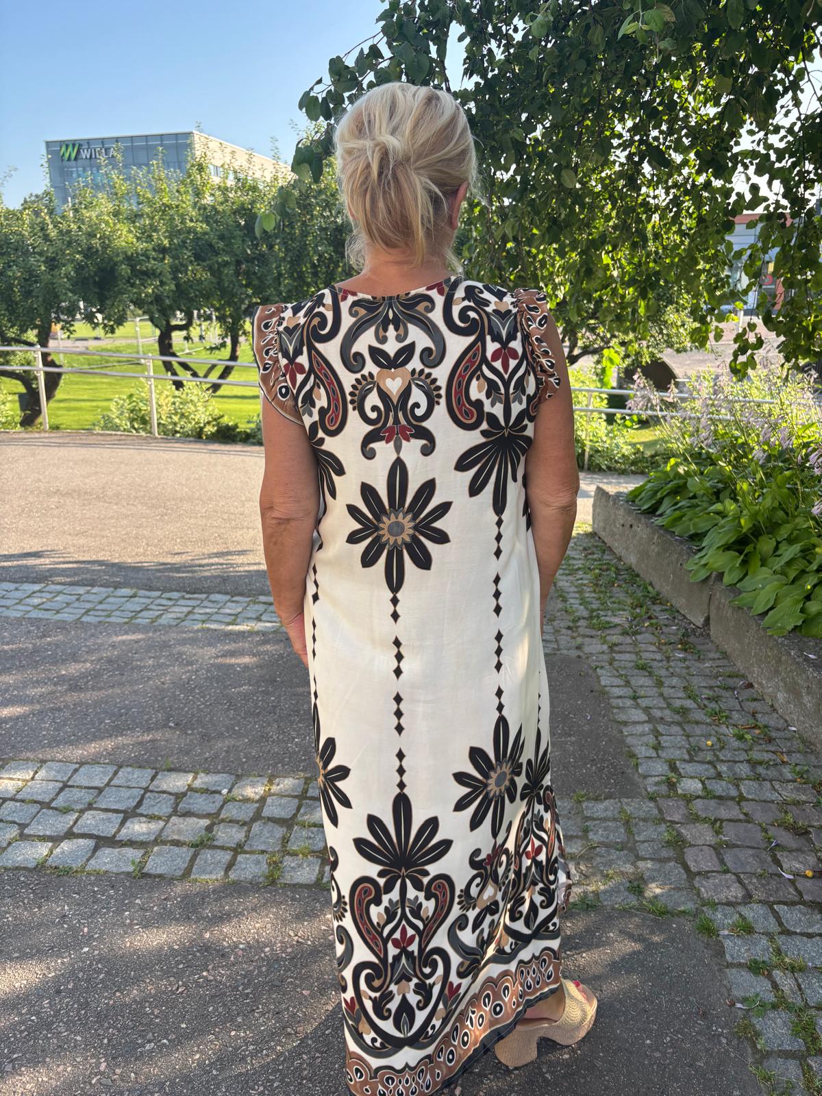 Kauniit vaaleapohjaiset leningit jo vähän syksyisemmillä vörityksillä. Halkiot sivuilla, frillat olkapäillä. V-aukkoinen pääntie. Edessä vastalaskos antaa tilaa.