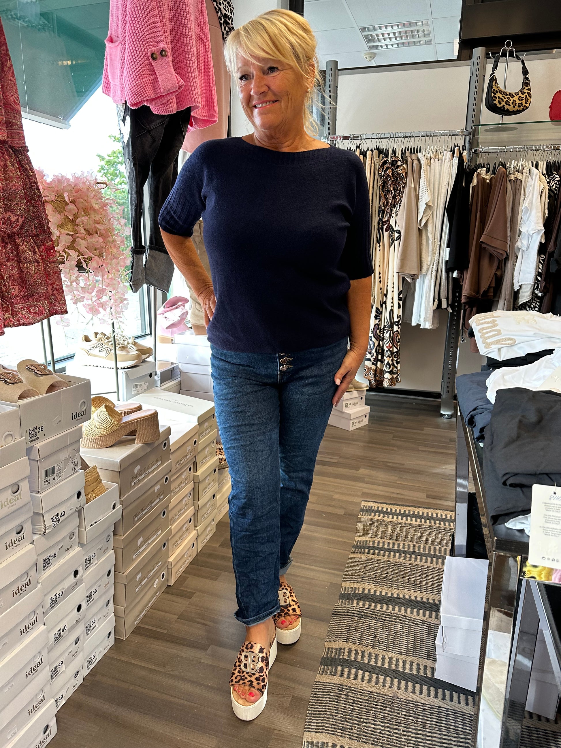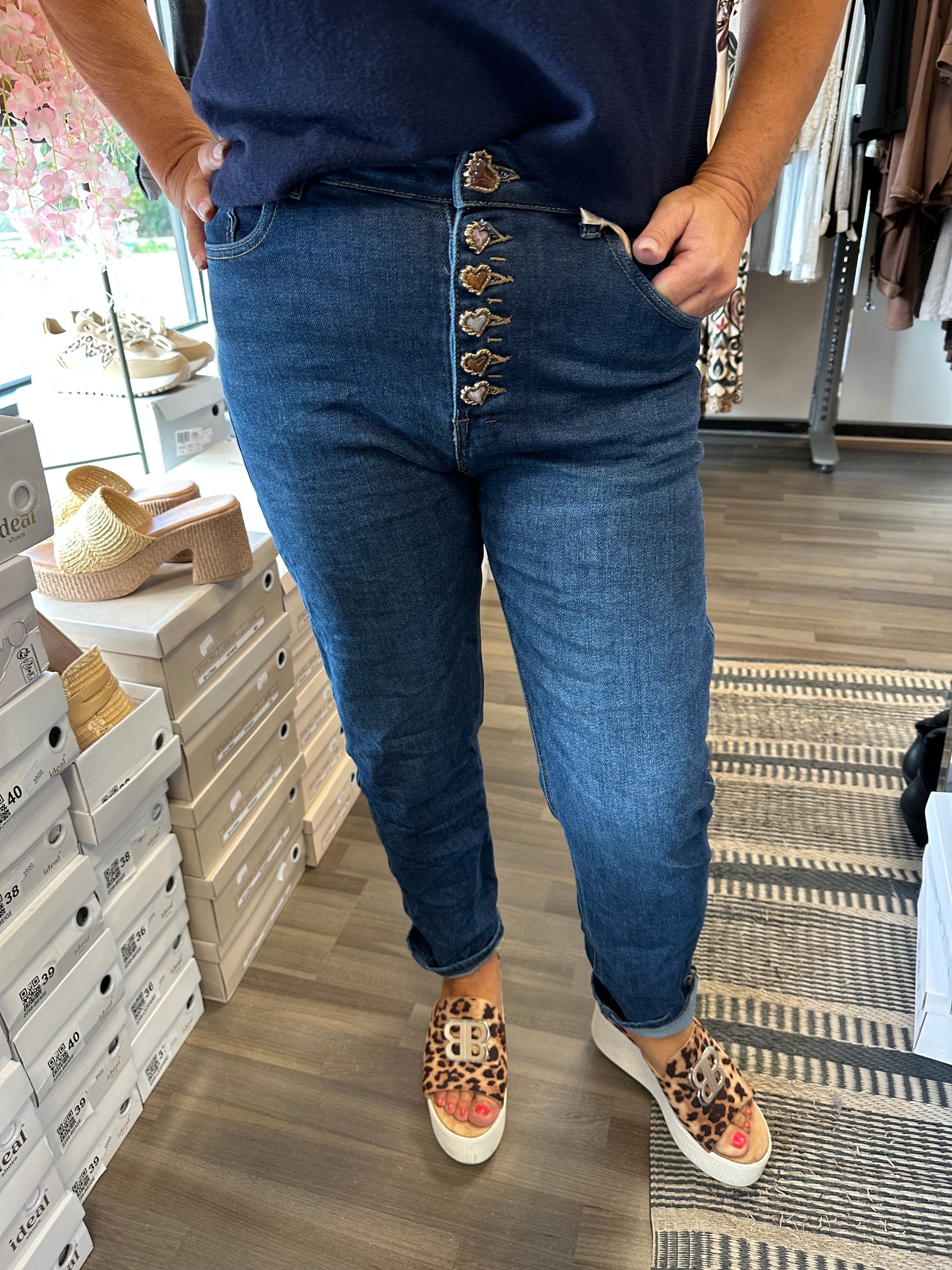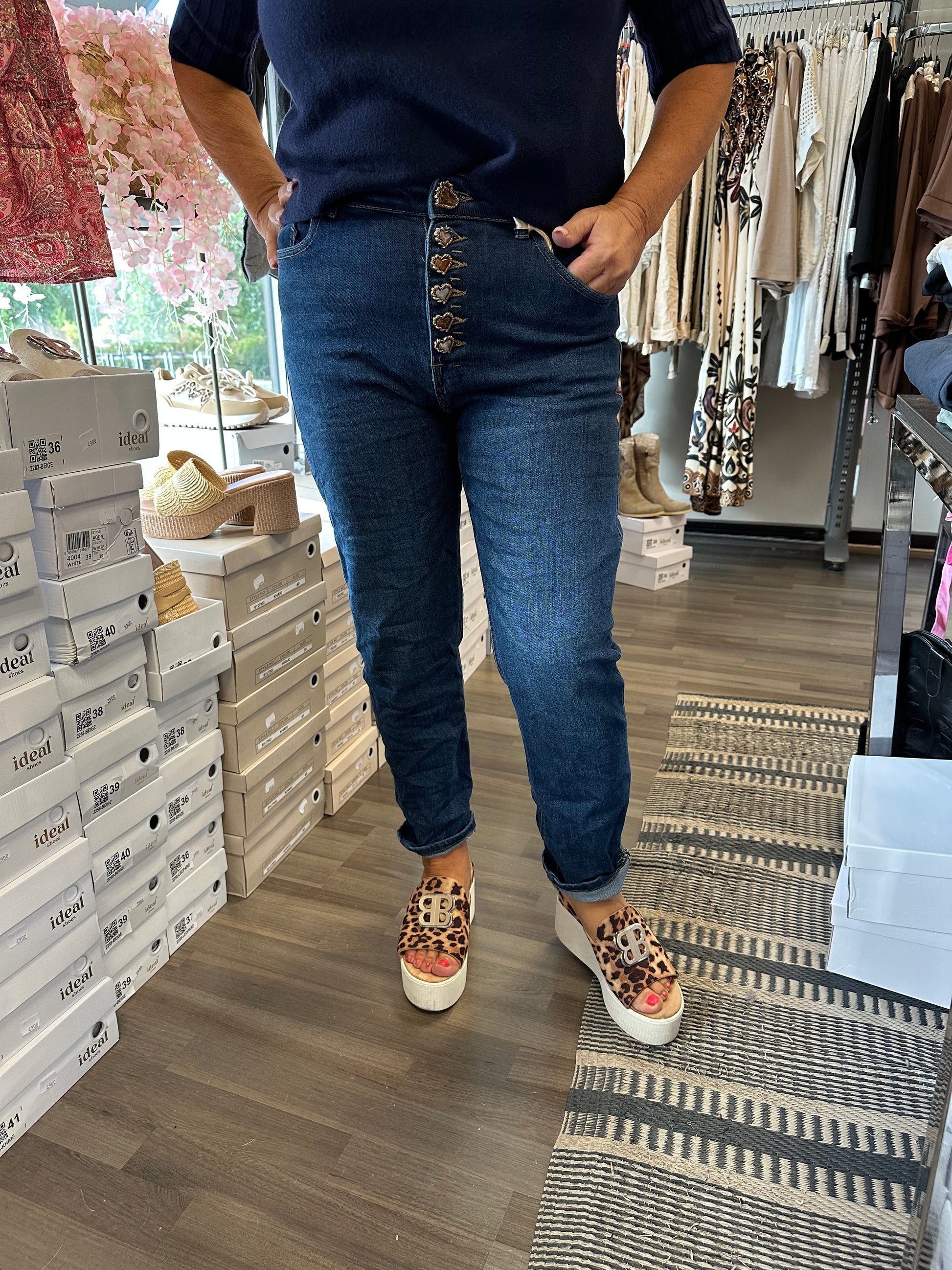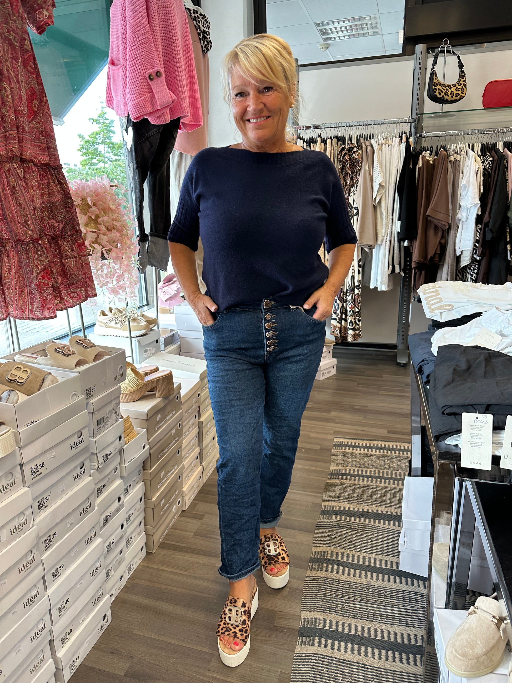 Mukavan kevyet ja joustavat korkeavyötäröiset farkut kivoilla napeilla.