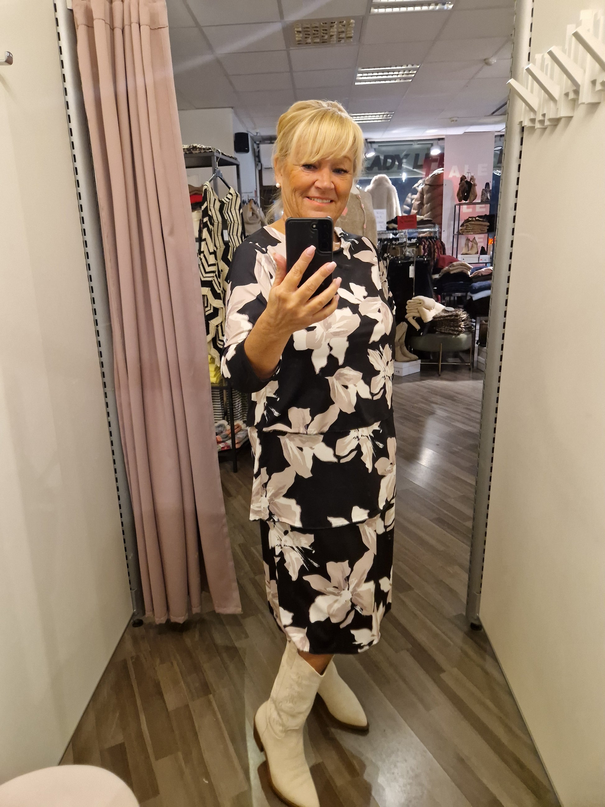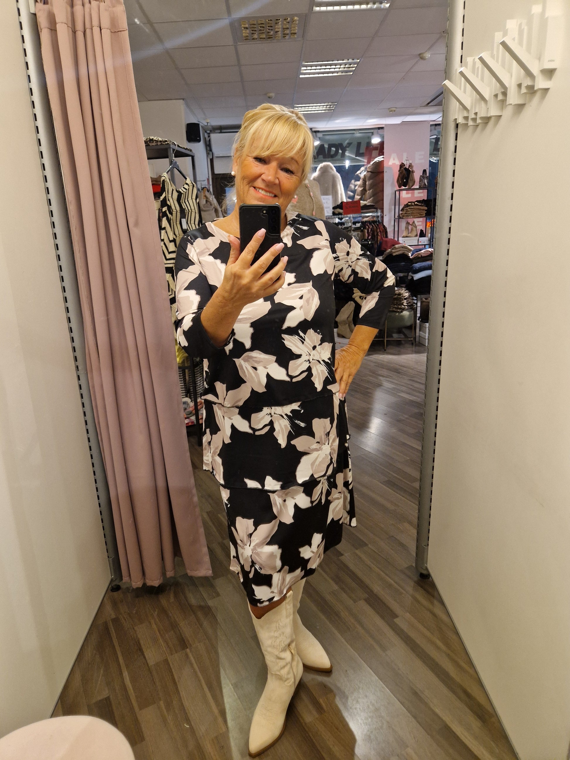Joustavaa trikoota, kerroksellinen mekko. Sopivan kokoinen o-pääntie. Hiha vajaamittainen.