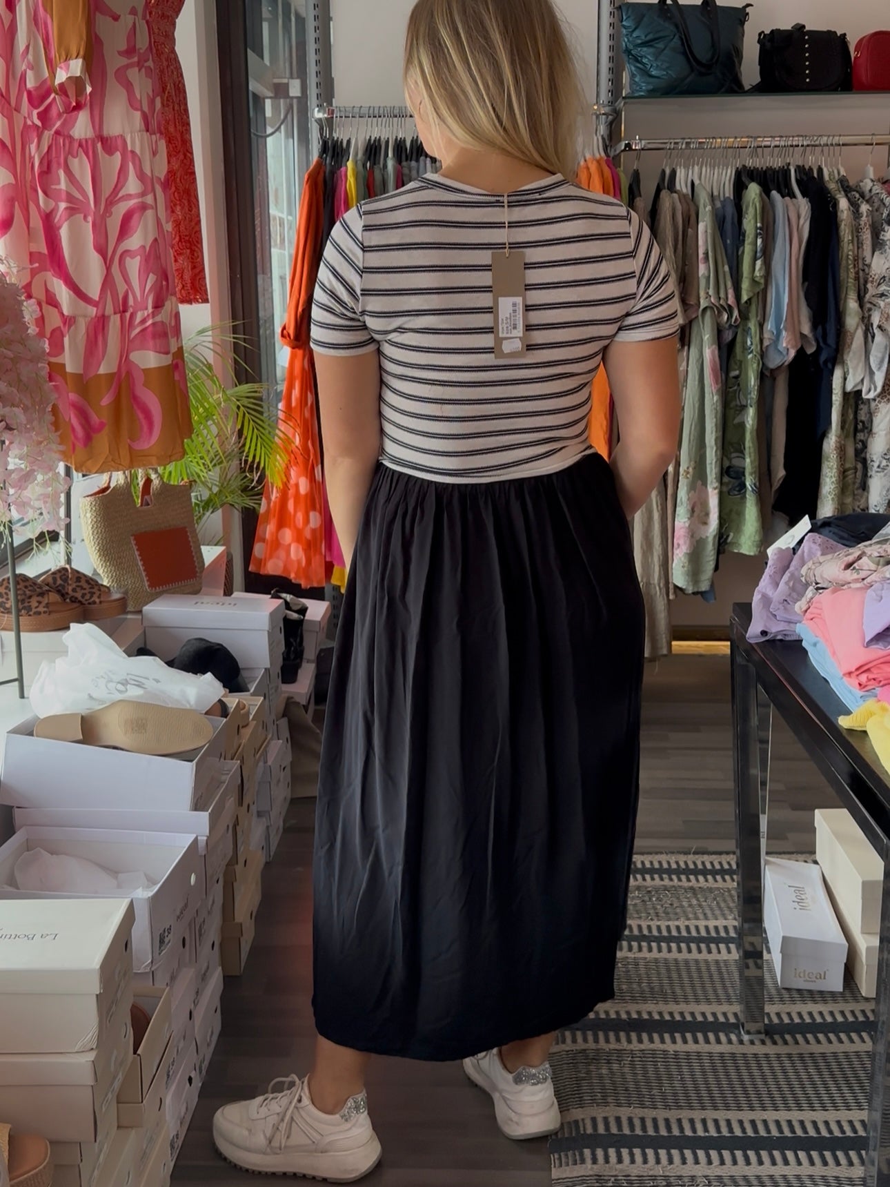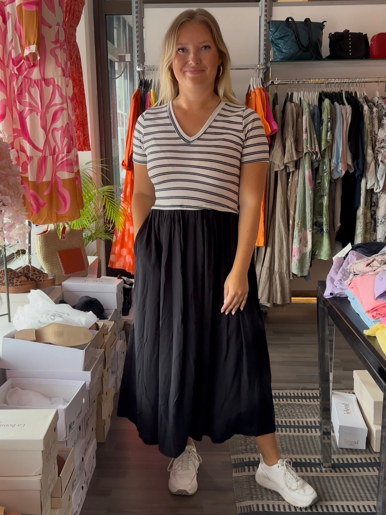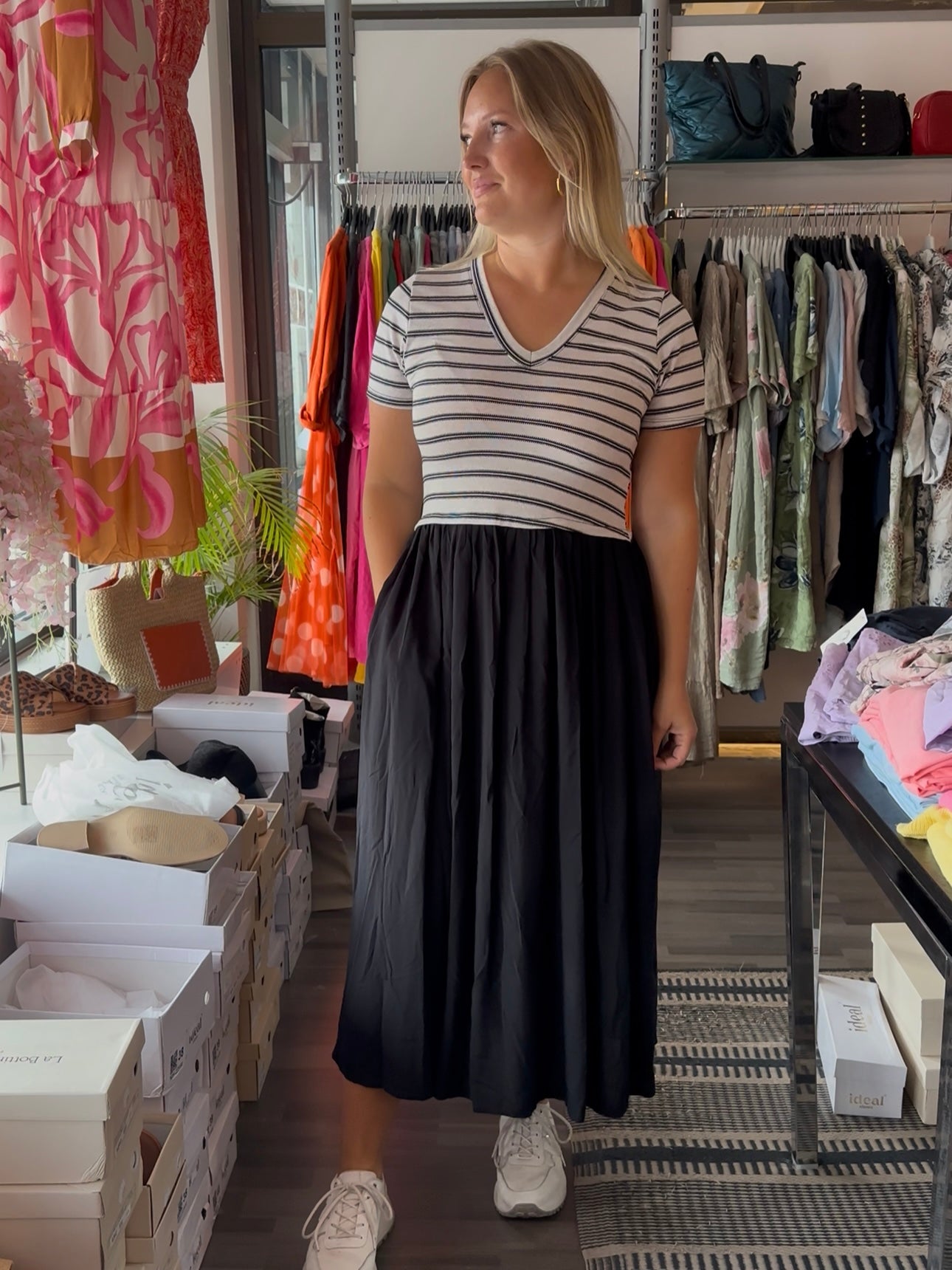 Kaksiosainen mekko t-paitatyylisellä ylöosalla ja kevyellä viskoosihelmalla. Raitakuosinen yläosa puuvilla-pellavasekoitetta. Helmassa sivuilla taskut.