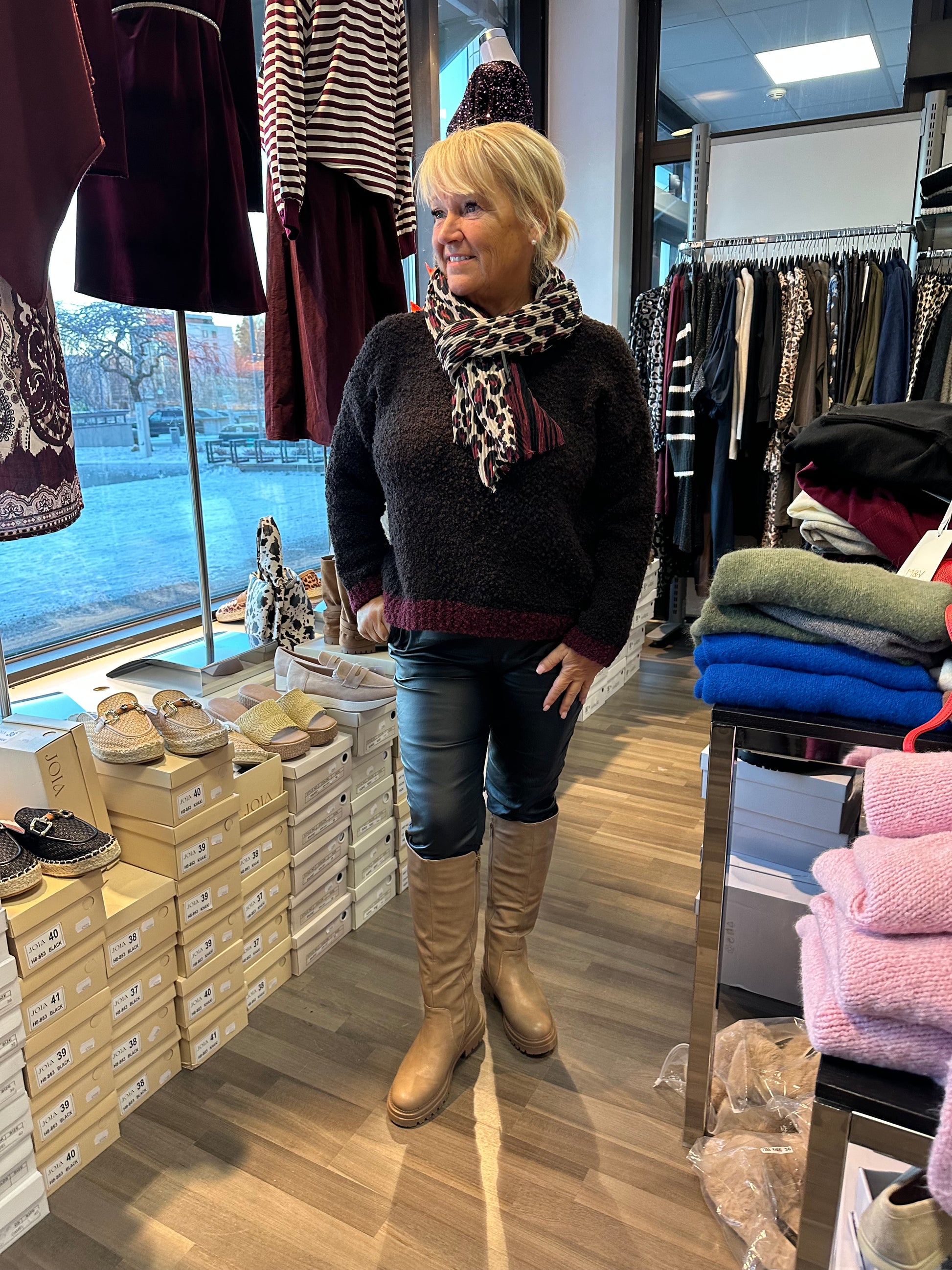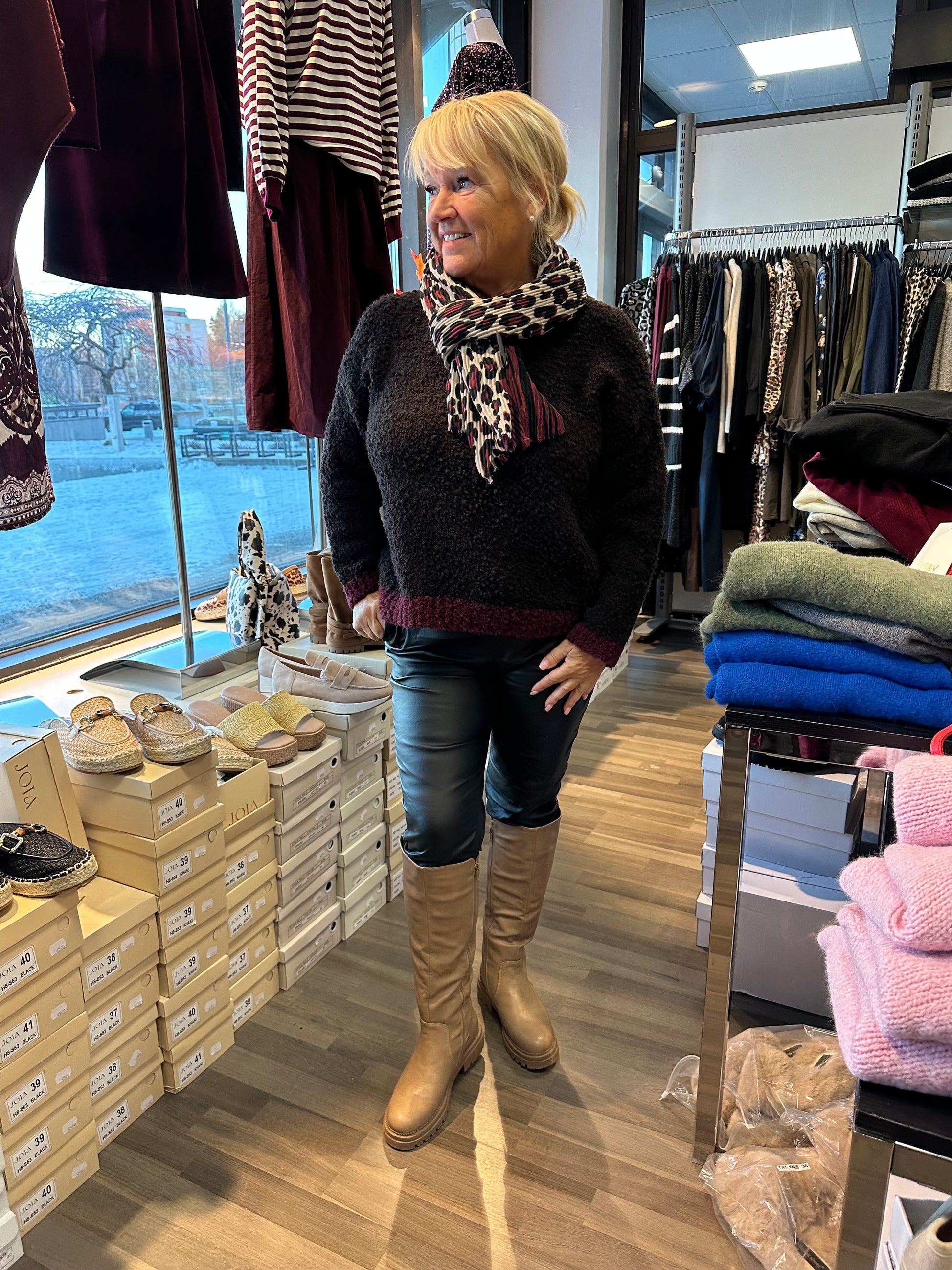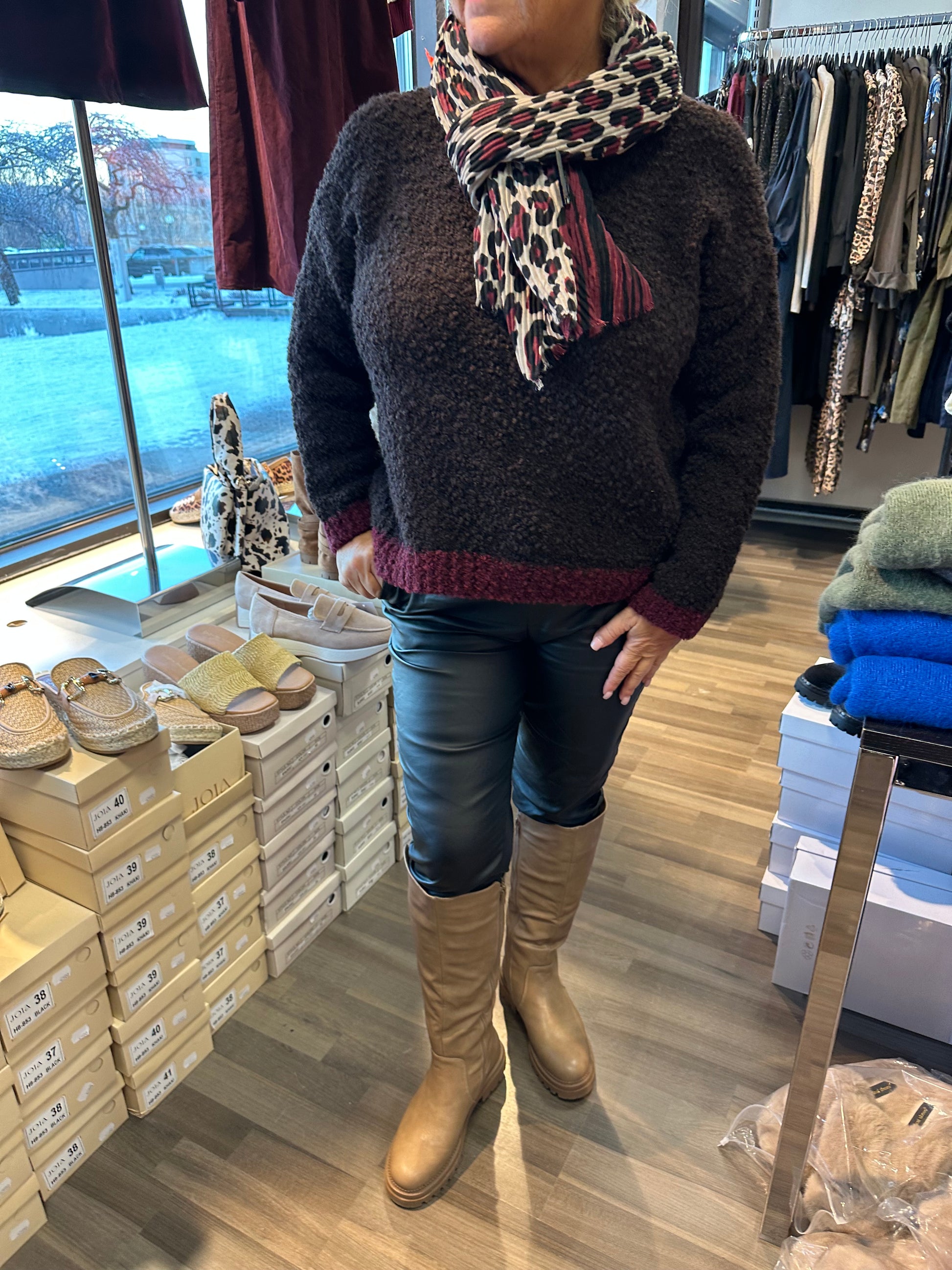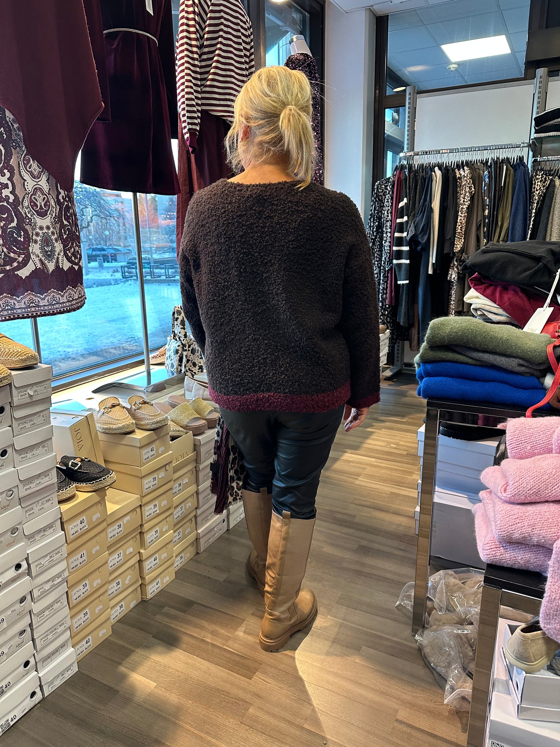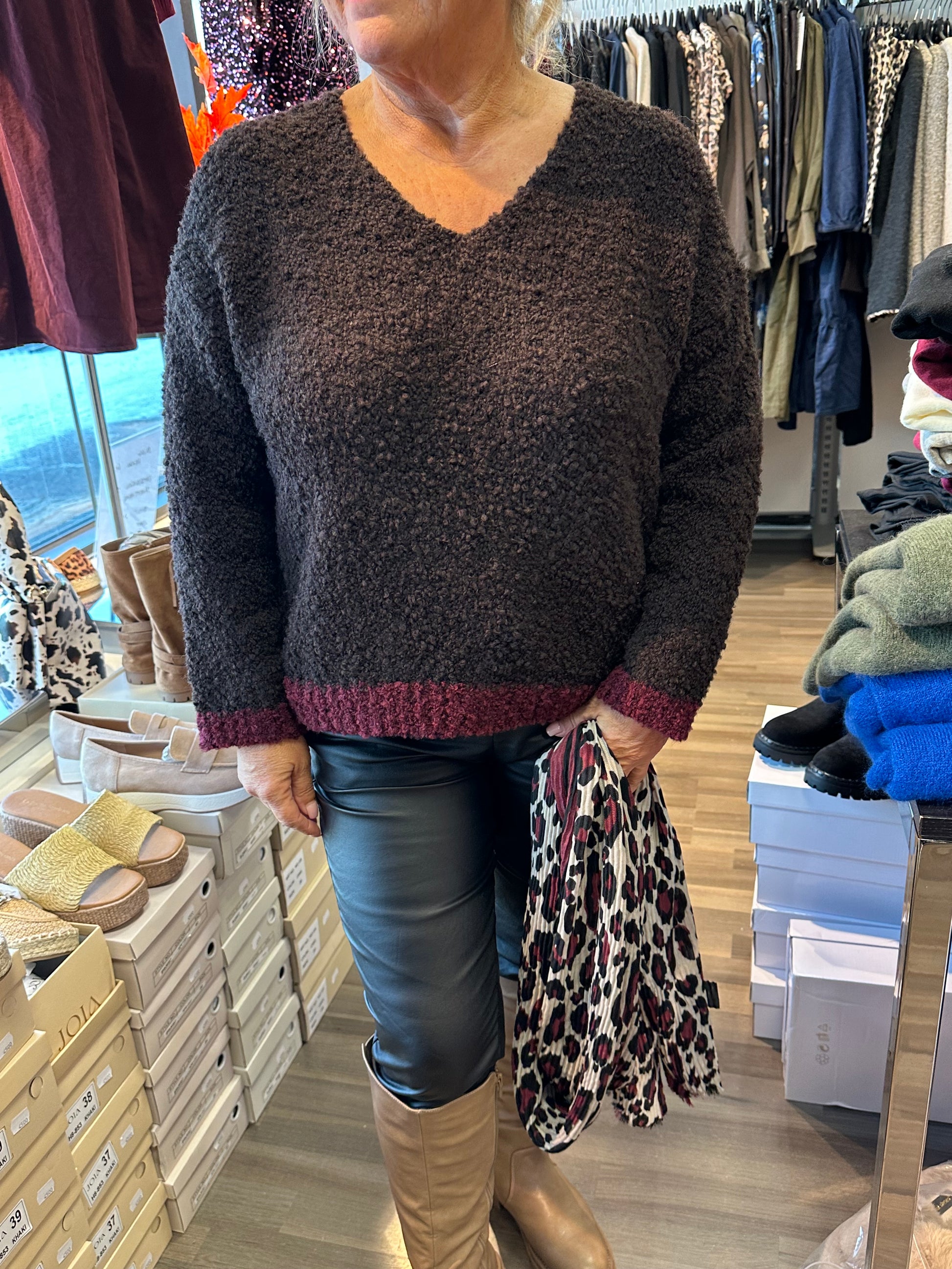 Kiva bouclee neule, jossa helman resori ja hihansuut kontrastiväriset. Mukava pehmeä laatu v-pääntiellä.