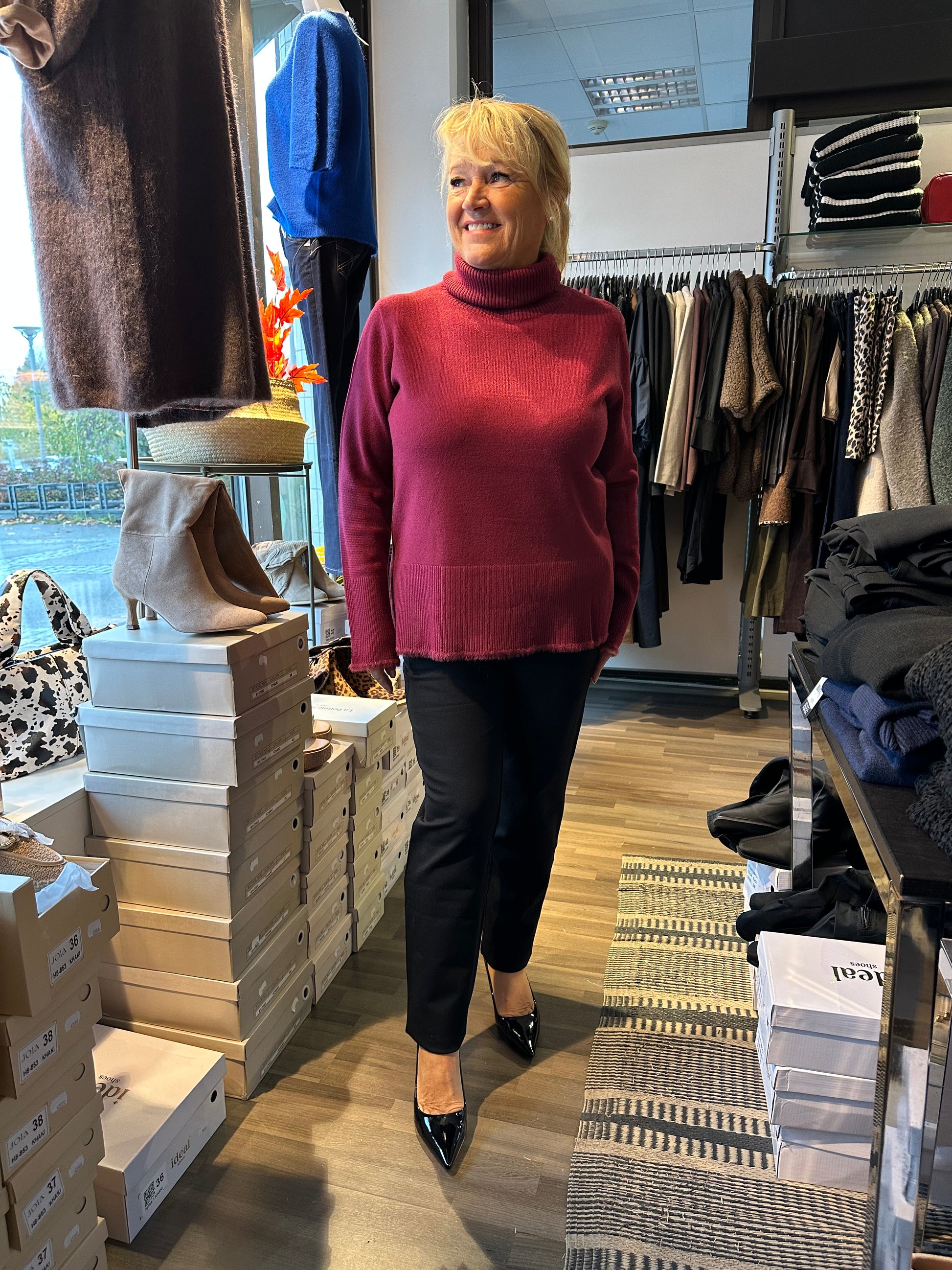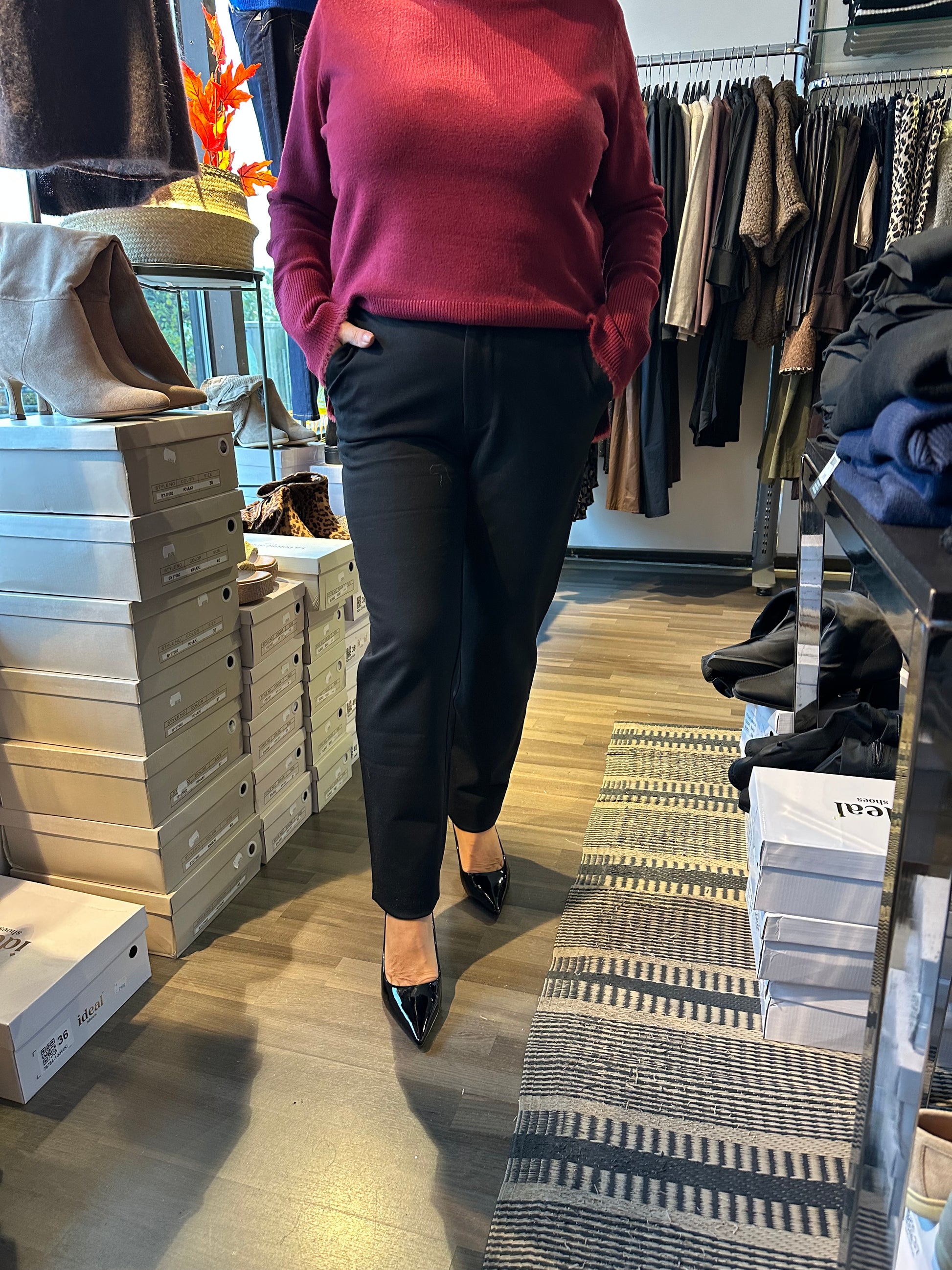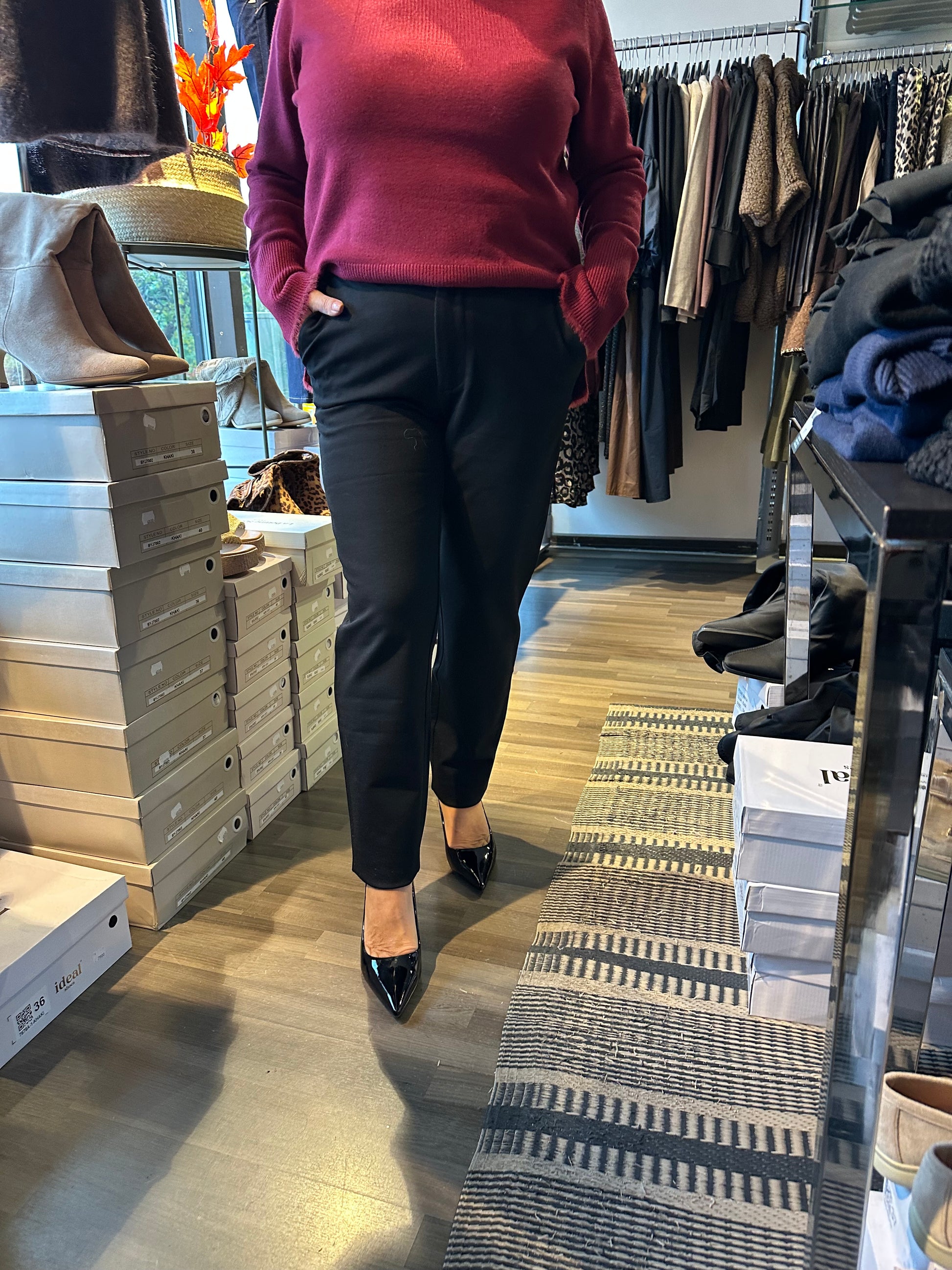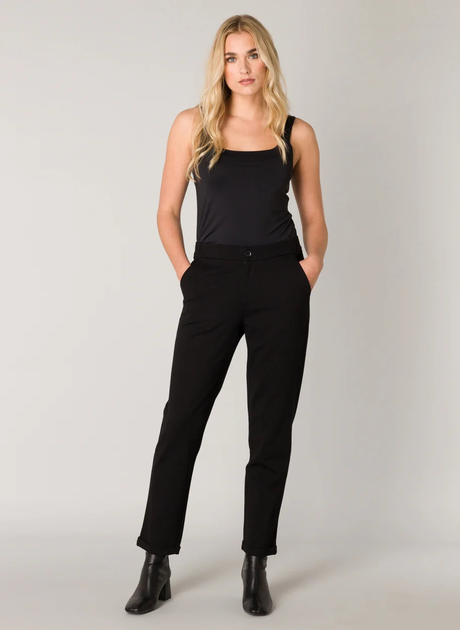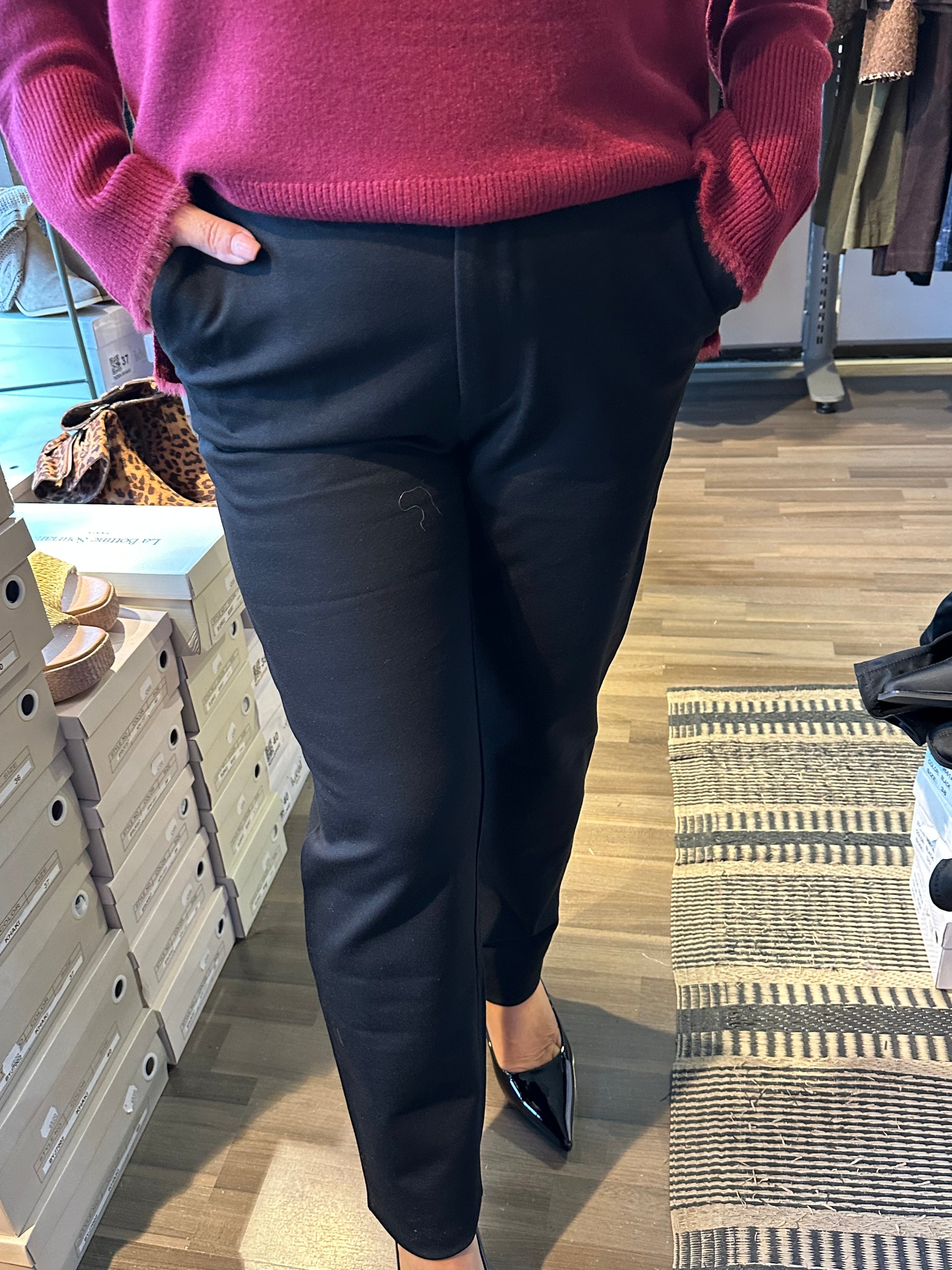 Siistit housut valmistettu tukevasta stretch-jerseykankaasta. Normaali vyötärön korkeus, jossa resori. Kapenevat lahkeet. Etupuolella viistot taskut ja nappikiinnitys. Takana valetaskut.
