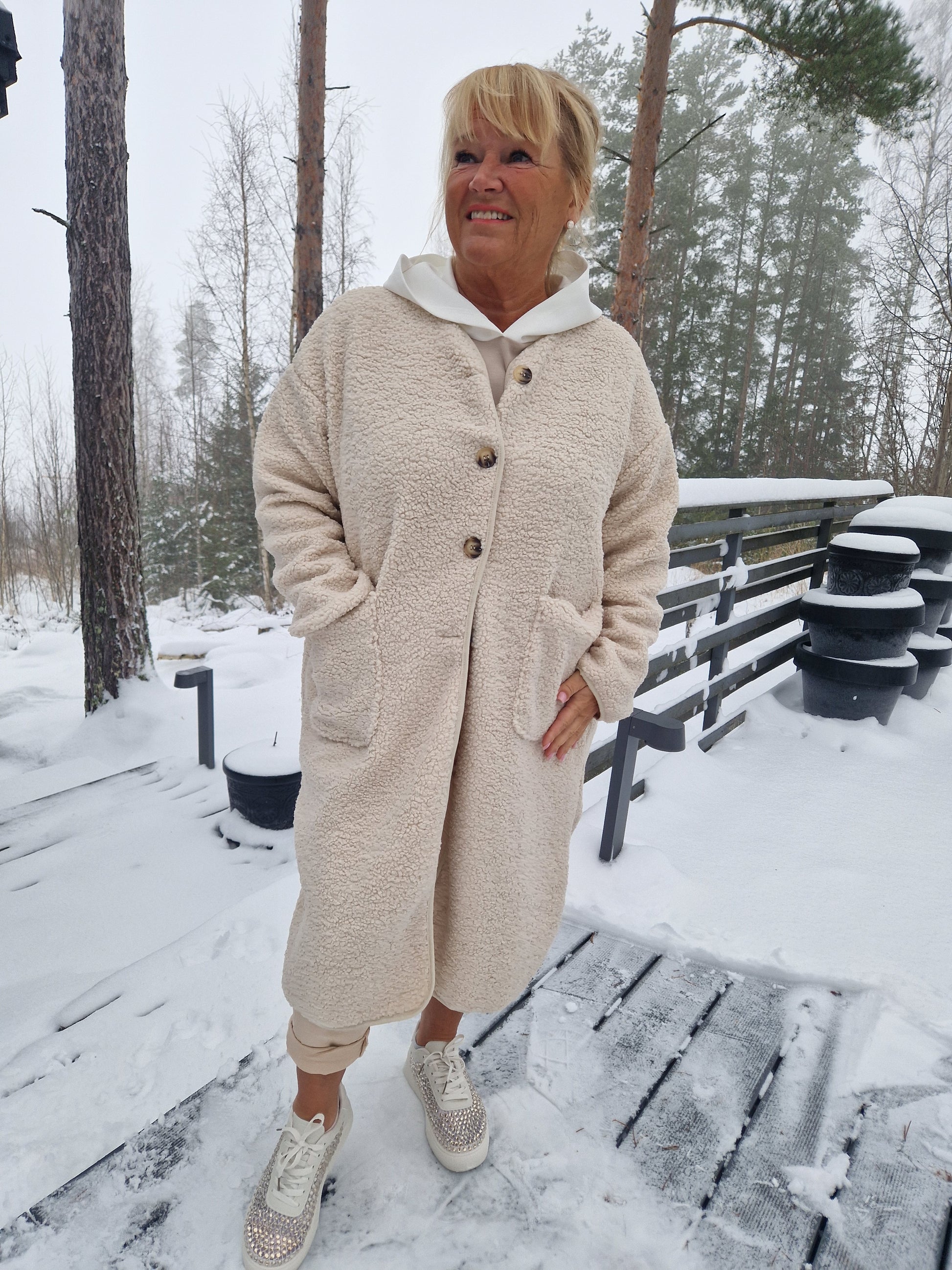 Vuorellinen, kaulukseton teddy takki. Nappikiinnitys ja reilut taskut edessä. Halkiiot sivuilla. Midimitta, n. 100cm.