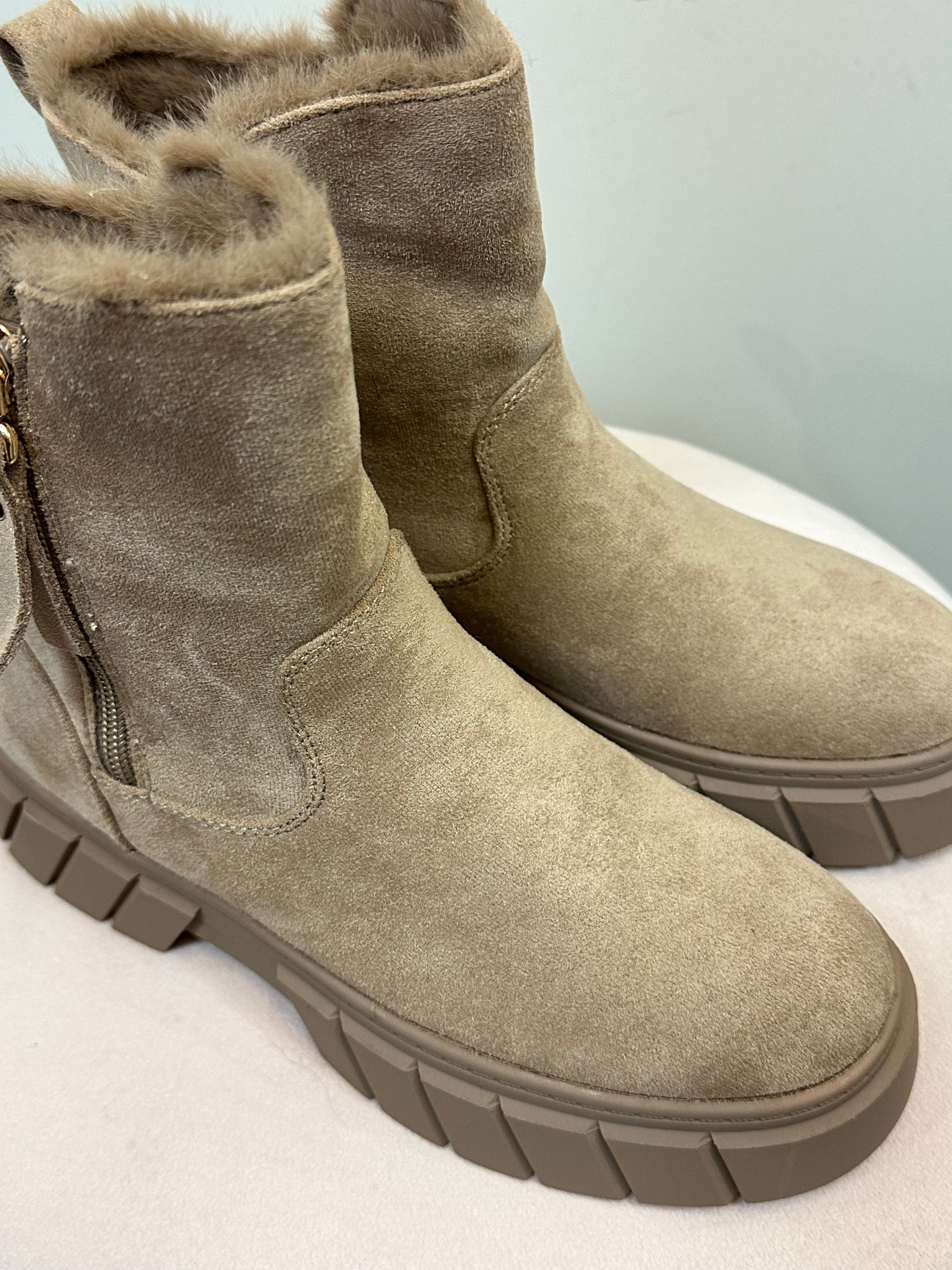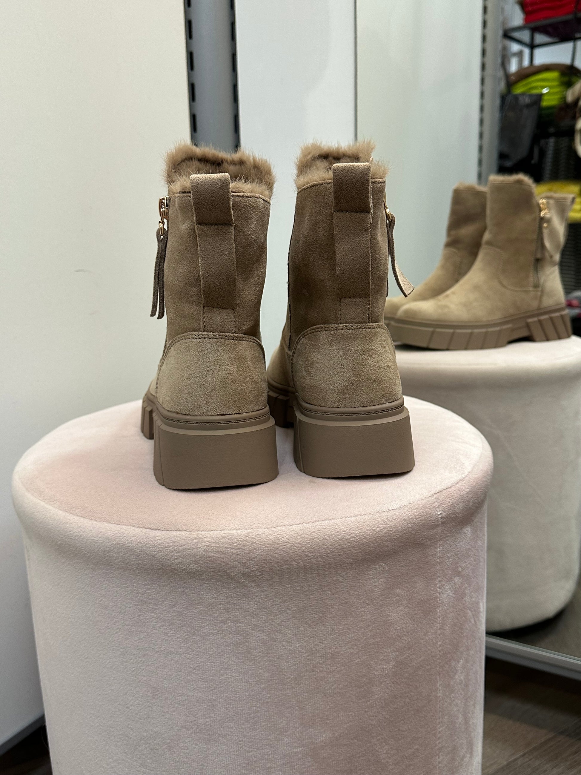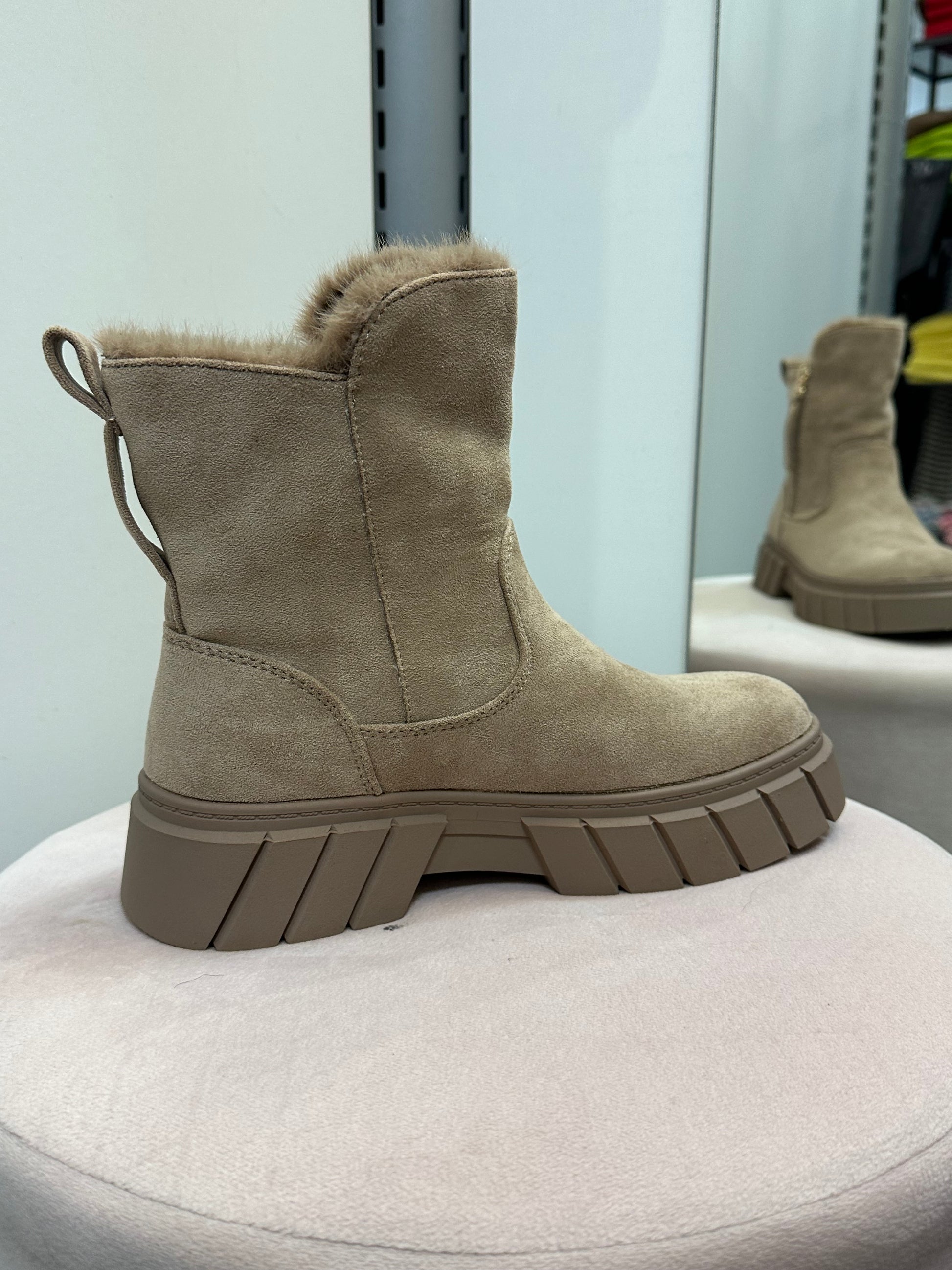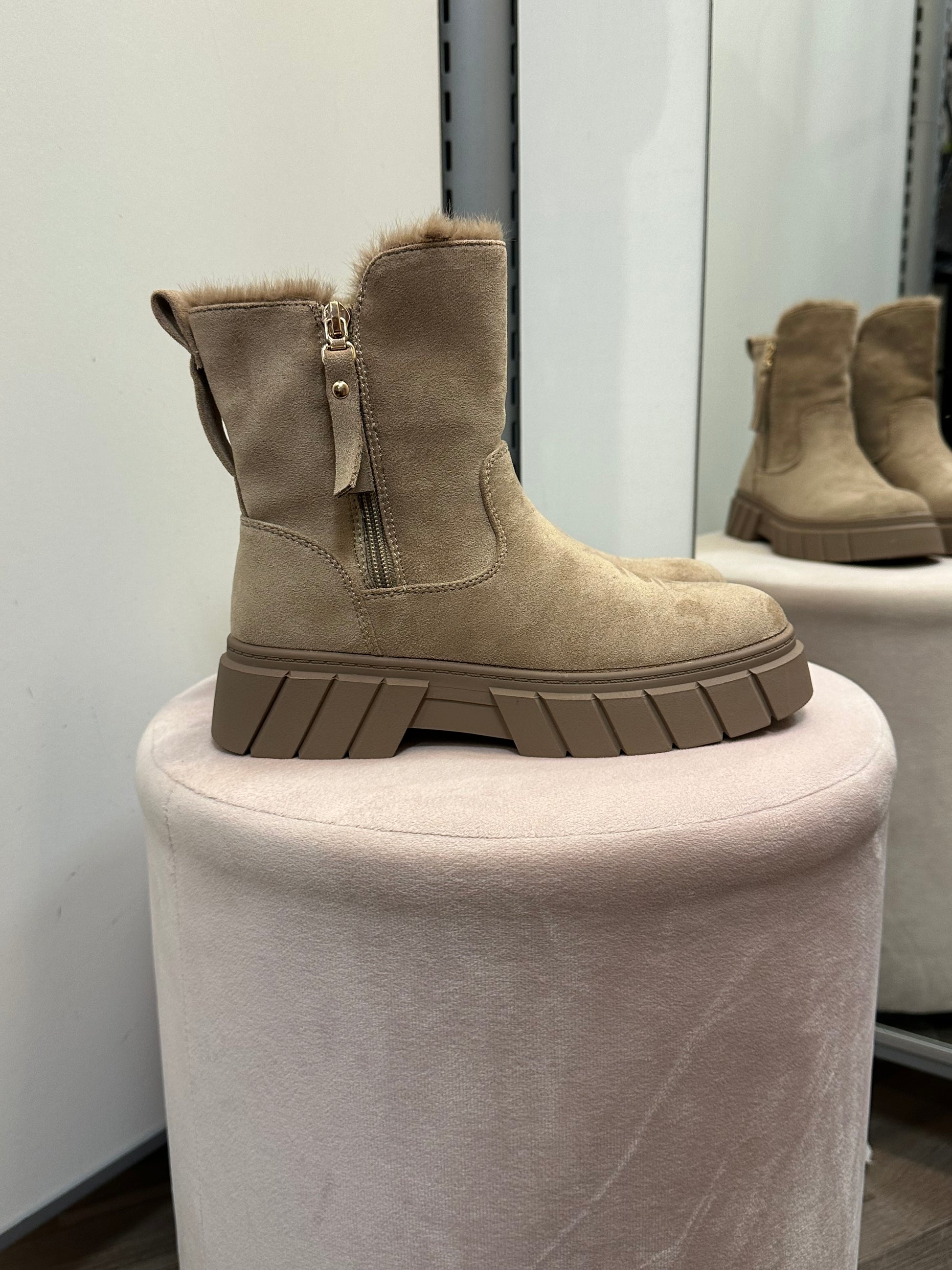 Kivat nilkkurit, jossa pehmeä karvaa sisällä. Vetoketju ulkosyrjässä. Pohja n. 3cm. Hyvä pyöreähkö lesti.