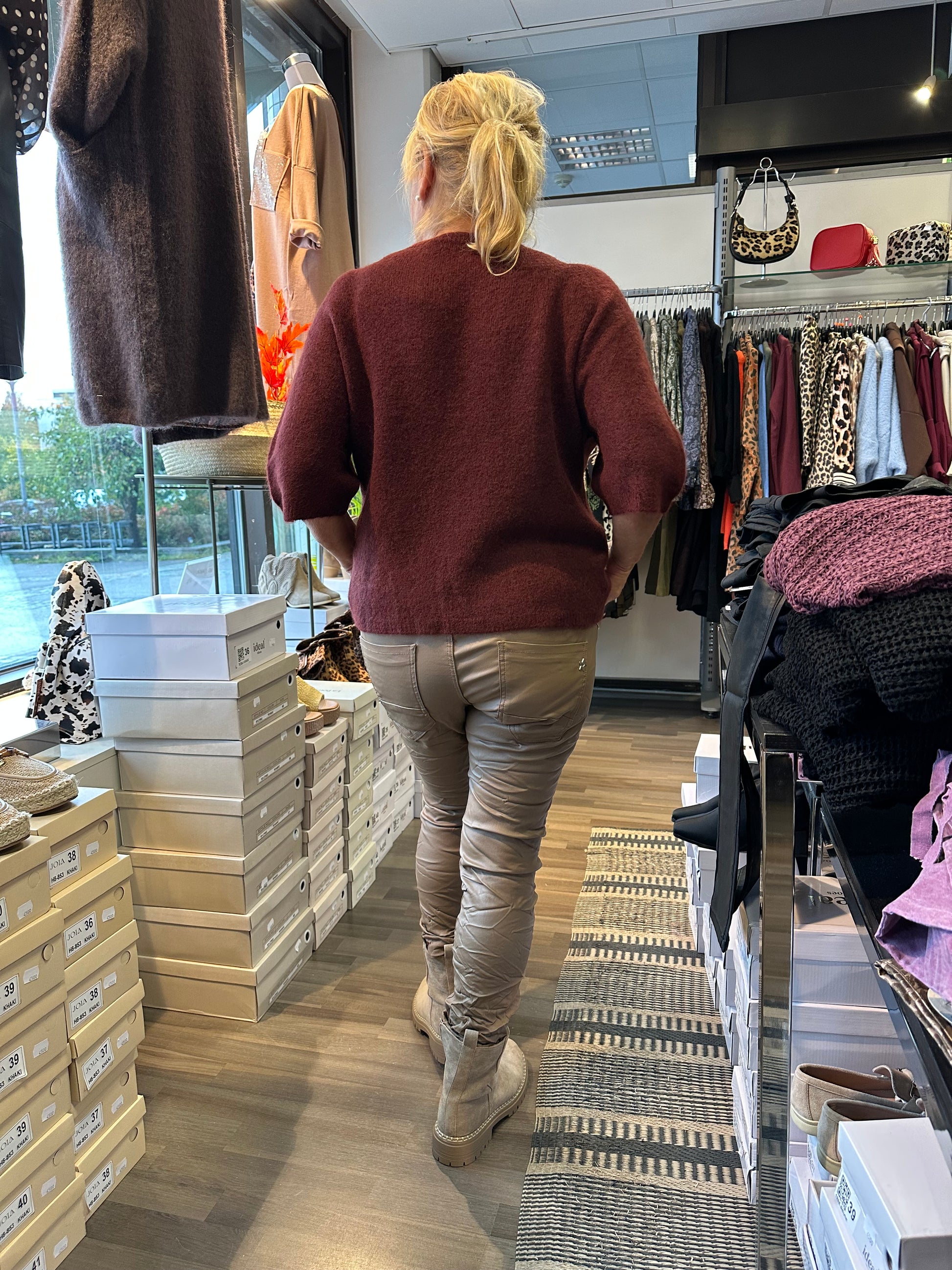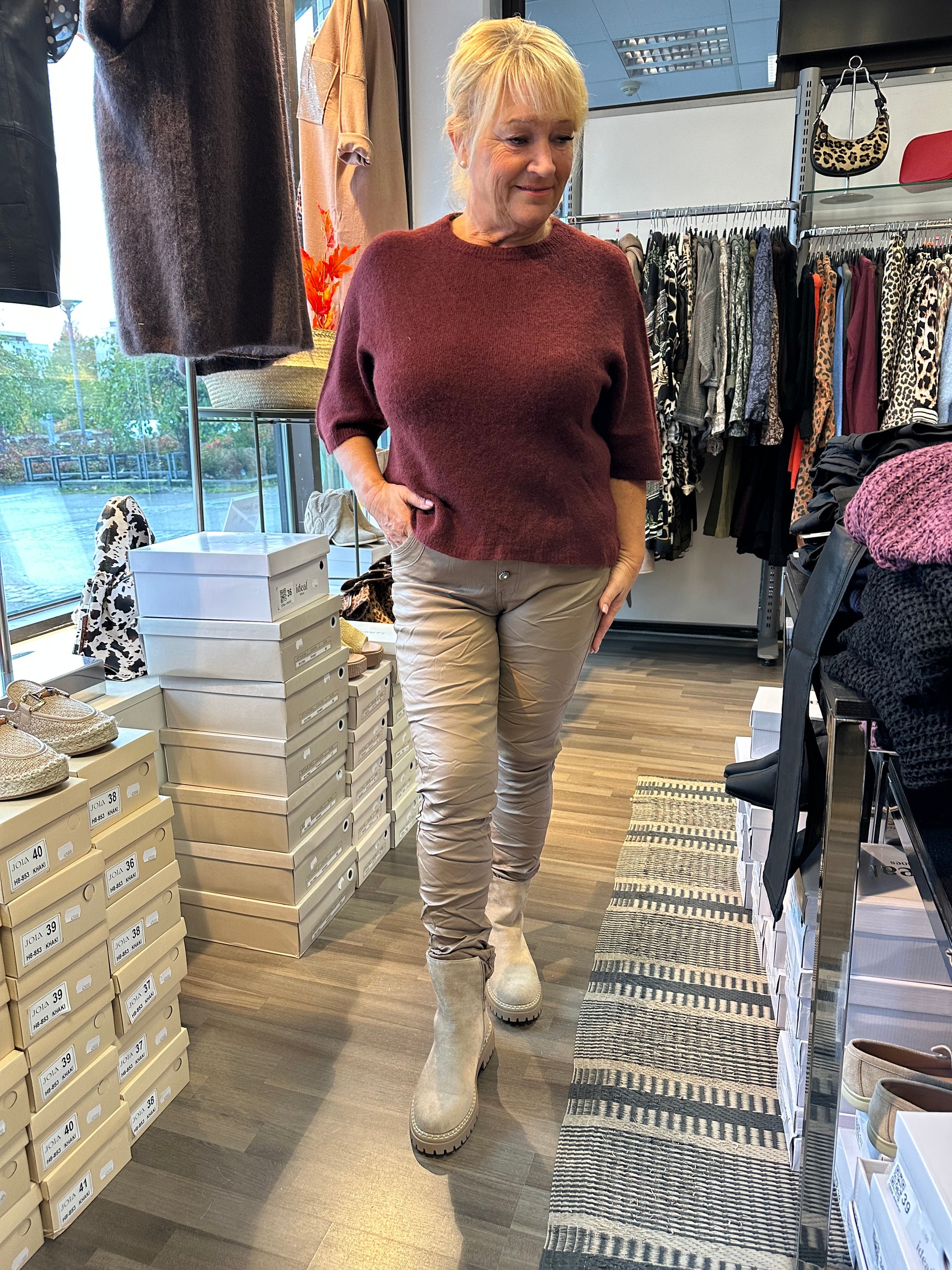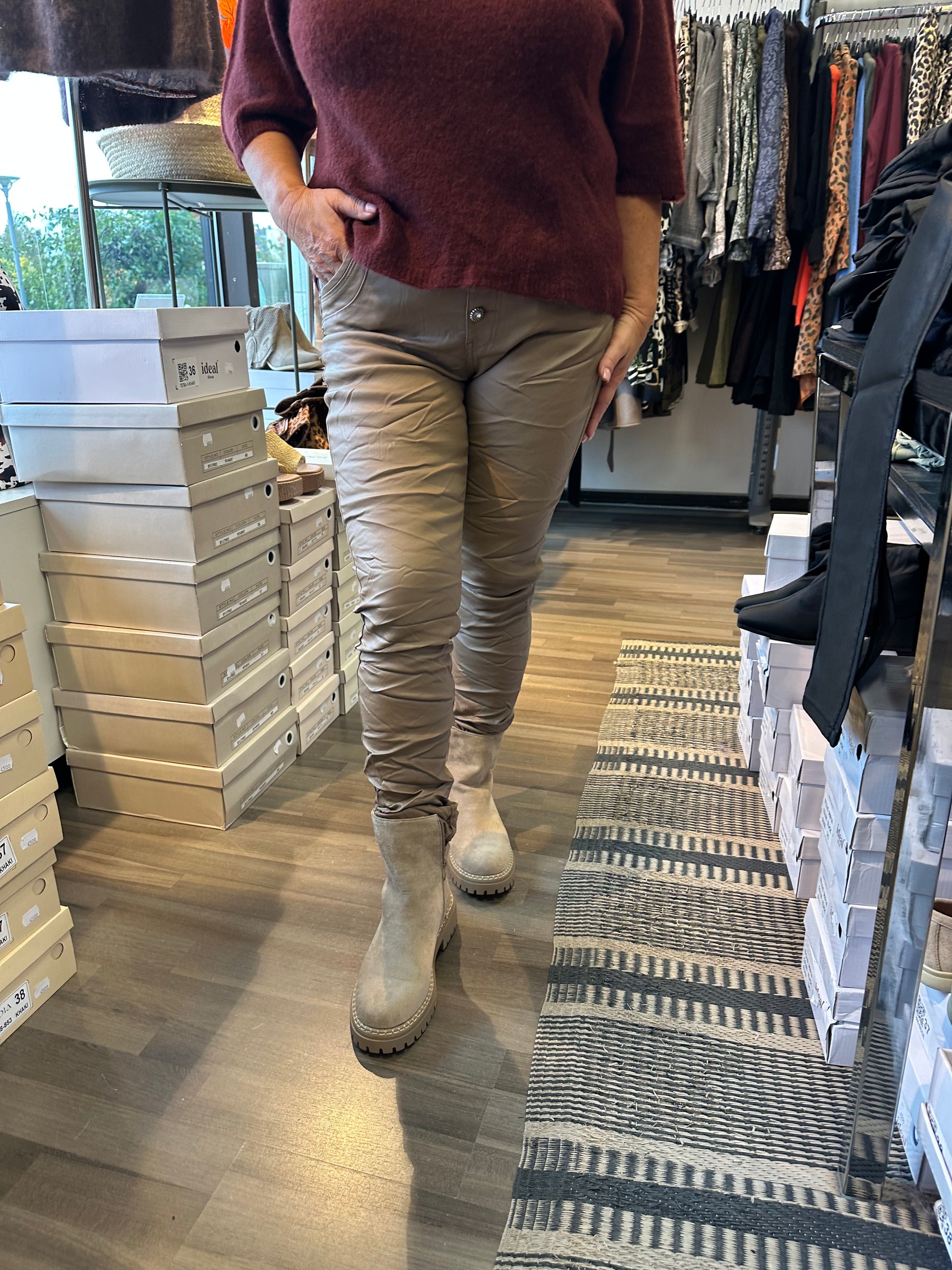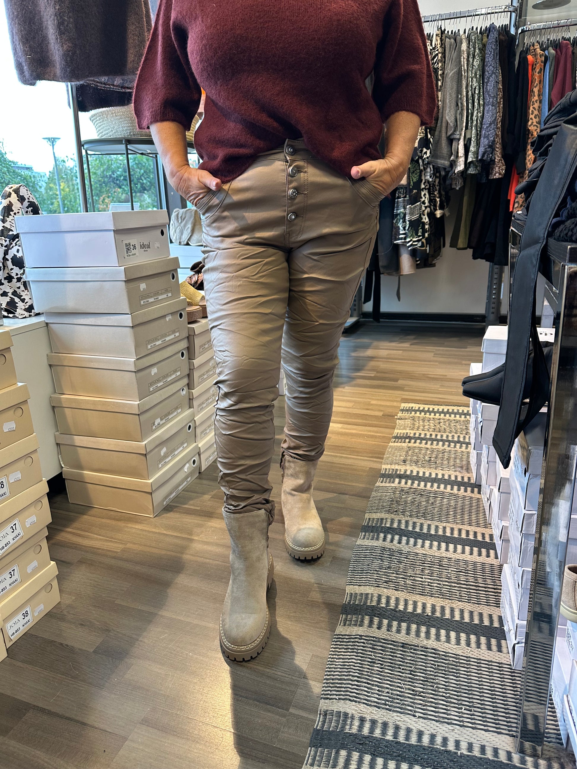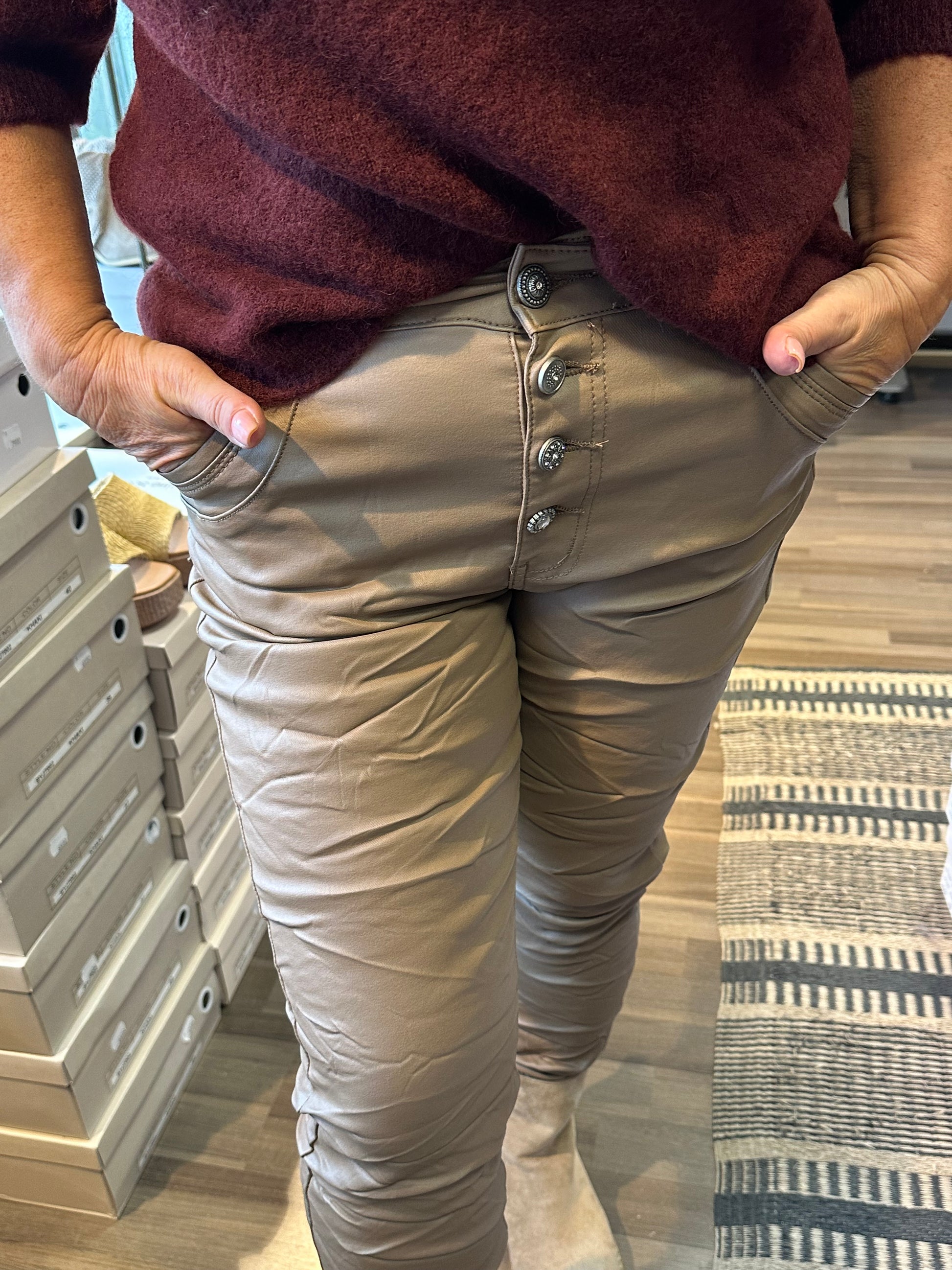 Makeet keinonahkahousut mukavan joustavaa materiaalia. Kivat timanttinapit ja mukava korkea vyötärö. Klassinen viisitaskumalli.