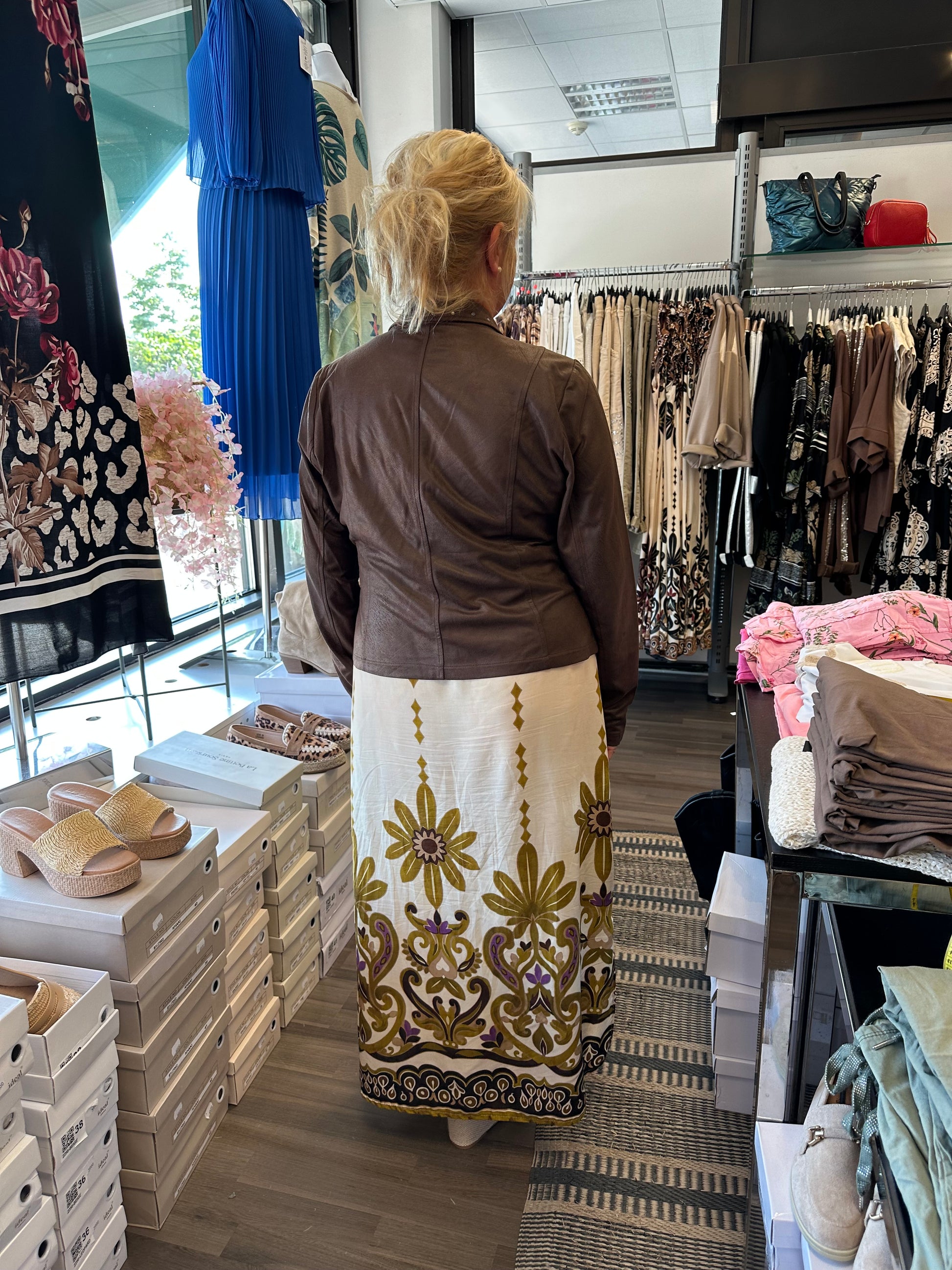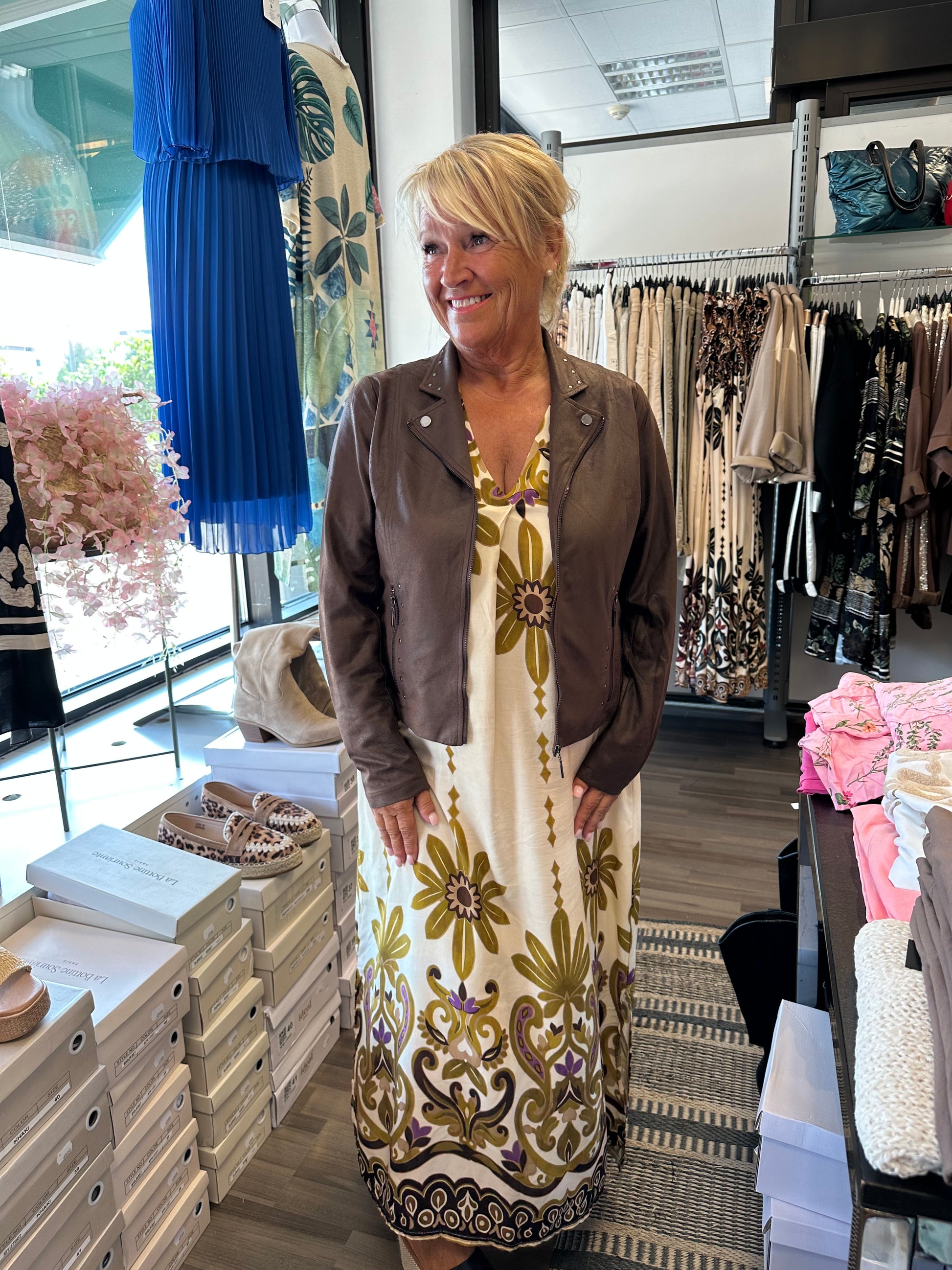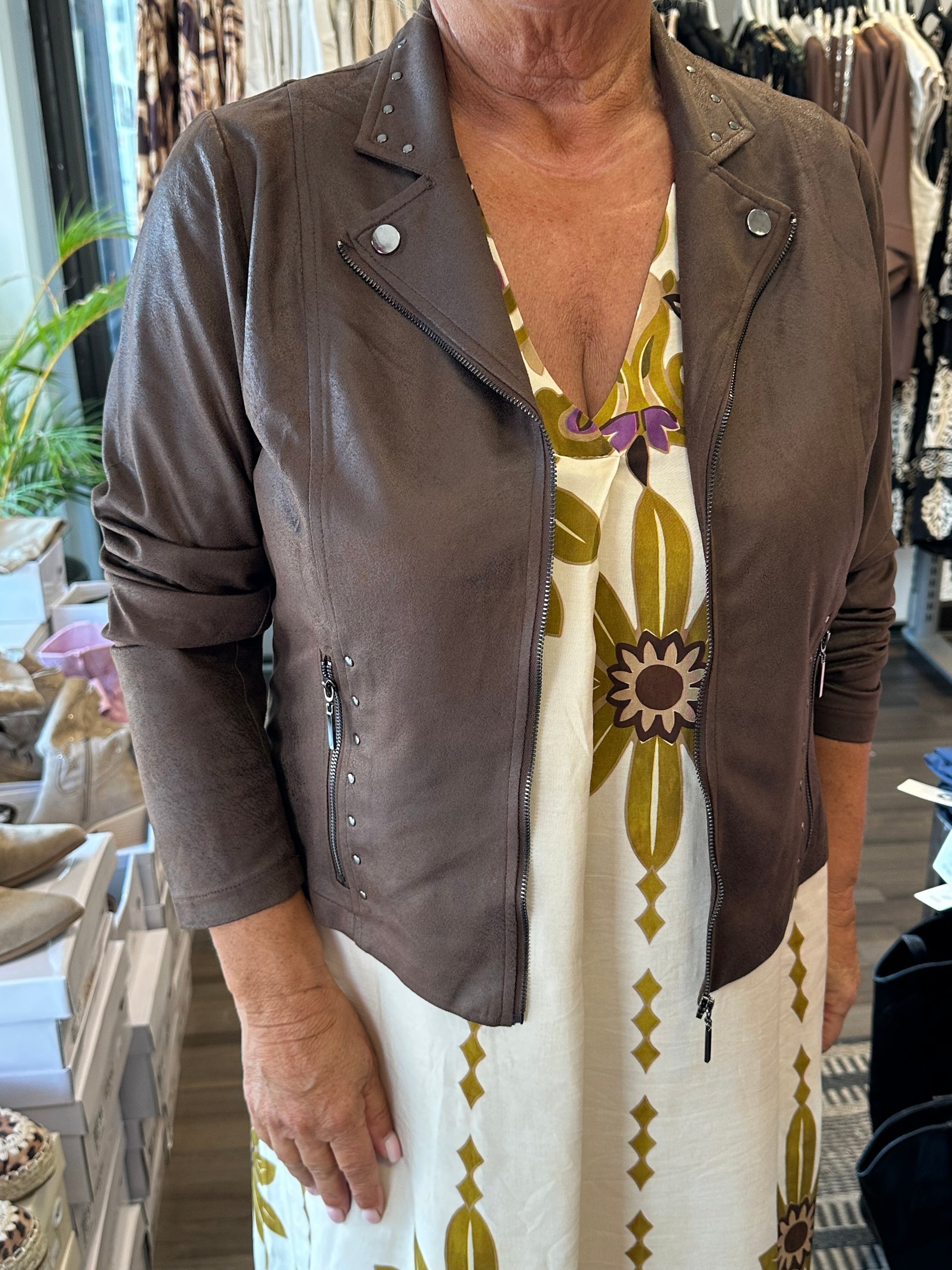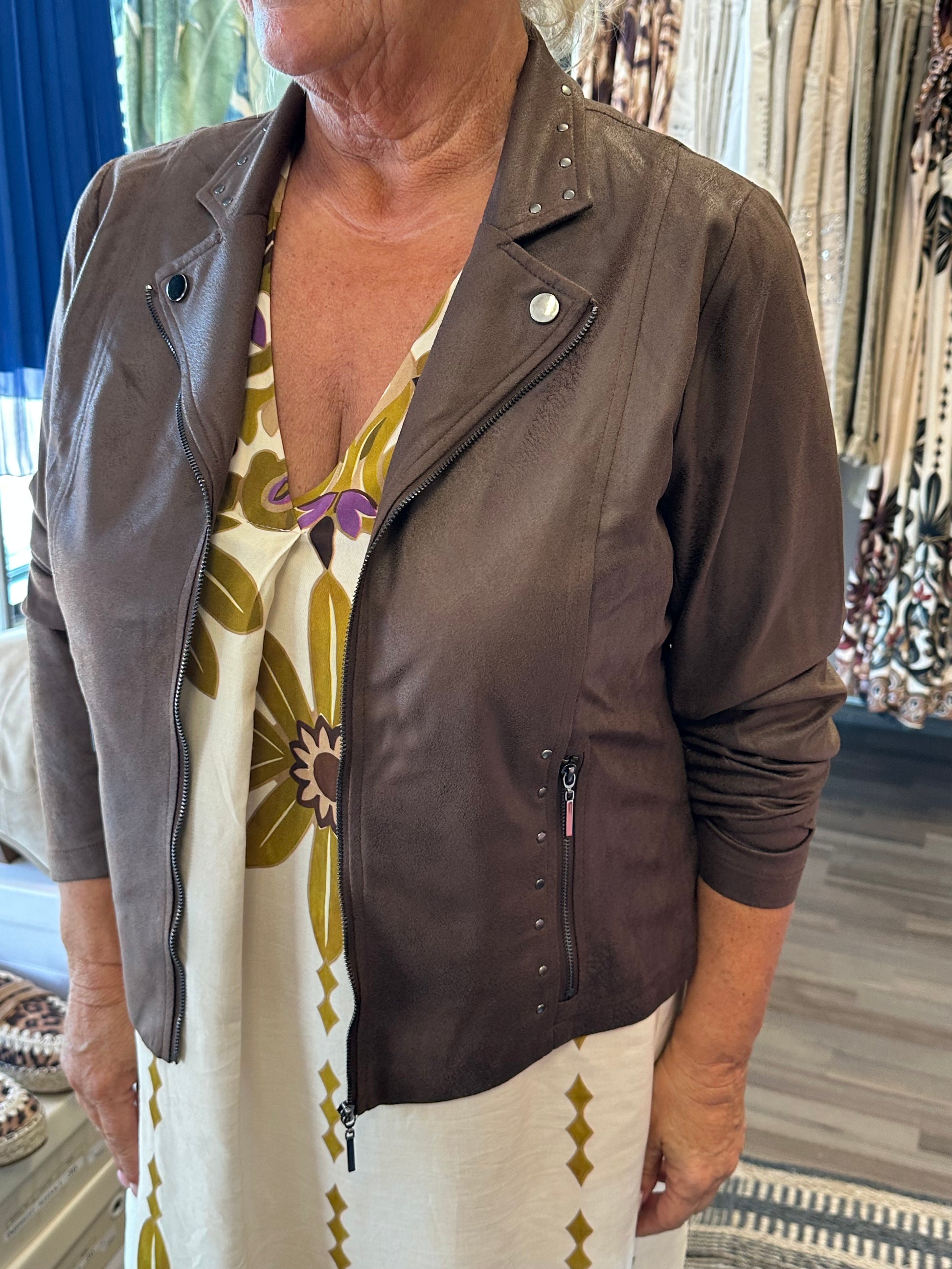 Pehmeä, elävä pintainen jakku tekstiilinahkaa. Vetoketju ja niittikoristeita. Vuoreton ja kevyt. Minulla päällä koko L, olen noin 40/42.