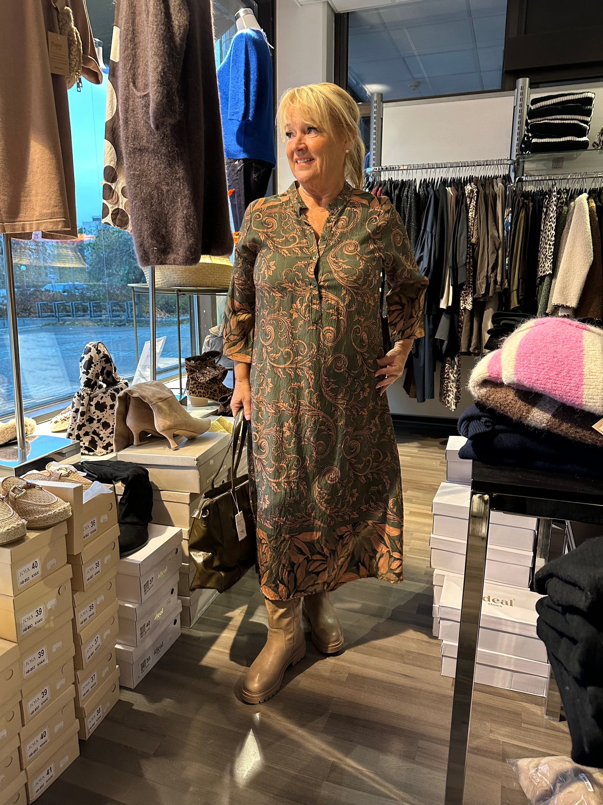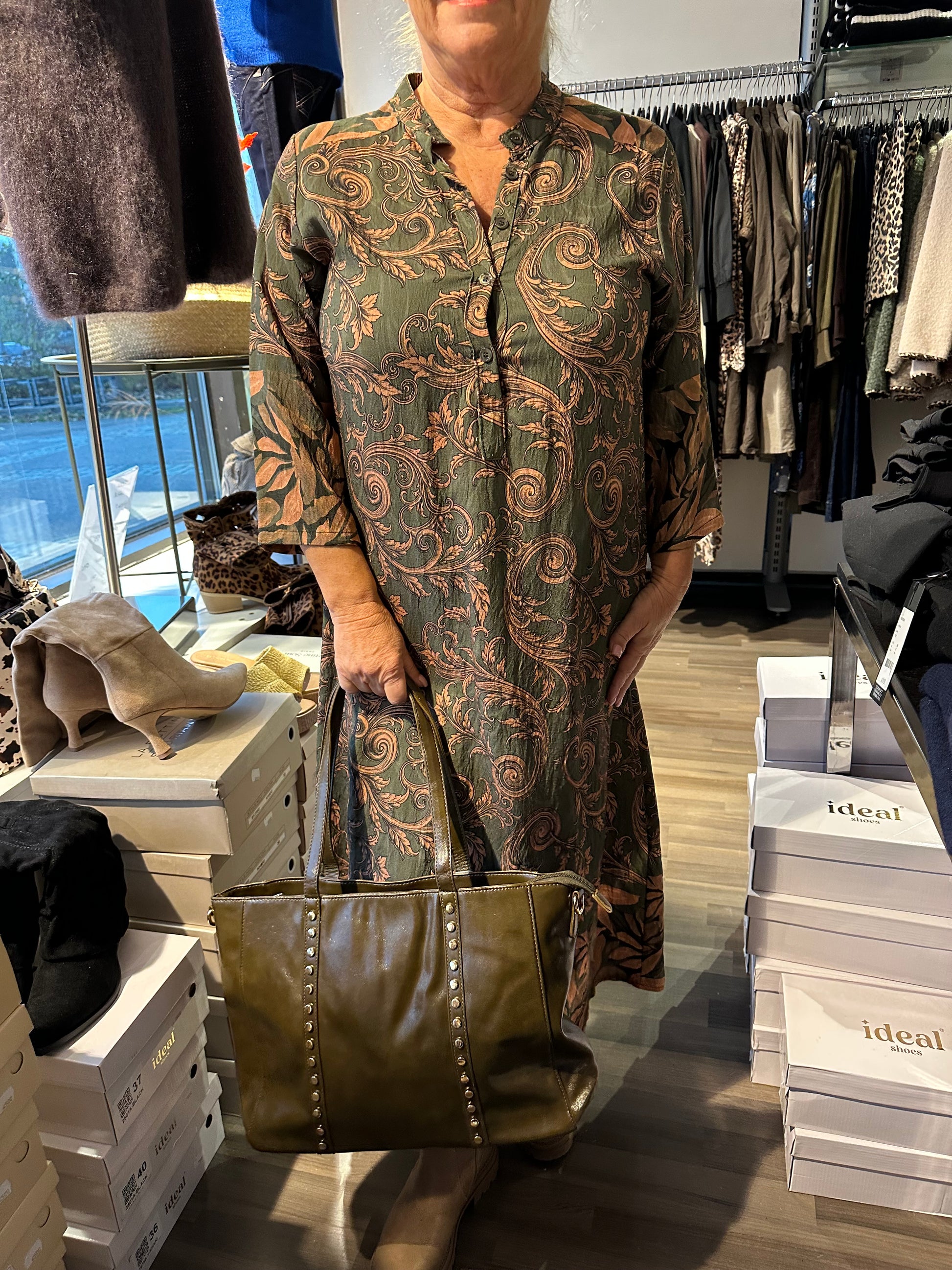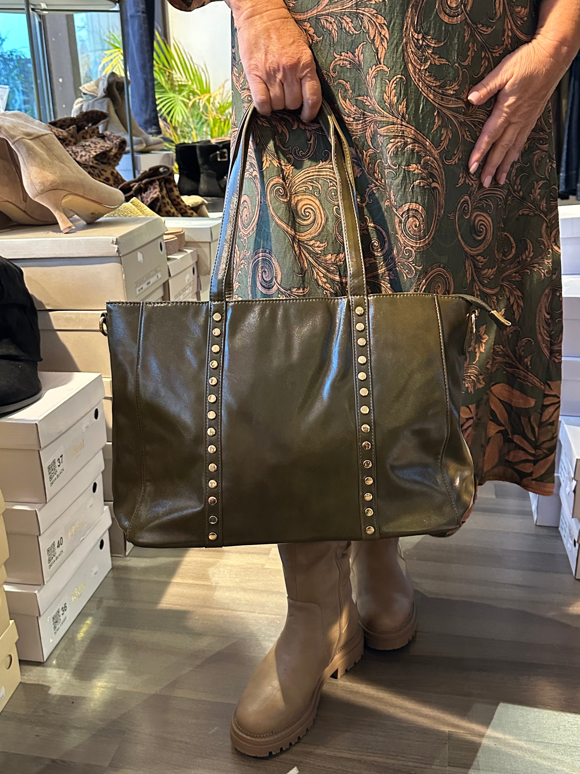 Keinonahkalaukku niittikoristeilla. Sisällä kaksi pientä avonaista sivutaskua ja yksi vetoketjullinen tasku. Pieni vetoketjullinen sivutasku ulkopuolella.