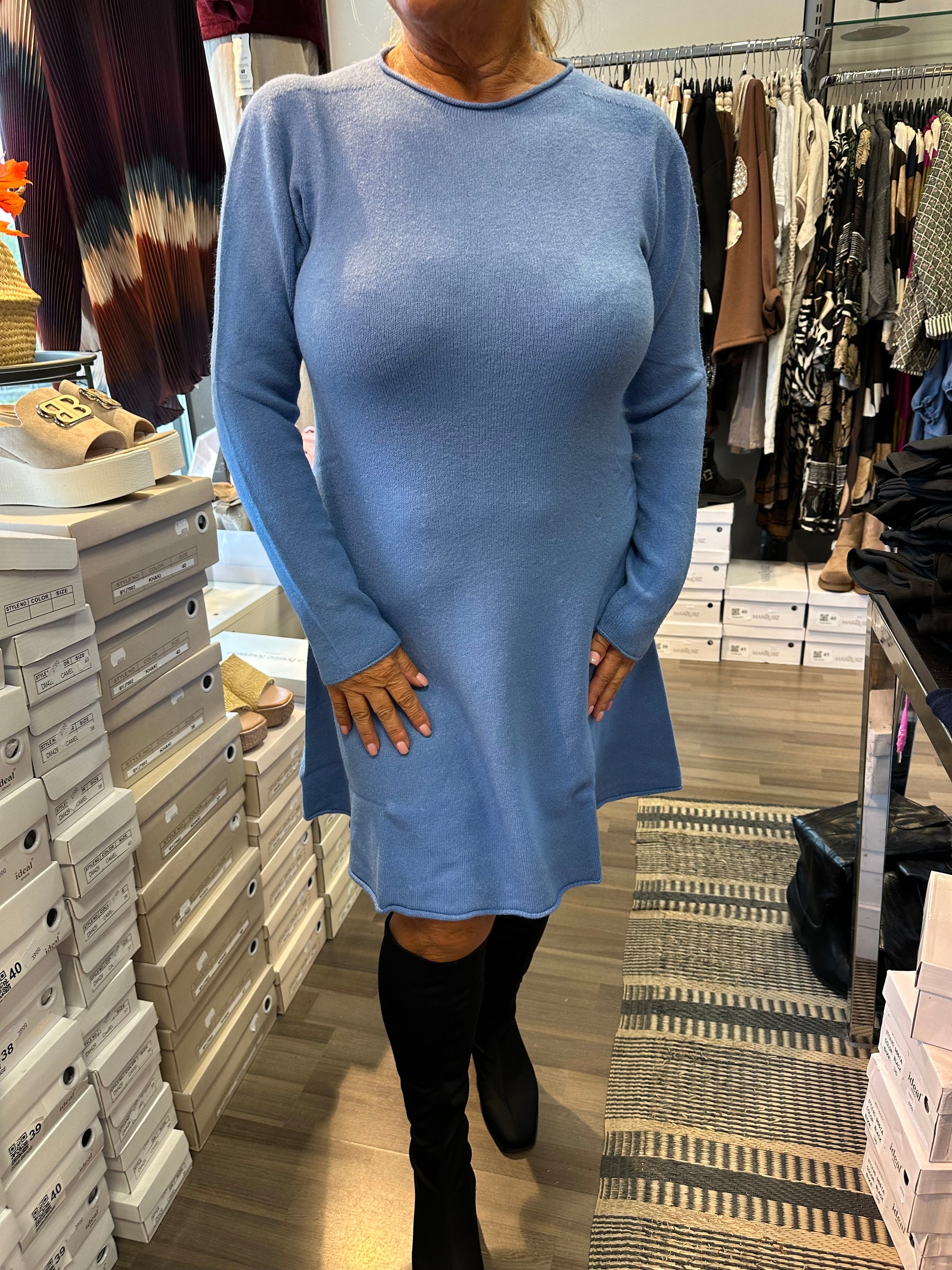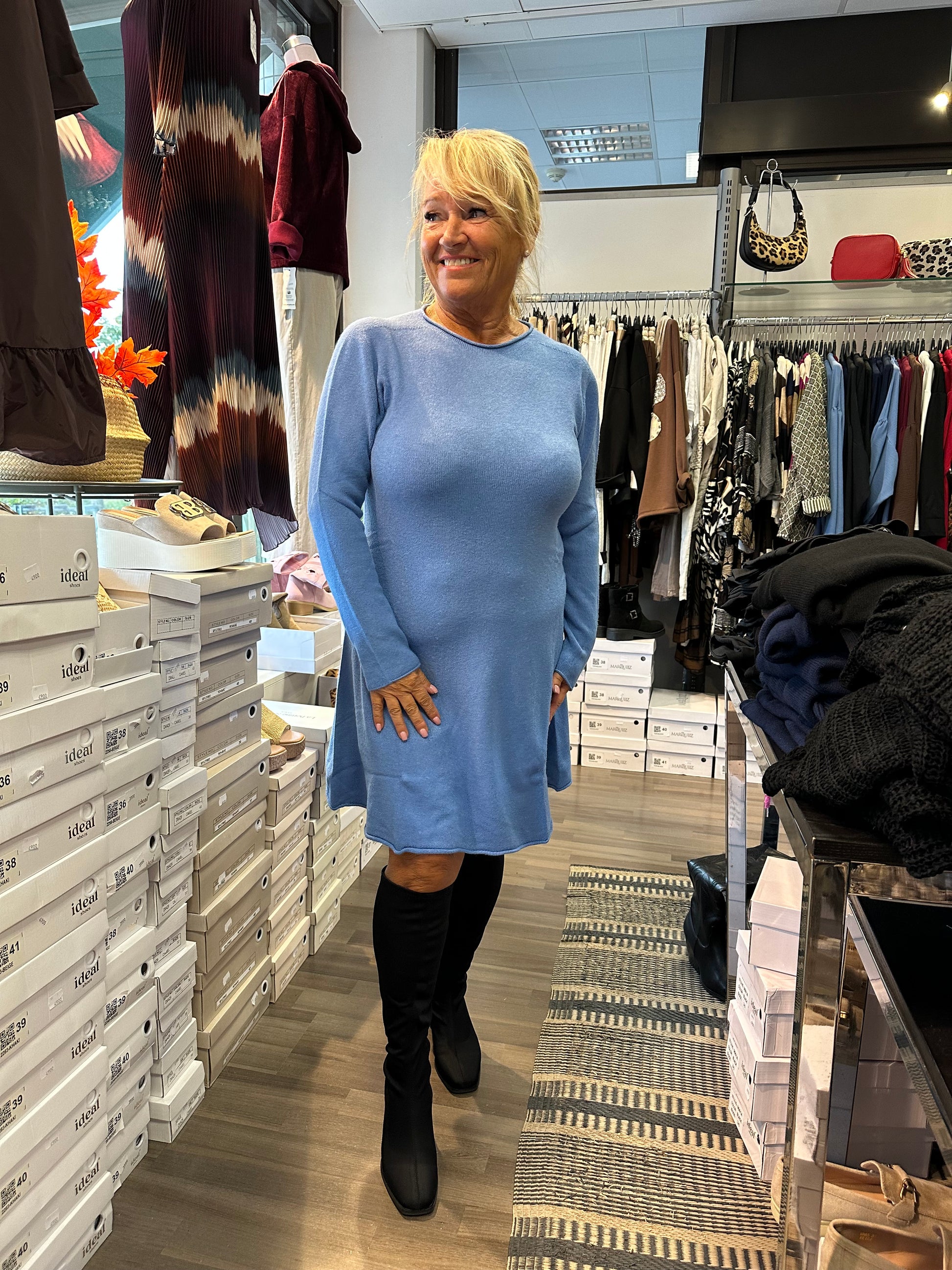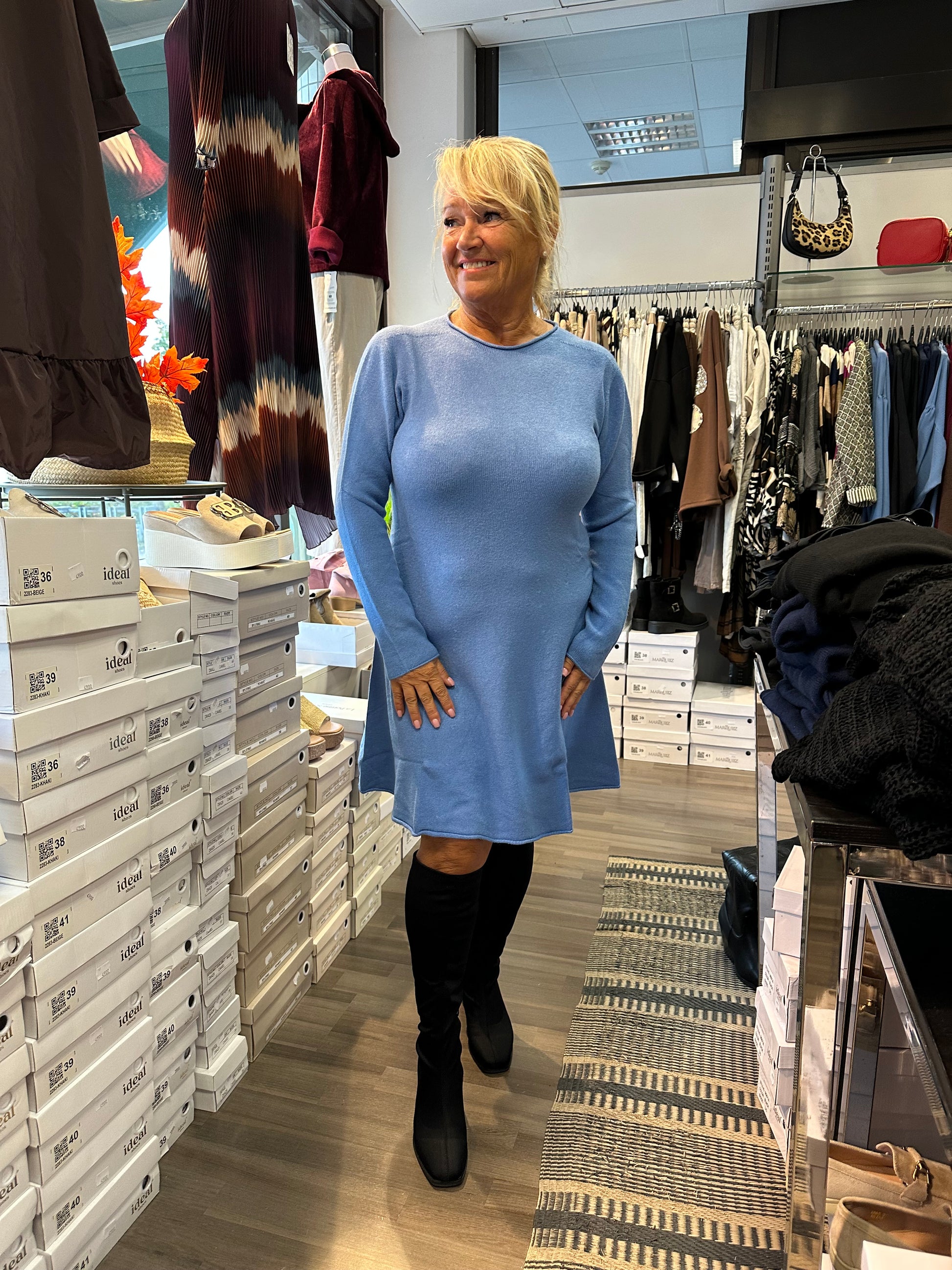 Miellyttävän tuntuinen neulemekko pehmeää ja joustavaa neulosta. Pyöreä pääntie ja pitkät hihat. Sirompi kellohelmainen malli.