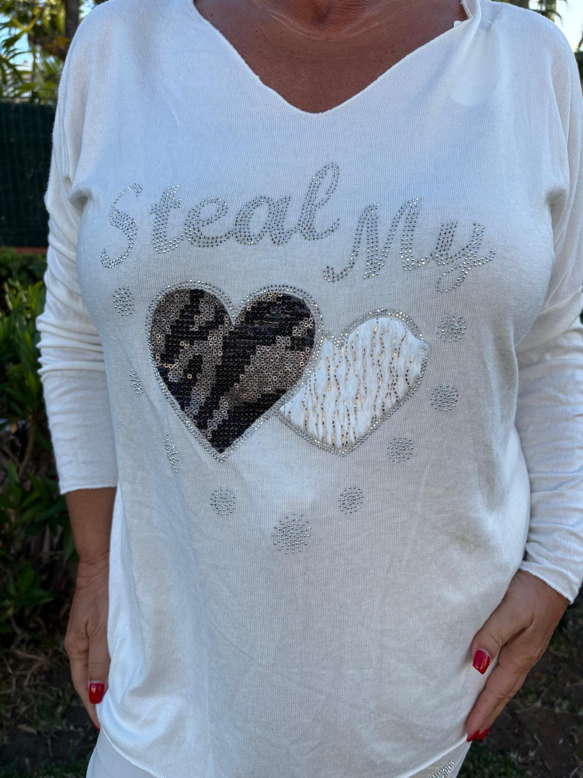 Suloisen pehmeä neule, sydän blingillä. Mukavan pehmeää neulosta 40% viskoosia 30% angoraa ja 30% villaa. Pehmeää ja joustavaa neulosta, ei kutita! V-pääntie.