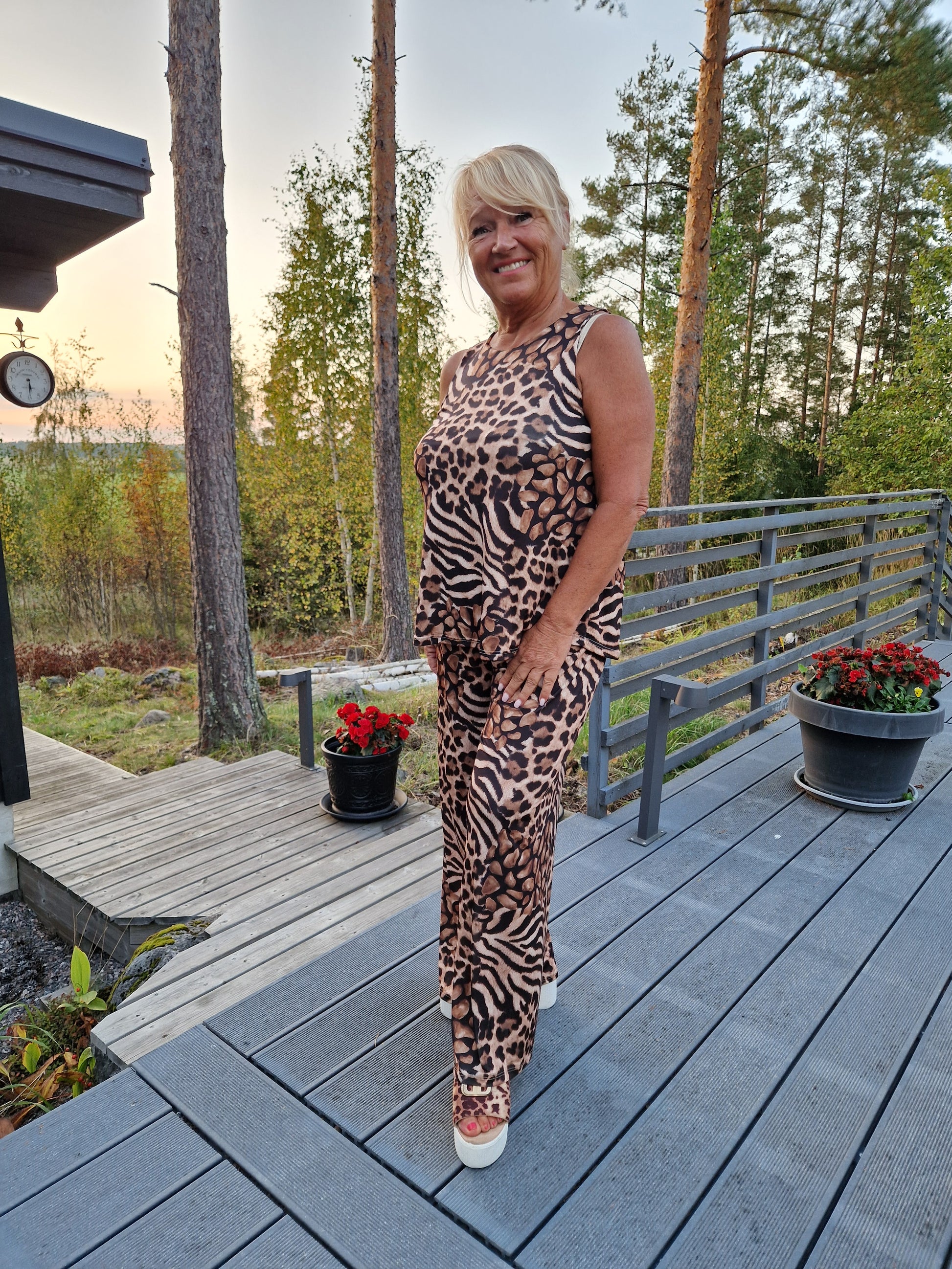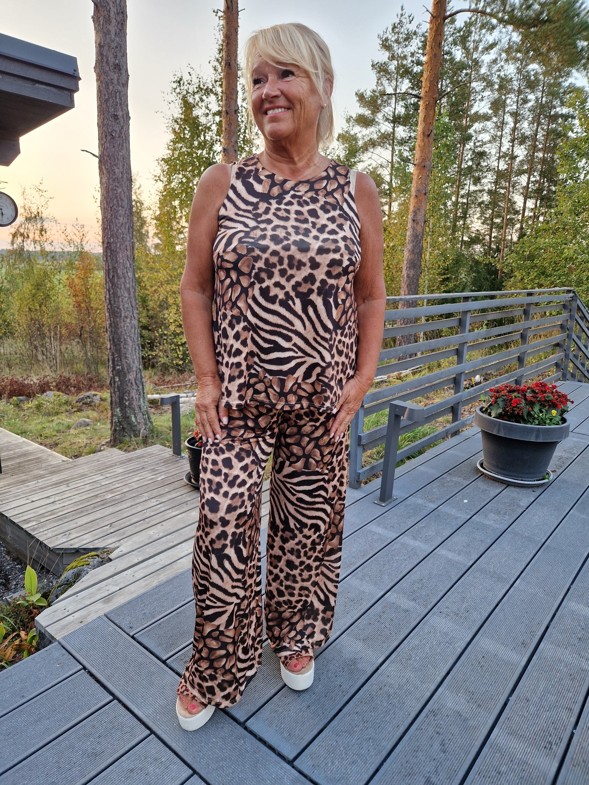 Laskeutuva ja rypytön toppi ja housu setti. Housuissa kuminauhavyötärö, vyötärö n. 70cm ja joustaa! Housun sisälahkeen pituus n. 62cm. Kivat leveät lahkeet.