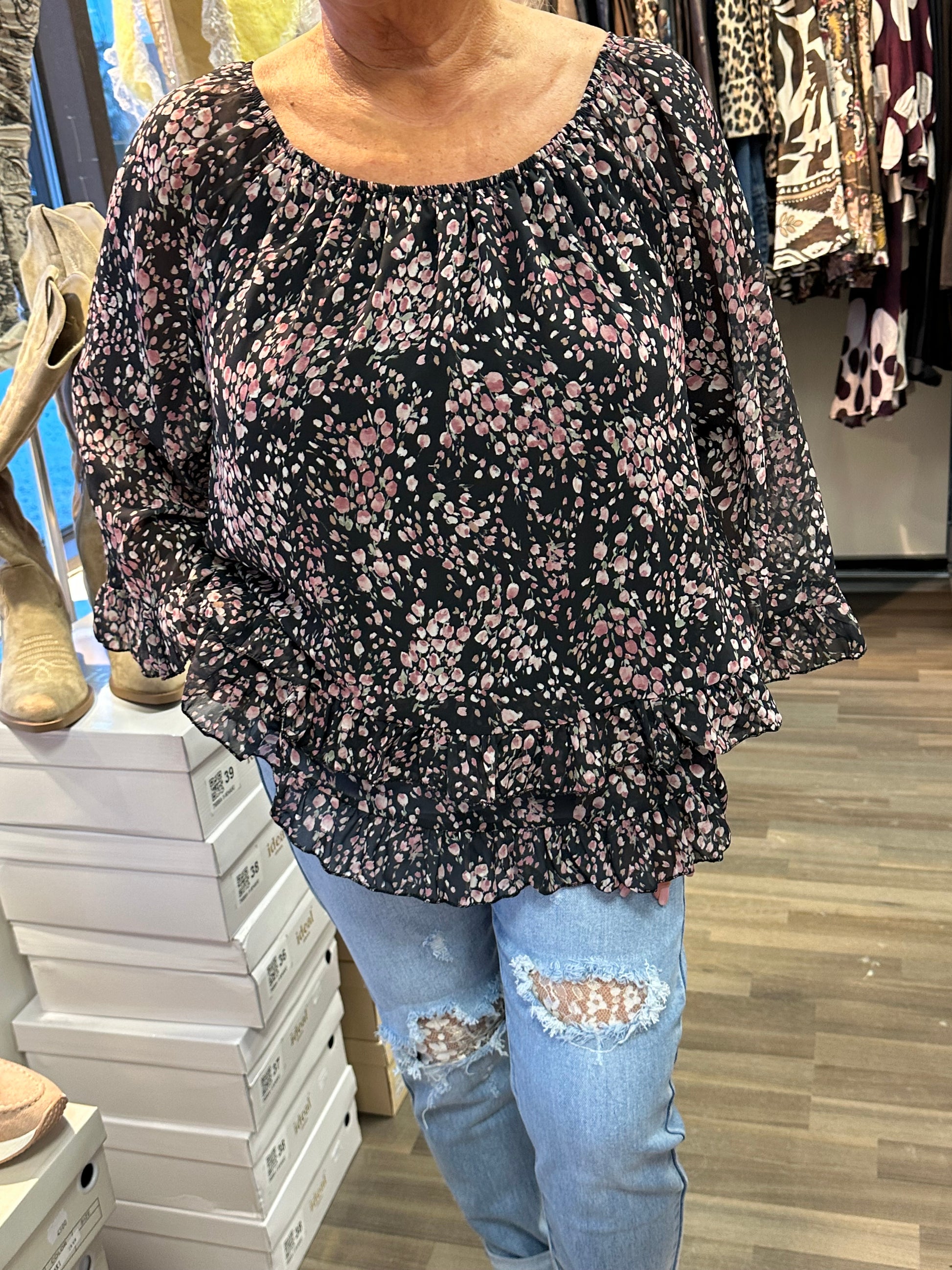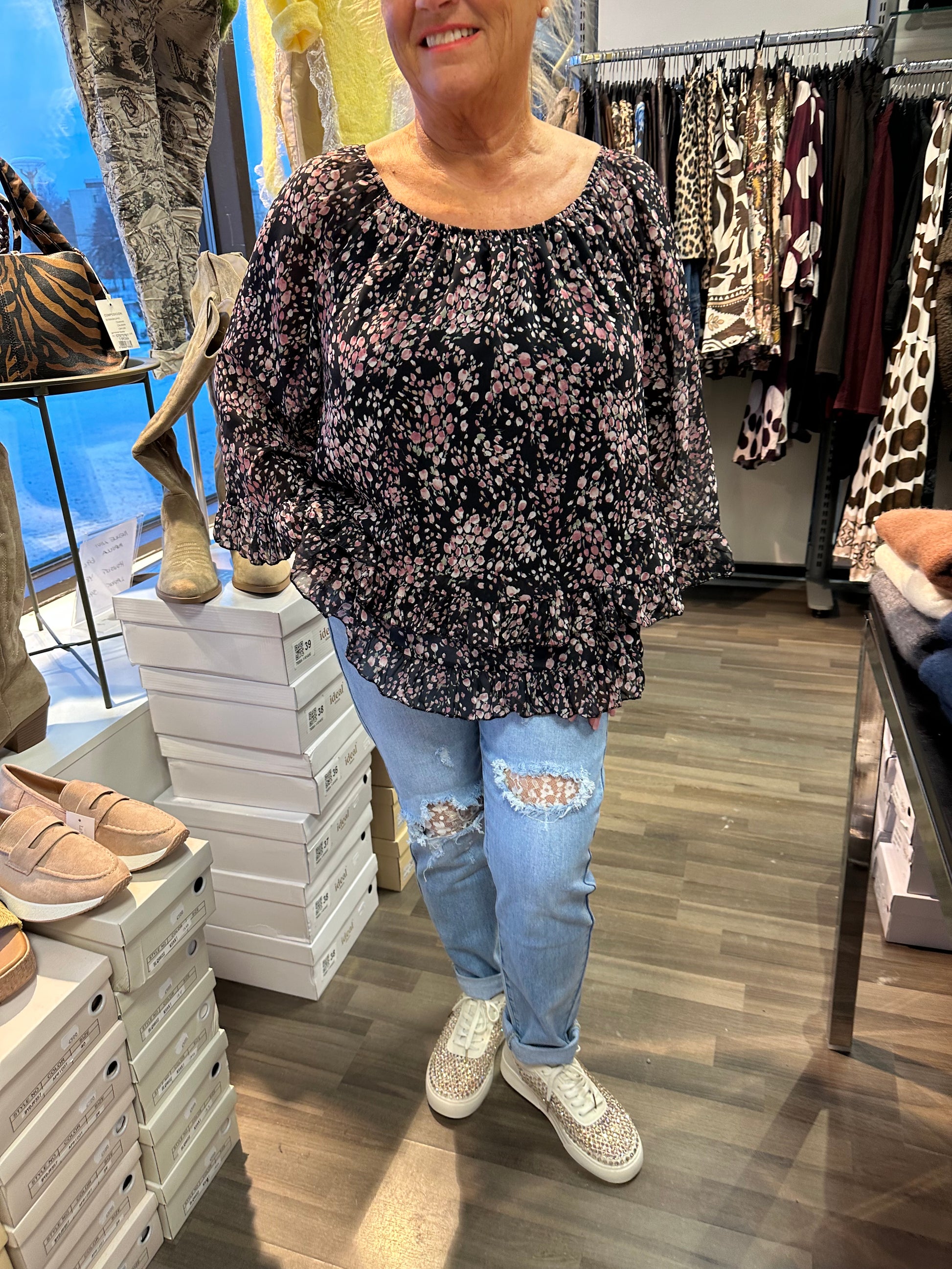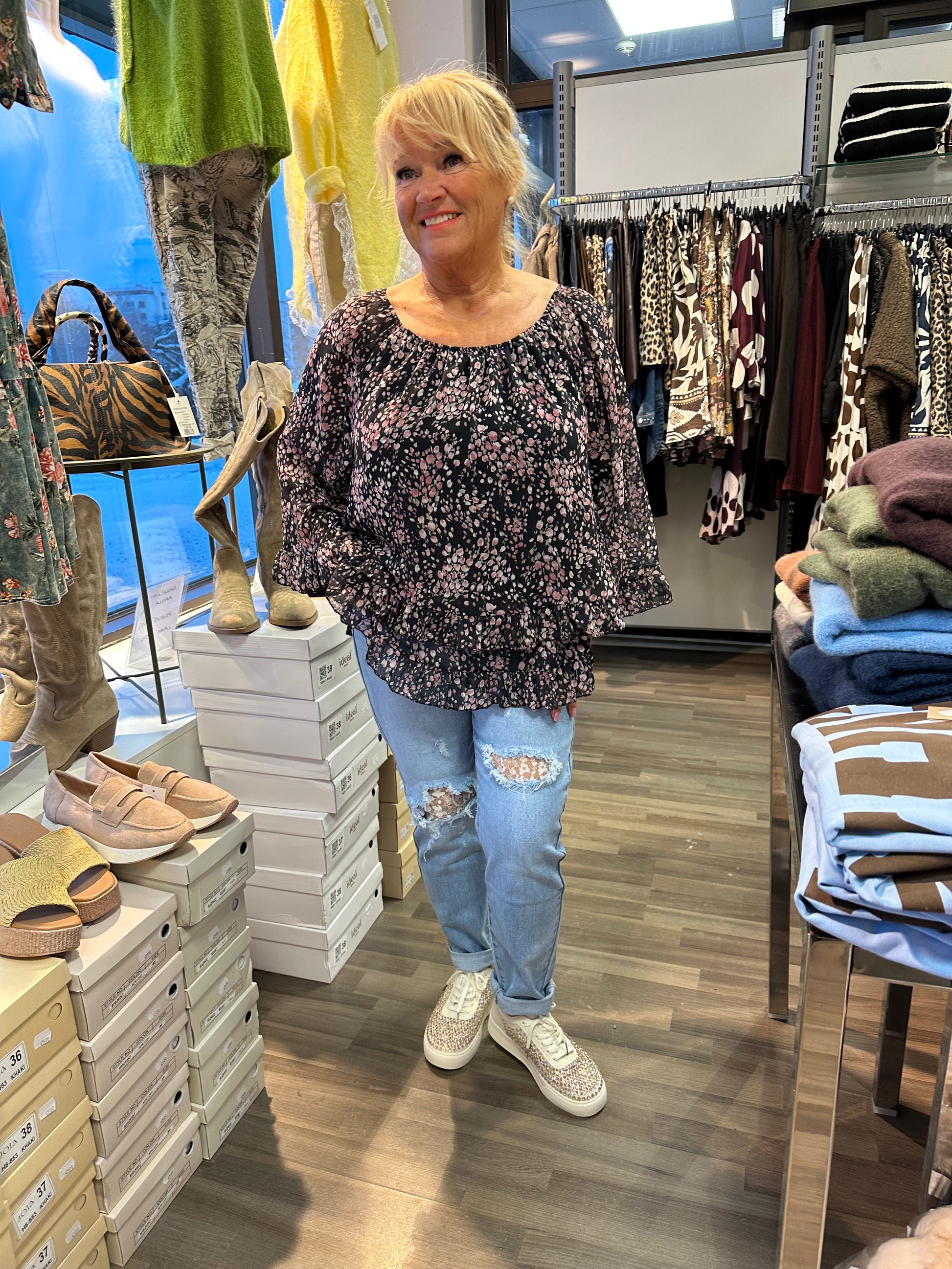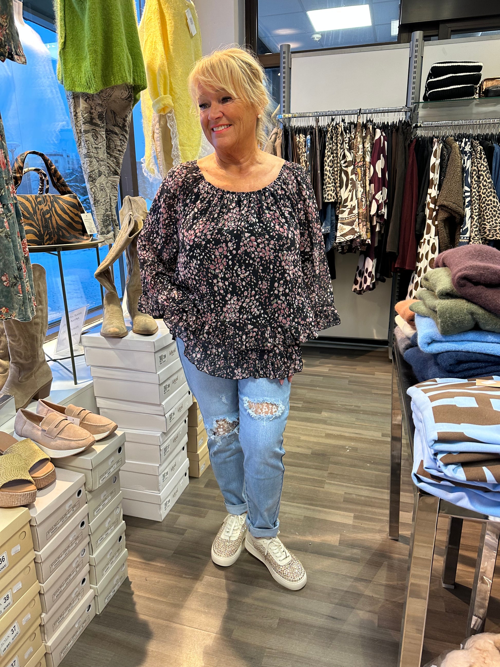 Kaunis kukallinen sifonkipusero. Alla mukava joustava vuori. Pääntiellä joustava kuminauha, jossa myös off shoulder- mahdollisuus. Kivat väljät, hieman vajaamittaiset hihat.