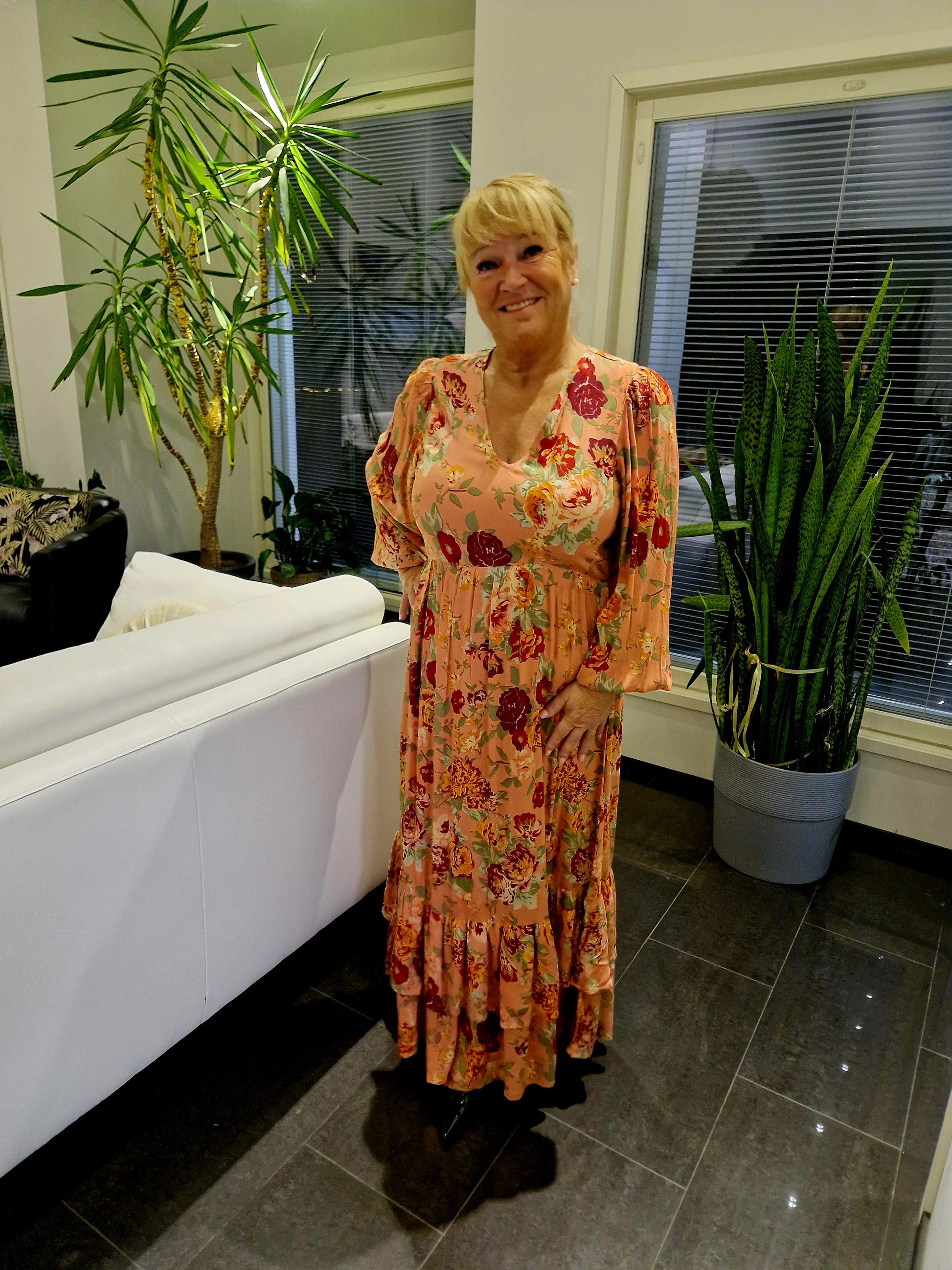 Minulla päällä koko L, näistä Capri Collectionin mekoista aina L koko. Vastaa hyvin kokoaan. Pituus toki minulle, 157cm, ehkä vähän pitkä...mutta aina voi vöhän lyhentää.