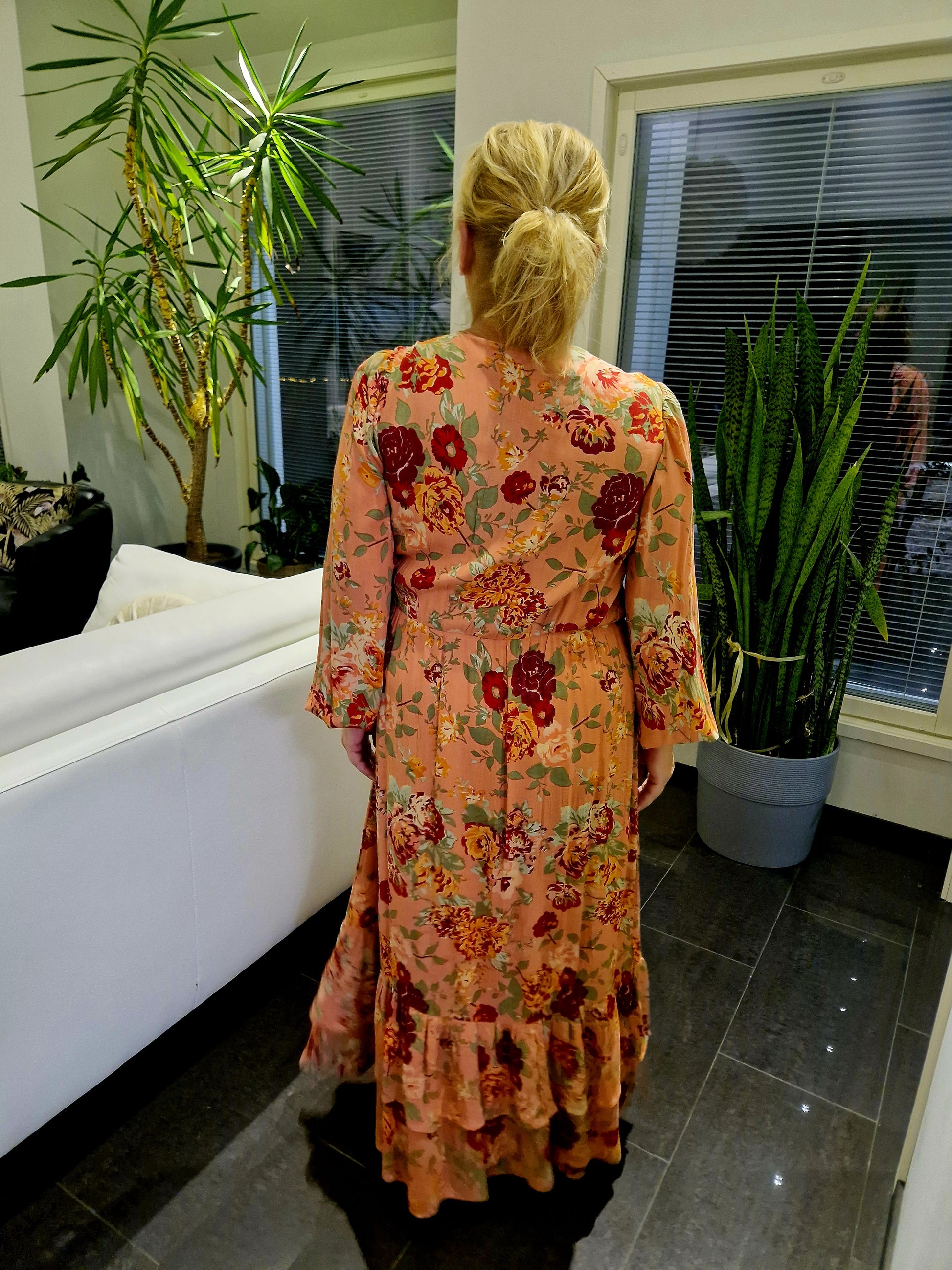 Kesän todellinen kukkaketo! 100% viskoosimekko, maximittainen, frillat helmassa. V-pääntie ja kuminauha takana joustaa.