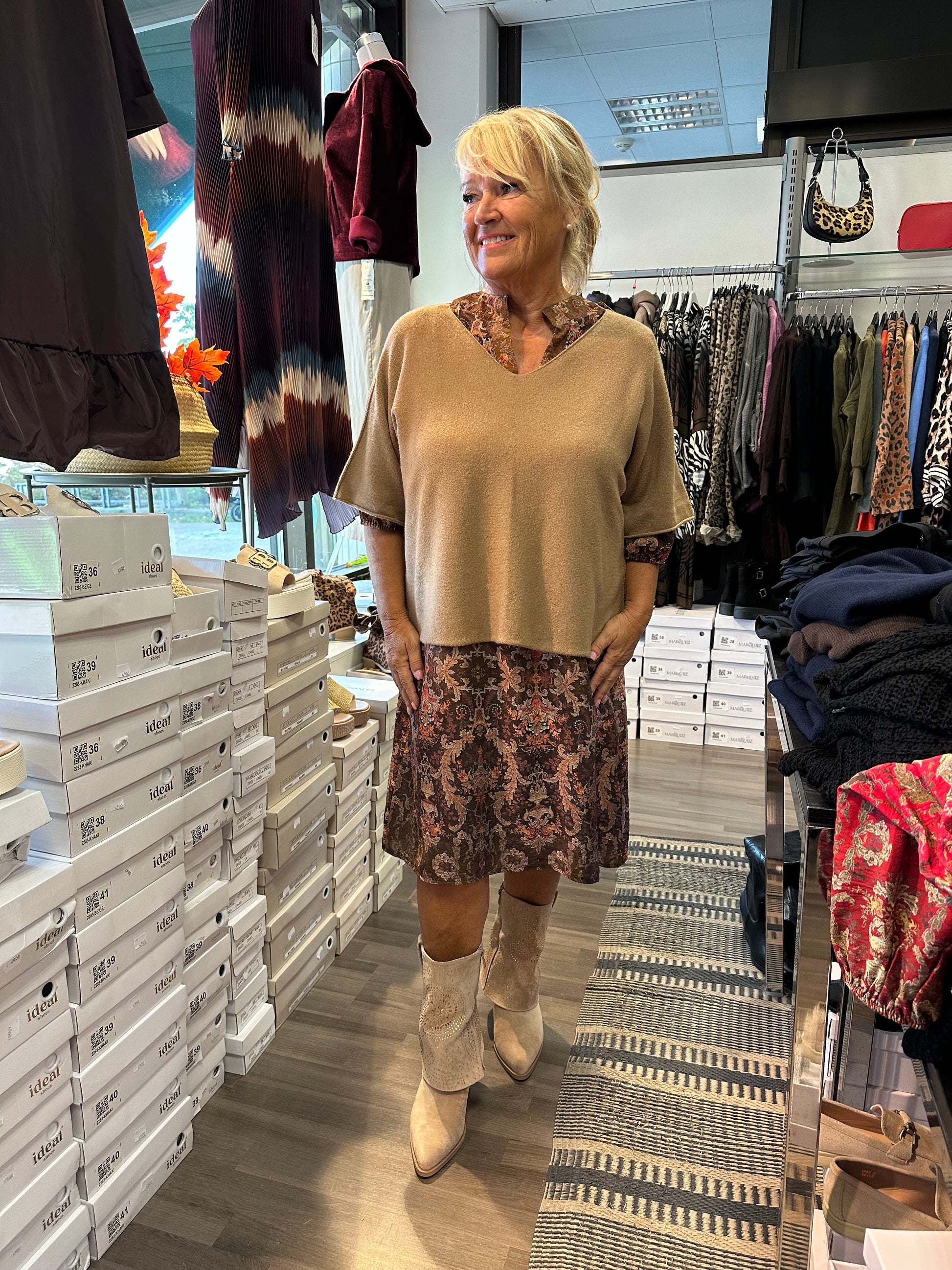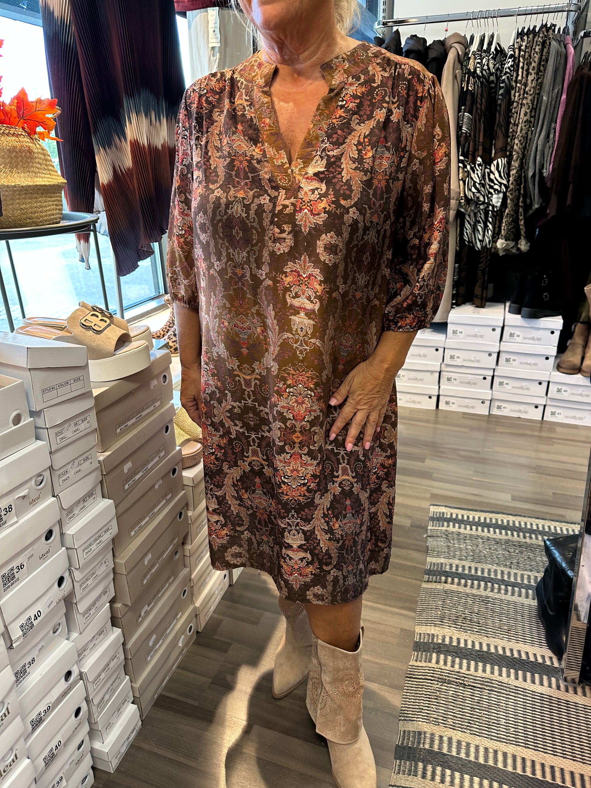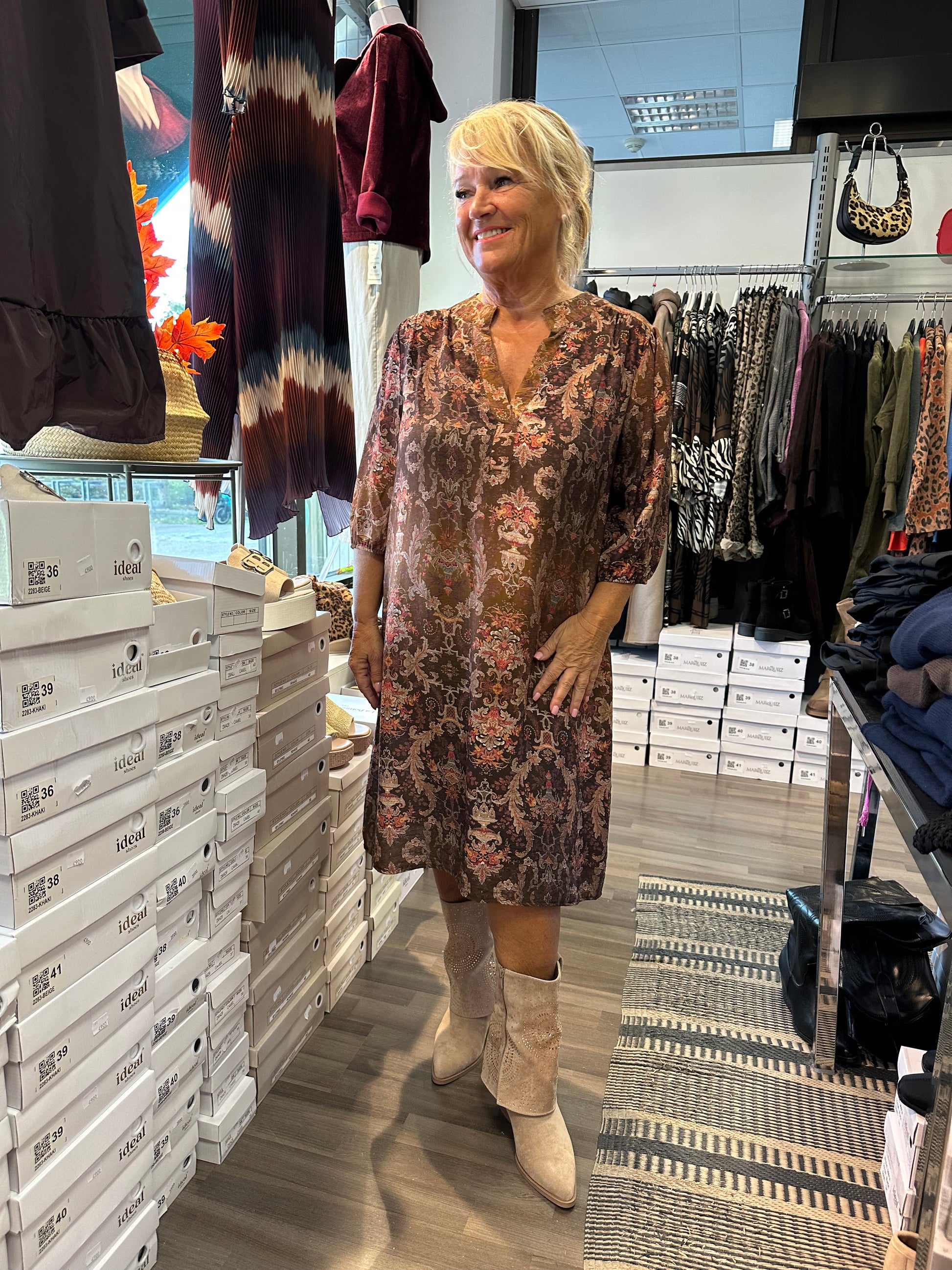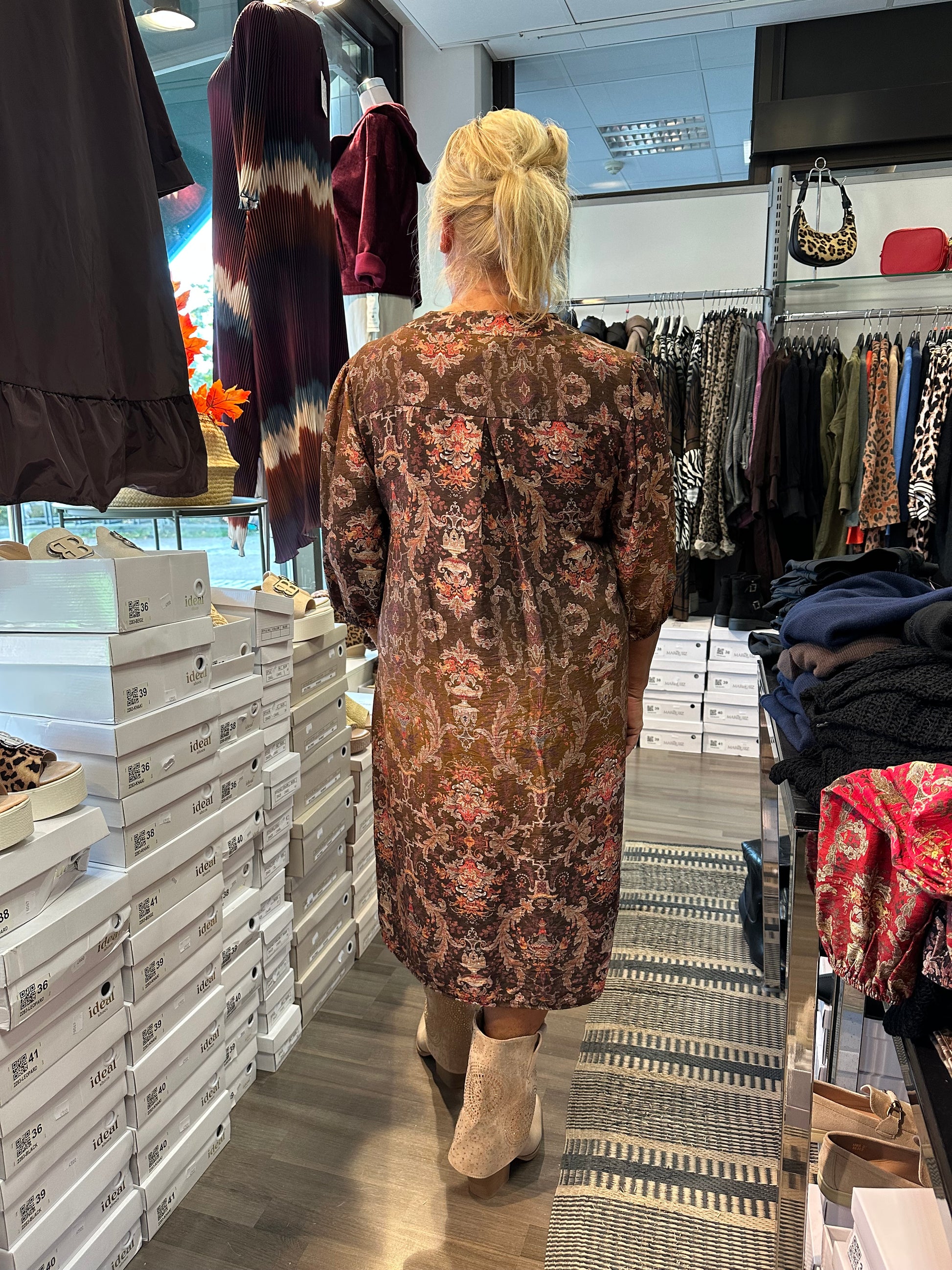 Sirompi suoranmallinen mekko kauniilla kuviolla. Puolipitkät hihat ja hihansuissa joustava kuminauha.