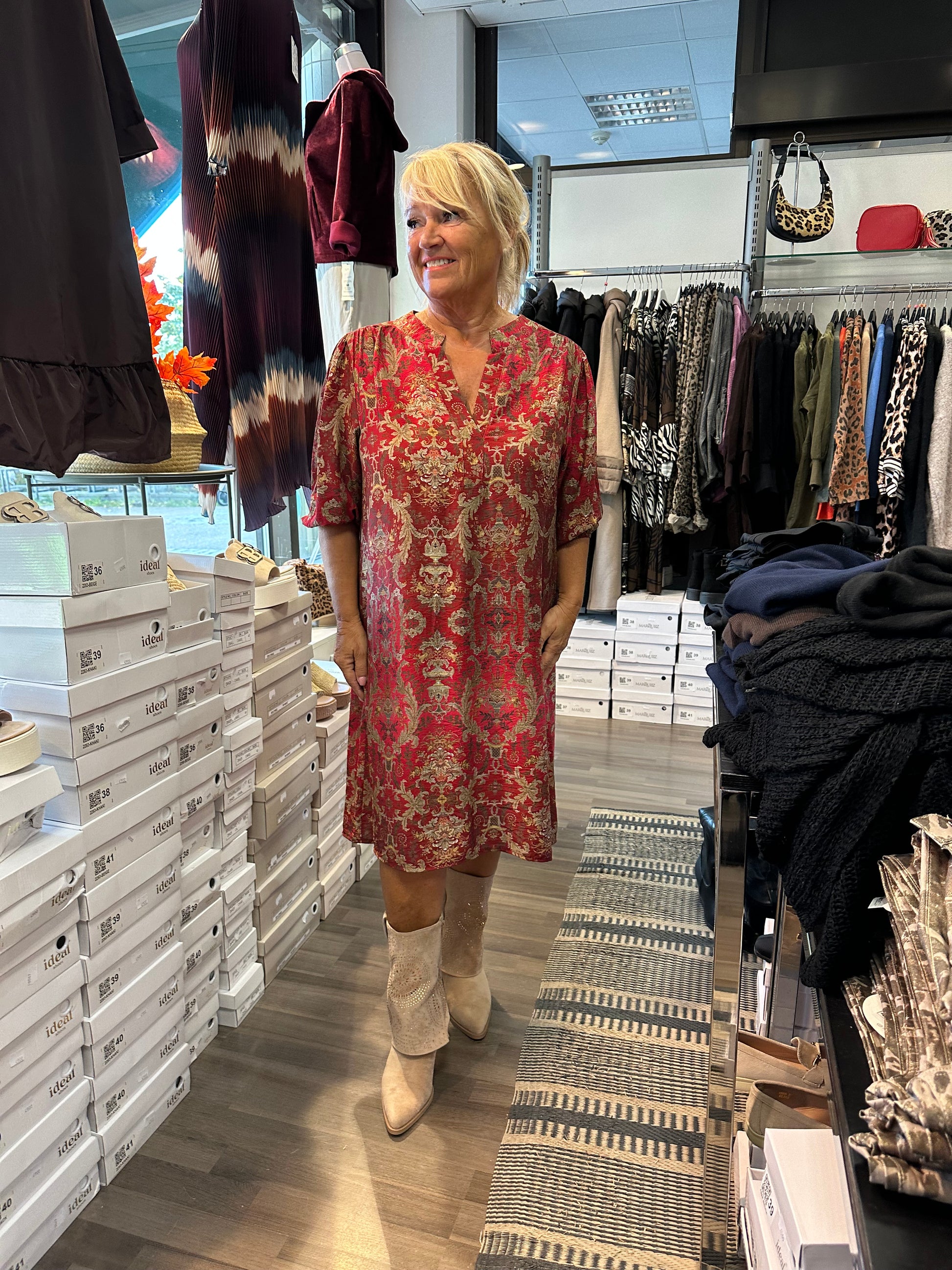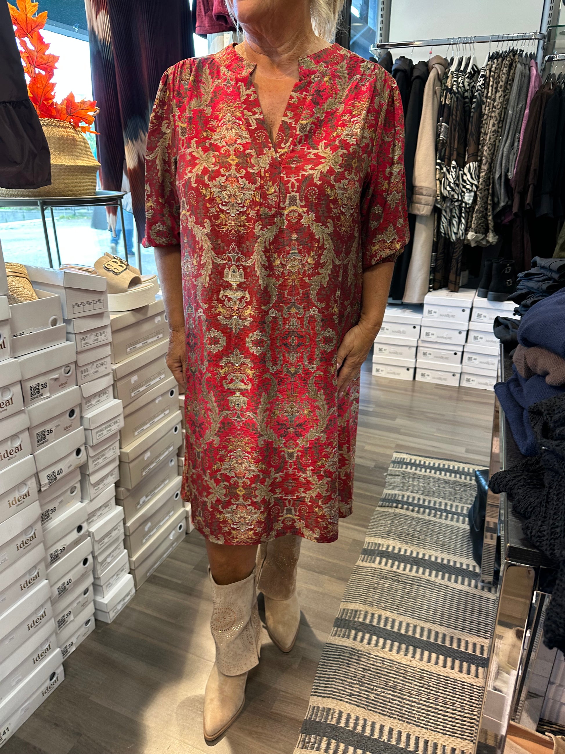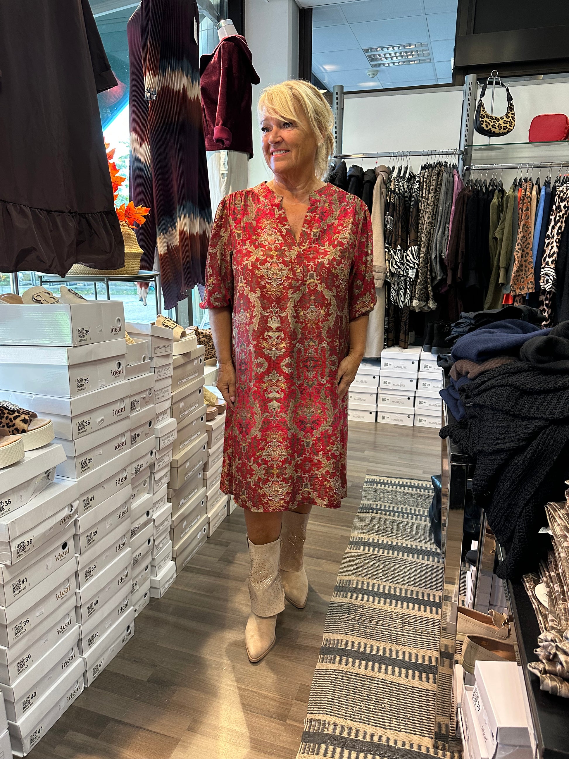 Sirompi suoranmallinen mekko kauniilla kuviolla. Puolipitkät hihat ja hihansuissa joustava kuminauha.