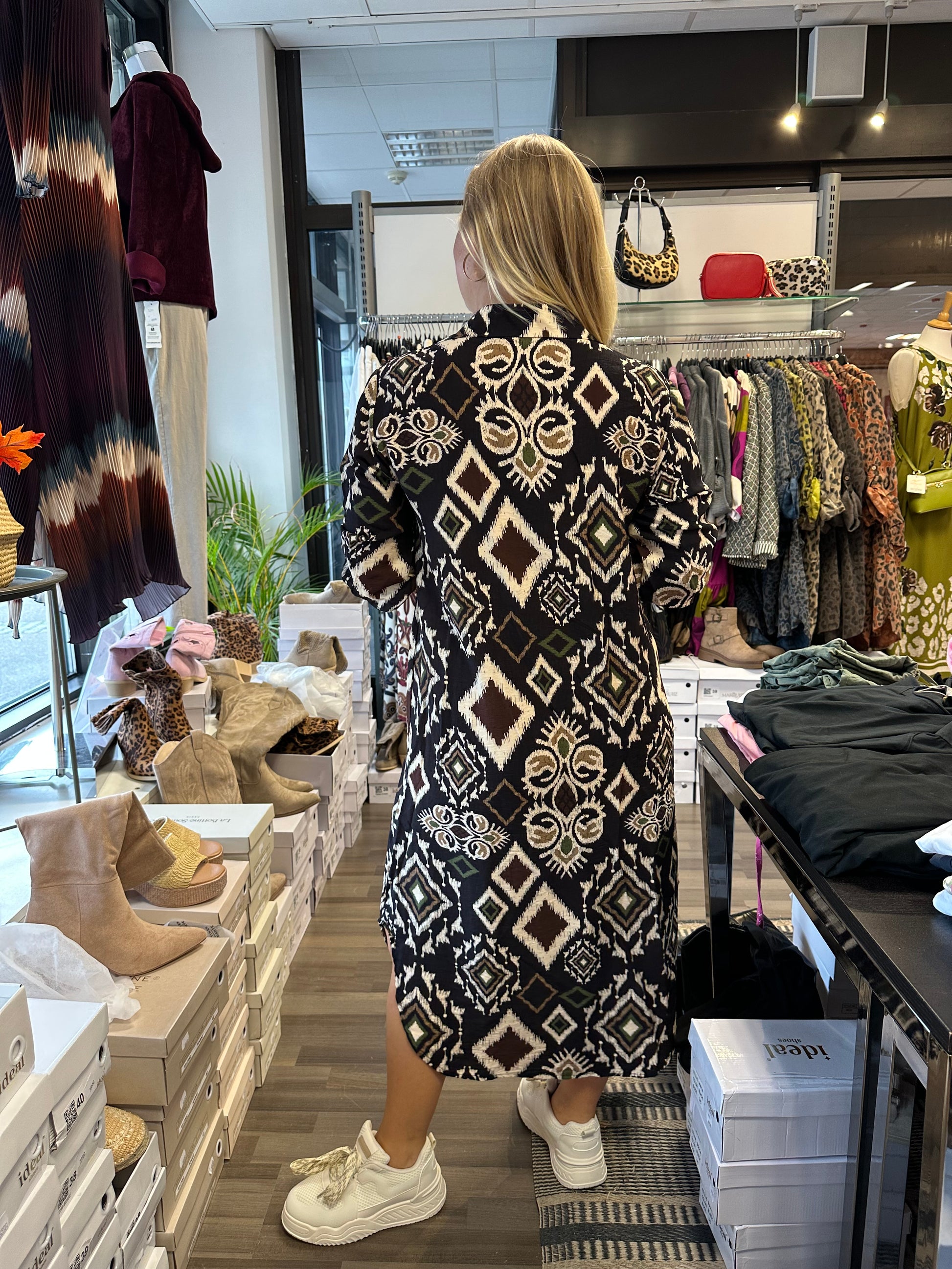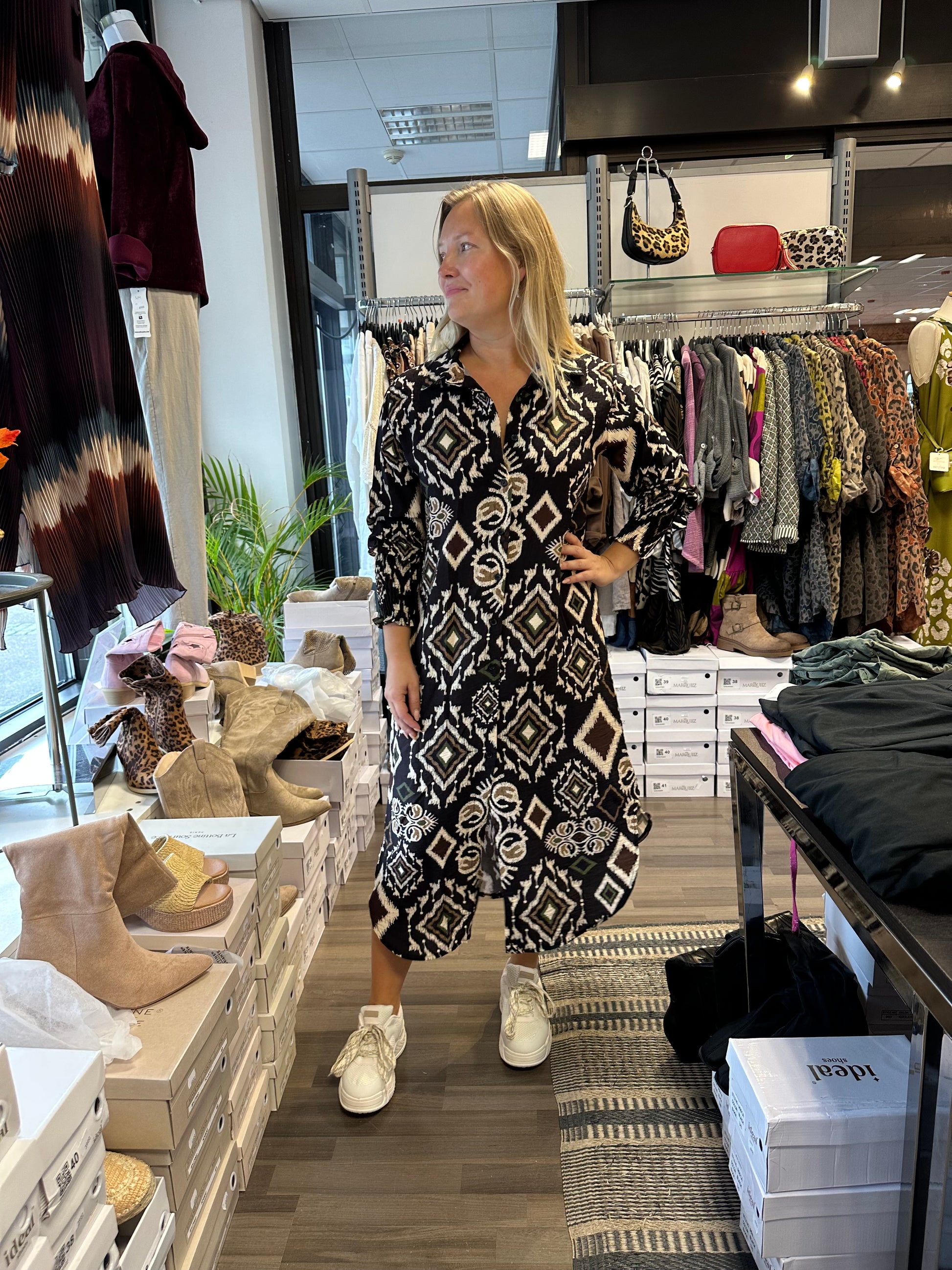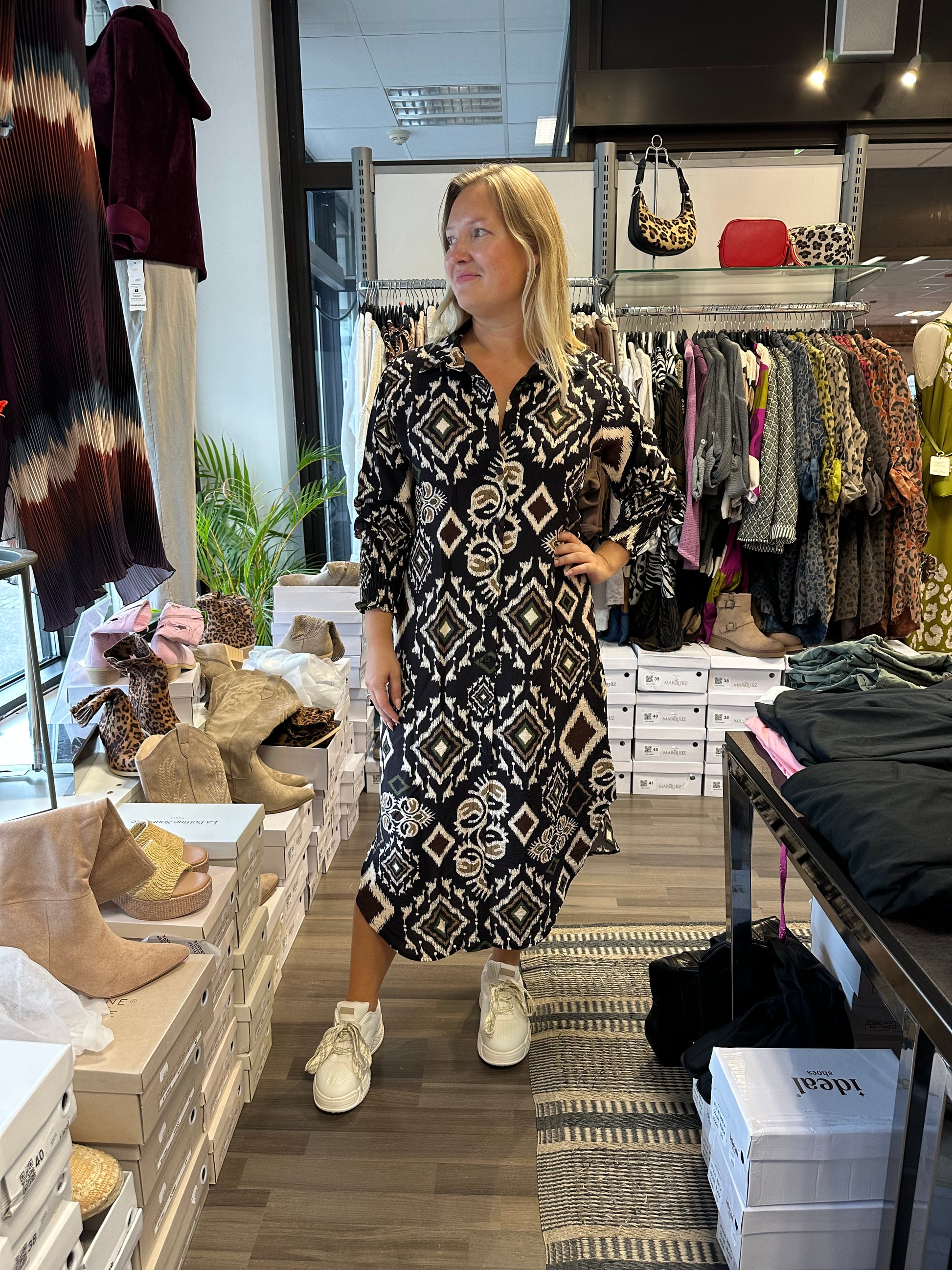 Midimittainen mekko hieman vahvempaa viskoosia. Pitkät hihat ja hihansuissa resori. Napit edessä koko pituudelta. Kaulukset.
