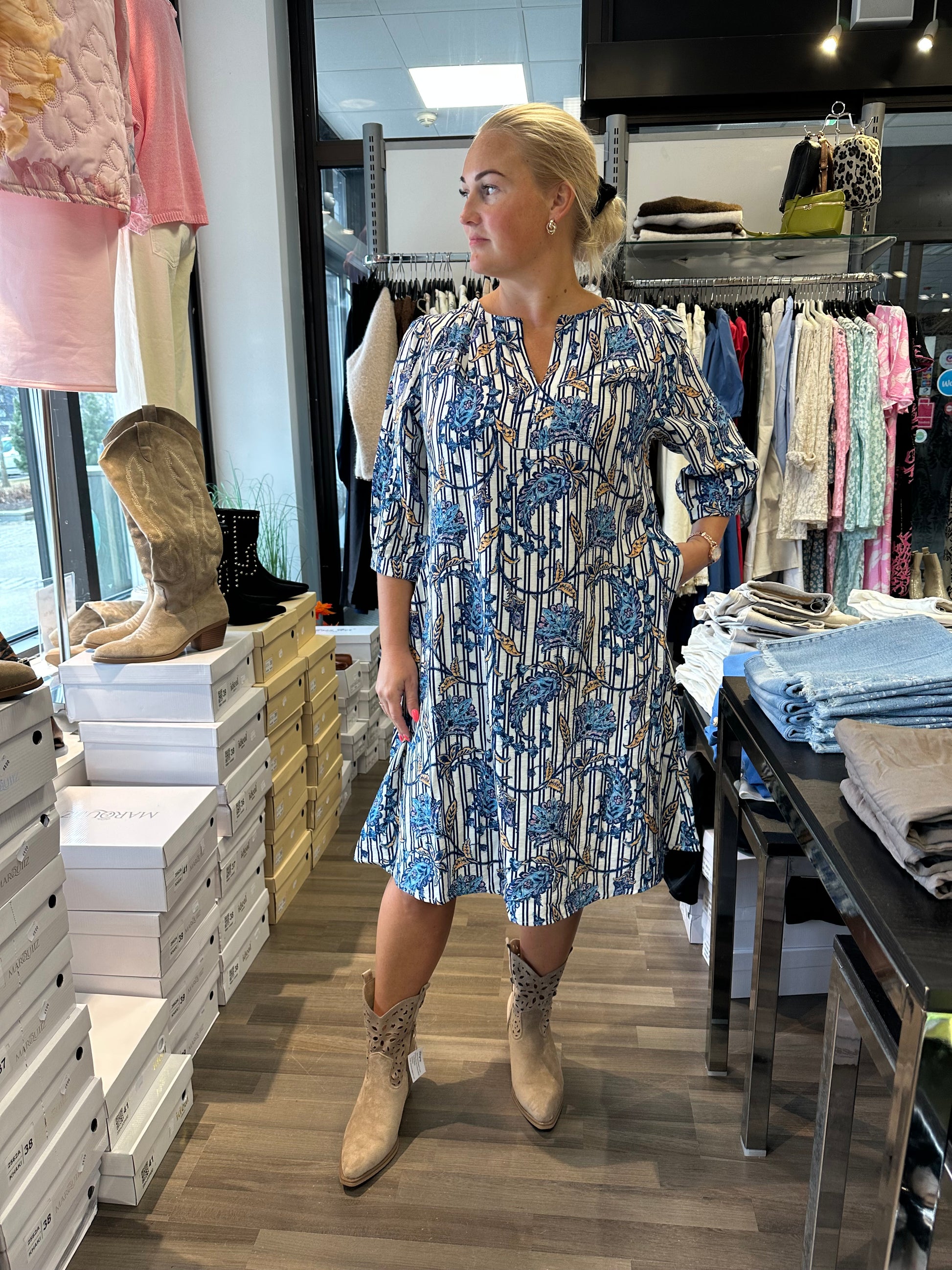 Polvipituinen mekko kauniilla raidallisella kukkakuosilla. Suoralinjainen, väljä malli istuu rennosti ja on mukava päällä. V-pääntie ja puolipitkät hihat. Viskoosikangas ja nylon tuo kankaaseen napakkuutta.