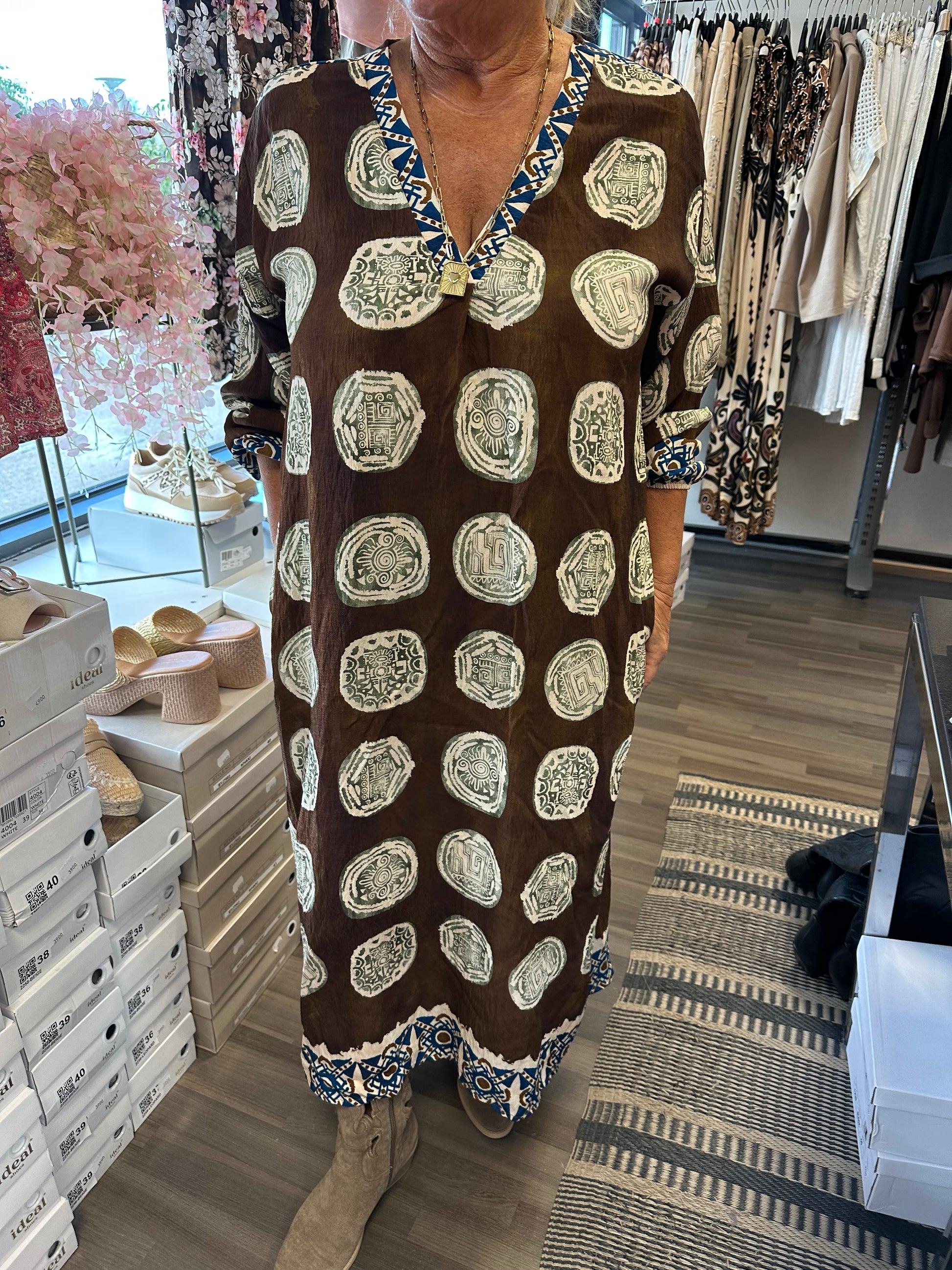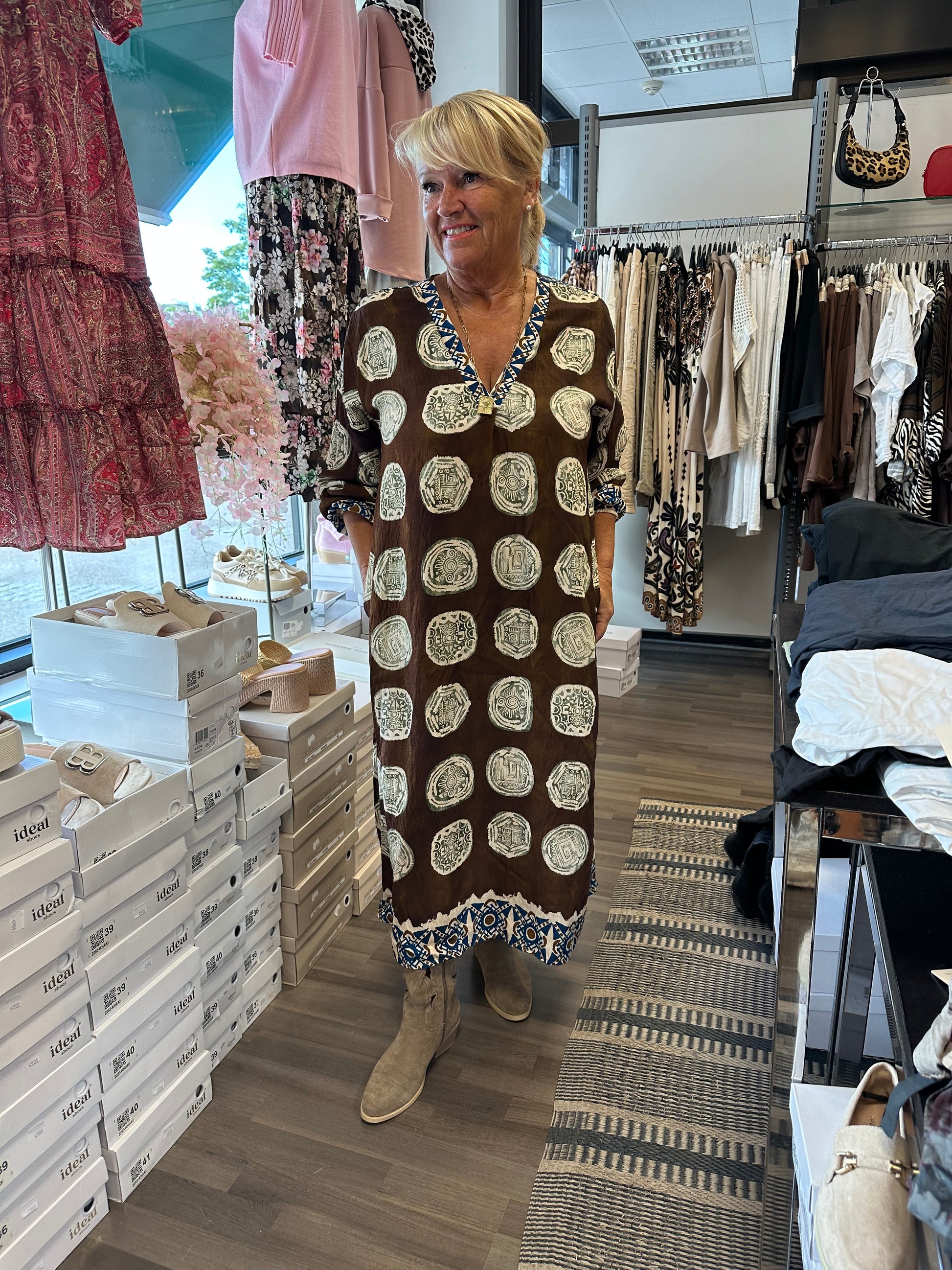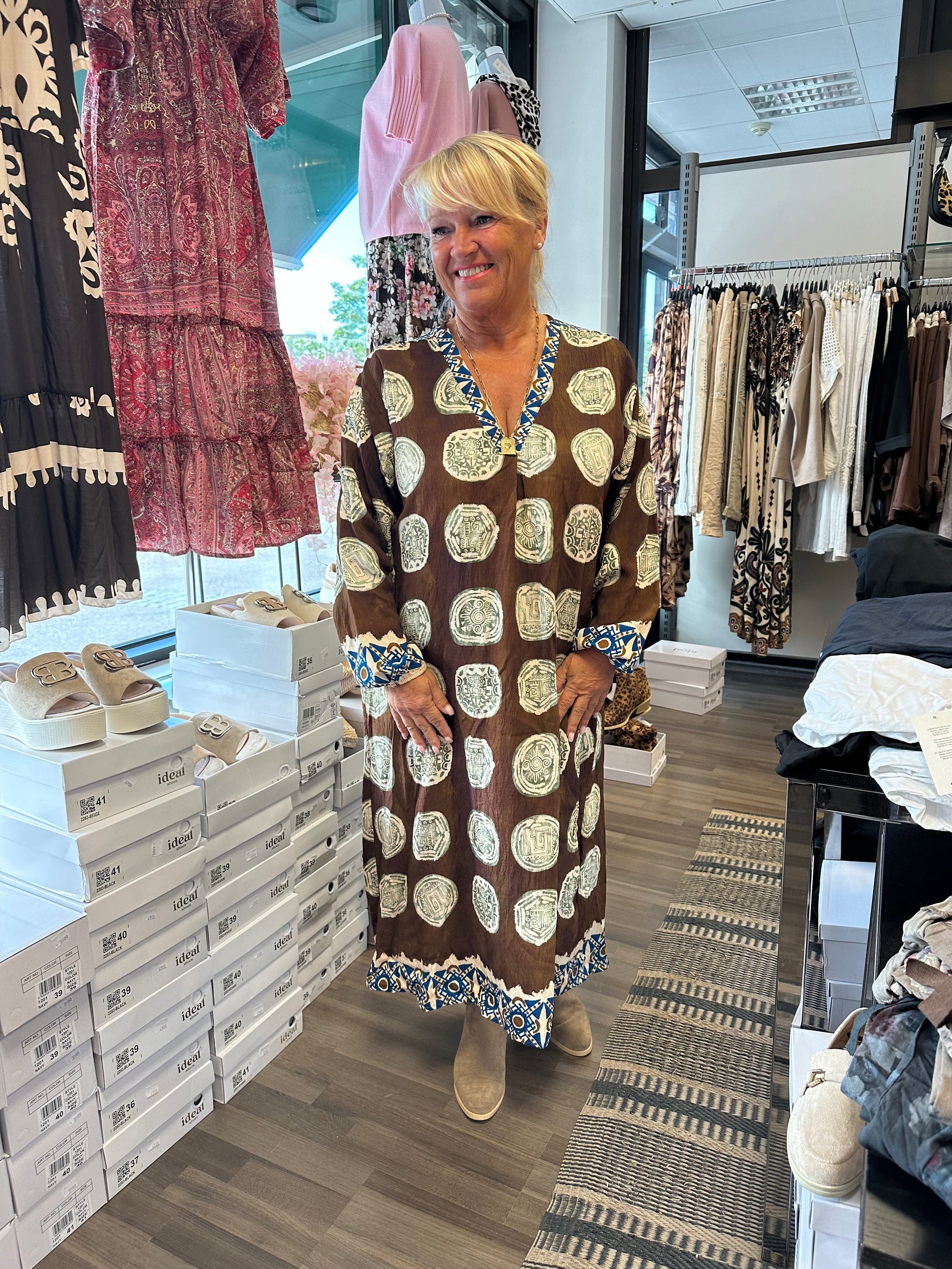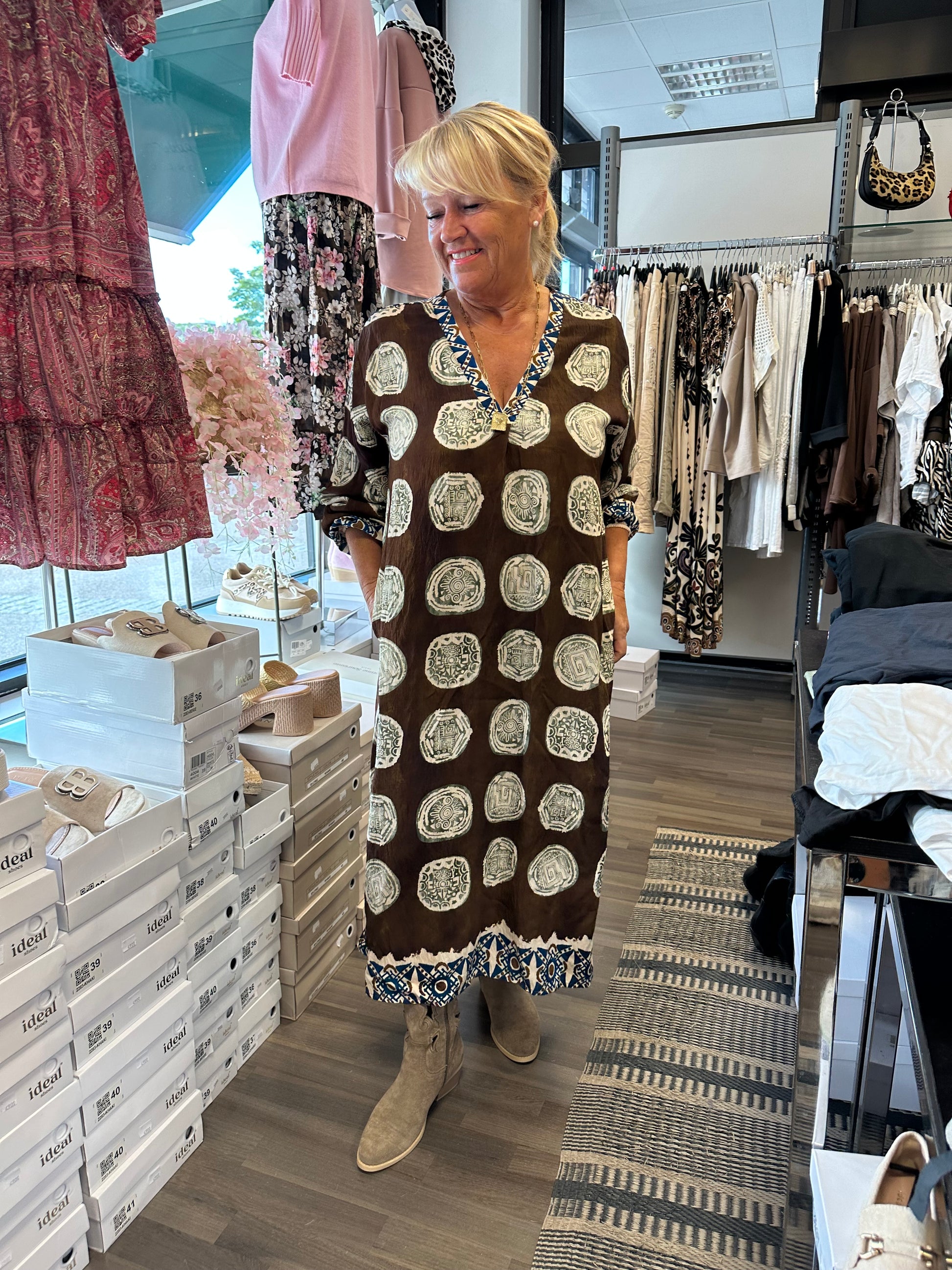 Kuviollinen mekko hieman vahvempaa viskoosia. Pitkät hihat ja hihansuissa resori. V-pääntie. Taskut sivusaumoissa.
