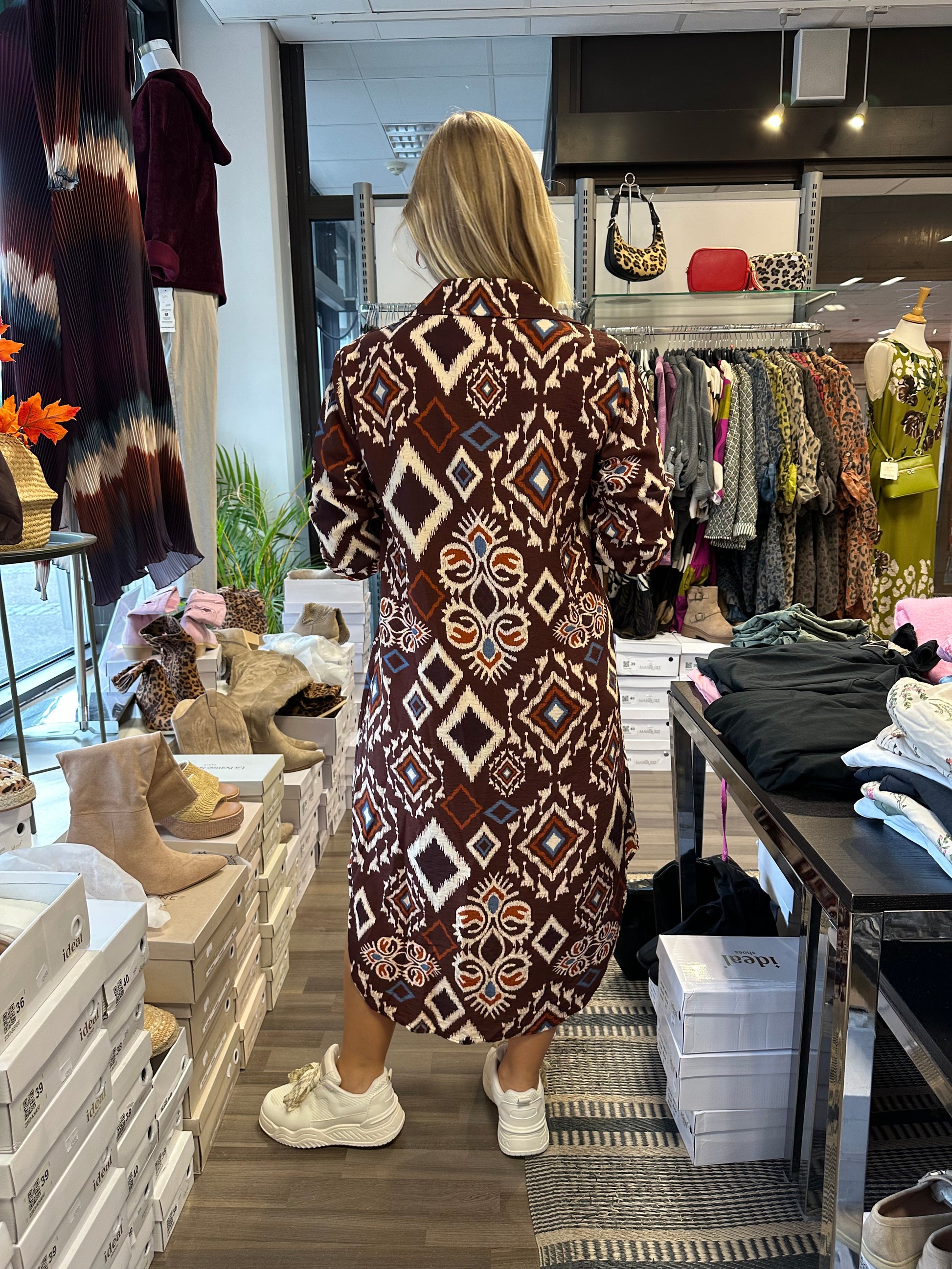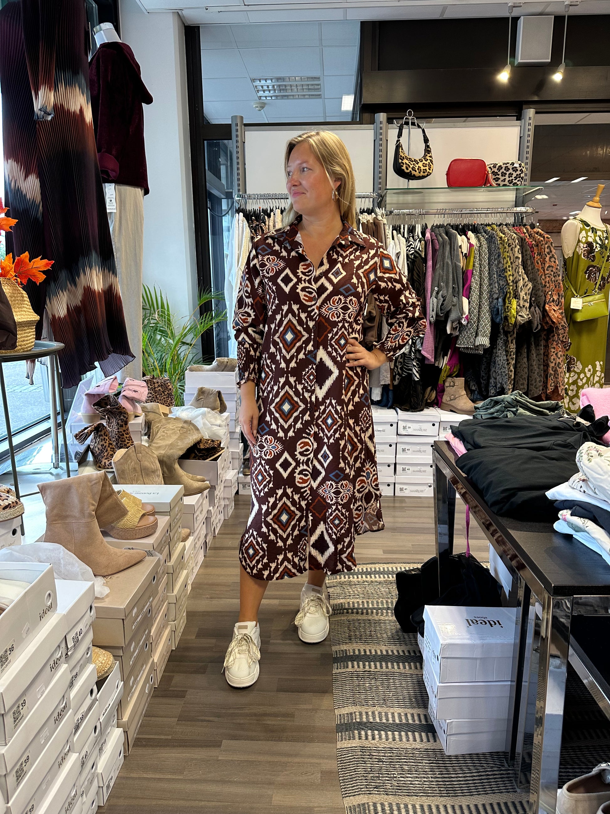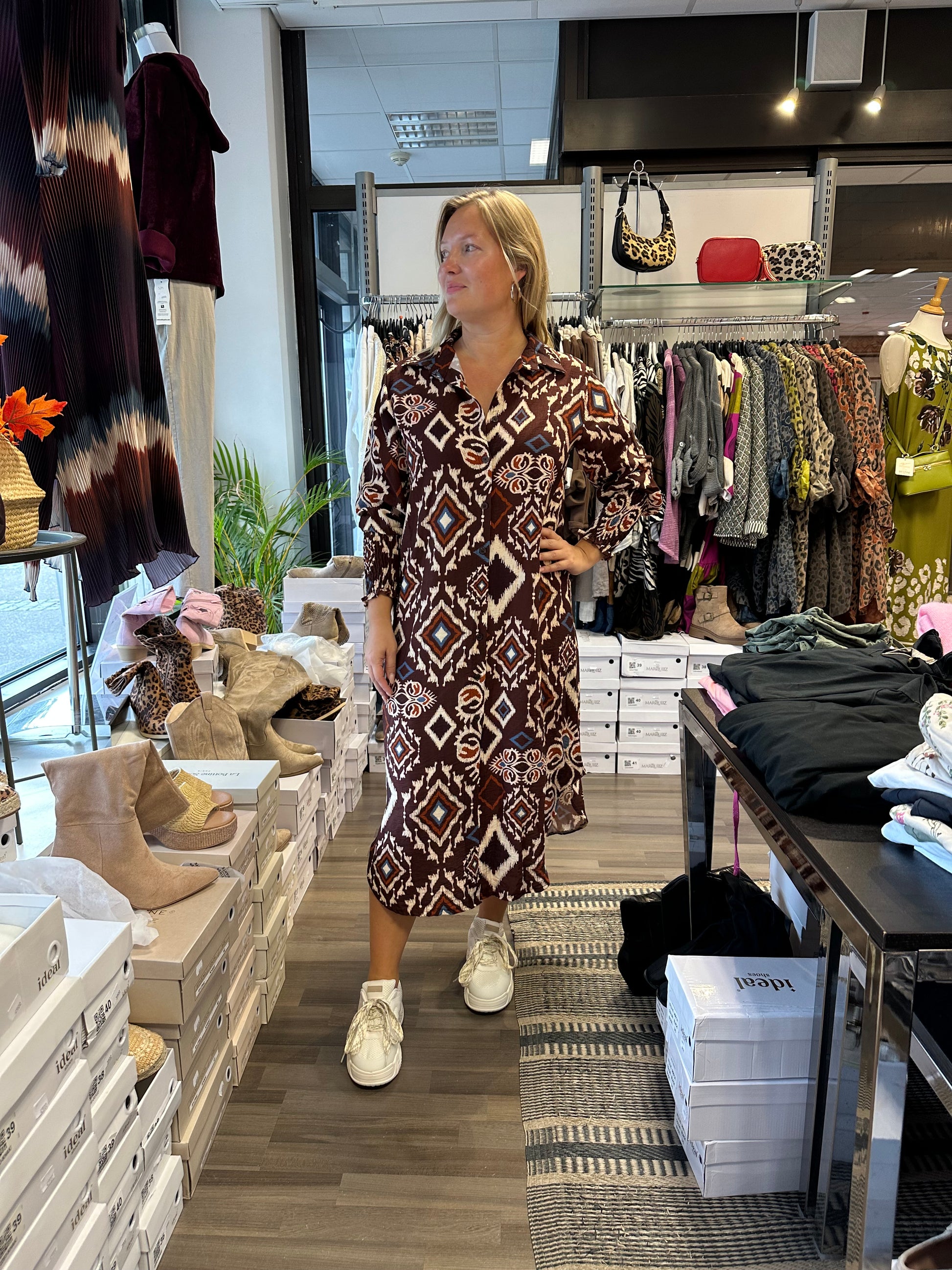Midimittainen mekko hieman vahvempaa viskoosia. Pitkät hihat ja hihansuissa resori. Napit edessä koko pituudelta. Kaulukset.