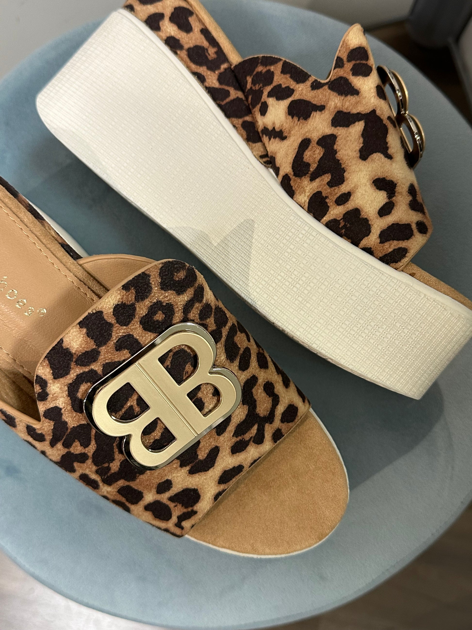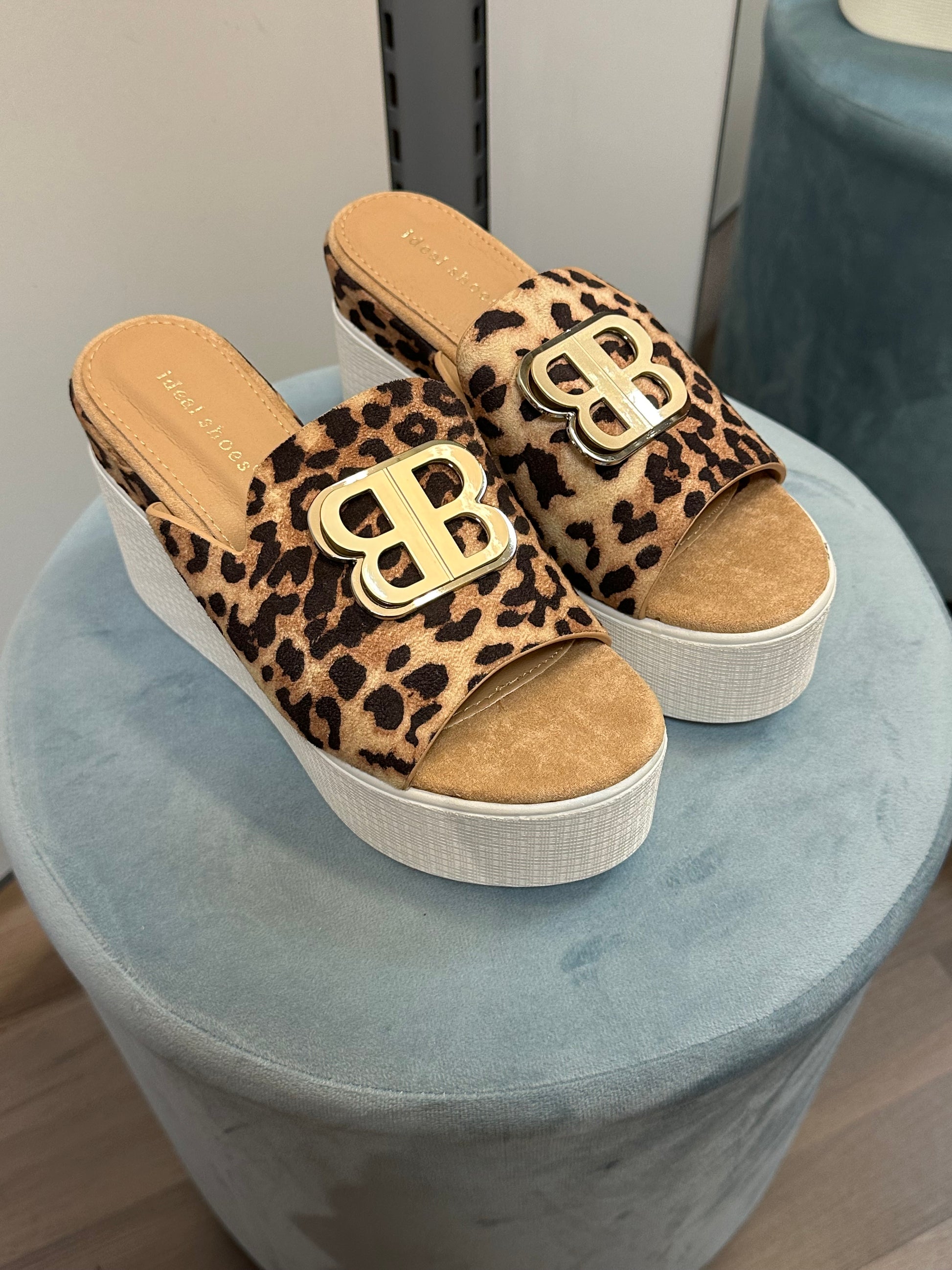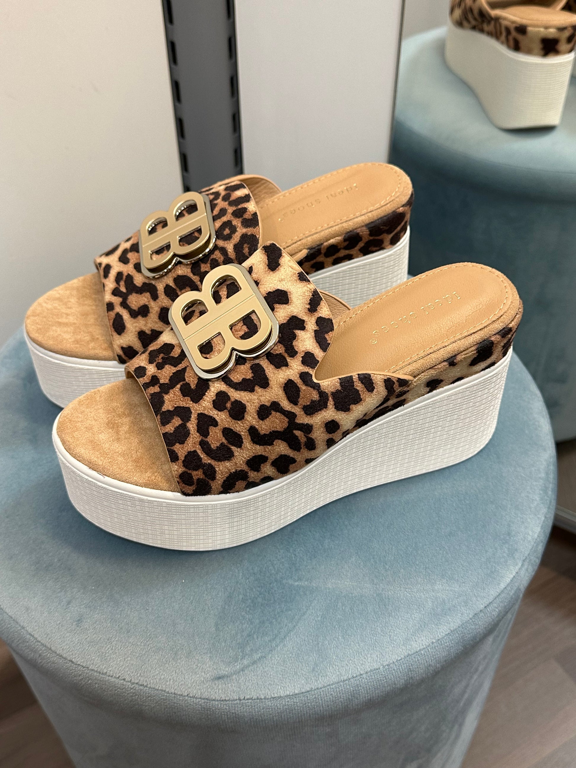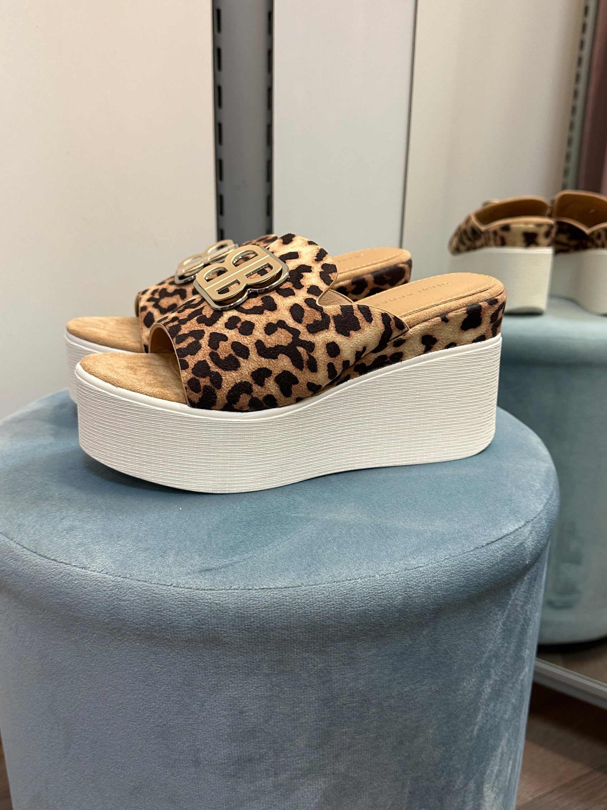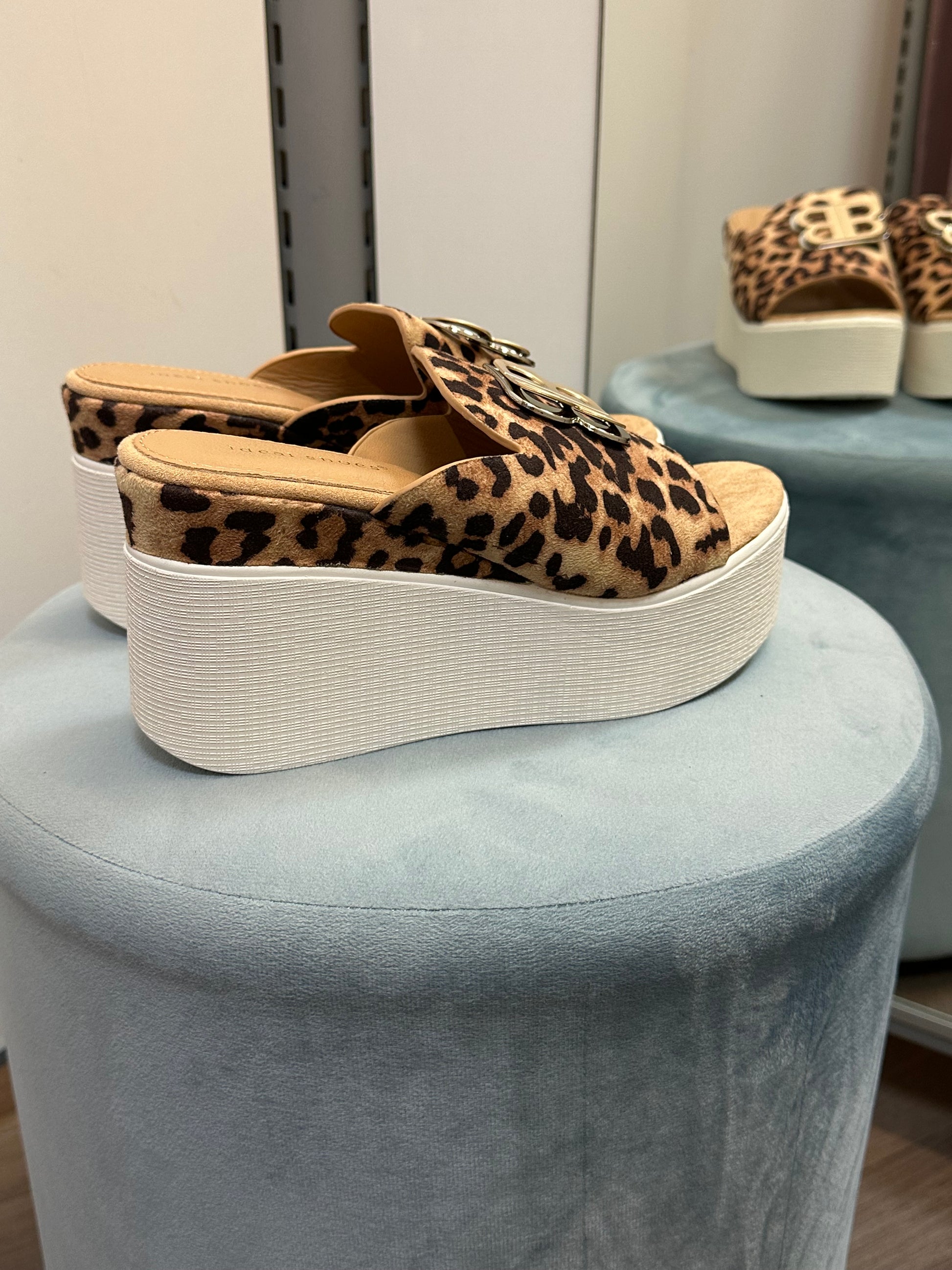 Makeet sandaalit leo kuosilla ja kultaisella koristeella. Koron korkeus n. 7 cm.