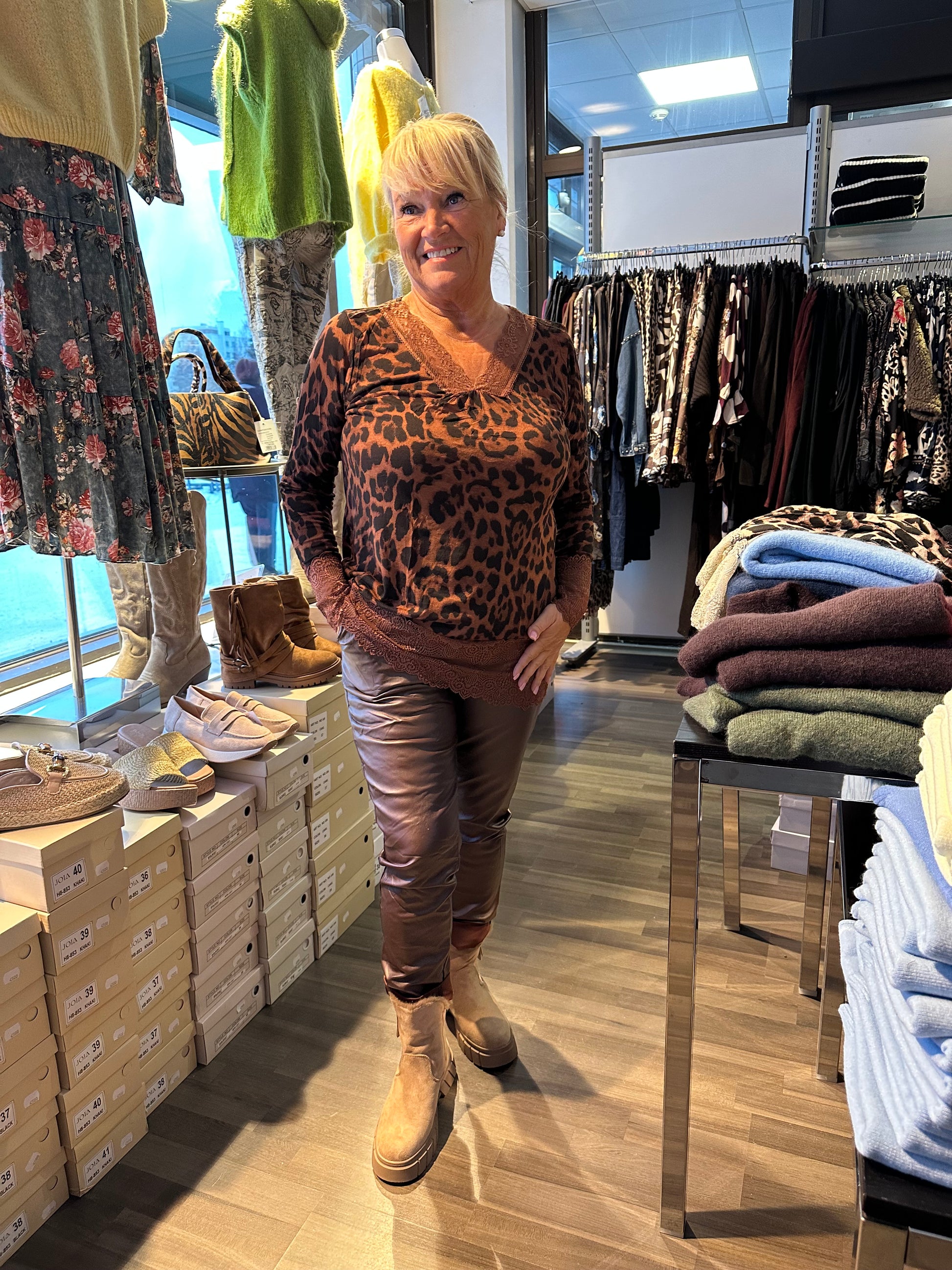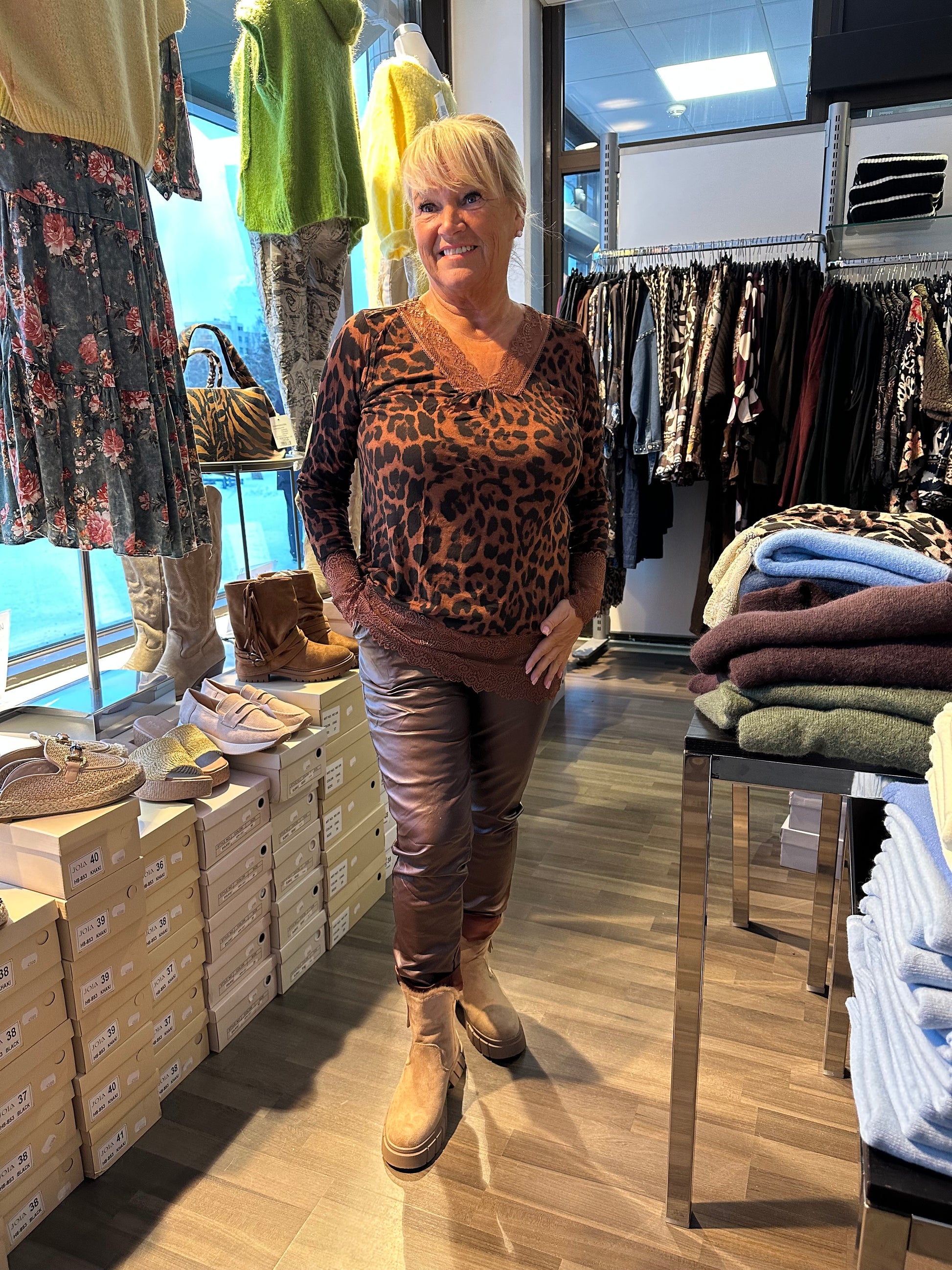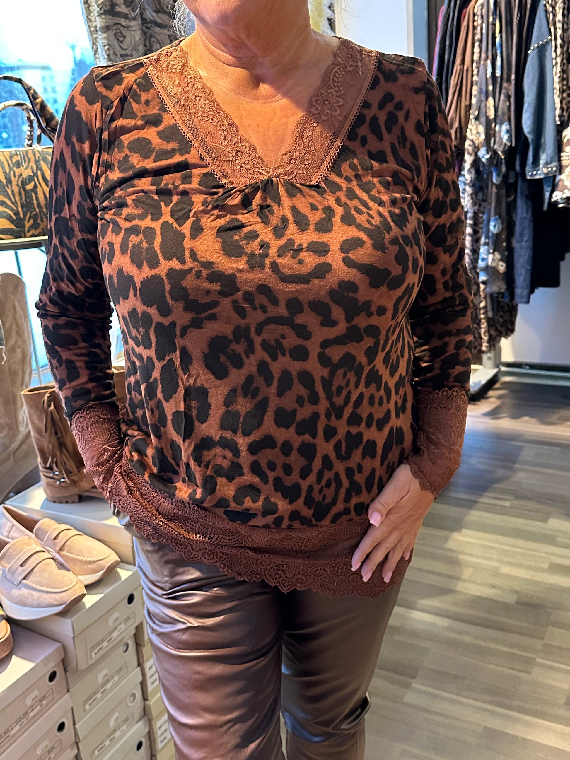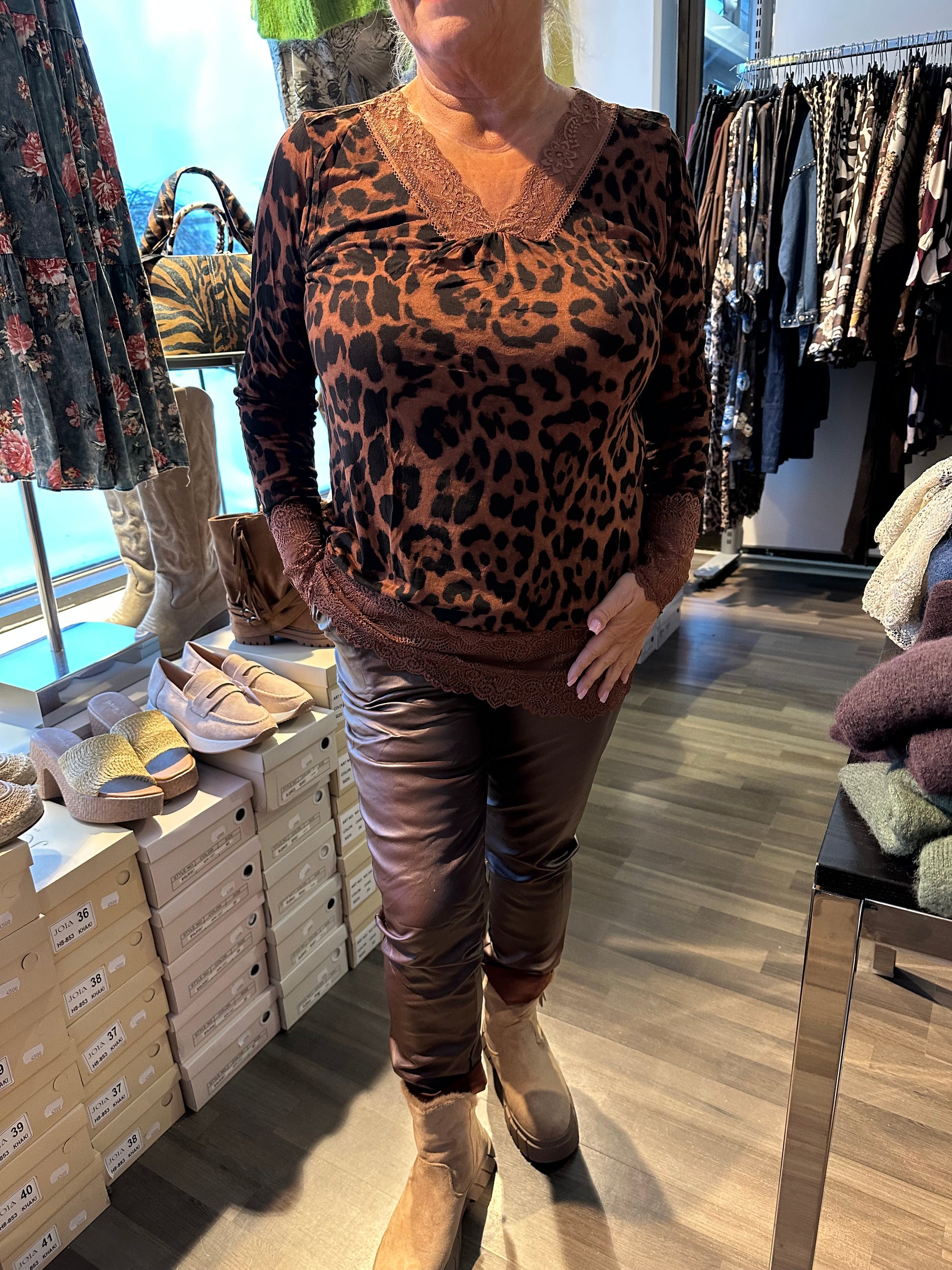 Kiva leo-kuosinen pitsitoppi! Toimii aluspuserona tai vaikka yksinään. Mukava joustava viskoosilaatu.