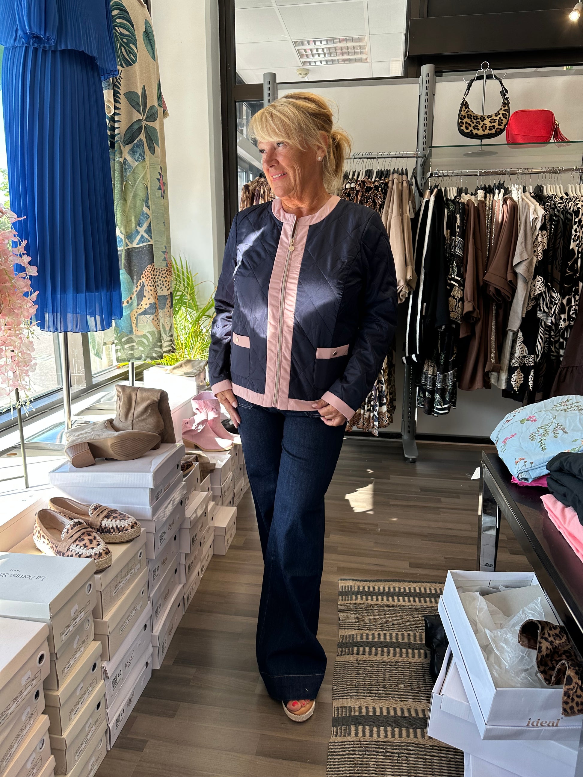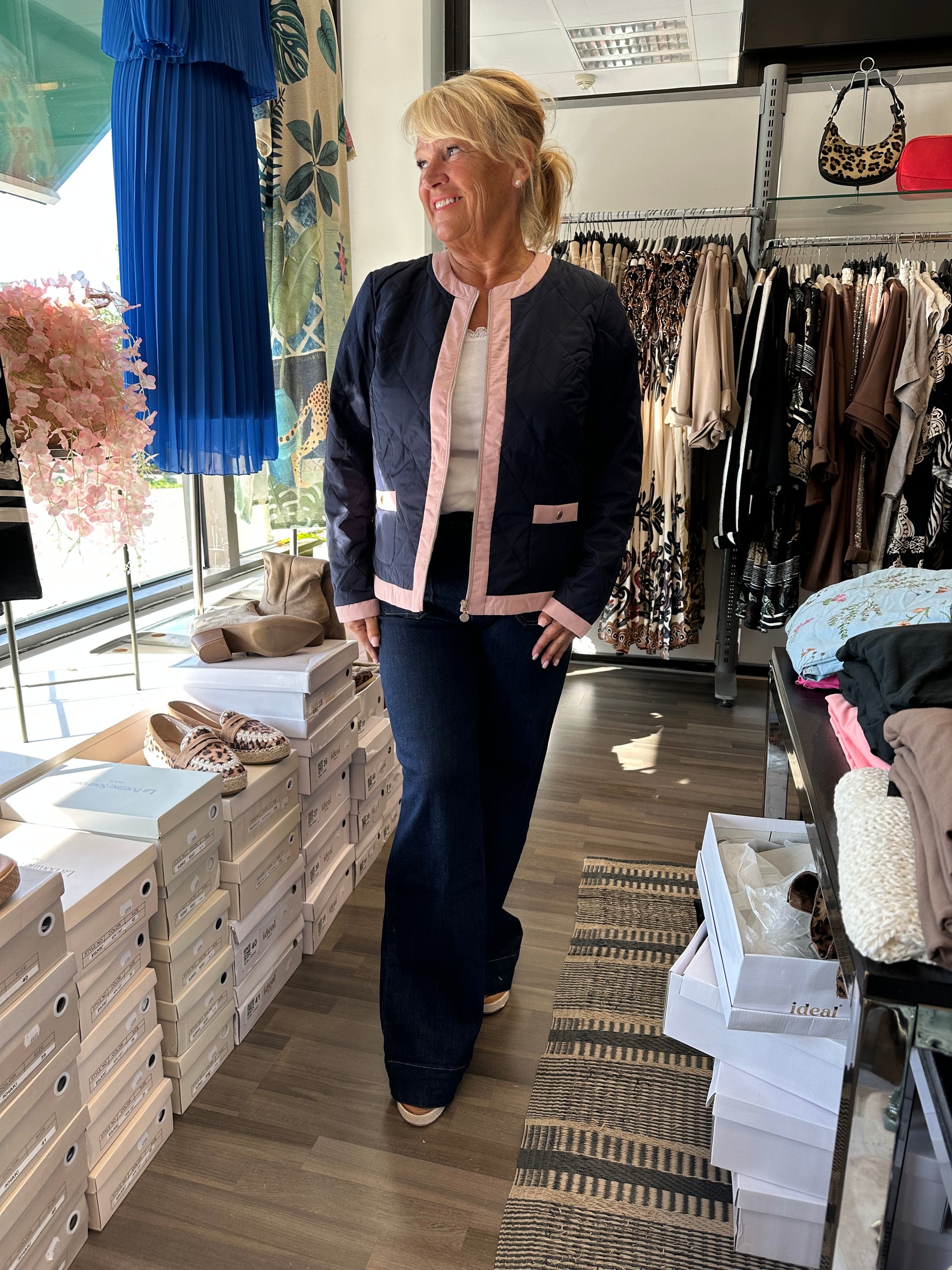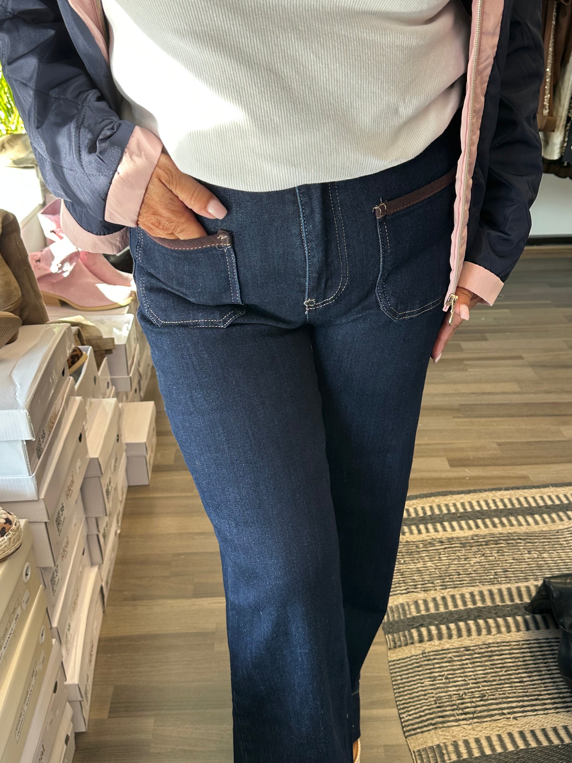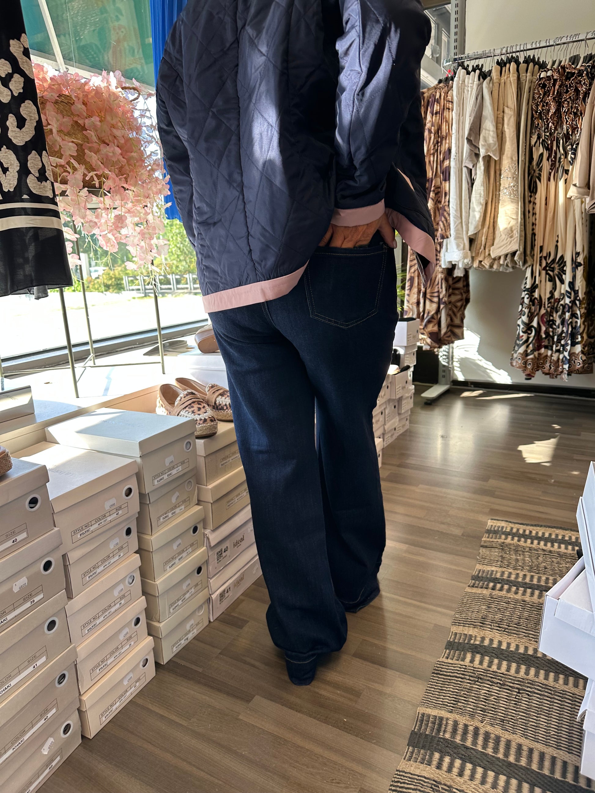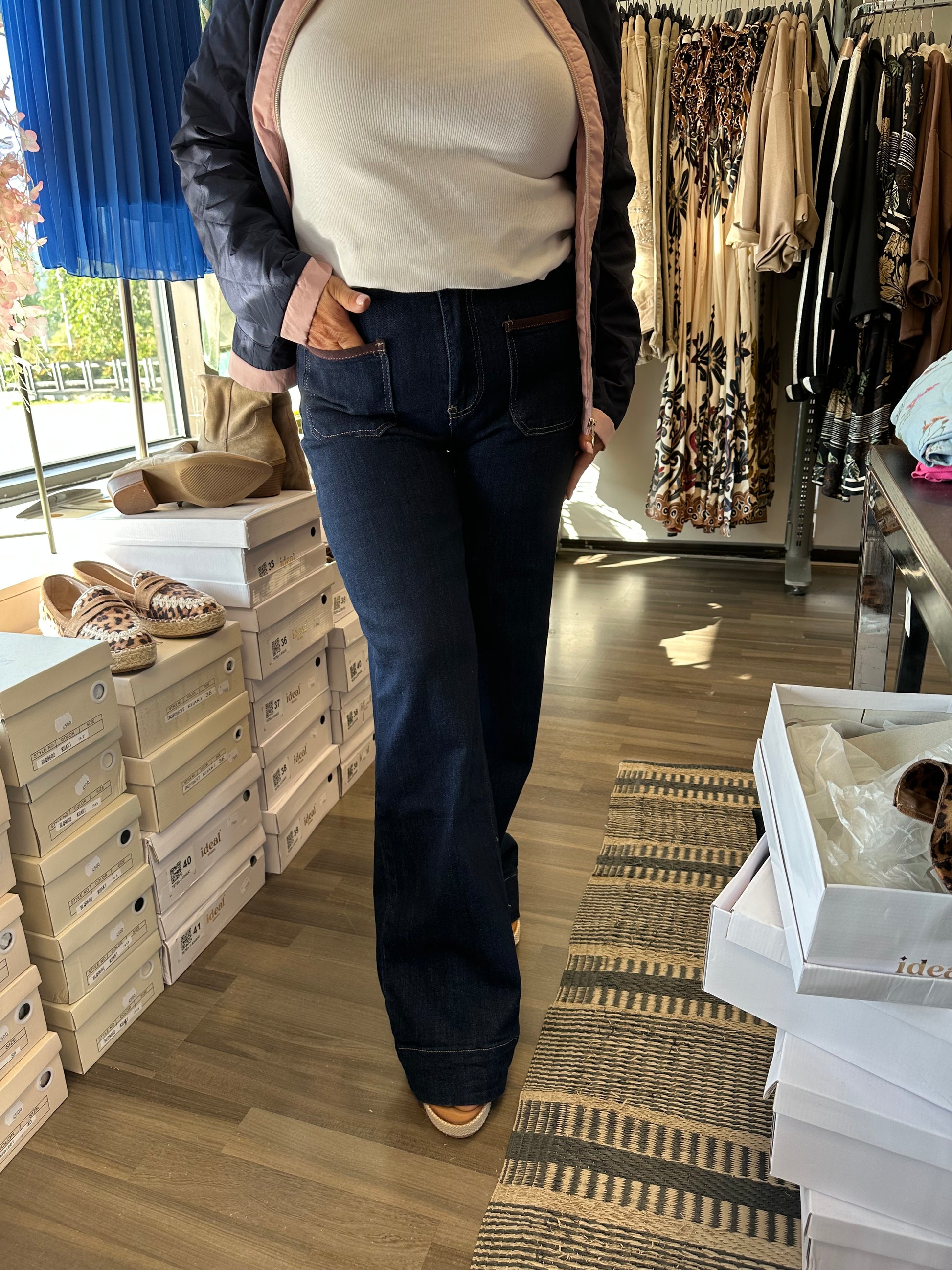 Todella joustavat ja mukavat leveälahkeiset farkut korkealla vyötäröllä. Taskut edessä ja takana, ja etutaskuissa kivat yksityiskohdat. Nappi ja vetoketjukiinnitys.