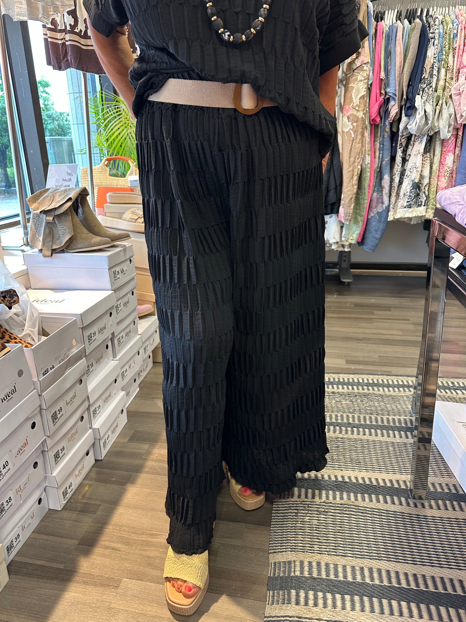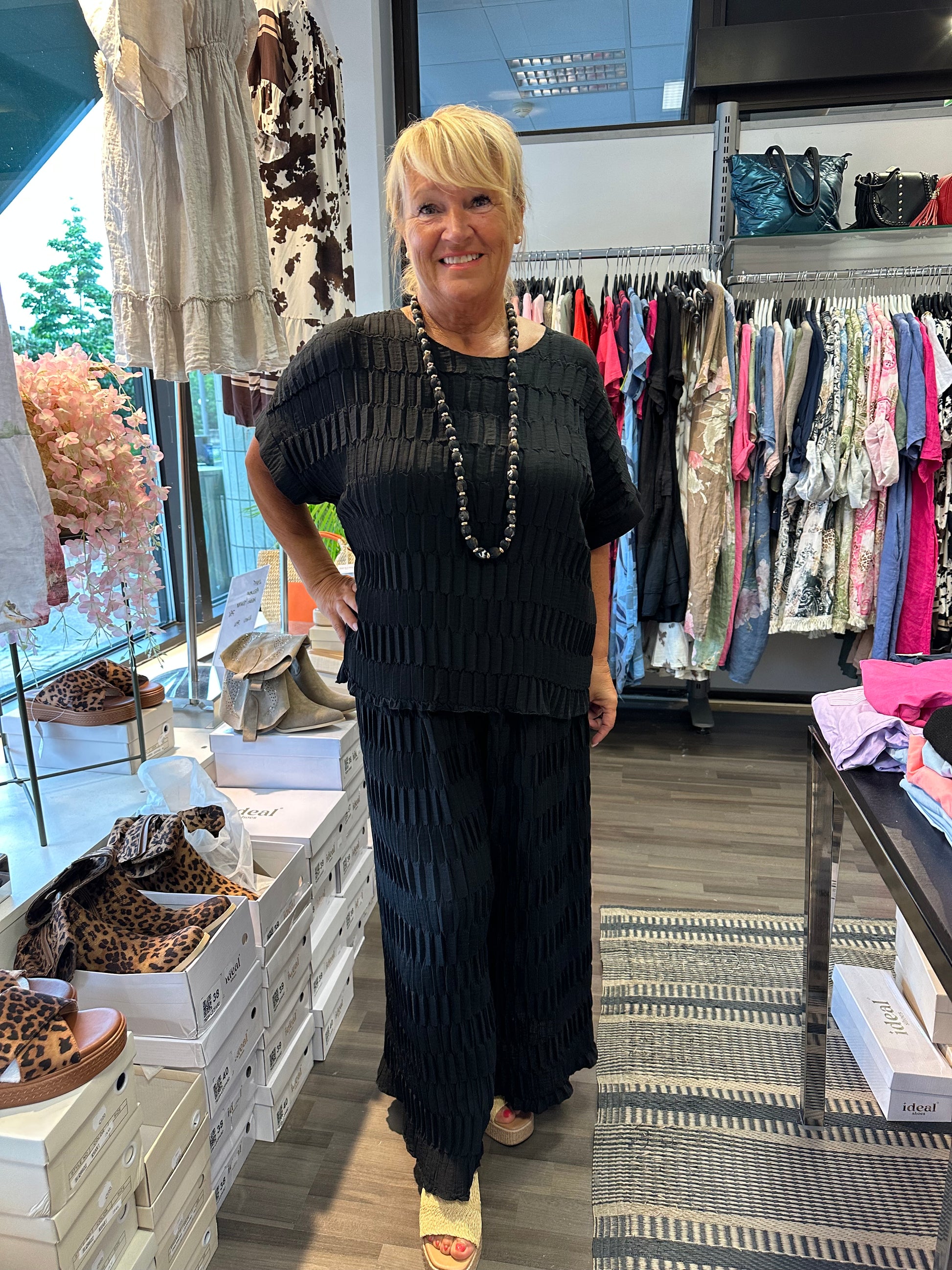 Leveälahkeiset housut kreppikangasta. Vyötärö nousee mukavasti korkealle. Mukana irrallinen vyö.