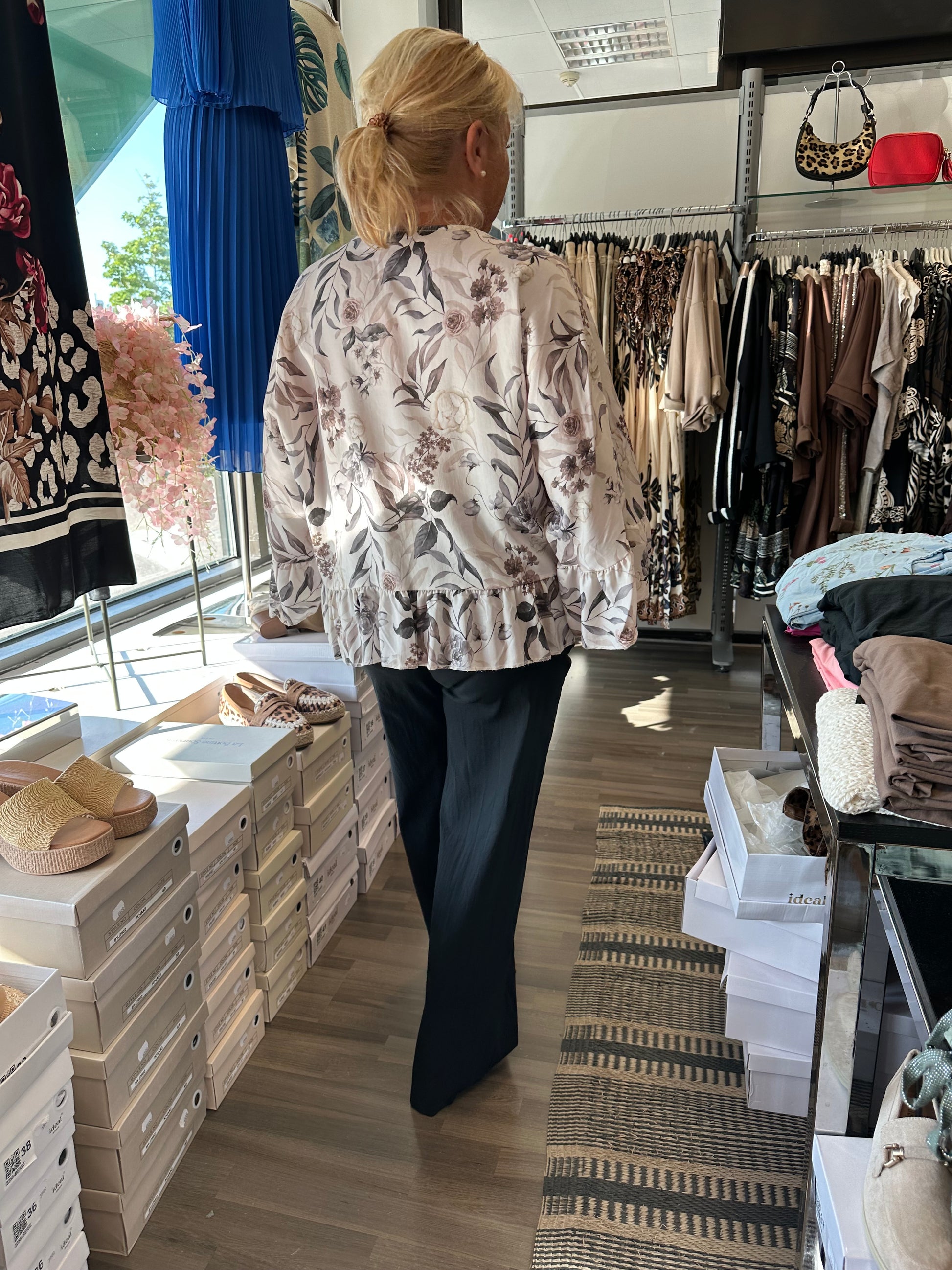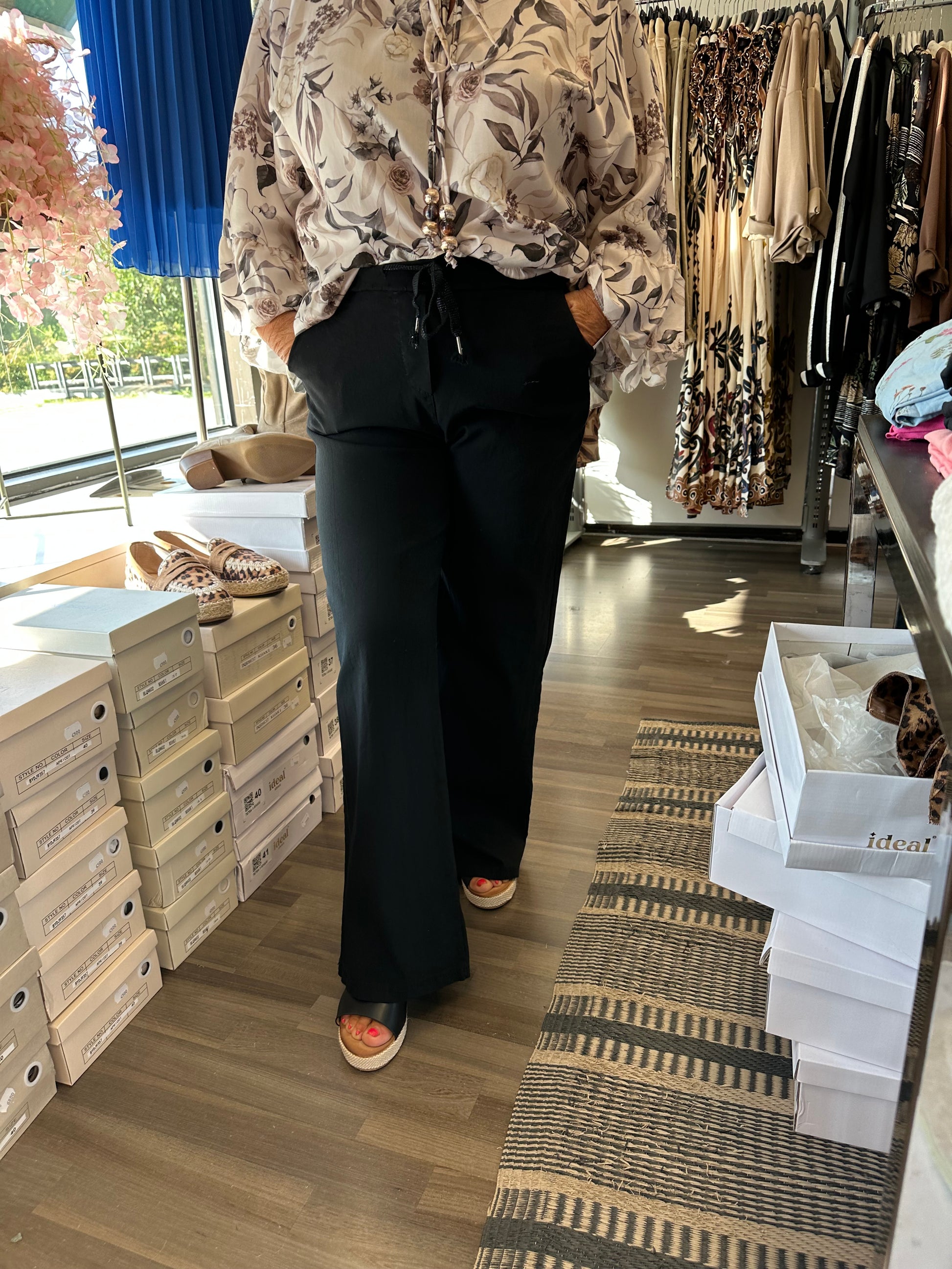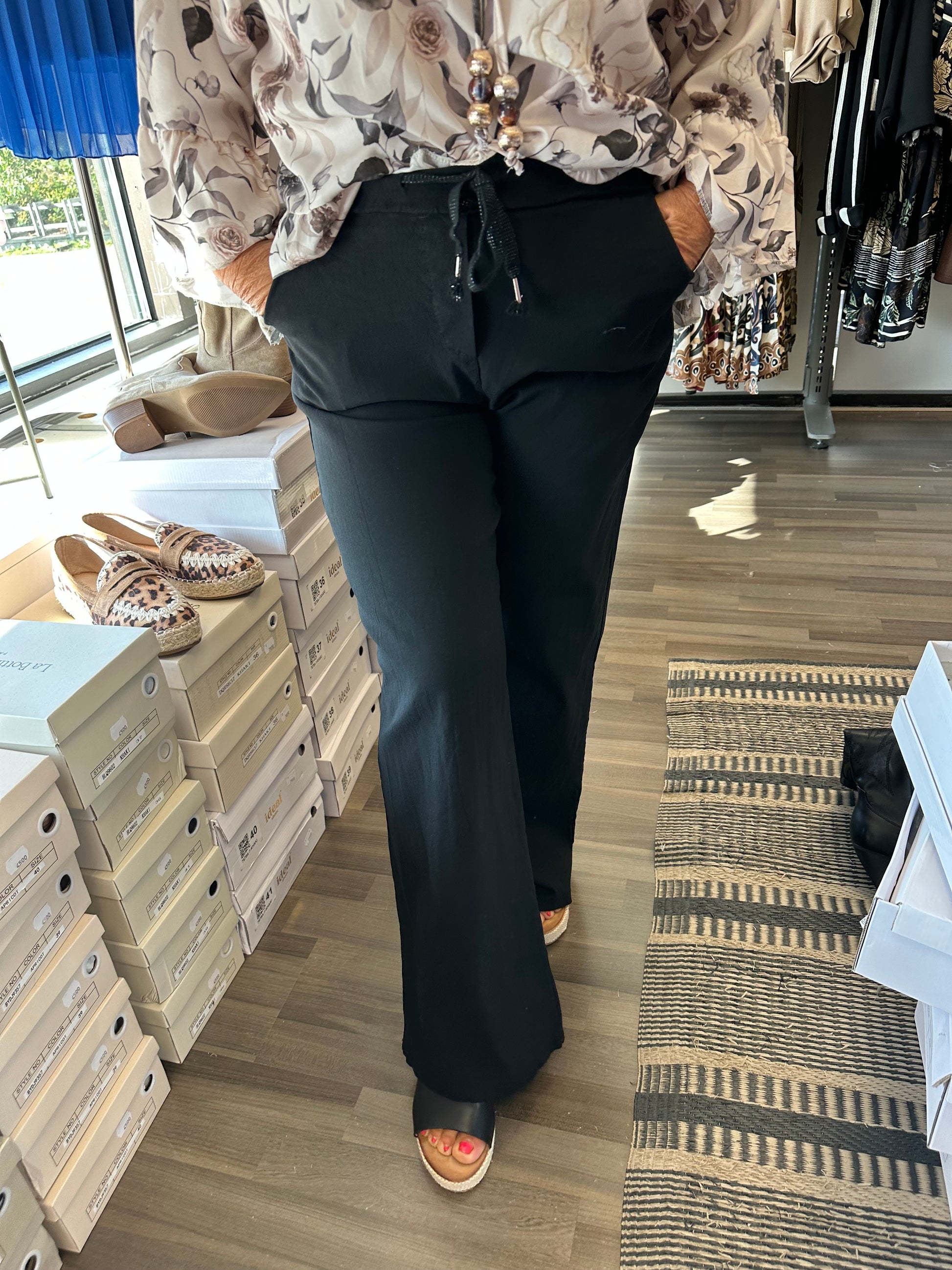 Joustavat stretch-housut leveillä lahkeilla. Normaali vyötärönkorkeus, jossa nyöri.