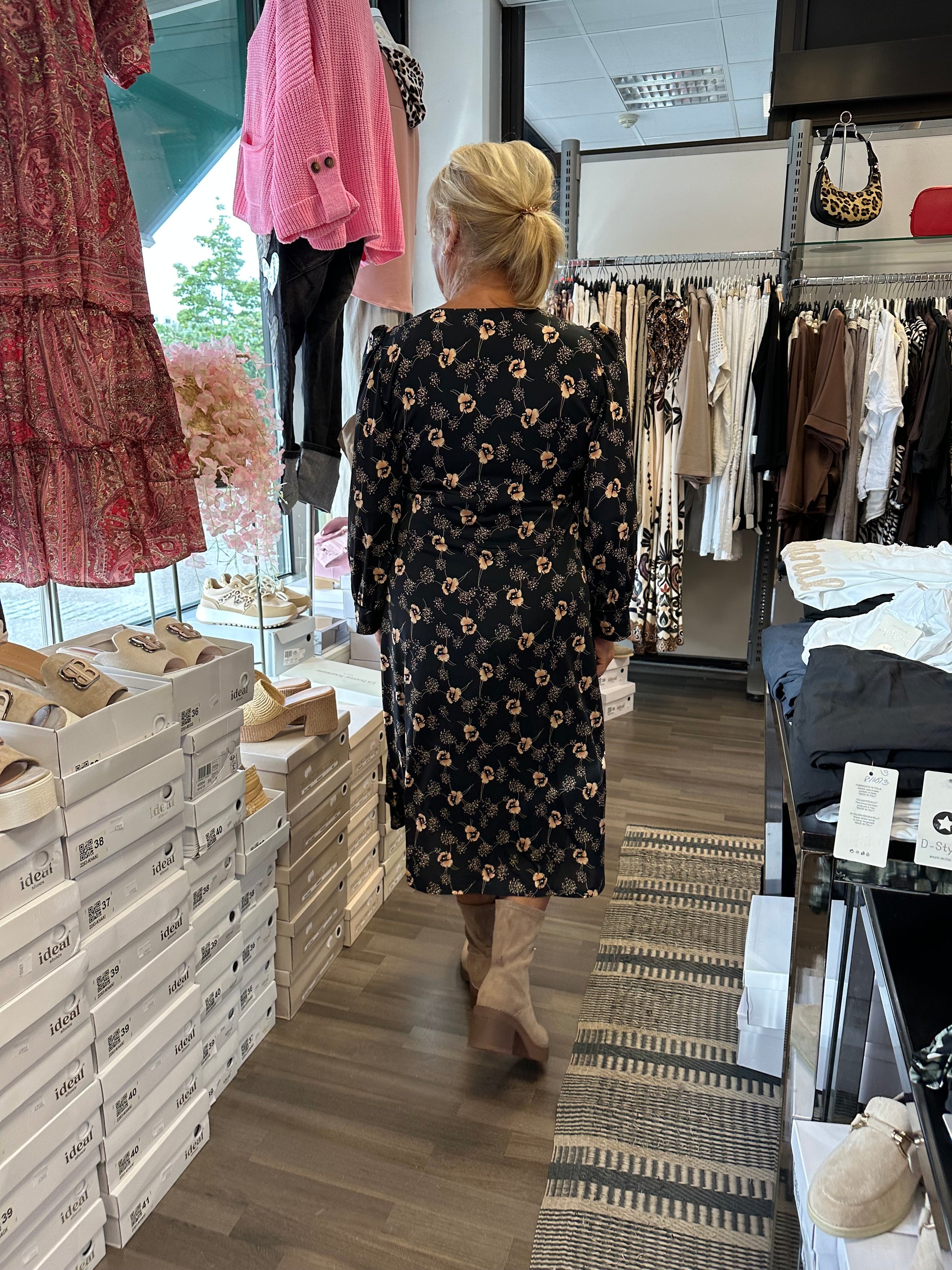 Pitkähihainen mekko liukaspintaista ja joustavaa kangasta. V-pääntie ja edessä rinnalta laskeutuvia kapeita laskoksia. Pienet puhvihihat. Vuorellinen.