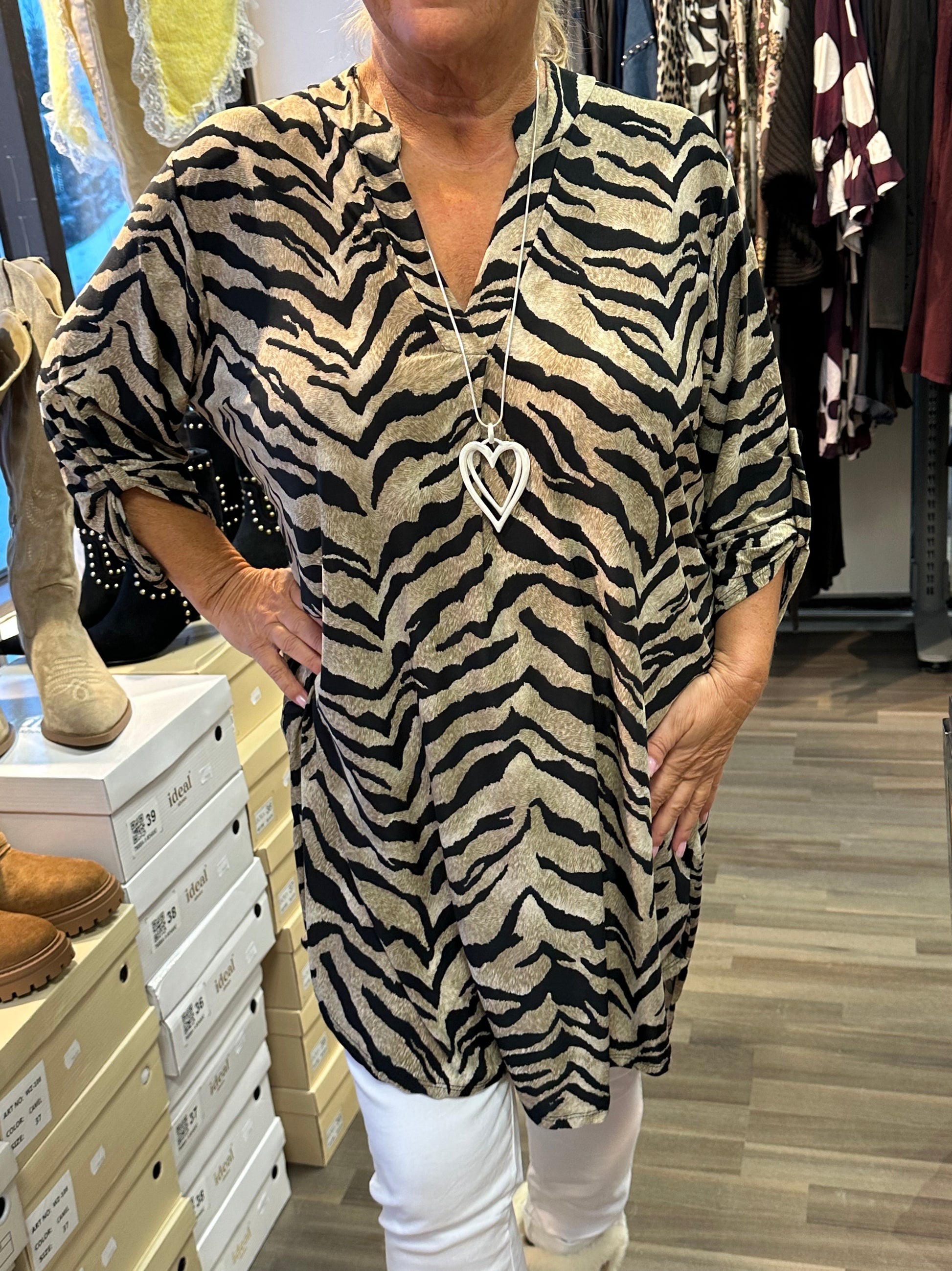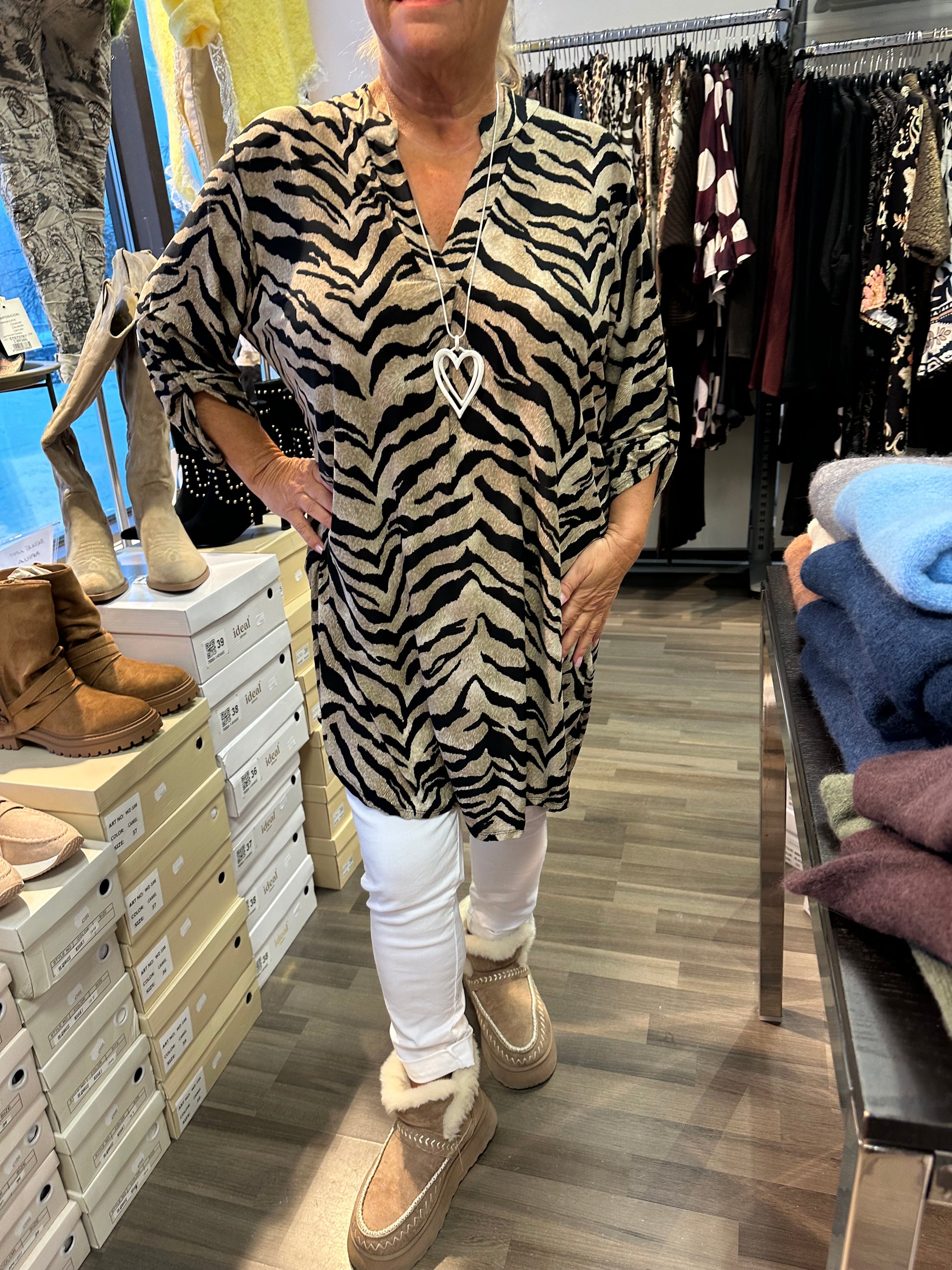 Pitkä reilummankoon tunika liukaspintaista ”silittämättä sileää” kangasta. Vajaamittaiset hihat, jotka saa napeilla ylös.